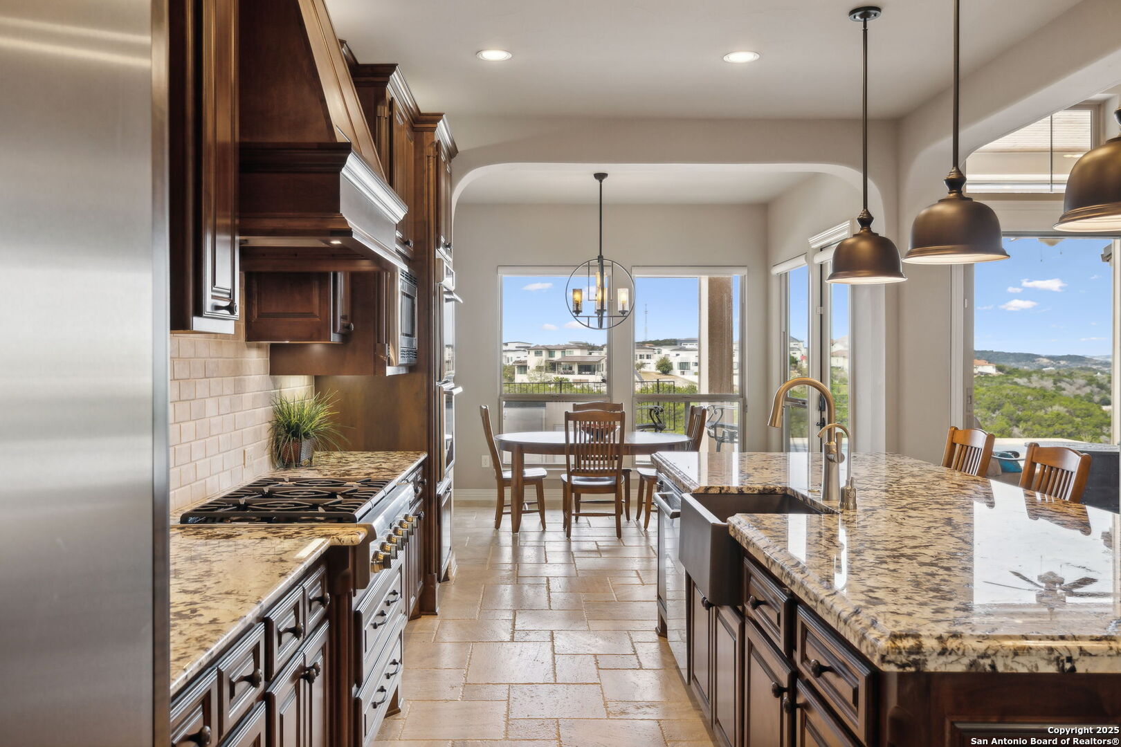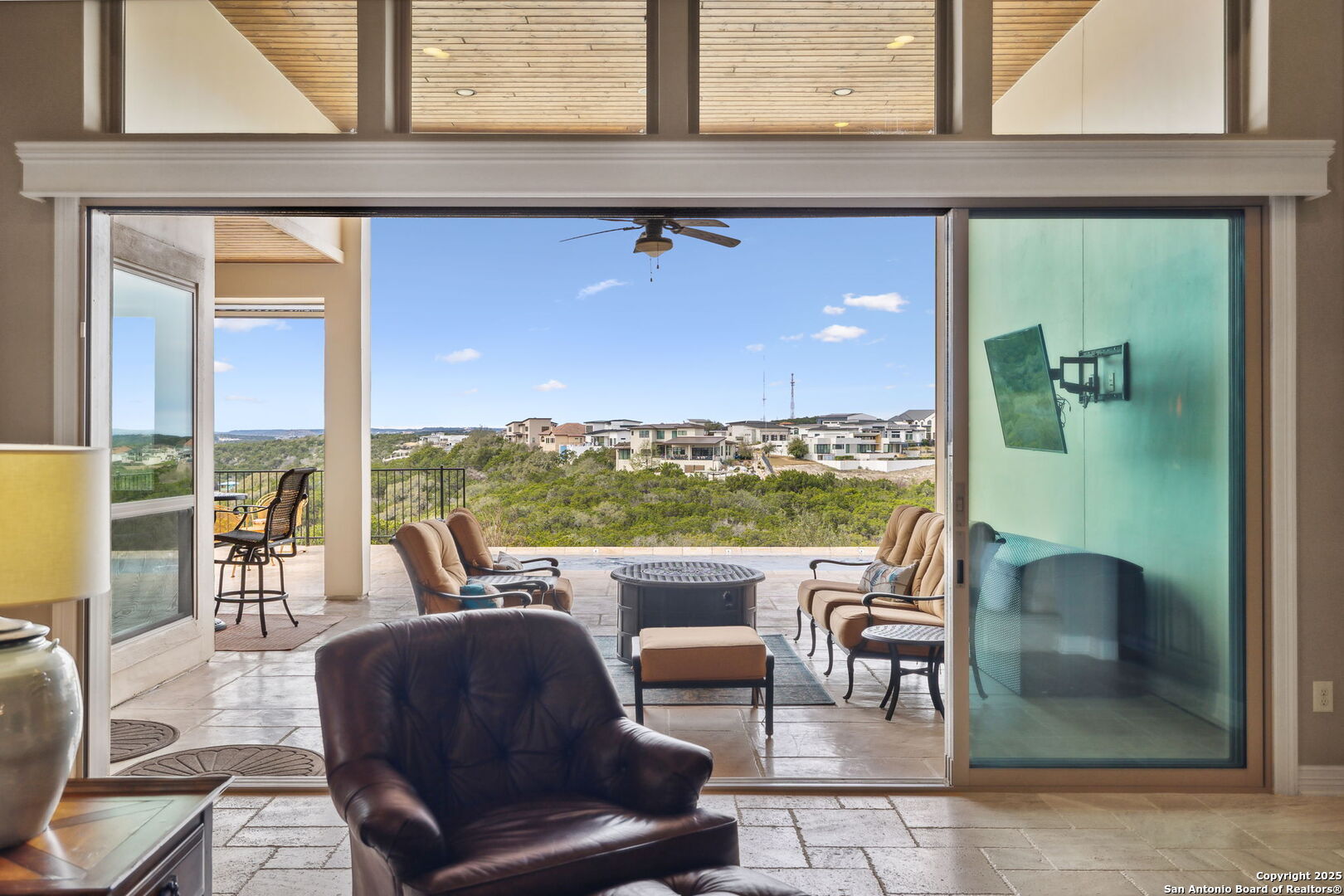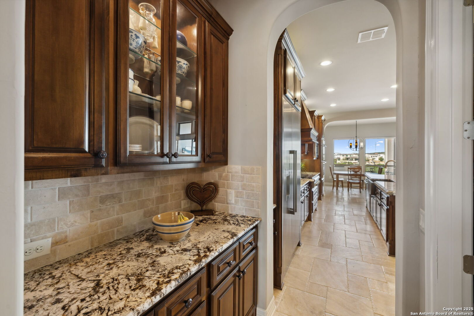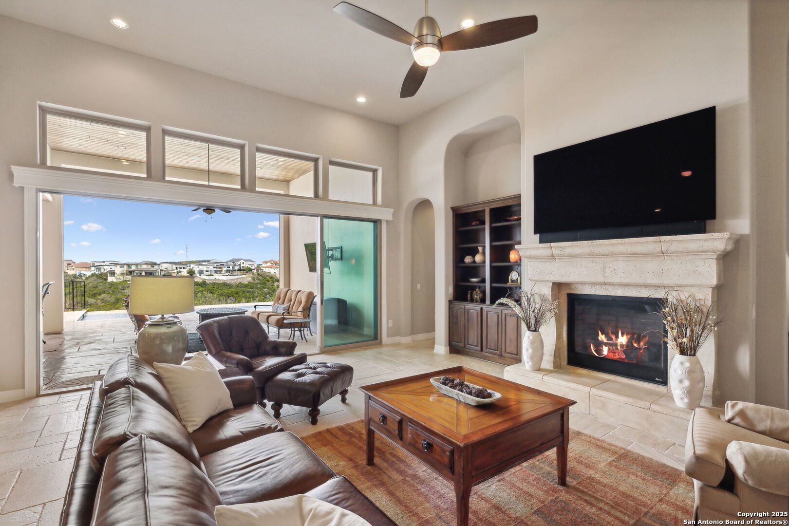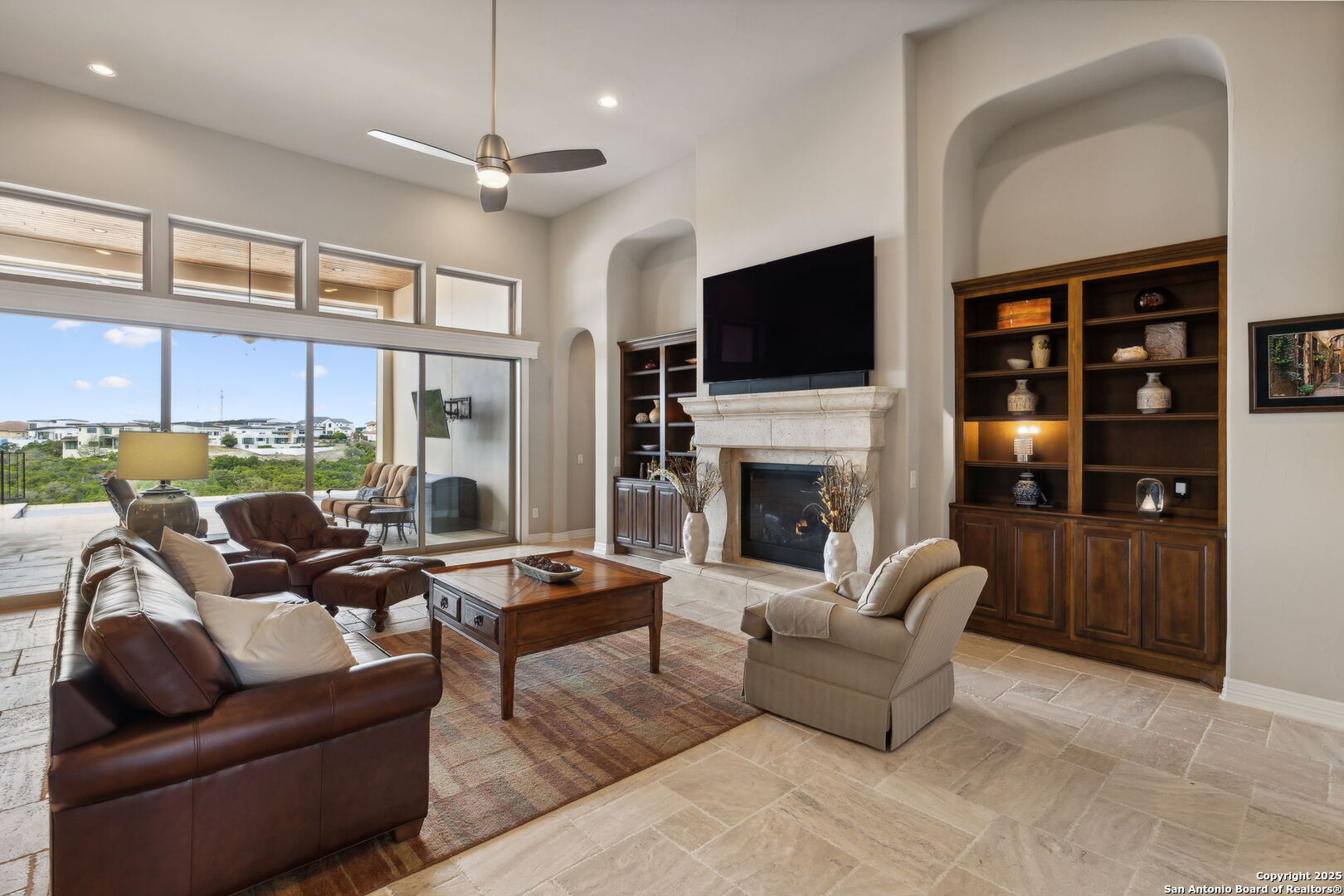 Luxury lifestyle for the buyers wanting lock-and-leave conveniences in a gated community. Beautiful, quality finishes and top-of-the-line lighting, flooring, millwork, hardware & plumbing fixtures. Shutters across the front of the home provide privacy and exquisite curb appeal. Electric shades across the back of the home provide convenience & privacy while preserving the magnificent hill country views. Gorgeous hardwood floors and Turkish Travertine tile throughout the home for a luxury feel, and ease-of-maintenance. Huge primary bedroom with amazing views & extra-large closet. Enjoy the oversized tub with fabulous sunset hill country views (& a motorized shade for privacy). Huge island kitchen with gorgeous granite counters, Thermador gas appliances, double oven and Filtered water in the farm sink. Butler's pantry leads to the formal dining for added storage and convenience. Collapsible patio doors extend the inside living to outdoors. Large, landscaped yard with recently-resurfaced pool & stamped concrete patio to watch the gorgeous sunsets--backs to greenbelt. Oversized backyard with "puppy pickets" in the iron fence is great for dogs.