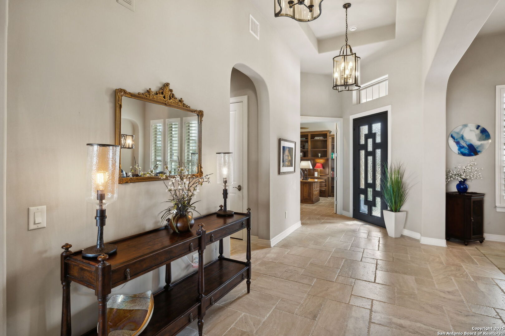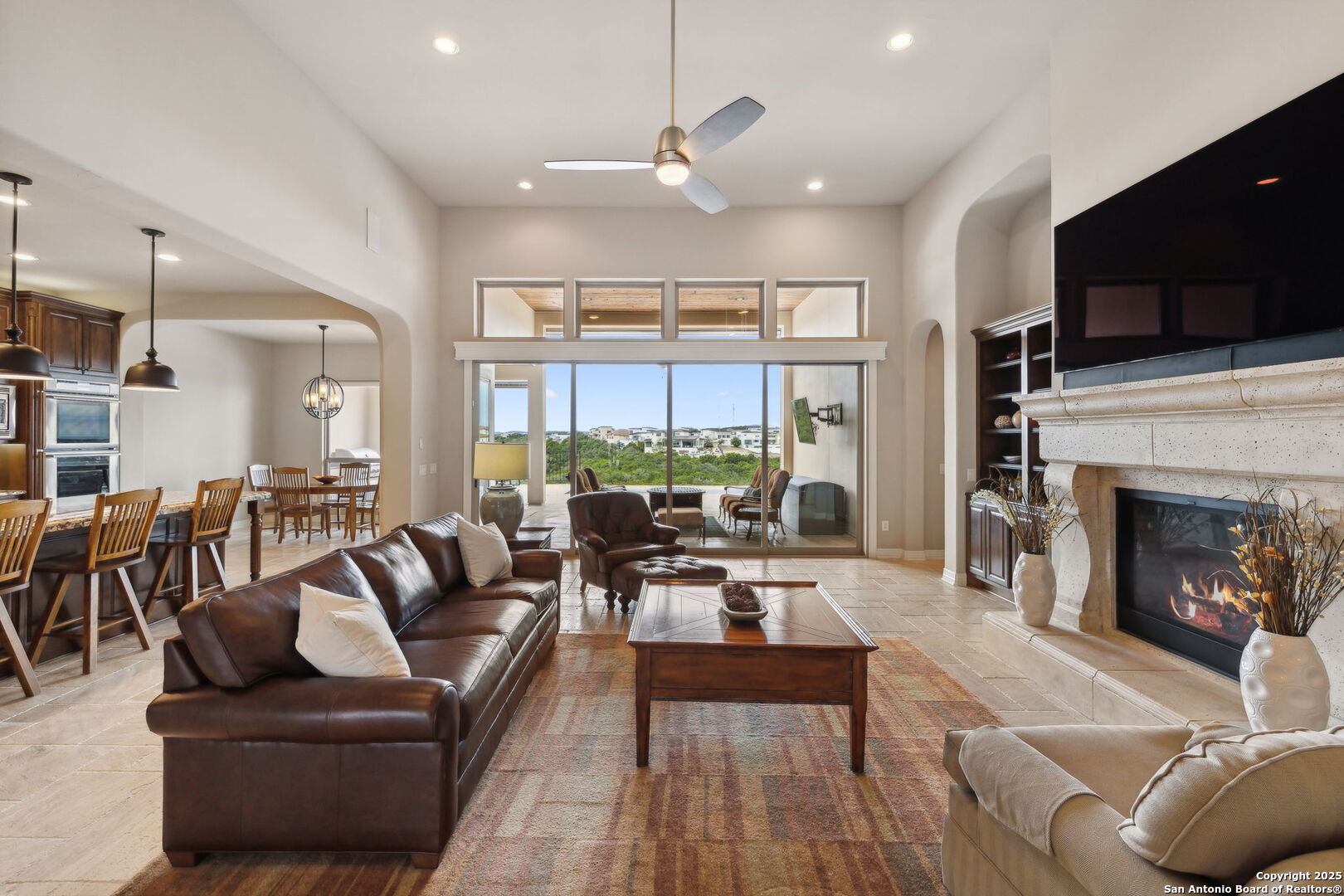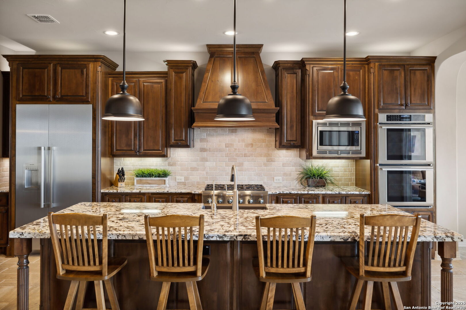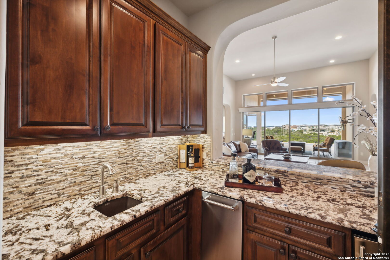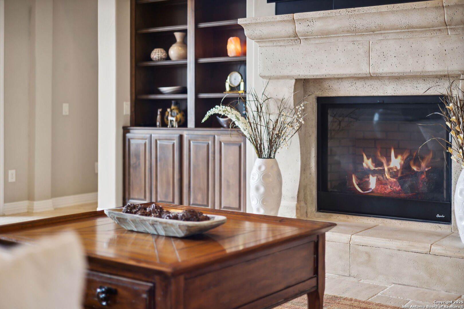 Luxury lifestyle for the buyers wanting lock-and-leave conveniences in a gated community. Beautiful, quality finishes and top-of-the-line lighting, flooring, millwork, hardware & plumbing fixtures. Shutters across the front of the home provide privacy and exquisite curb appeal. Electric shades across the back of the home provide convenience & privacy while preserving the magnificent hill country views. Gorgeous hardwood floors and Turkish Travertine tile throughout the home for a luxury feel, and ease-of-maintenance. Huge primary bedroom with amazing views & extra-large closet. Enjoy the oversized tub with fabulous sunset hill country views (& a motorized shade for privacy). Huge island kitchen with gorgeous granite counters, Thermador gas appliances, double oven and Filtered water in the farm sink. Butler's pantry leads to the formal dining for added storage and convenience. Collapsible patio doors extend the inside living to outdoors. Large, landscaped yard with recently-resurfaced pool & stamped concrete patio to watch the gorgeous sunsets--backs to greenbelt. Oversized backyard with "puppy pickets" in the iron fence is great for dogs.