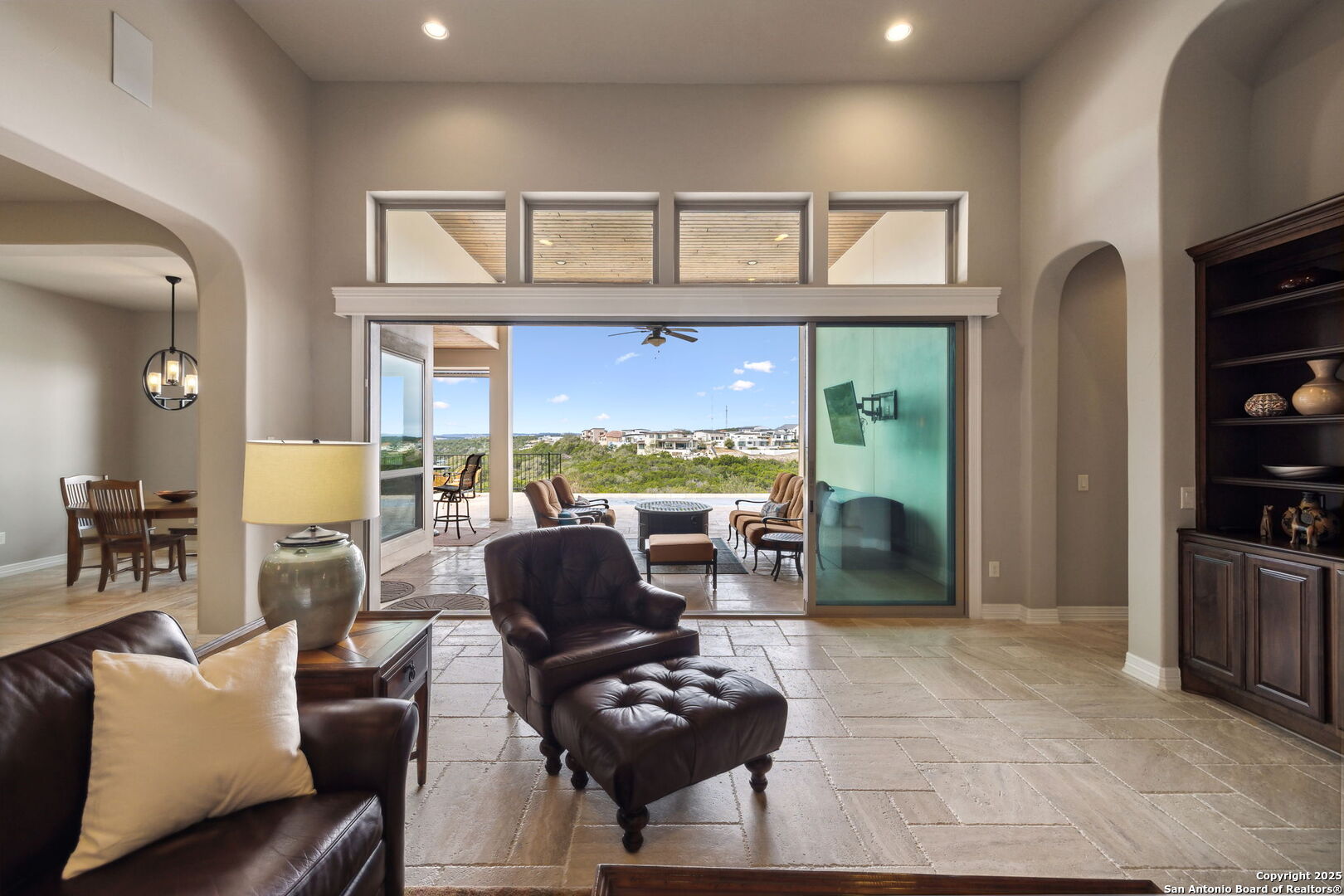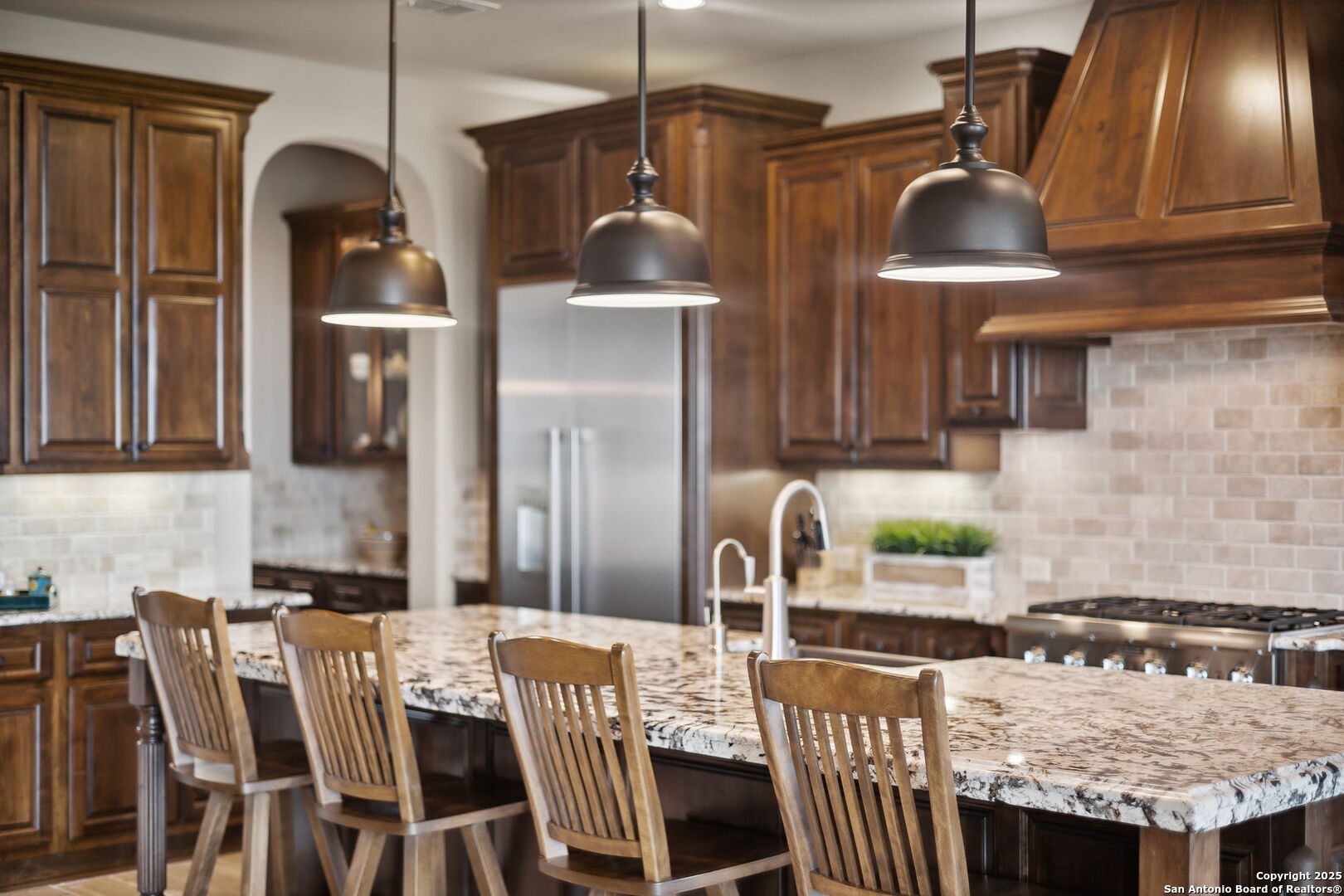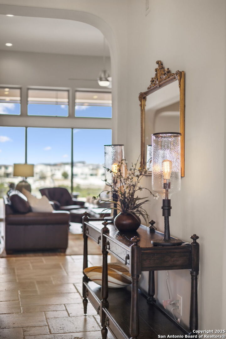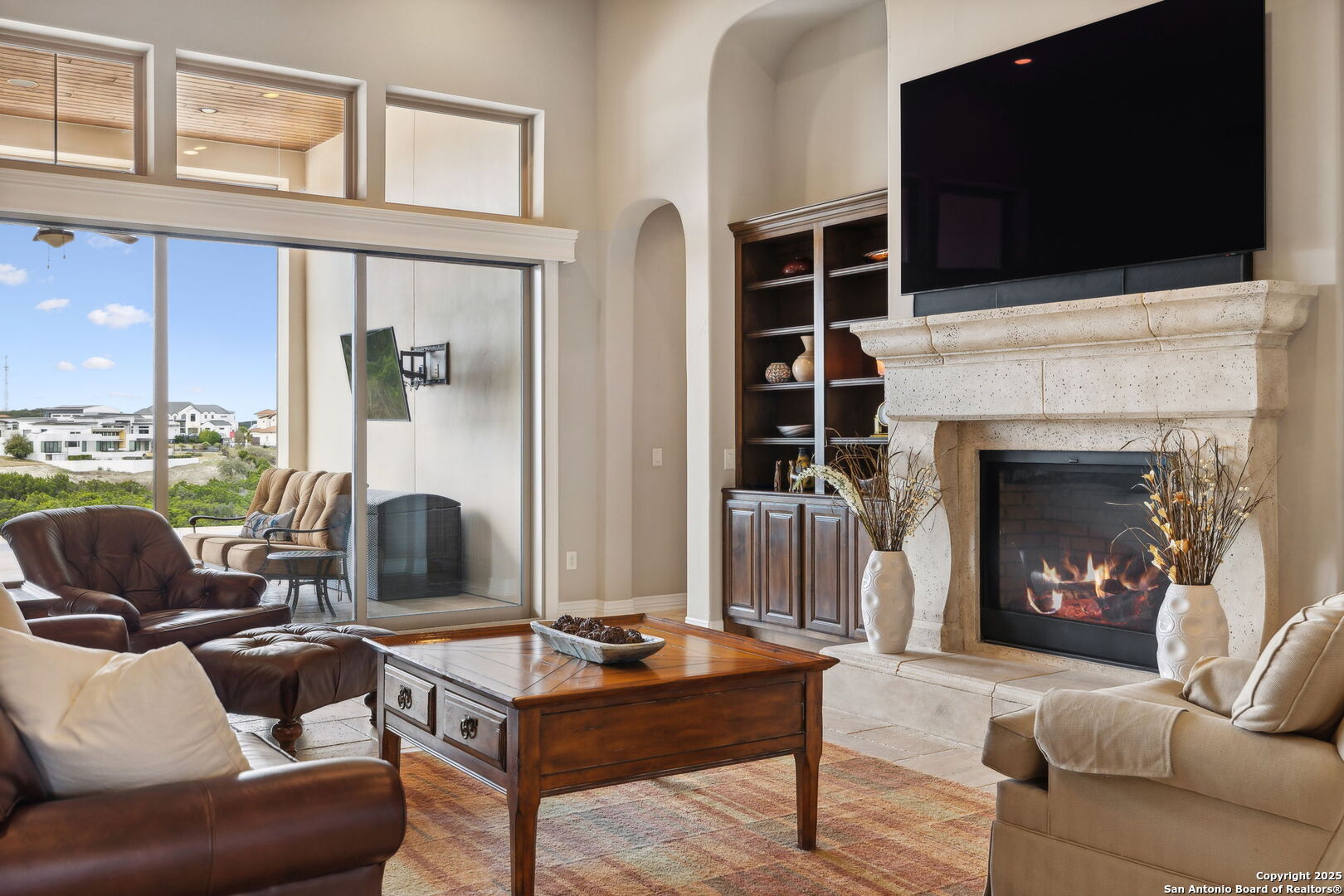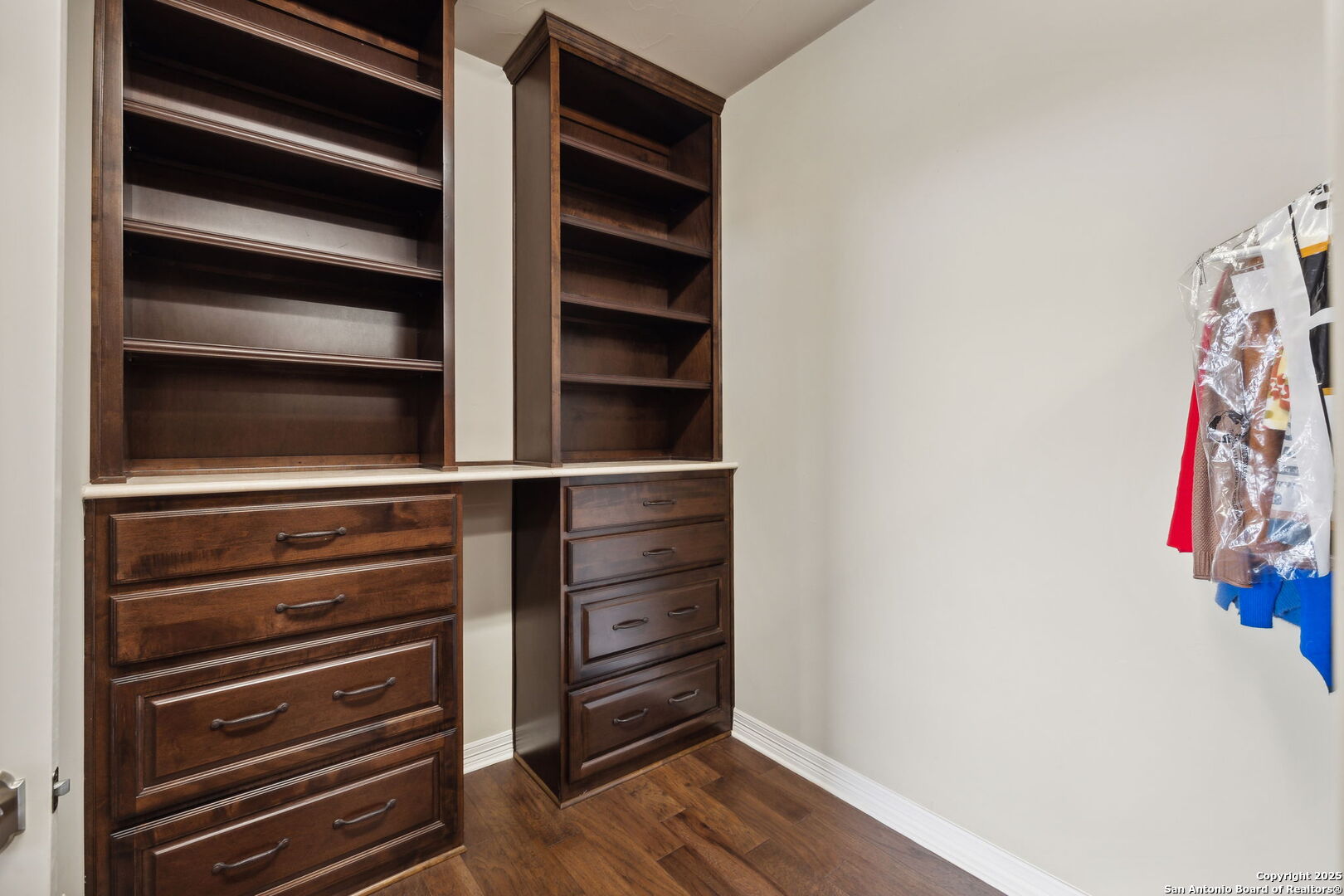 Luxury lifestyle for the buyers wanting lock-and-leave conveniences in a gated community. Beautiful, quality finishes and top-of-the-line lighting, flooring, millwork, hardware & plumbing fixtures. Shutters across the front of the home provide privacy and exquisite curb appeal. Electric shades across the back of the home provide convenience & privacy while preserving the magnificent hill country views. Gorgeous hardwood floors and Turkish Travertine tile throughout the home for a luxury feel, and ease-of-maintenance. Huge primary bedroom with amazing views & extra-large closet. Enjoy the oversized tub with fabulous sunset hill country views (& a motorized shade for privacy). Huge island kitchen with gorgeous granite counters, Thermador gas appliances, double oven and Filtered water in the farm sink. Butler's pantry leads to the formal dining for added storage and convenience. Collapsible patio doors extend the inside living to outdoors. Large, landscaped yard with recently-resurfaced pool & stamped concrete patio to watch the gorgeous sunsets--backs to greenbelt. Oversized backyard with "puppy pickets" in the iron fence is great for dogs.