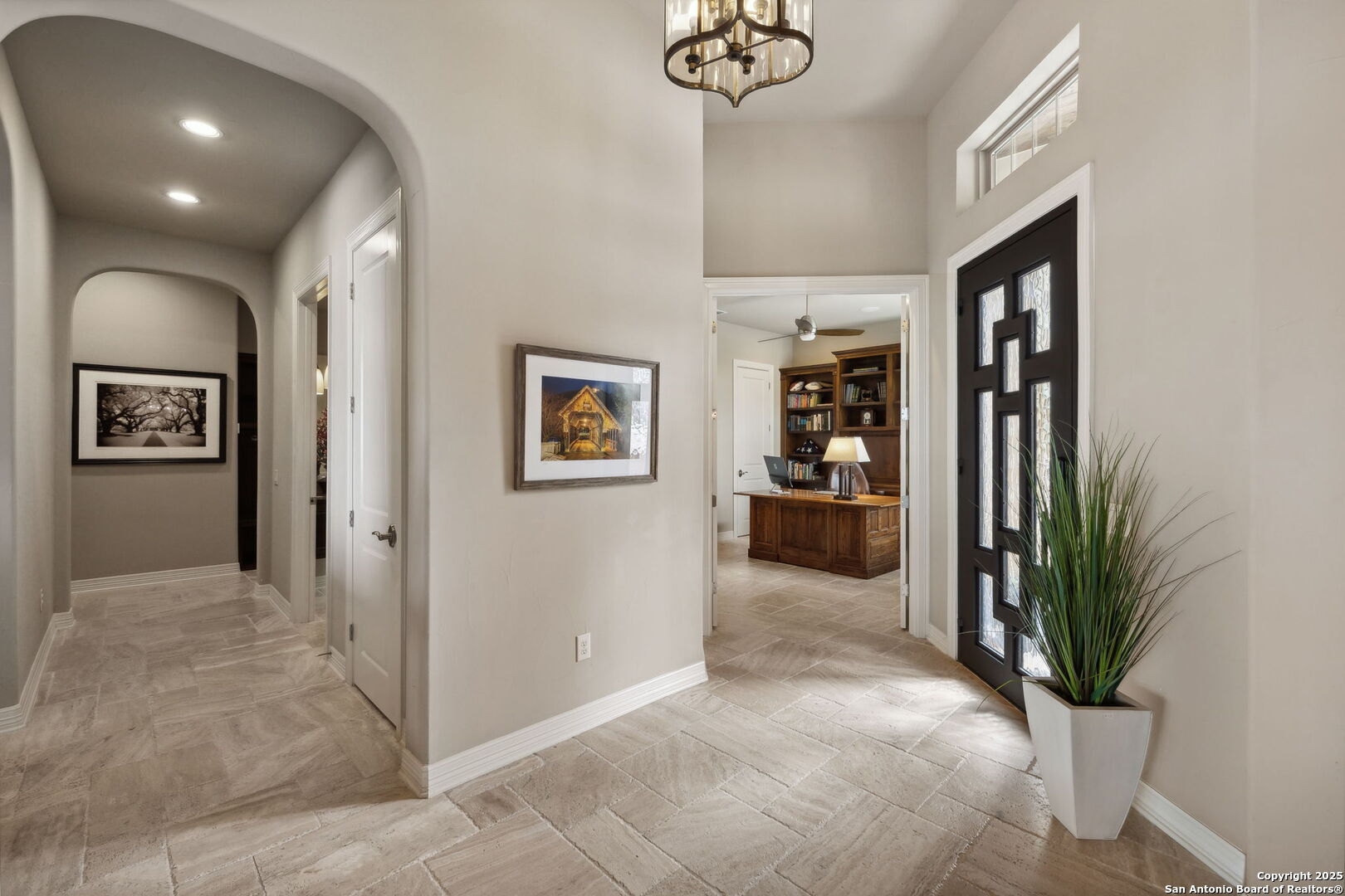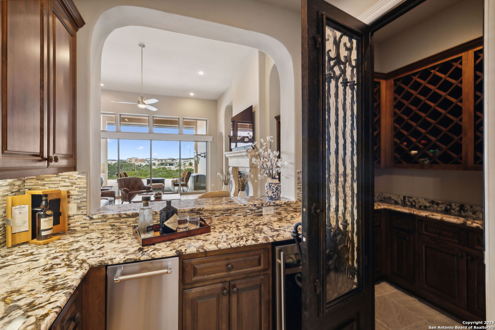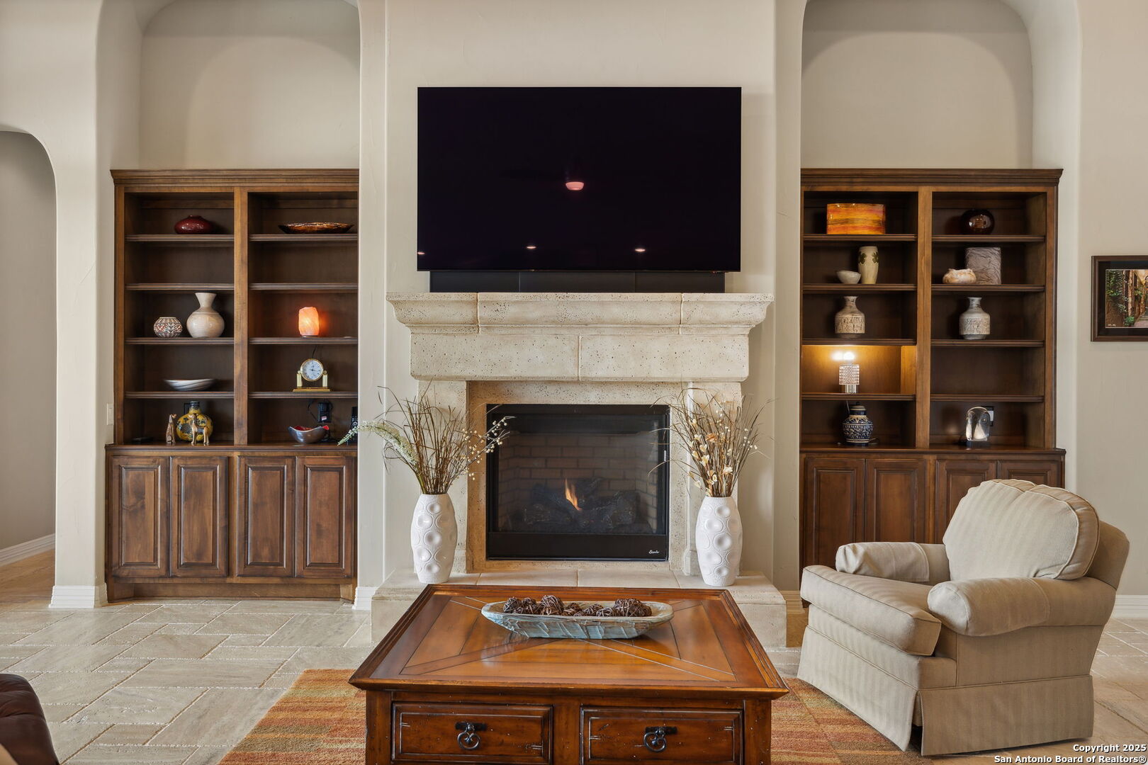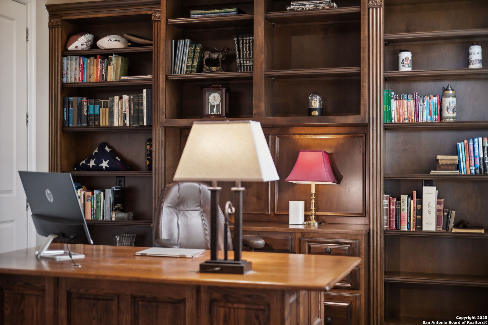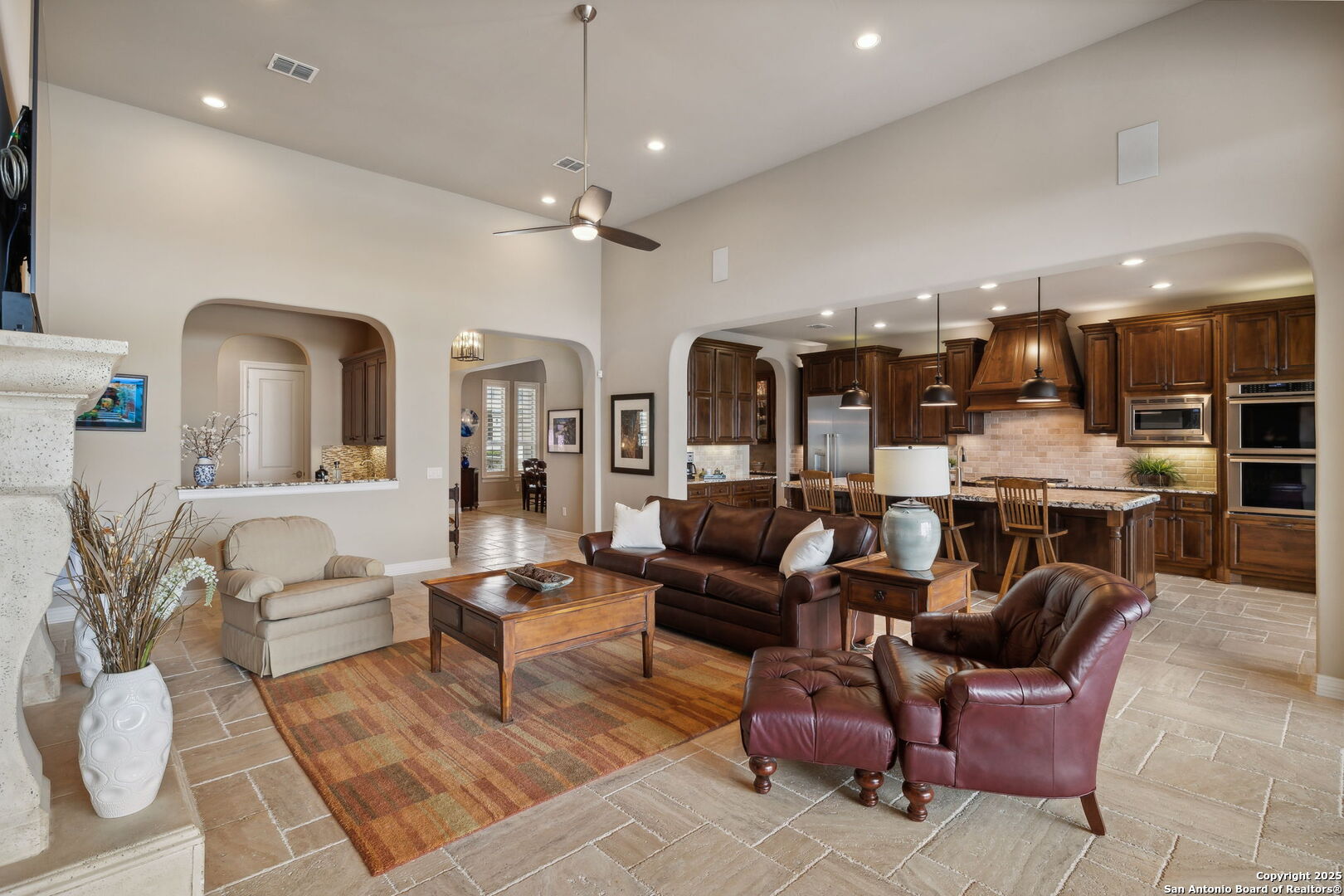 Luxury lifestyle for the buyers wanting lock-and-leave conveniences in a gated community. Beautiful, quality finishes and top-of-the-line lighting, flooring, millwork, hardware & plumbing fixtures. Shutters across the front of the home provide privacy and exquisite curb appeal. Electric shades across the back of the home provide convenience & privacy while preserving the magnificent hill country views. Gorgeous hardwood floors and Turkish Travertine tile throughout the home for a luxury feel, and ease-of-maintenance. Huge primary bedroom with amazing views & extra-large closet. Enjoy the oversized tub with fabulous sunset hill country views (& a motorized shade for privacy). Huge island kitchen with gorgeous granite counters, Thermador gas appliances, double oven and Filtered water in the farm sink. Butler's pantry leads to the formal dining for added storage and convenience. Collapsible patio doors extend the inside living to outdoors. Large, landscaped yard with recently-resurfaced pool & stamped concrete patio to watch the gorgeous sunsets--backs to greenbelt. Oversized backyard with "puppy pickets" in the iron fence is great for dogs.