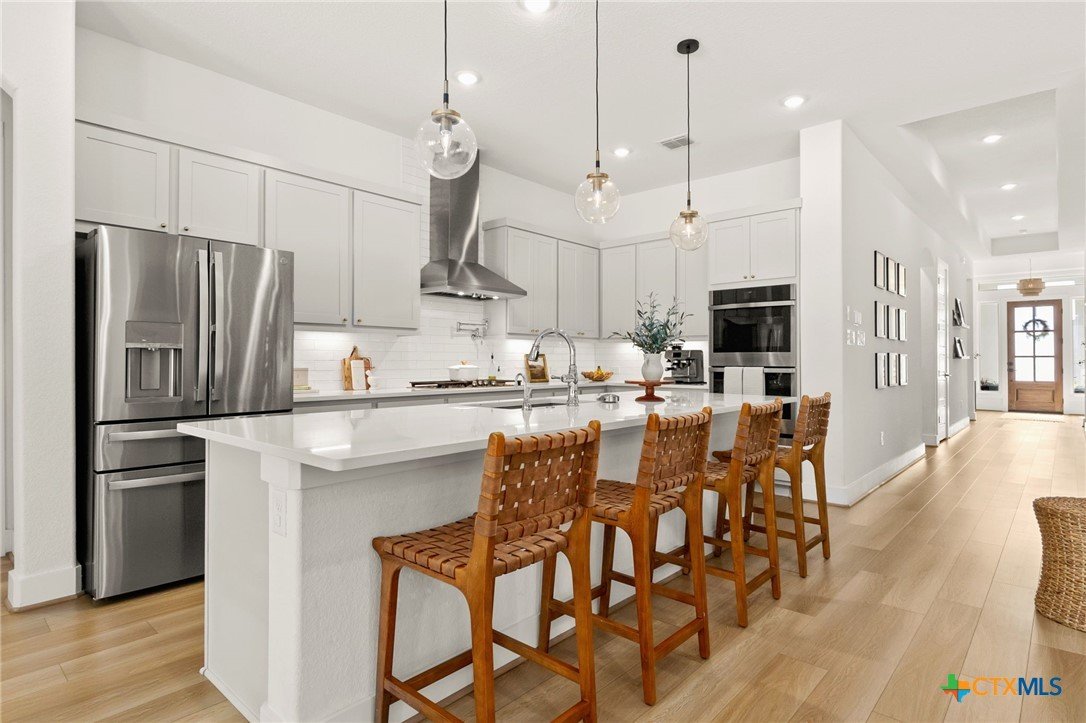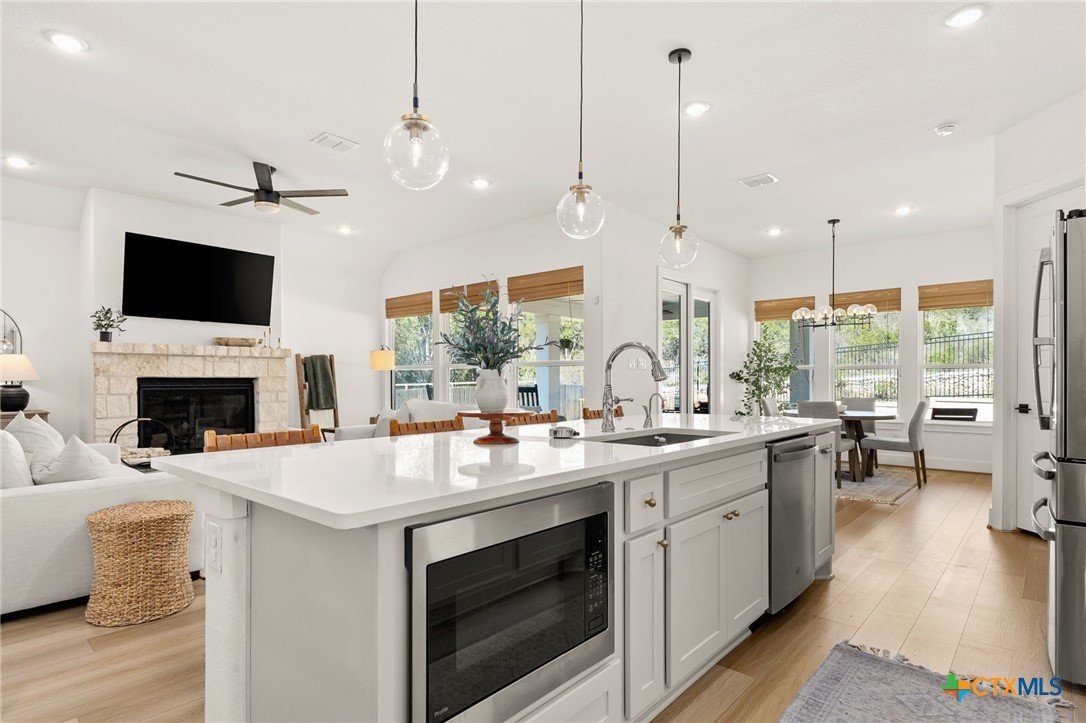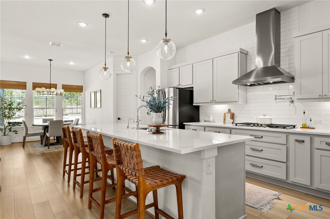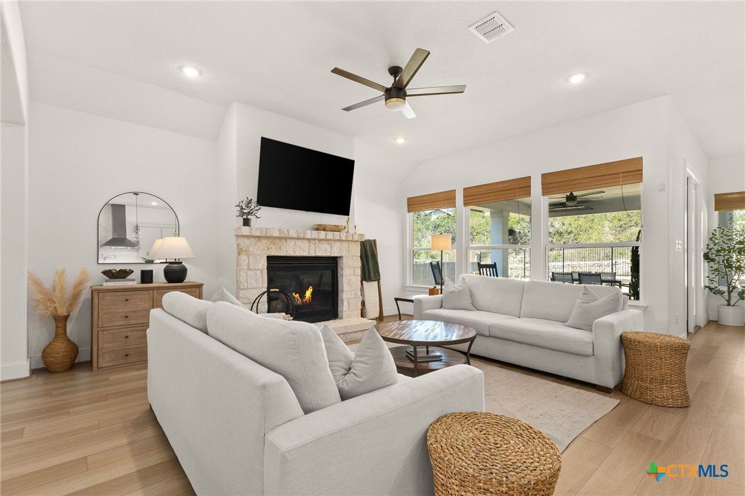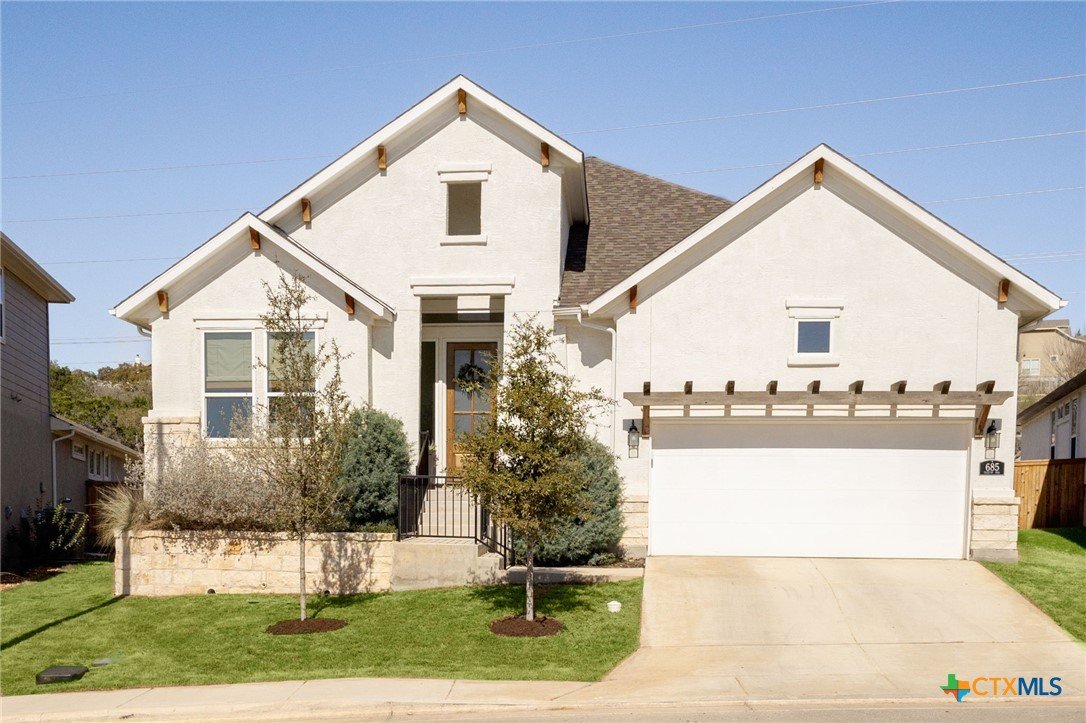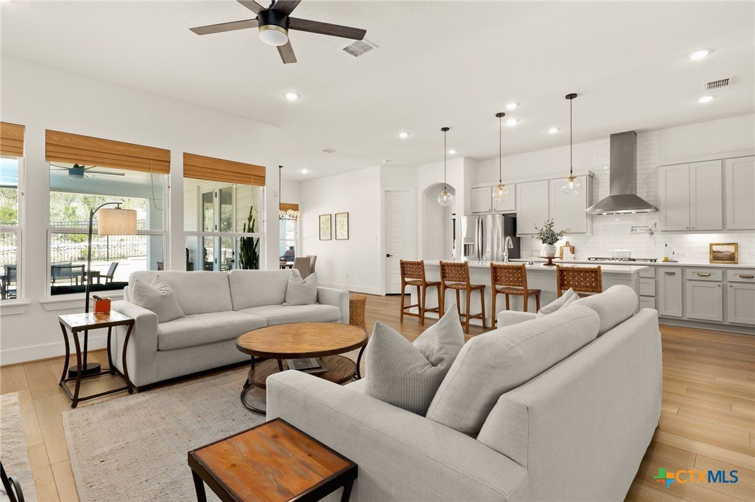 Welcome to this stunning 4-bedroom, 3-bathroom home inside the loop of New Braunfels! From the moment you step inside, you'll be captivated by the abundance of natural light that fills every room. The open-concept floor plan is perfect for both everyday living and entertaining, featuring high-end upgrades throughout, including premium flooring, designer lighting, and custom finishes that elevate the space. The gourmet kitchen boasts gas cooking, a spacious island, and beautiful cabinetry, making it a dream for any home chef. The expansive living and dining areas flow effortlessly, providing a perfect space for gatherings or quiet relaxation. The master suite is a true retreat, offering a luxurious en-suite bathroom with a soaking tub, separate shower, double vanities, and dual closets. Each of the additional bedrooms is generously sized, with plenty of closet space and ample natural light. The home also has a practical flex room that could be used as an office, play room, or media space. Step outside to the Texas-sized patio, ideal for outdoor living and entertaining. Enjoy the serene views of the greenbelt behind the property, offering both privacy and tranquility. Whether you're enjoying a cup of coffee in the morning or hosting a barbecue, this outdoor space is perfect for every occasion. Meticulously clean and meticulously maintained, this home is move-in ready and truly offers the best of New Braunfels living. Don't miss the opportunity to make this exceptional property your new home!