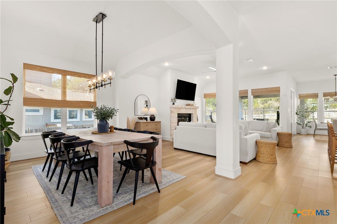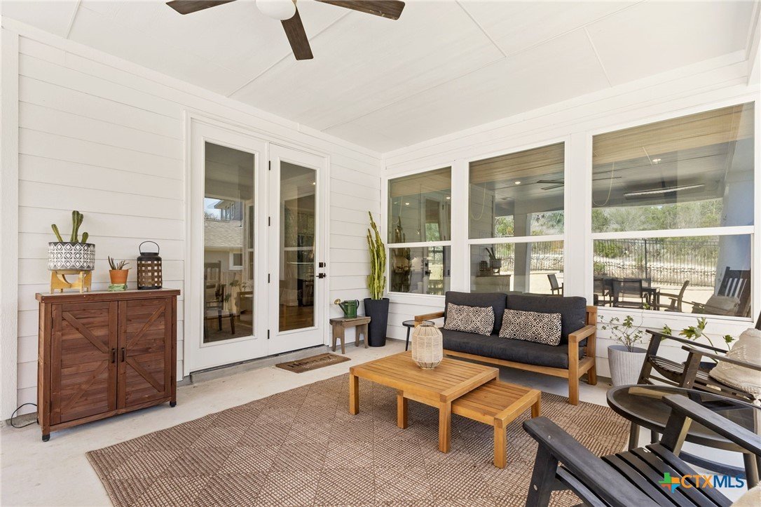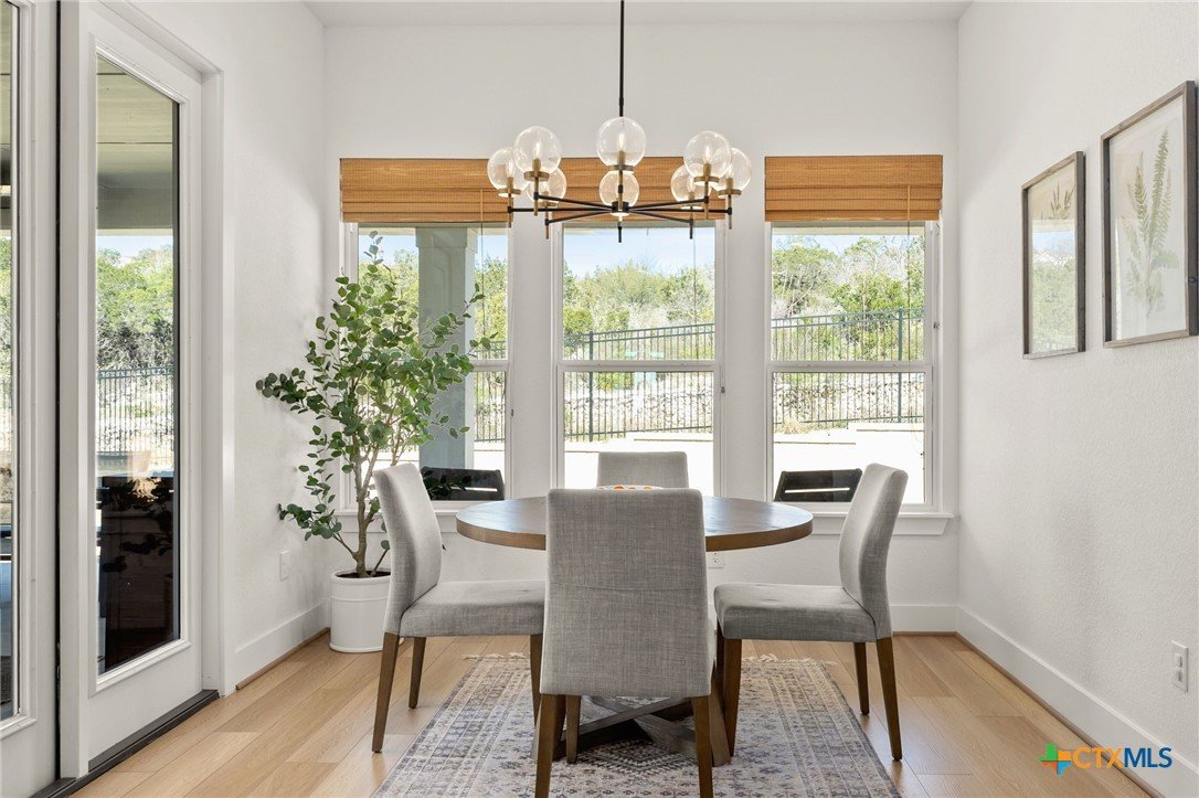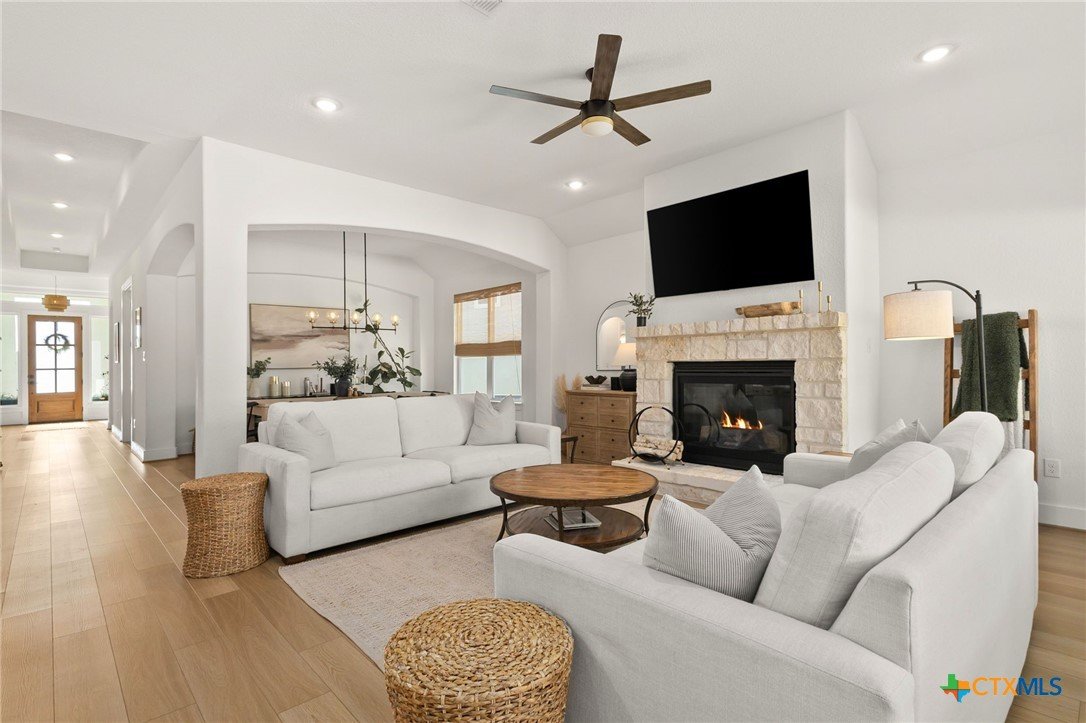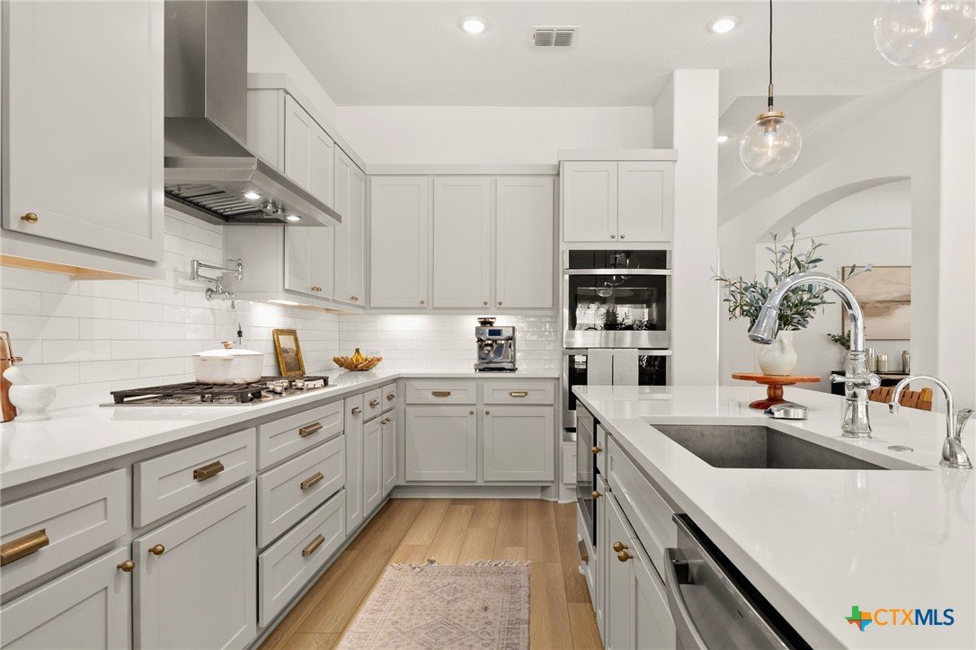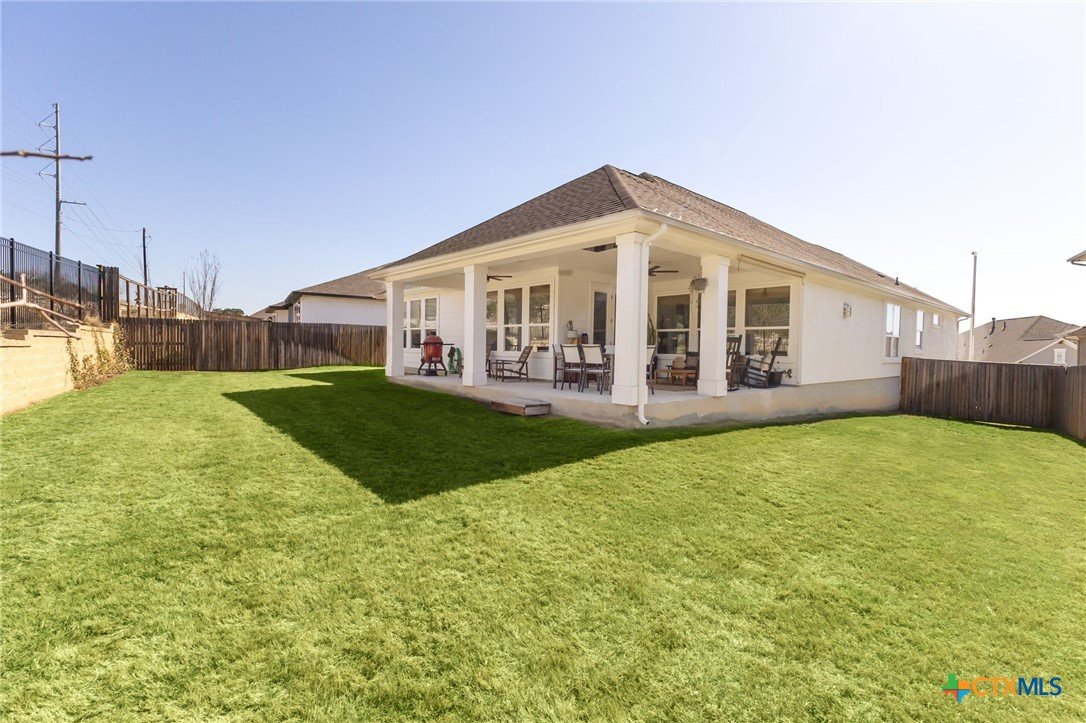 Welcome to this stunning 4-bedroom, 3-bathroom home inside the loop of New Braunfels! From the moment you step inside, you'll be captivated by the abundance of natural light that fills every room. The open-concept floor plan is perfect for both everyday living and entertaining, featuring high-end upgrades throughout, including premium flooring, designer lighting, and custom finishes that elevate the space. The gourmet kitchen boasts gas cooking, a spacious island, and beautiful cabinetry, making it a dream for any home chef. The expansive living and dining areas flow effortlessly, providing a perfect space for gatherings or quiet relaxation. The master suite is a true retreat, offering a luxurious en-suite bathroom with a soaking tub, separate shower, double vanities, and dual closets. Each of the additional bedrooms is generously sized, with plenty of closet space and ample natural light. The home also has a practical flex room that could be used as an office, play room, or media space. Step outside to the Texas-sized patio, ideal for outdoor living and entertaining. Enjoy the serene views of the greenbelt behind the property, offering both privacy and tranquility. Whether you're enjoying a cup of coffee in the morning or hosting a barbecue, this outdoor space is perfect for every occasion. Meticulously clean and meticulously maintained, this home is move-in ready and truly offers the best of New Braunfels living. Don't miss the opportunity to make this exceptional property your new home!