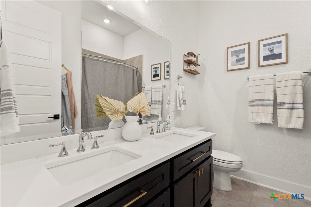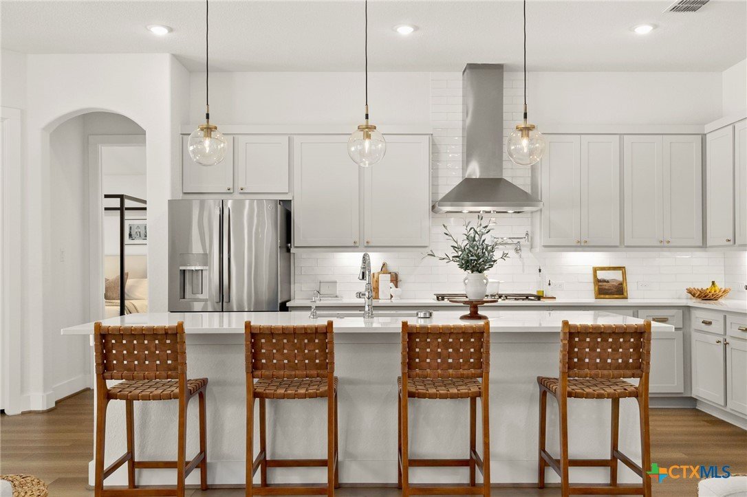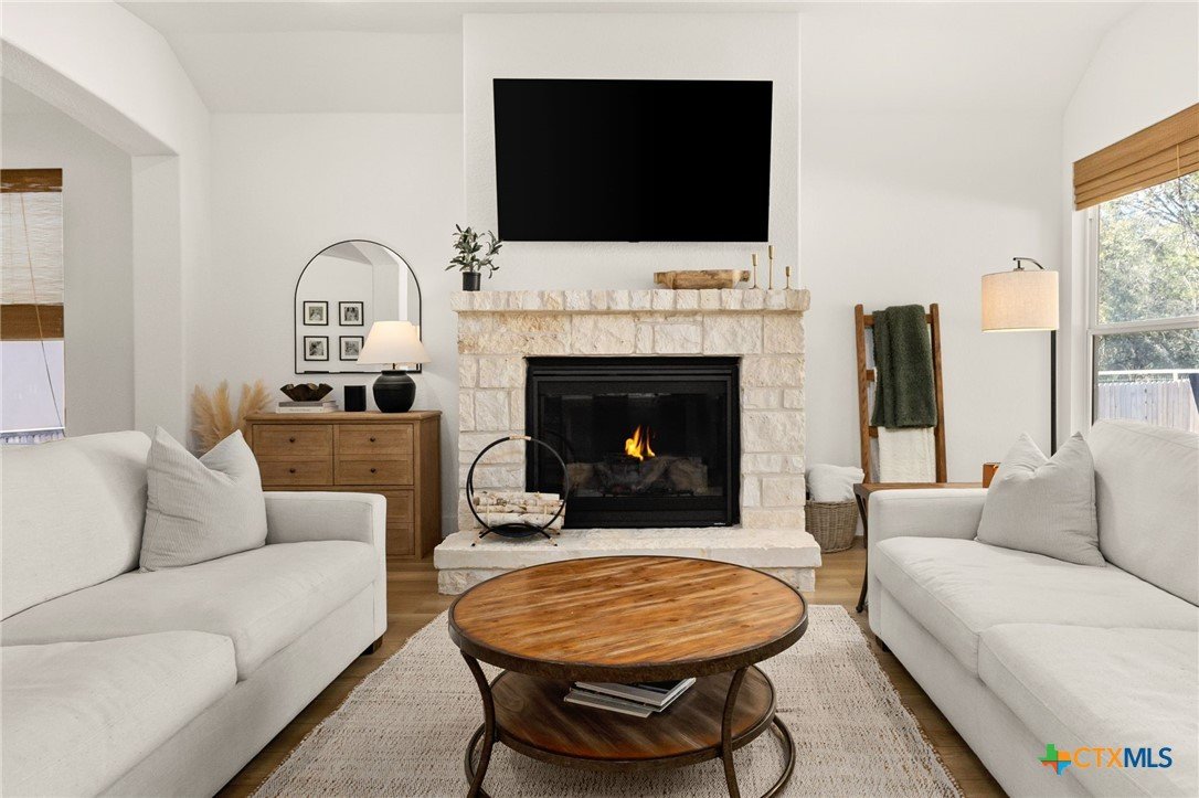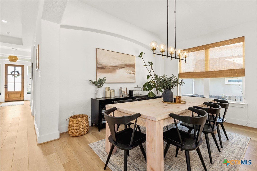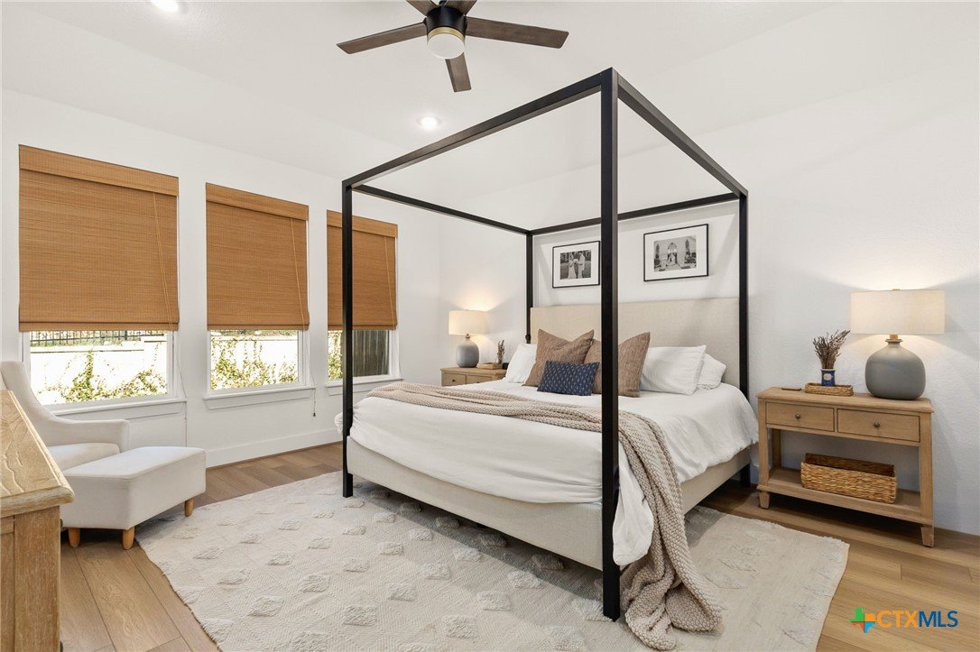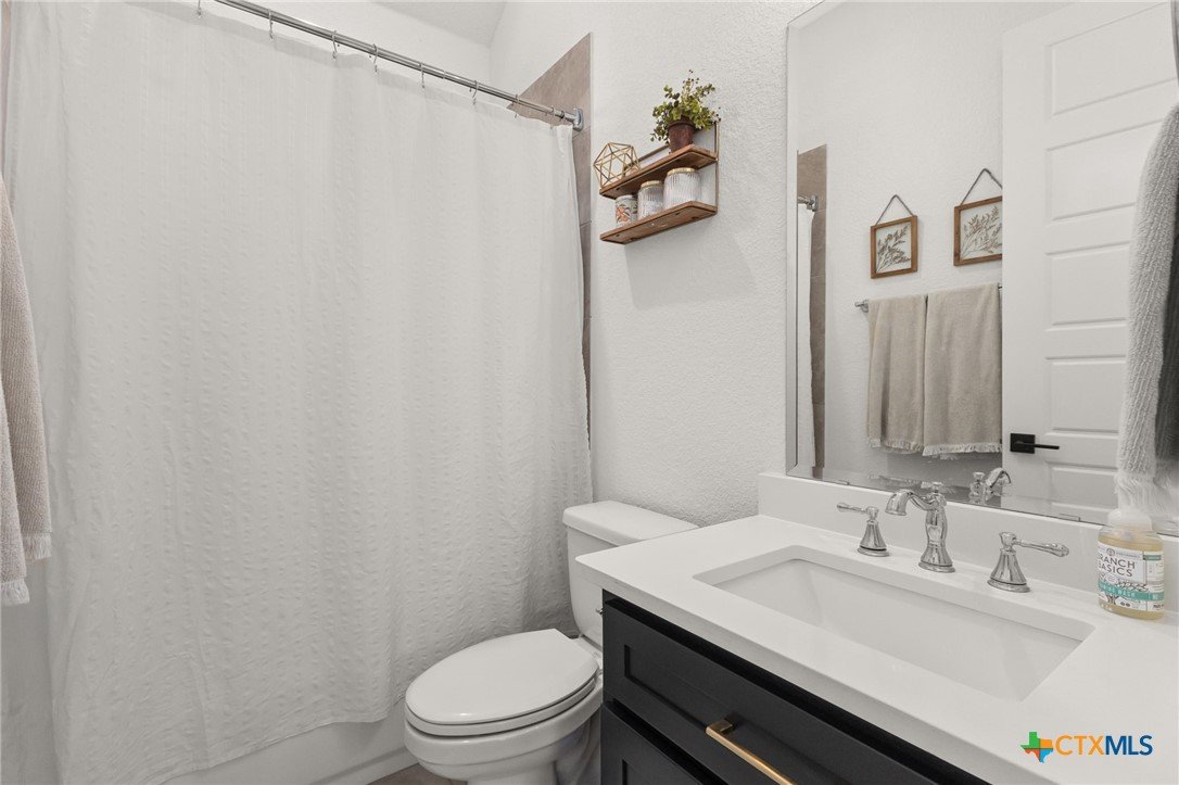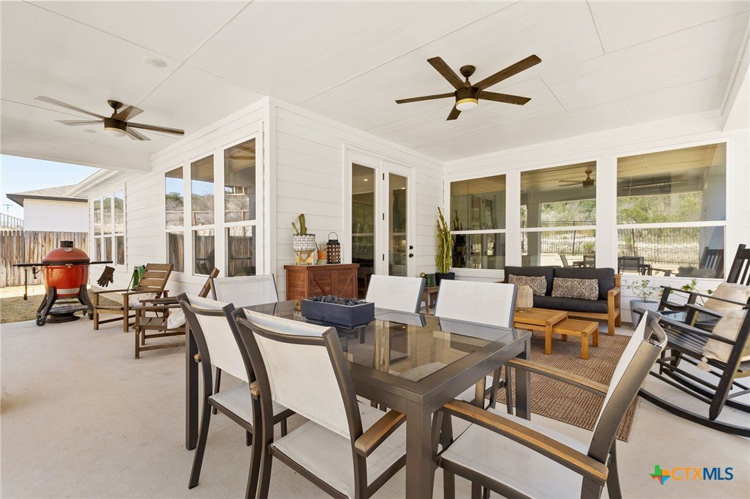 Welcome to this stunning 4-bedroom, 3-bathroom home inside the loop of New Braunfels! From the moment you step inside, you'll be captivated by the abundance of natural light that fills every room. The open-concept floor plan is perfect for both everyday living and entertaining, featuring high-end upgrades throughout, including premium flooring, designer lighting, and custom finishes that elevate the space. The gourmet kitchen boasts gas cooking, a spacious island, and beautiful cabinetry, making it a dream for any home chef. The expansive living and dining areas flow effortlessly, providing a perfect space for gatherings or quiet relaxation. The master suite is a true retreat, offering a luxurious en-suite bathroom with a soaking tub, separate shower, double vanities, and dual closets. Each of the additional bedrooms is generously sized, with plenty of closet space and ample natural light. The home also has a practical flex room that could be used as an office, play room, or media space. Step outside to the Texas-sized patio, ideal for outdoor living and entertaining. Enjoy the serene views of the greenbelt behind the property, offering both privacy and tranquility. Whether you're enjoying a cup of coffee in the morning or hosting a barbecue, this outdoor space is perfect for every occasion. Meticulously clean and meticulously maintained, this home is move-in ready and truly offers the best of New Braunfels living. Don't miss the opportunity to make this exceptional property your new home!
