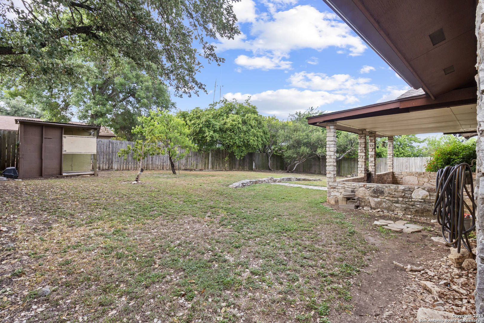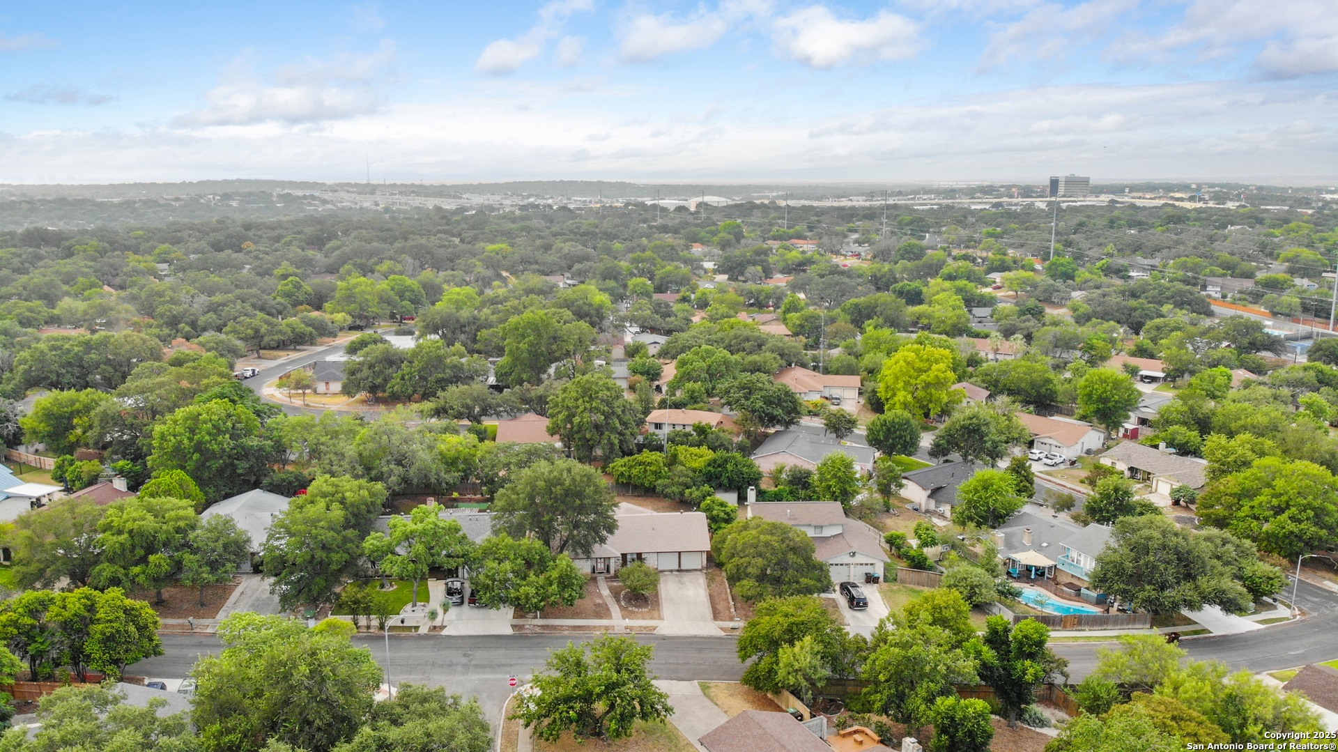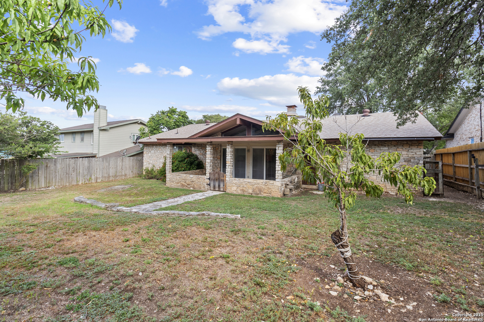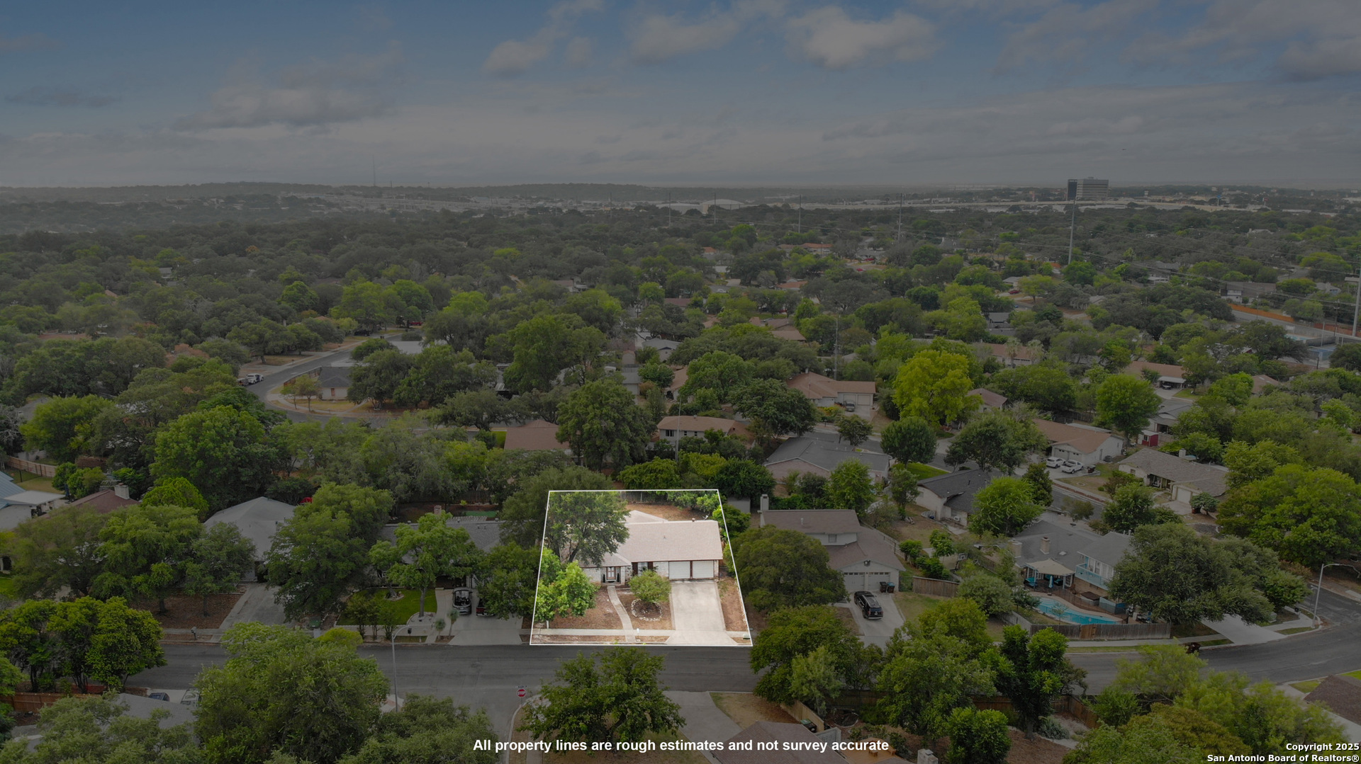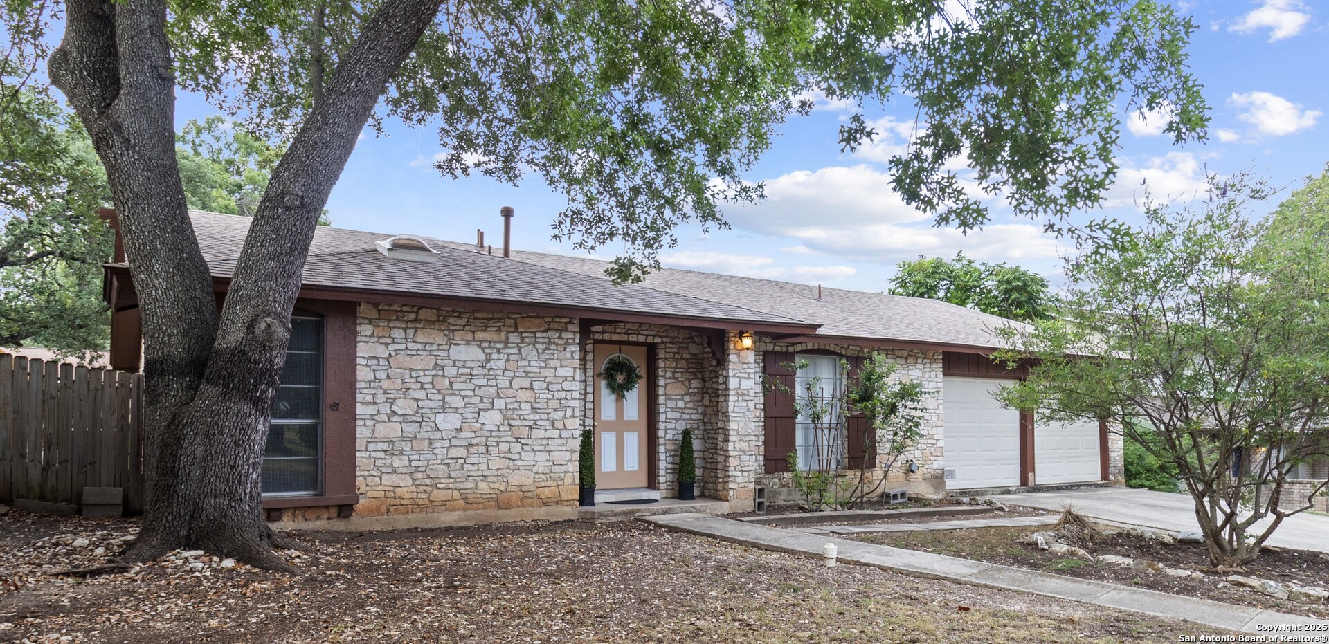 Welcome to 6910 Forest Way Street in San Antonio! This home has a smart layout, great natural light, and a location that's hard to beat. It's just minutes from the Medical Center, UTSA, and local military bases, making it a perfect fit for professionals, military members, families wanting Northside ISD schools, or investors looking for a smart rental. As you enter through the foyer, you'll notice the office to your left, which could easily be turned into a fourth bedroom. On the right is a formal dining room with elegant wainscoting that adds a touch of charm. Further in, natural light pours through the skylights and full wall of windows filling the wood-beamed living spaces with a warm, inviting glow. The kitchen offers a breakfast bar and a double oven, perfect for everyday meals or hosting guests. The layout includes a split floor plan, giving everyone space and privacy. One of the standout features is the guest bathroom, which includes an accessible walk-in shower - ideal for aging family members or guests with mobility needs. Step into the backyard and you'll find an expansive covered patio, a storage shed, and a dog run along the side of the house. There's also a peach tree and a nectarine tree, adding a touch of nature to this low-maintenance yard. The garage is ready for weekend projects or extra storage, with shelving throughout and a custom workbench already in place. From the practical layout to the thoughtful extras, this home offers flexibility, comfort, and convenience in one of San Antonio's most desirable areas.