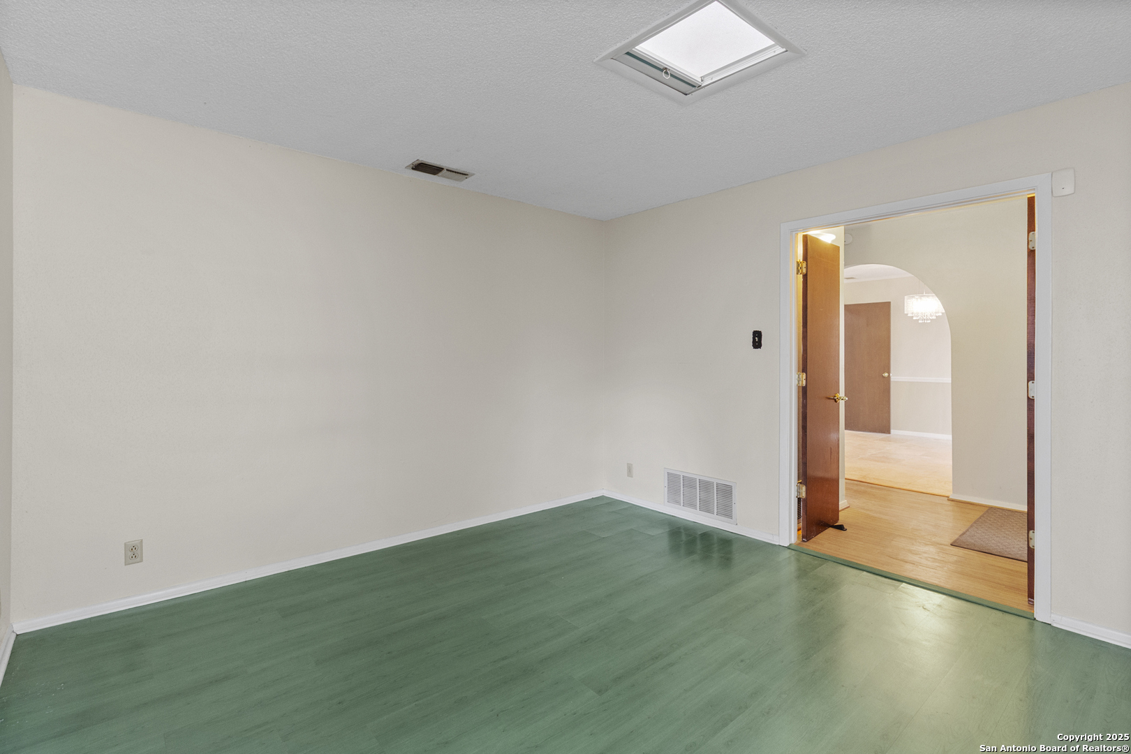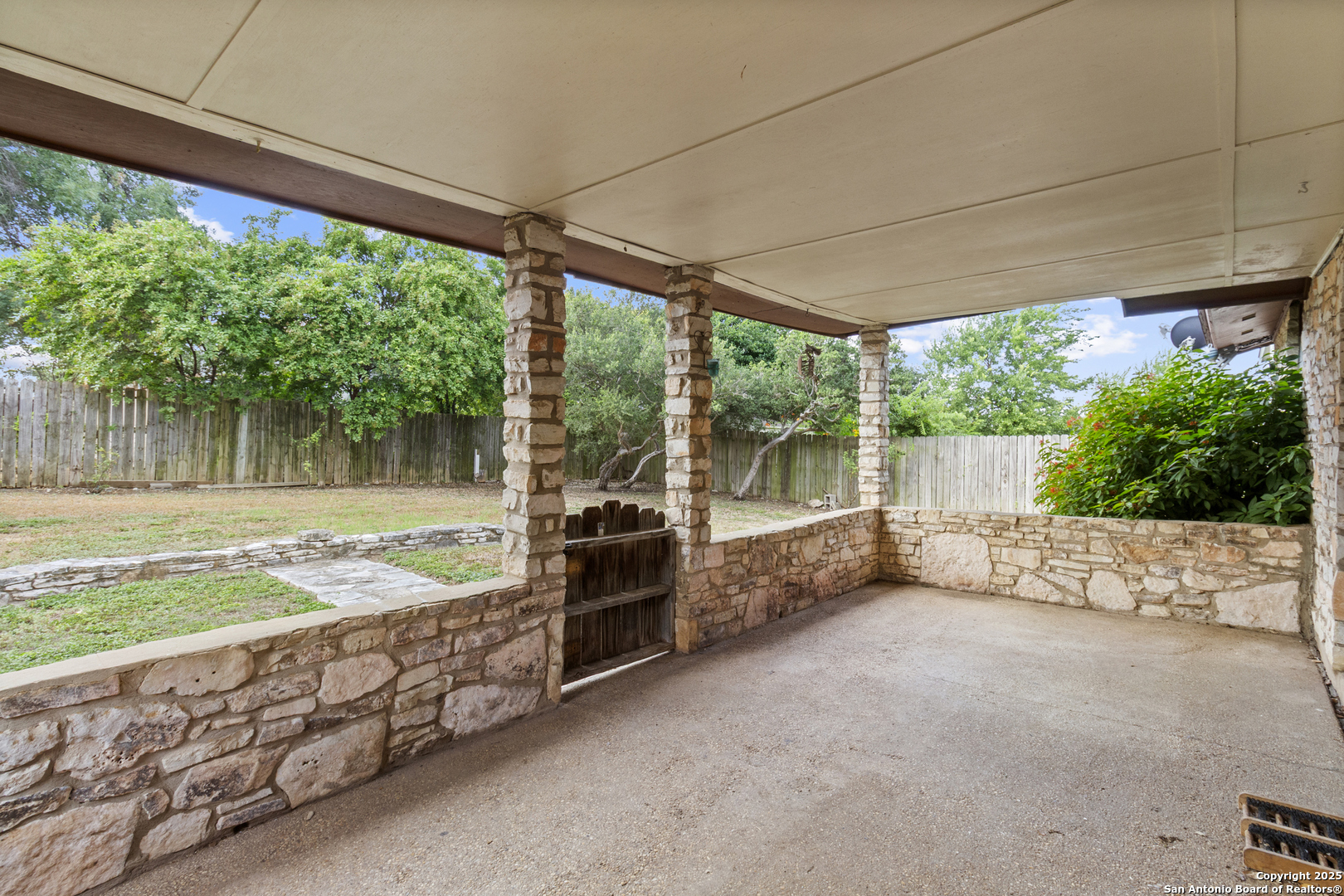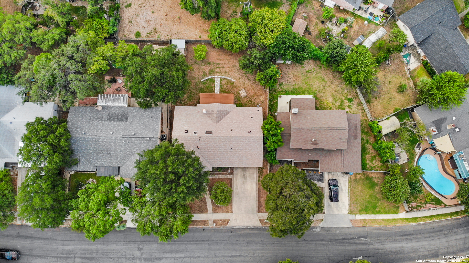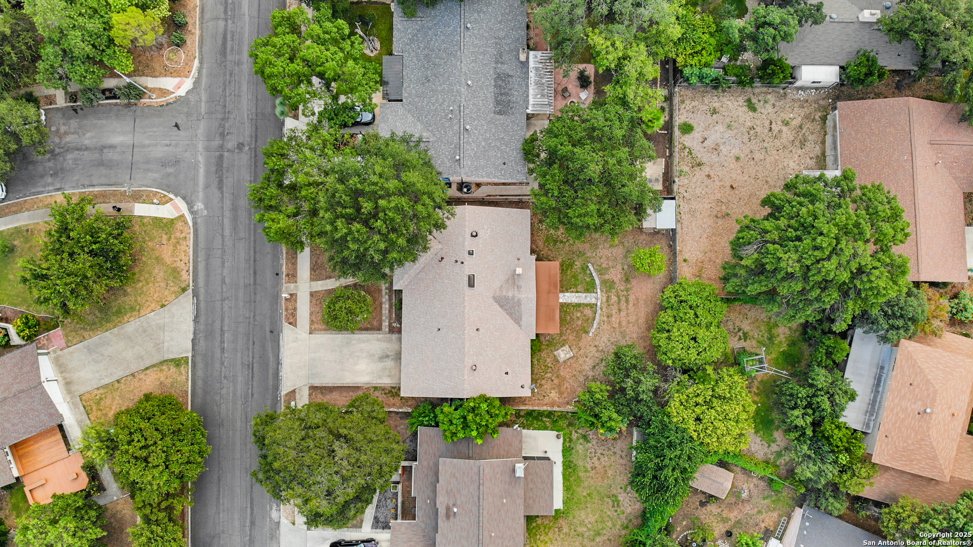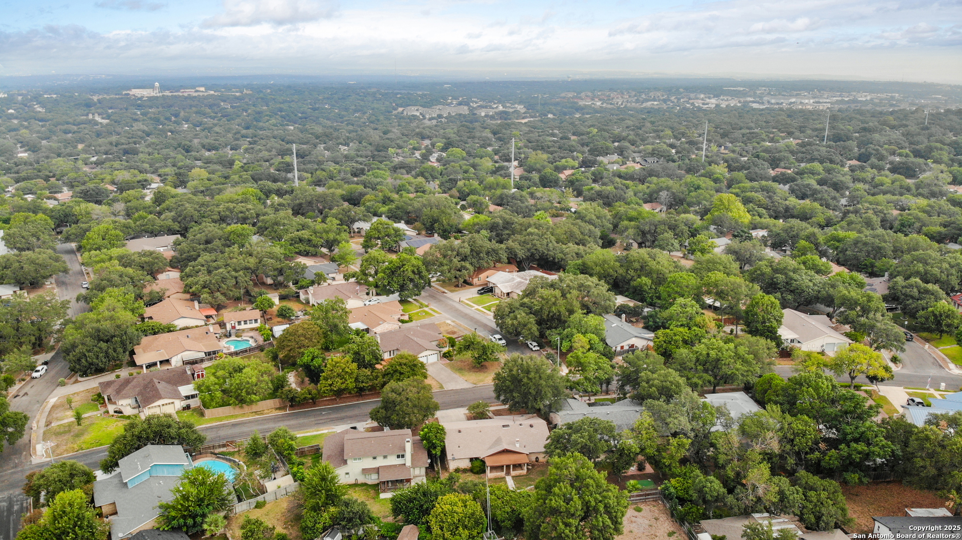 Welcome to 6910 Forest Way Street in San Antonio! This home has a smart layout, great natural light, and a location that's hard to beat. It's just minutes from the Medical Center, UTSA, and local military bases, making it a perfect fit for professionals, military members, families wanting Northside ISD schools, or investors looking for a smart rental. As you enter through the foyer, you'll notice the office to your left, which could easily be turned into a fourth bedroom. On the right is a formal dining room with elegant wainscoting that adds a touch of charm. Further in, natural light pours through the skylights and full wall of windows filling the wood-beamed living spaces with a warm, inviting glow. The kitchen offers a breakfast bar and a double oven, perfect for everyday meals or hosting guests. The layout includes a split floor plan, giving everyone space and privacy. One of the standout features is the guest bathroom, which includes an accessible walk-in shower - ideal for aging family members or guests with mobility needs. Step into the backyard and you'll find an expansive covered patio, a storage shed, and a dog run along the side of the house. There's also a peach tree and a nectarine tree, adding a touch of nature to this low-maintenance yard. The garage is ready for weekend projects or extra storage, with shelving throughout and a custom workbench already in place. From the practical layout to the thoughtful extras, this home offers flexibility, comfort, and convenience in one of San Antonio's most desirable areas.