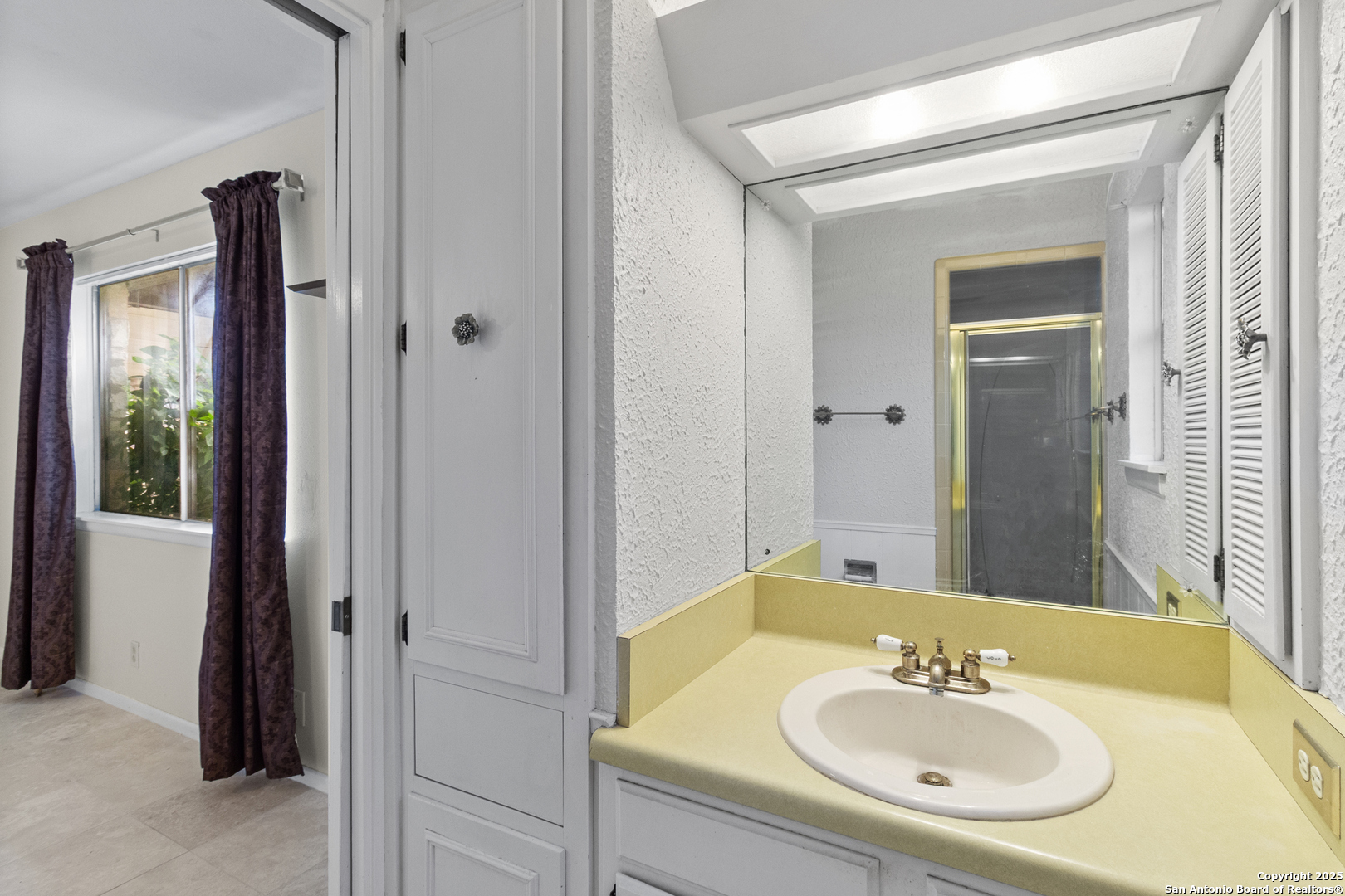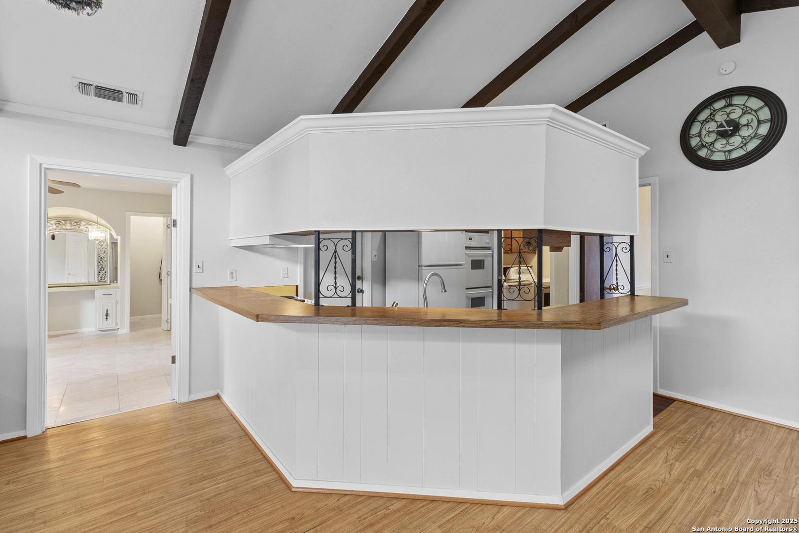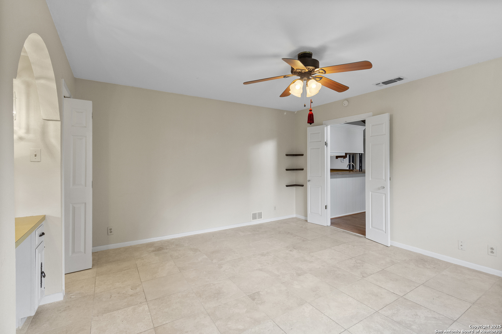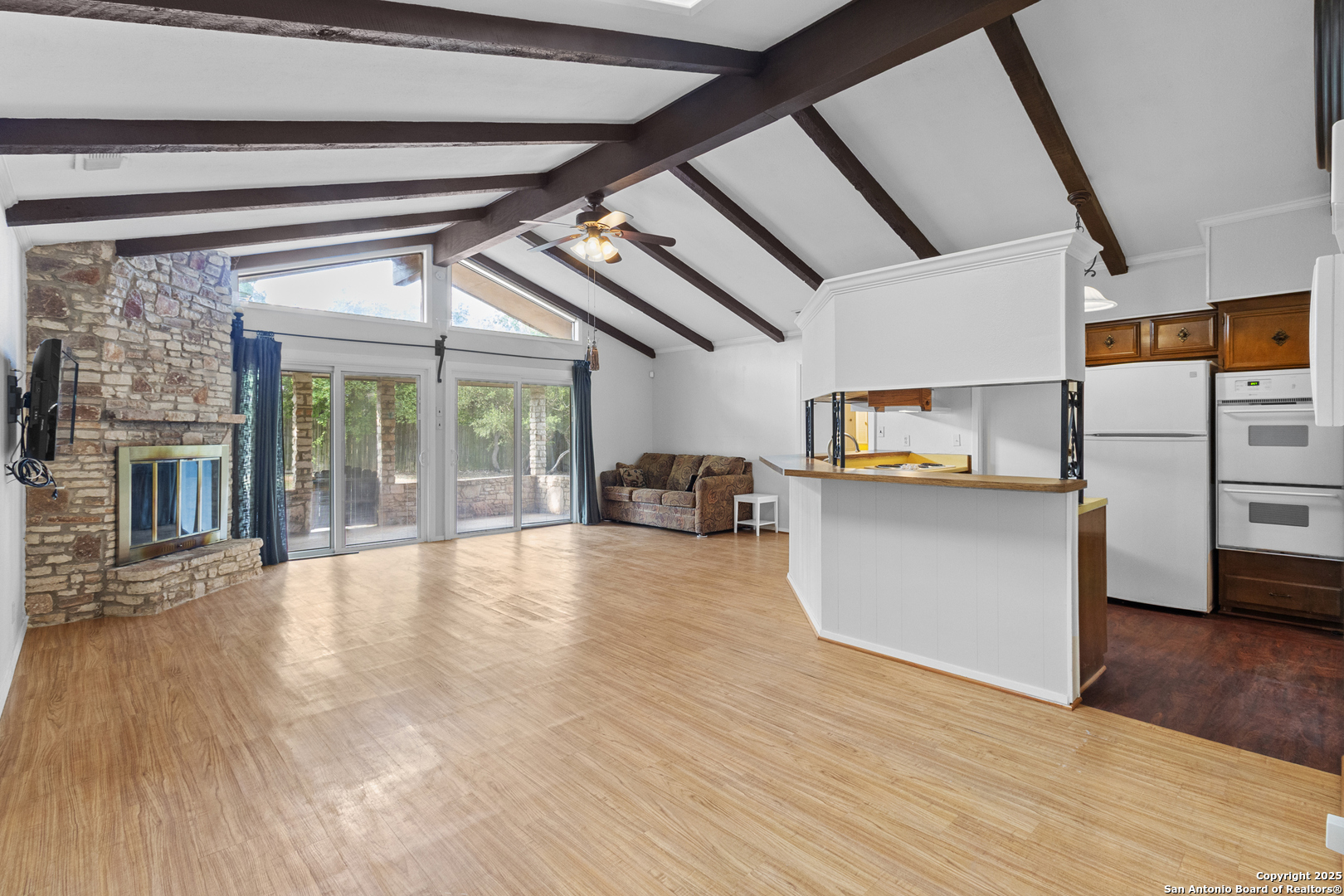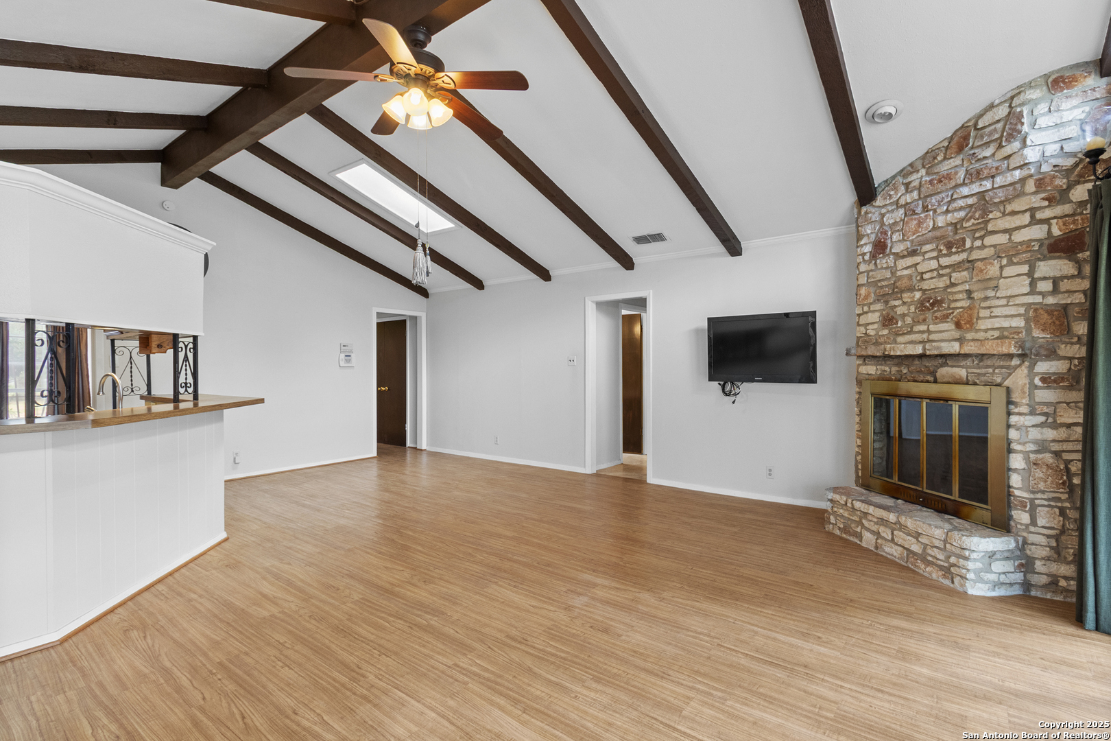 Welcome to 6910 Forest Way Street in San Antonio! This home has a smart layout, great natural light, and a location that's hard to beat. It's just minutes from the Medical Center, UTSA, and local military bases, making it a perfect fit for professionals, military members, families wanting Northside ISD schools, or investors looking for a smart rental. As you enter through the foyer, you'll notice the office to your left, which could easily be turned into a fourth bedroom. On the right is a formal dining room with elegant wainscoting that adds a touch of charm. Further in, natural light pours through the skylights and full wall of windows filling the wood-beamed living spaces with a warm, inviting glow. The kitchen offers a breakfast bar and a double oven, perfect for everyday meals or hosting guests. The layout includes a split floor plan, giving everyone space and privacy. One of the standout features is the guest bathroom, which includes an accessible walk-in shower - ideal for aging family members or guests with mobility needs. Step into the backyard and you'll find an expansive covered patio, a storage shed, and a dog run along the side of the house. There's also a peach tree and a nectarine tree, adding a touch of nature to this low-maintenance yard. The garage is ready for weekend projects or extra storage, with shelving throughout and a custom workbench already in place. From the practical layout to the thoughtful extras, this home offers flexibility, comfort, and convenience in one of San Antonio's most desirable areas.