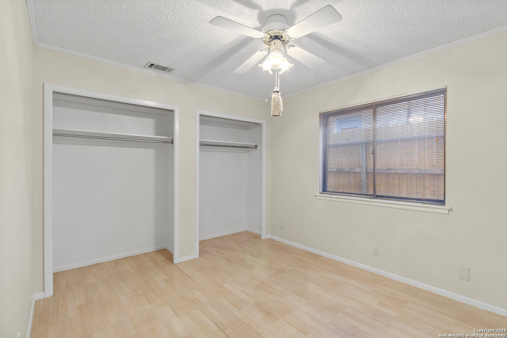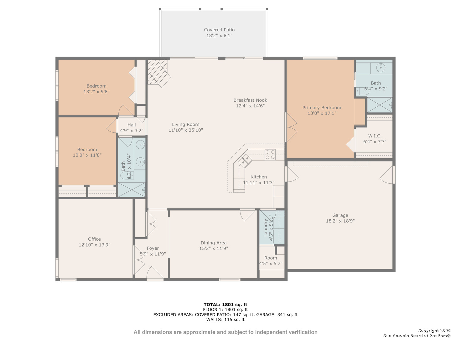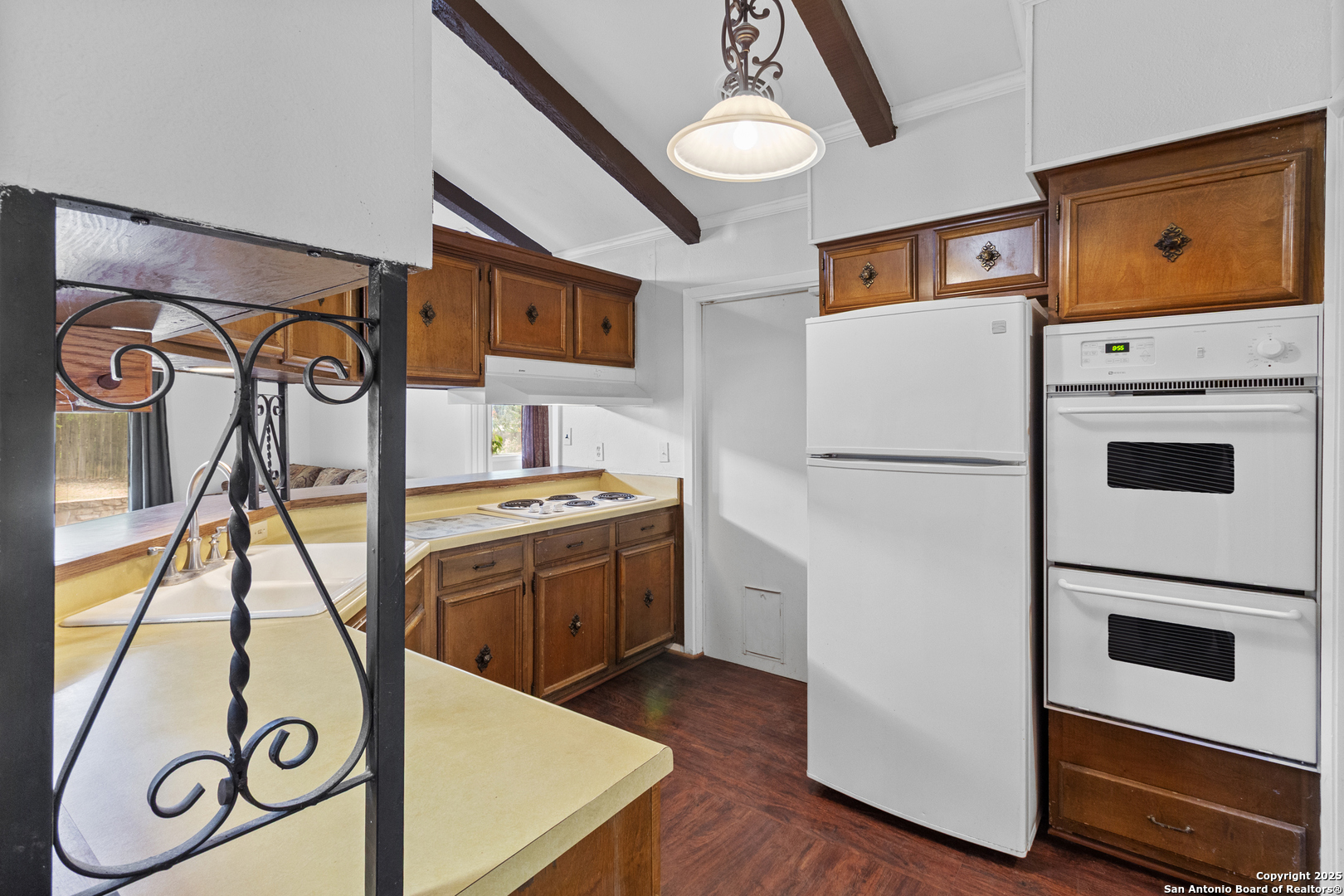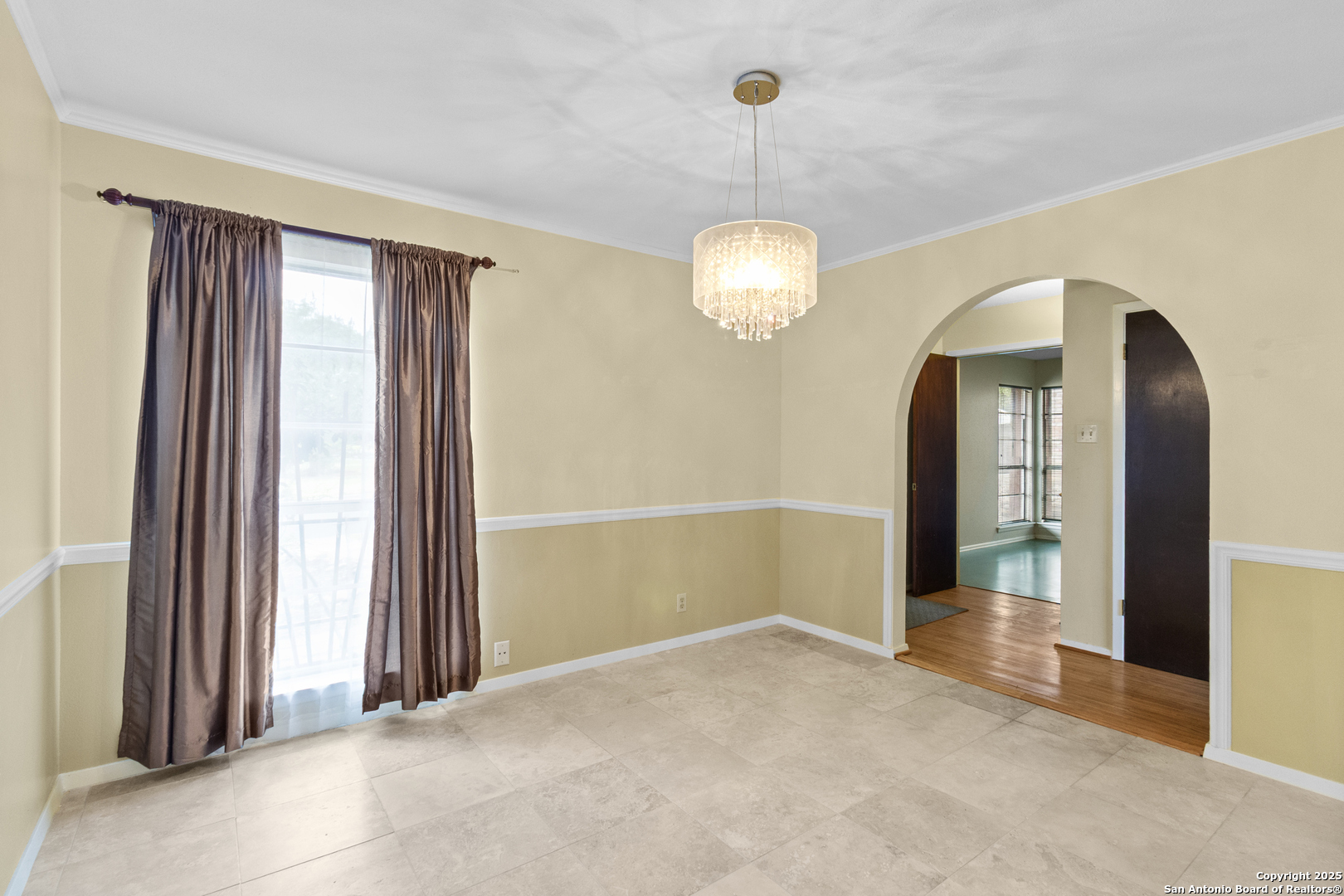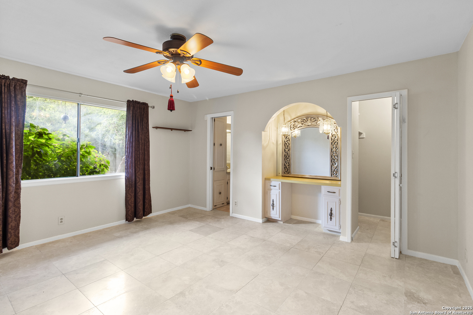 Welcome to 6910 Forest Way Street in San Antonio! This home has a smart layout, great natural light, and a location that's hard to beat. It's just minutes from the Medical Center, UTSA, and local military bases, making it a perfect fit for professionals, military members, families wanting Northside ISD schools, or investors looking for a smart rental. As you enter through the foyer, you'll notice the office to your left, which could easily be turned into a fourth bedroom. On the right is a formal dining room with elegant wainscoting that adds a touch of charm. Further in, natural light pours through the skylights and full wall of windows filling the wood-beamed living spaces with a warm, inviting glow. The kitchen offers a breakfast bar and a double oven, perfect for everyday meals or hosting guests. The layout includes a split floor plan, giving everyone space and privacy. One of the standout features is the guest bathroom, which includes an accessible walk-in shower - ideal for aging family members or guests with mobility needs. Step into the backyard and you'll find an expansive covered patio, a storage shed, and a dog run along the side of the house. There's also a peach tree and a nectarine tree, adding a touch of nature to this low-maintenance yard. The garage is ready for weekend projects or extra storage, with shelving throughout and a custom workbench already in place. From the practical layout to the thoughtful extras, this home offers flexibility, comfort, and convenience in one of San Antonio's most desirable areas.