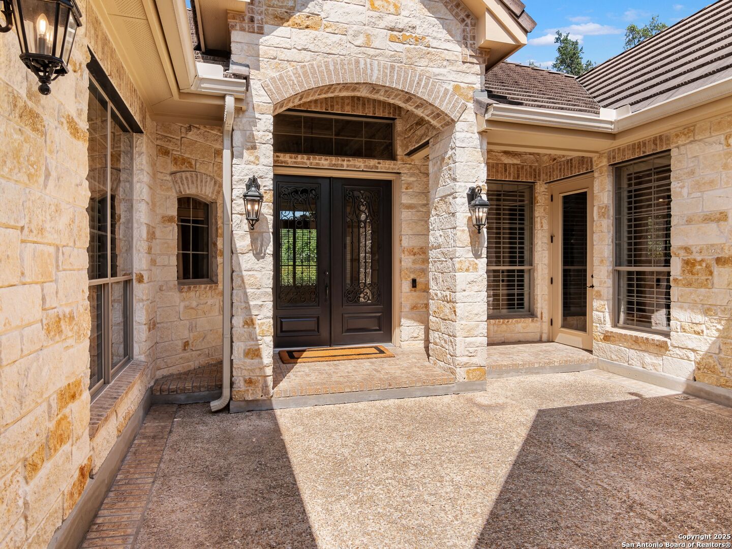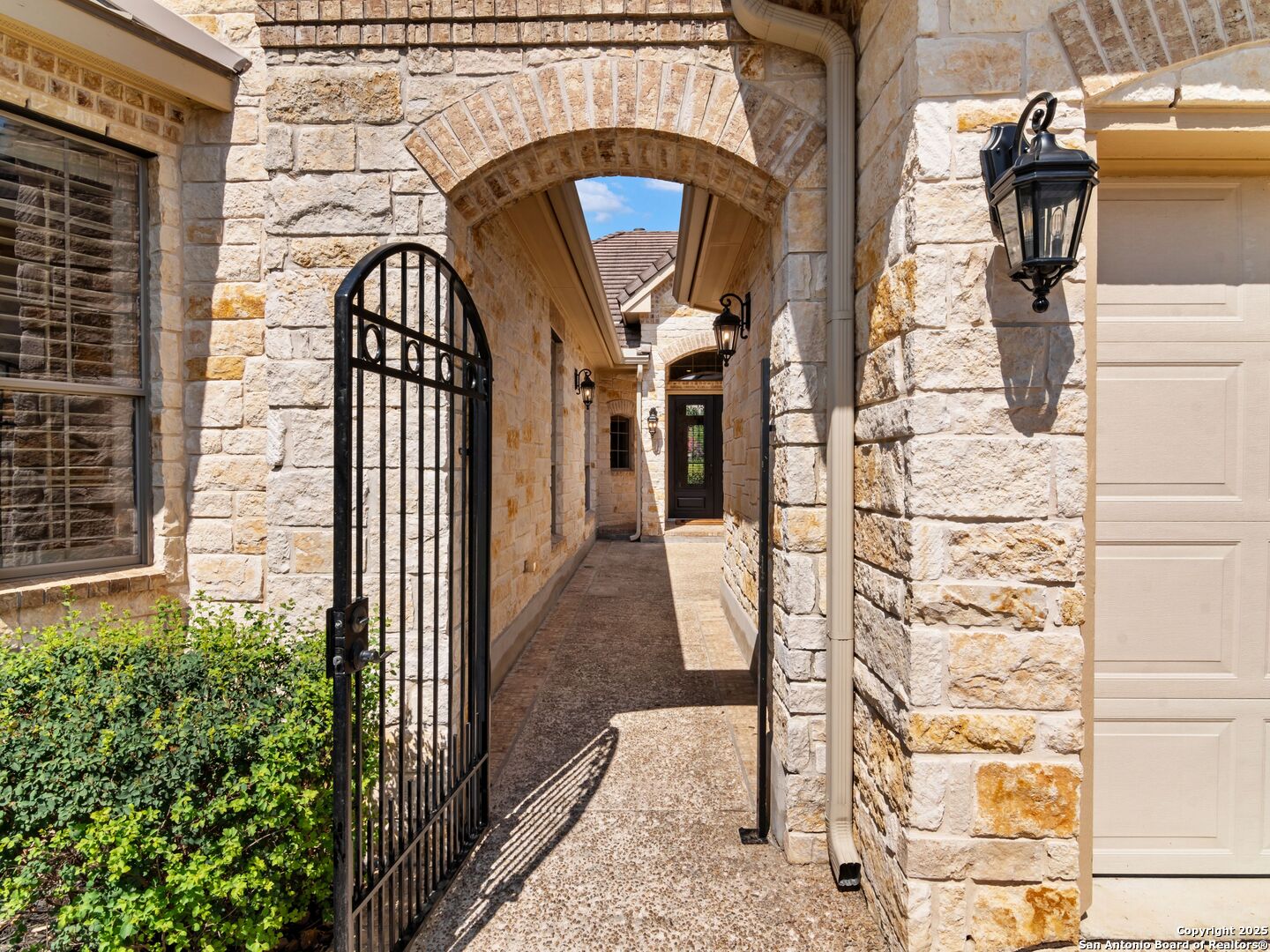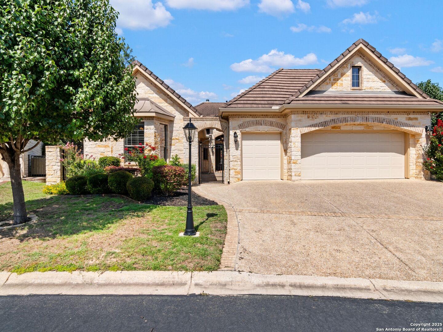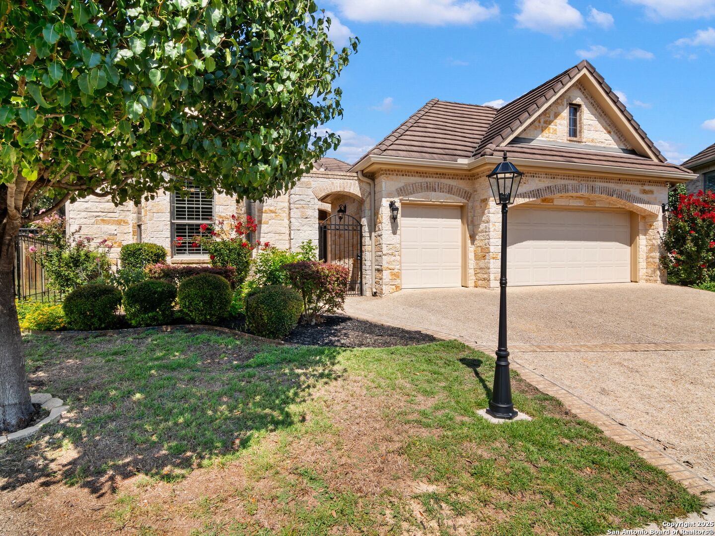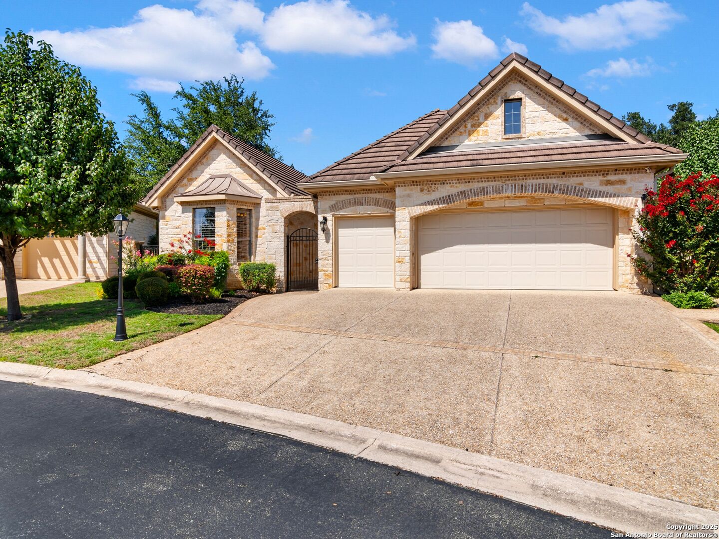 Located in one of San Antonio's most exclusive golf course neighborhoods, The Dominion, this one story garden home is situated on an oversized .26 acre lot with lush landscaping. An expansive courtyard entrance invites you to this 3-bedroom, 2.5-bath residence. Inside, the quality and grand architectural details are evident, featuring soaring 10- to 12-foot ceilings, 8-foot doors, and rich natural light pouring through ample wood-shuttered windows. The layout is open and airy, with warm wood flooring and tile in the main living areas. A thoughtfully designed kitchen offers gas cooking, a built-in refrigerator, and generous cabinetry and counter space. Just off the kitchen, the spacious laundry room includes additional storage and room for a second refrigerator. The living room is perfectly situated and offers stone fireplace, wet bar, and creates an ideal space for entertaining or relaxing. Stone exterior, tile roof, full fencing, and an extra-wide driveway with convenient guest parking add both curb appeal and everyday ease. The large covered patio provides a peaceful outdoor retreat, perfect for morning coffee or evening dining.The oversized 2.5-car garage includes a golf cart bay. Additional features include water softener, central vacuum system, 2022 water heater, and generous storage throughout. Located in close proximity to mailboxes, neighborhood dog park, and just minutes from The Dominion Country Club and its top of the line amenities, fine dining, luxury shopping, Medical Center, major employers, and 35 minutes to San Antonio International Airport.