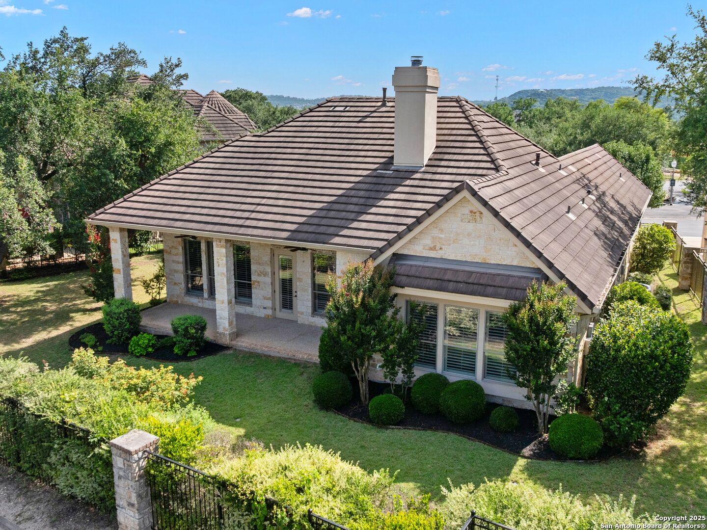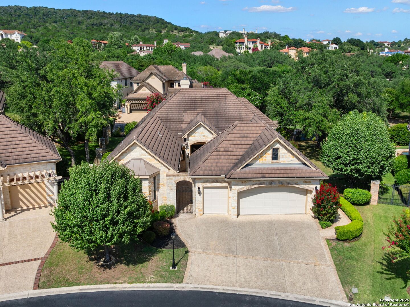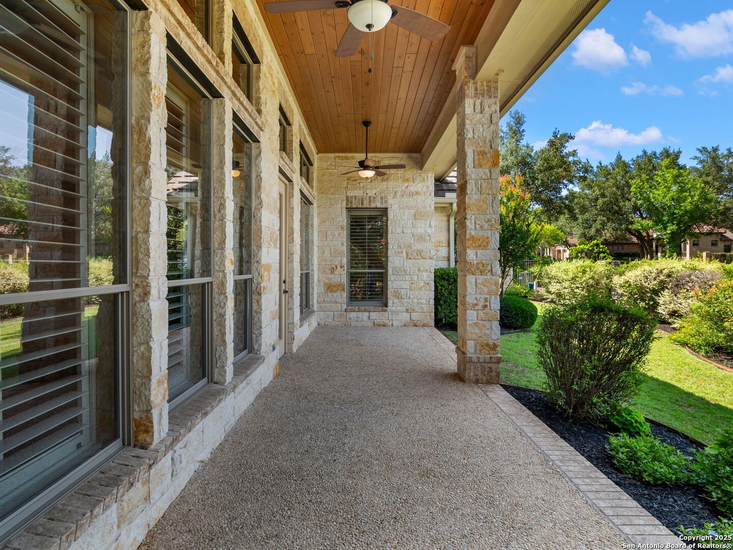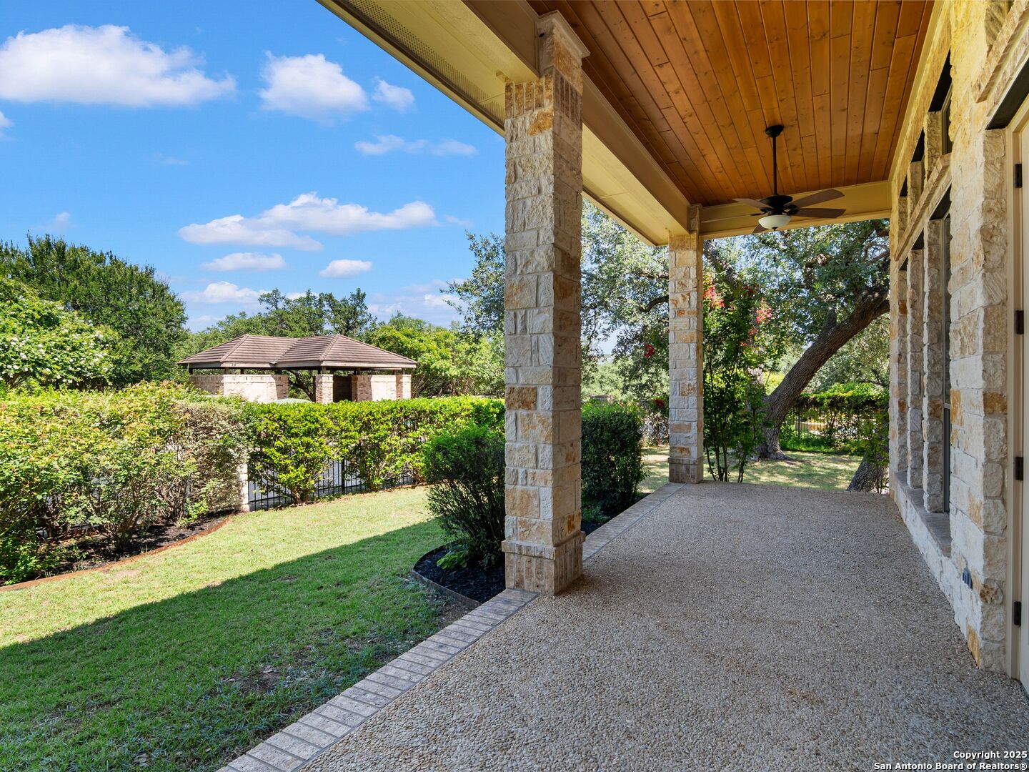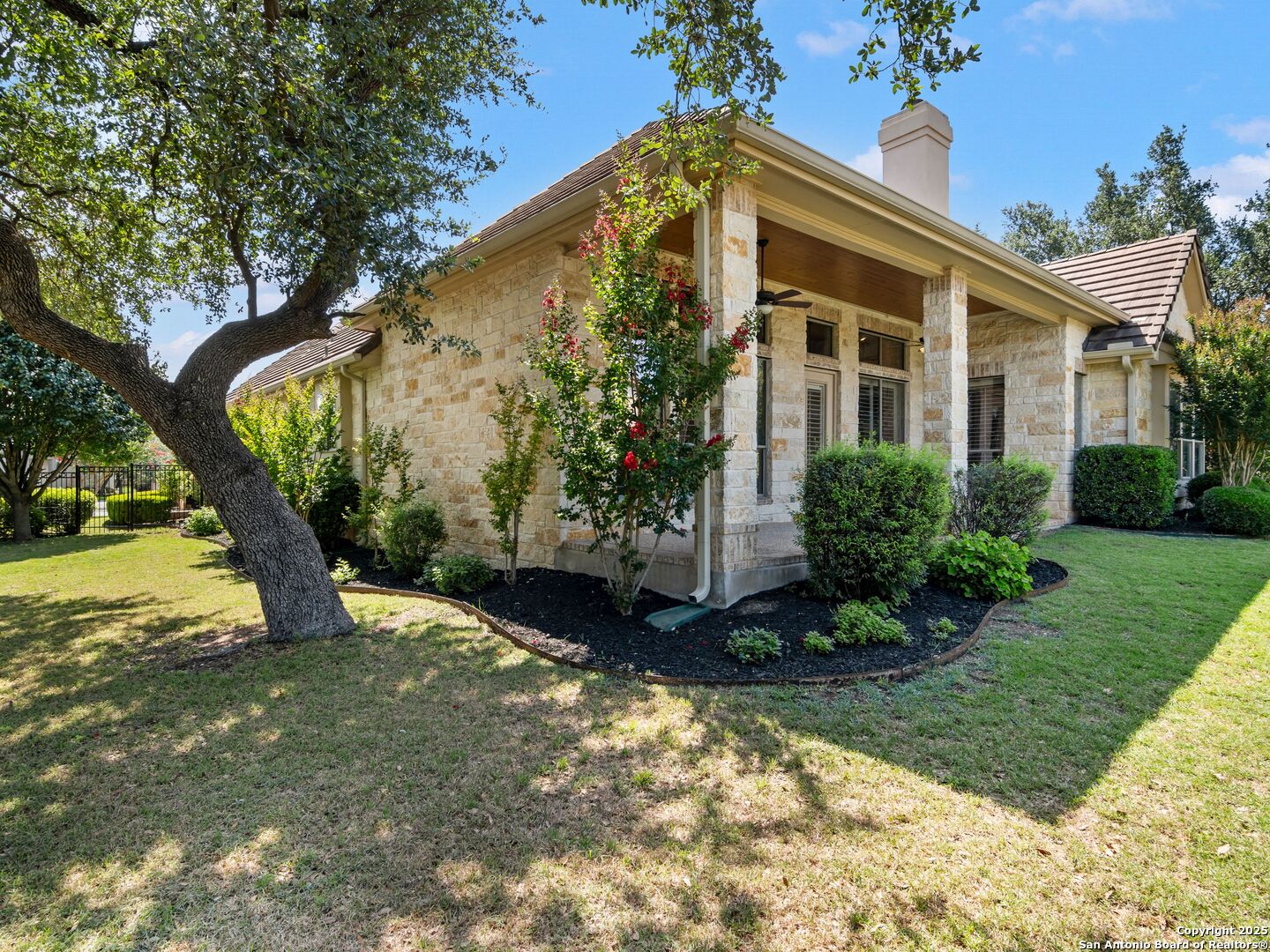 Located in one of San Antonio's most exclusive golf course neighborhoods, The Dominion, this one story garden home is situated on an oversized .26 acre lot with lush landscaping. An expansive courtyard entrance invites you to this 3-bedroom, 2.5-bath residence. Inside, the quality and grand architectural details are evident, featuring soaring 10- to 12-foot ceilings, 8-foot doors, and rich natural light pouring through ample wood-shuttered windows. The layout is open and airy, with warm wood flooring and tile in the main living areas. A thoughtfully designed kitchen offers gas cooking, a built-in refrigerator, and generous cabinetry and counter space. Just off the kitchen, the spacious laundry room includes additional storage and room for a second refrigerator. The living room is perfectly situated and offers stone fireplace, wet bar, and creates an ideal space for entertaining or relaxing. Stone exterior, tile roof, full fencing, and an extra-wide driveway with convenient guest parking add both curb appeal and everyday ease. The large covered patio provides a peaceful outdoor retreat, perfect for morning coffee or evening dining.The oversized 2.5-car garage includes a golf cart bay. Additional features include water softener, central vacuum system, 2022 water heater, and generous storage throughout. Located in close proximity to mailboxes, neighborhood dog park, and just minutes from The Dominion Country Club and its top of the line amenities, fine dining, luxury shopping, Medical Center, major employers, and 35 minutes to San Antonio International Airport.