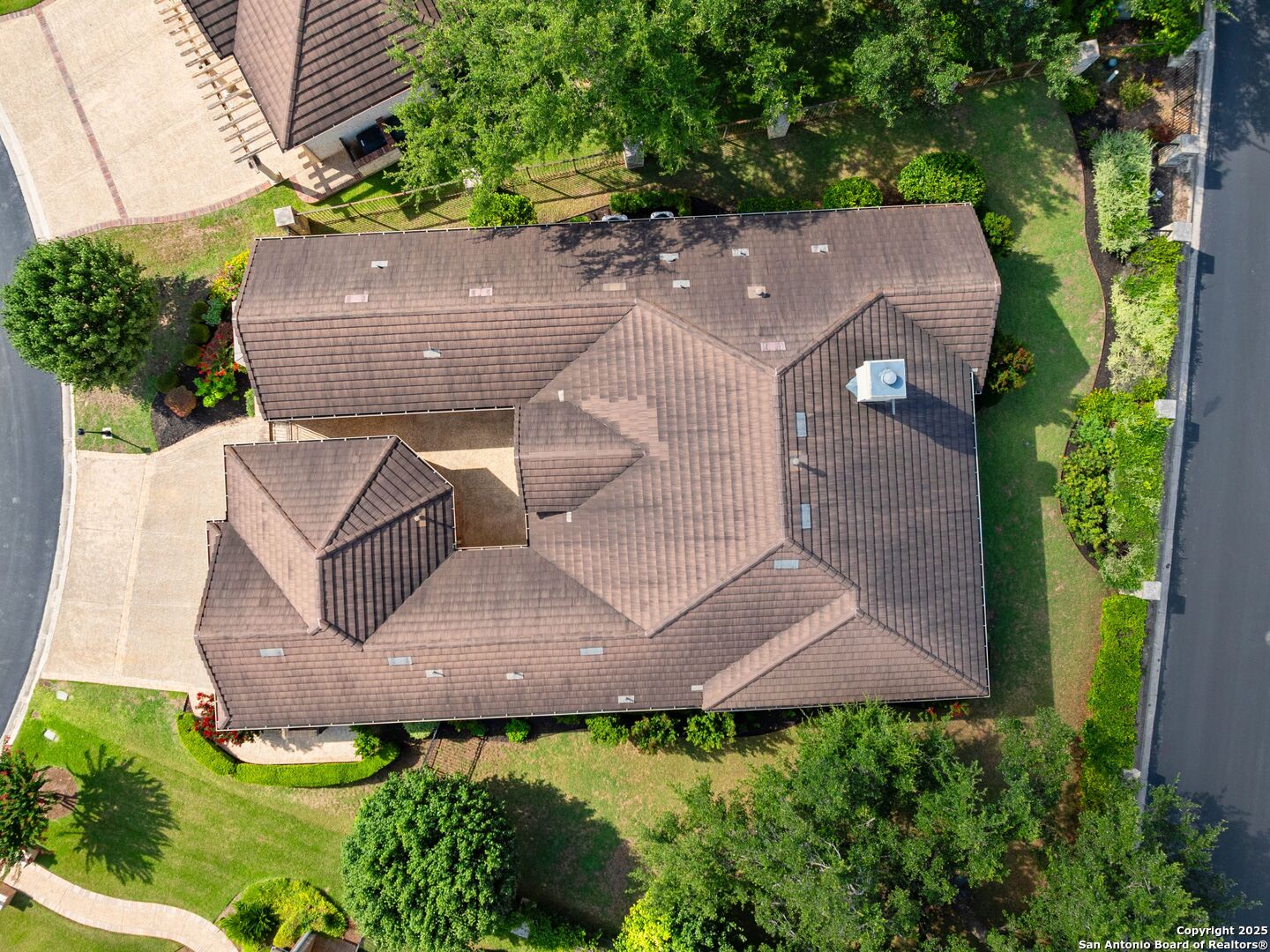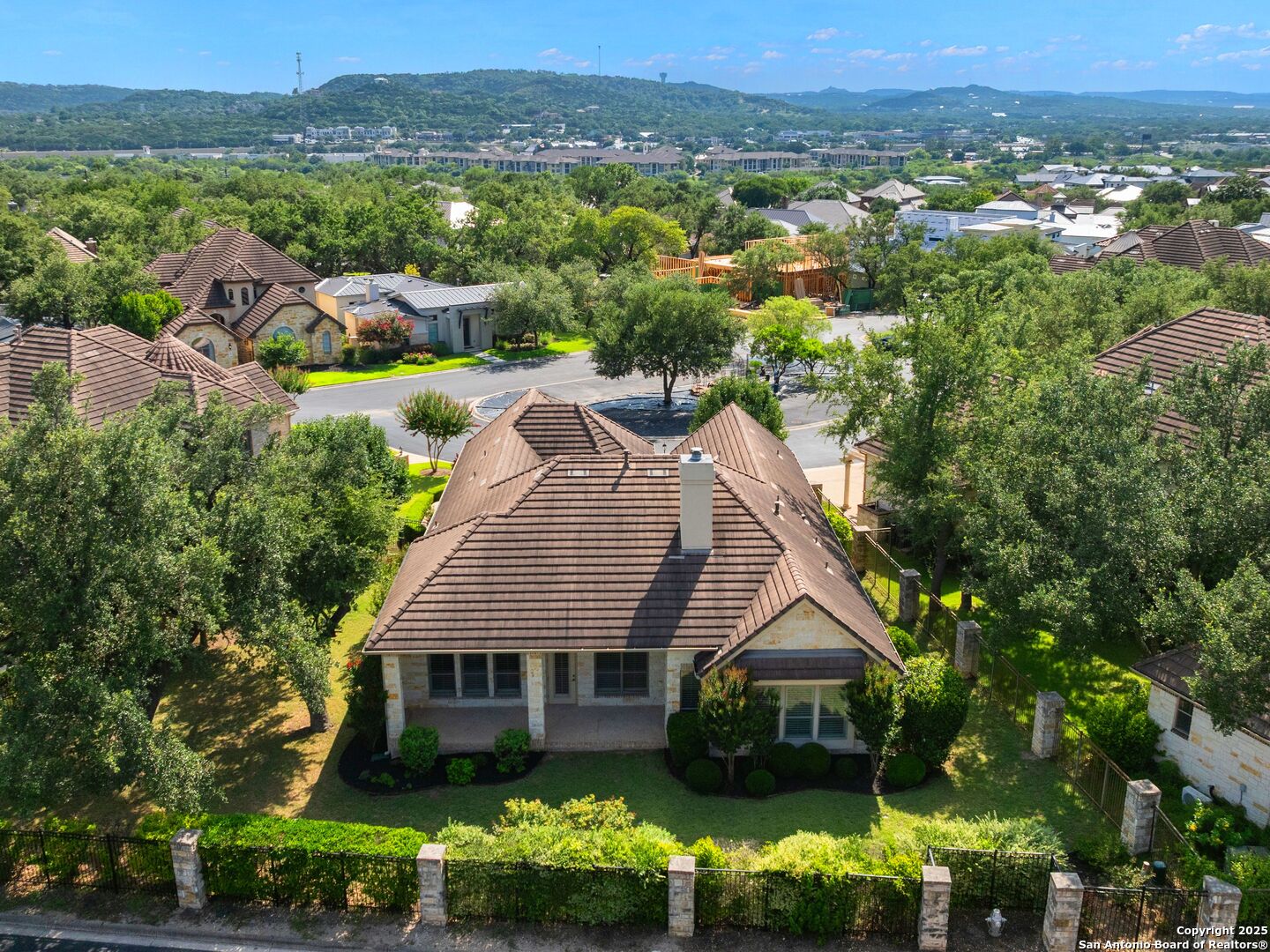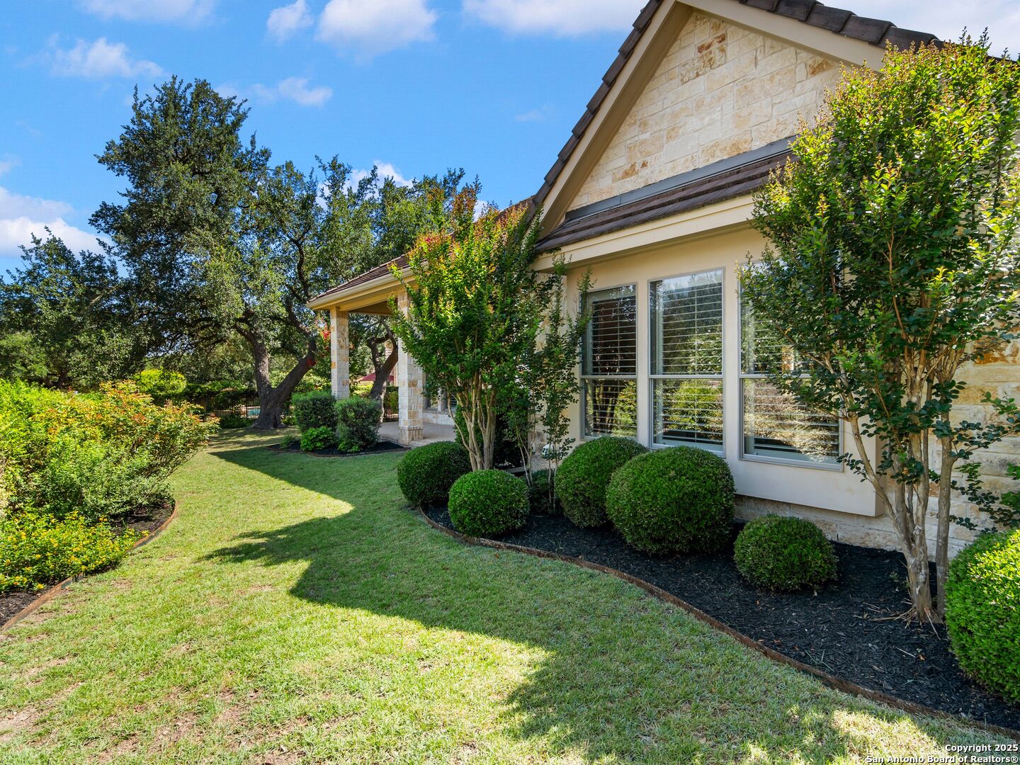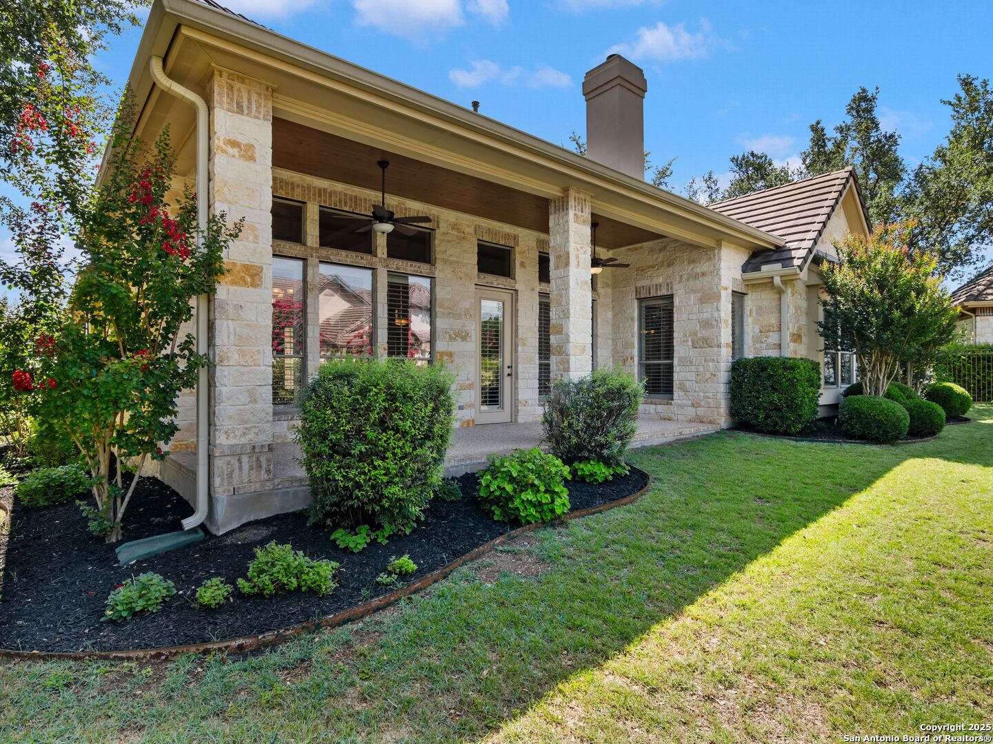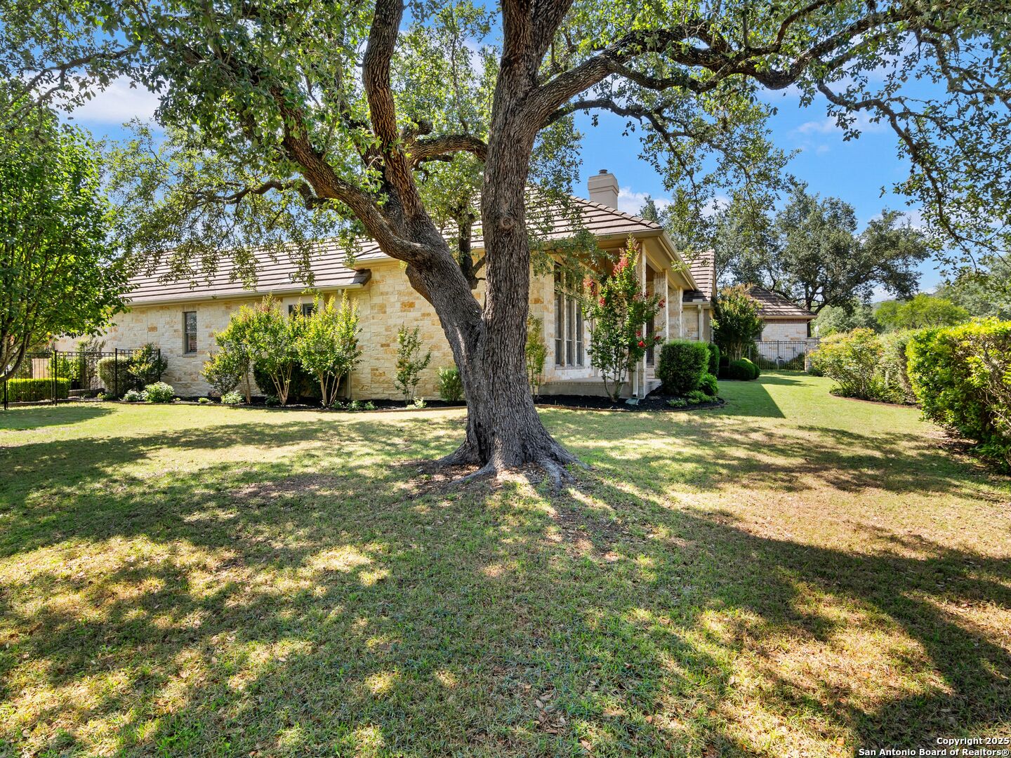 Located in one of San Antonio's most exclusive golf course neighborhoods, The Dominion, this one story garden home is situated on an oversized .26 acre lot with lush landscaping. An expansive courtyard entrance invites you to this 3-bedroom, 2.5-bath residence. Inside, the quality and grand architectural details are evident, featuring soaring 10- to 12-foot ceilings, 8-foot doors, and rich natural light pouring through ample wood-shuttered windows. The layout is open and airy, with warm wood flooring and tile in the main living areas. A thoughtfully designed kitchen offers gas cooking, a built-in refrigerator, and generous cabinetry and counter space. Just off the kitchen, the spacious laundry room includes additional storage and room for a second refrigerator. The living room is perfectly situated and offers stone fireplace, wet bar, and creates an ideal space for entertaining or relaxing. Stone exterior, tile roof, full fencing, and an extra-wide driveway with convenient guest parking add both curb appeal and everyday ease. The large covered patio provides a peaceful outdoor retreat, perfect for morning coffee or evening dining.The oversized 2.5-car garage includes a golf cart bay. Additional features include water softener, central vacuum system, 2022 water heater, and generous storage throughout. Located in close proximity to mailboxes, neighborhood dog park, and just minutes from The Dominion Country Club and its top of the line amenities, fine dining, luxury shopping, Medical Center, major employers, and 35 minutes to San Antonio International Airport.