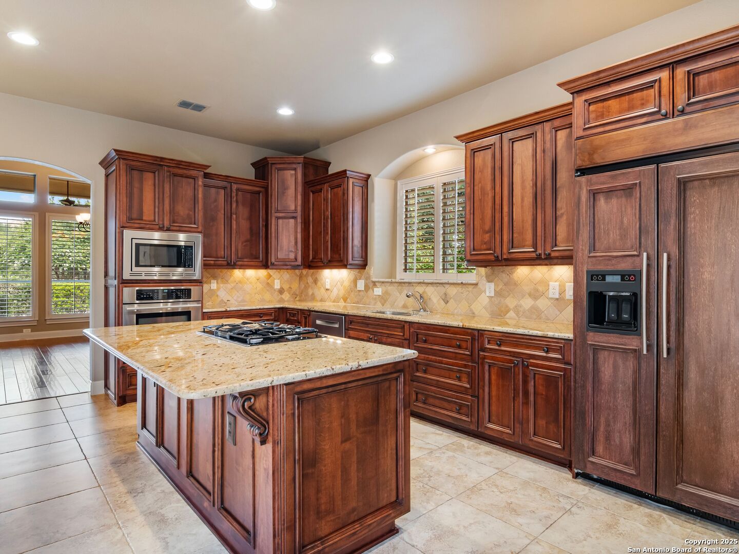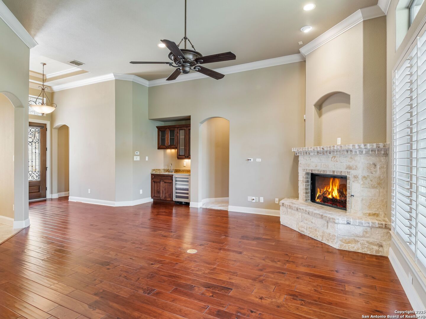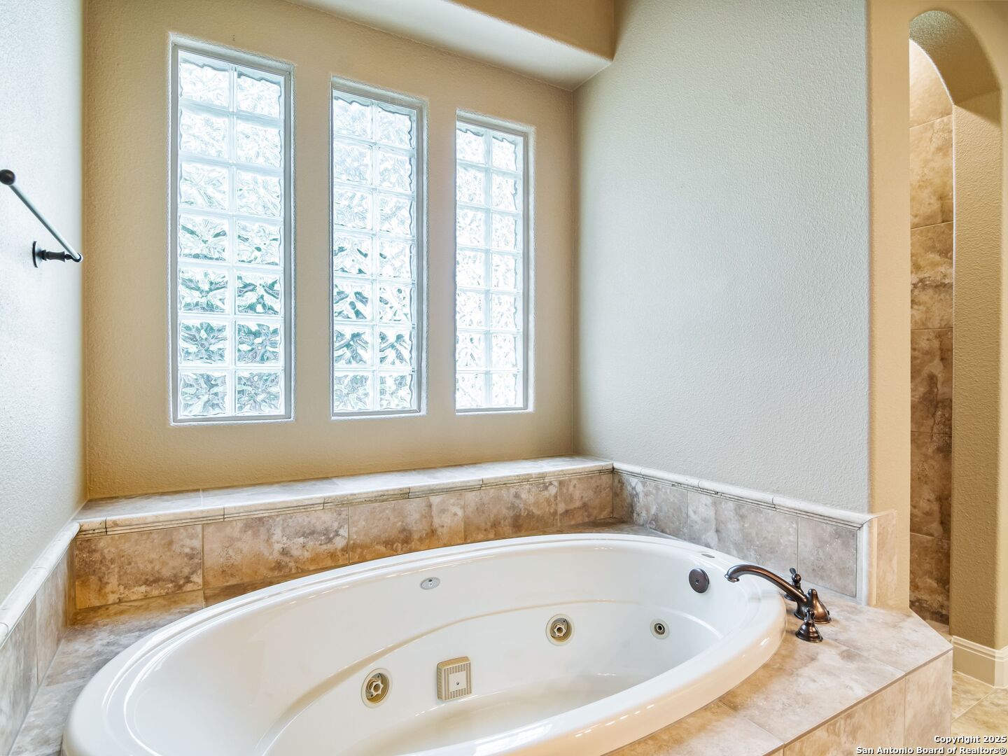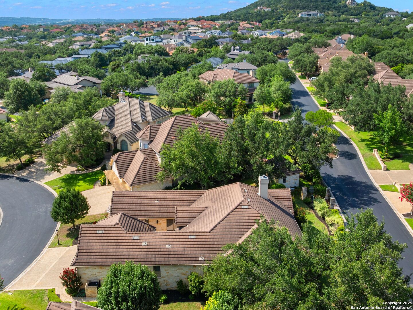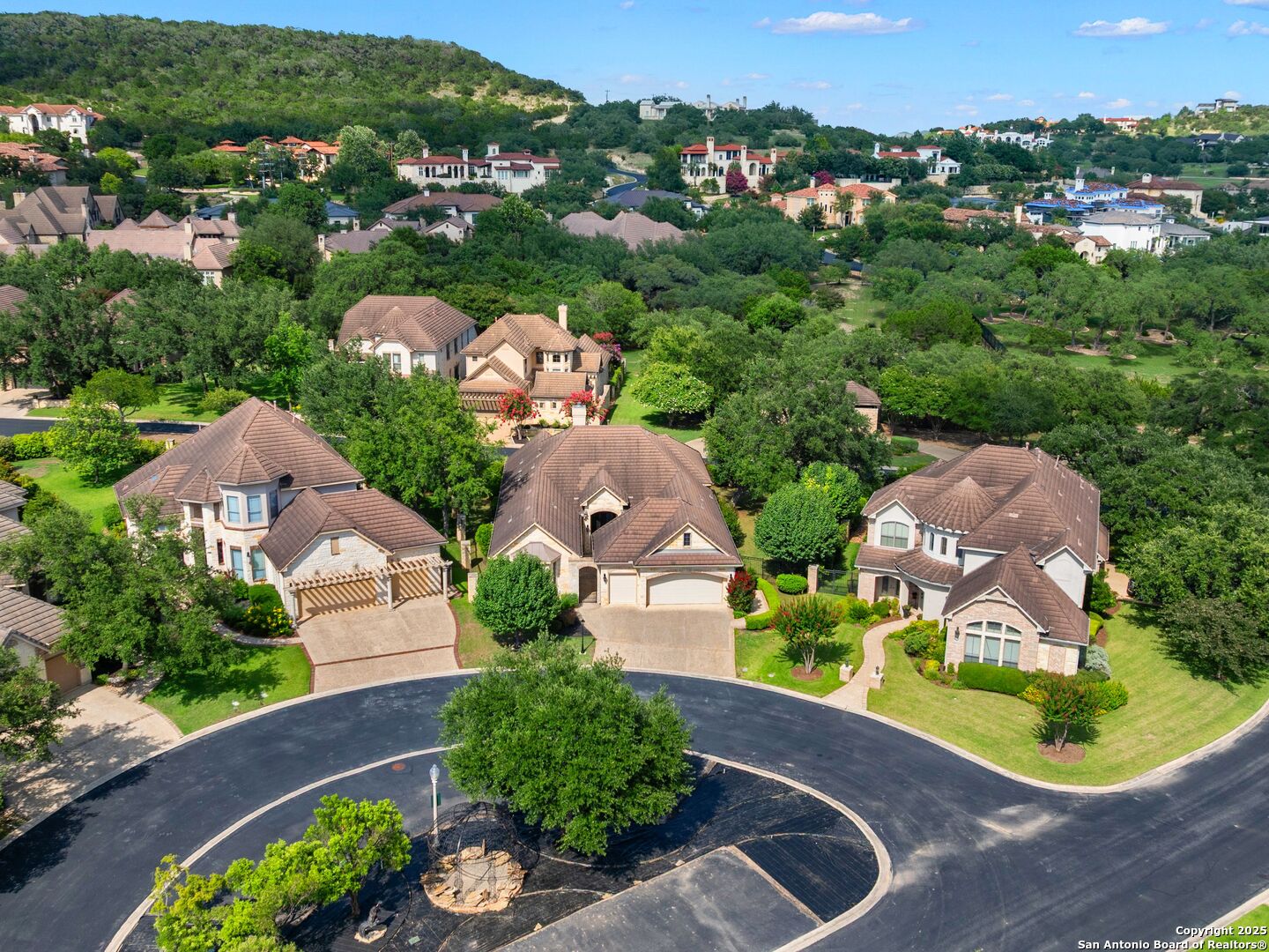Located in one of San Antonio's most exclusive golf course neighborhoods, The Dominion, this one story garden home is situated on an oversized .26 acre lot with lush landscaping. An expansive courtyard entrance invites you to this 3-bedroom, 2.5-bath residence. Inside, the quality and grand architectural details are evident, featuring soaring 10- to 12-foot ceilings, 8-foot doors, and rich natural light pouring through ample wood-shuttered windows. The layout is open and airy, with warm wood flooring and tile in the main living areas. A thoughtfully designed kitchen offers gas cooking, a built-in refrigerator, and generous cabinetry and counter space. Just off the kitchen, the spacious laundry room includes additional storage and room for a second refrigerator. The living room is perfectly situated and offers stone fireplace, wet bar, and creates an ideal space for entertaining or relaxing. Stone exterior, tile roof, full fencing, and an extra-wide driveway with convenient guest parking add both curb appeal and everyday ease. The large covered patio provides a peaceful outdoor retreat, perfect for morning coffee or evening dining.The oversized 2.5-car garage includes a golf cart bay. Additional features include water softener, central vacuum system, 2022 water heater, and generous storage throughout. Located in close proximity to mailboxes, neighborhood dog park, and just minutes from The Dominion Country Club and its top of the line amenities, fine dining, luxury shopping, Medical Center, major employers, and 35 minutes to San Antonio International Airport.