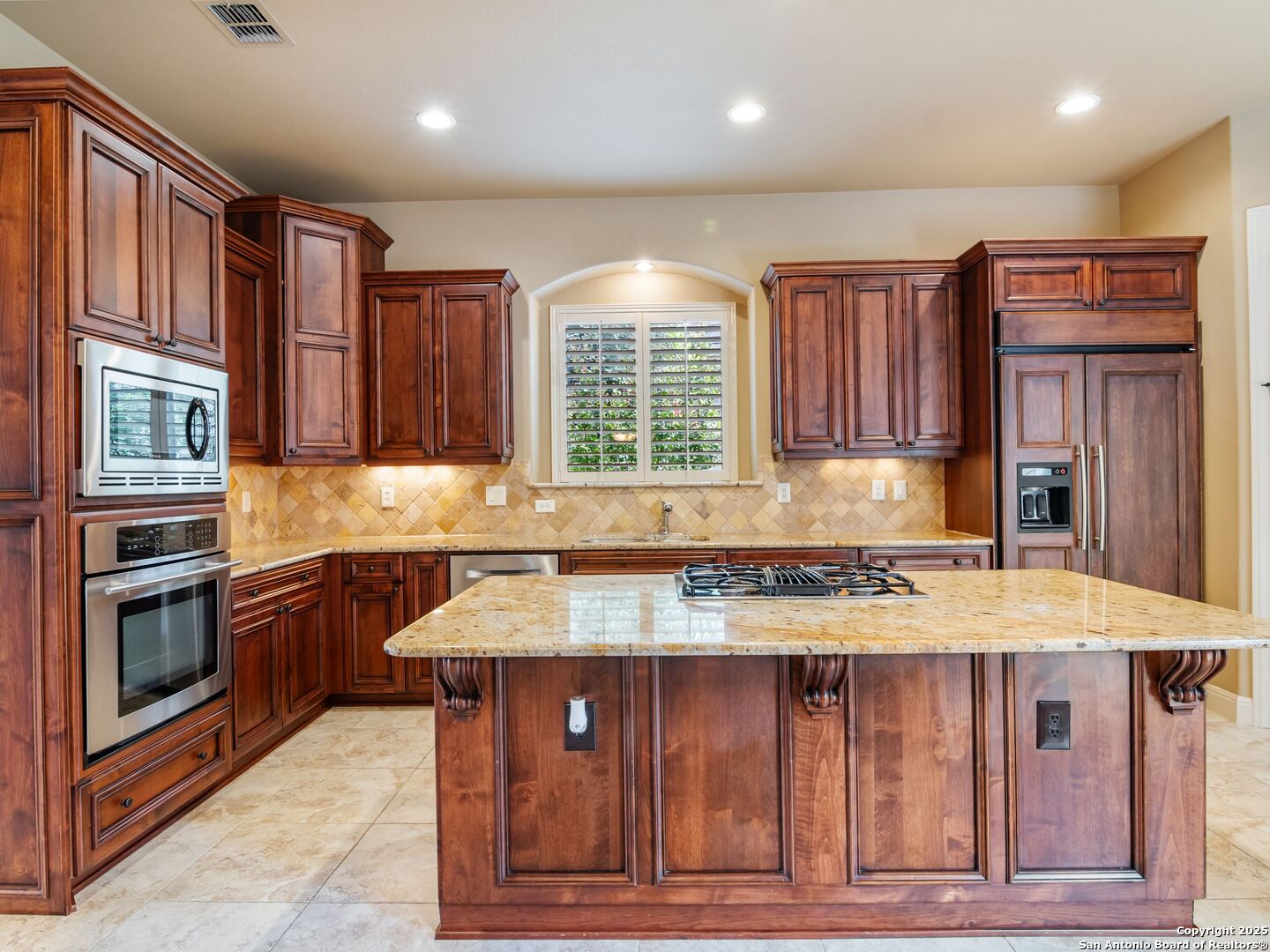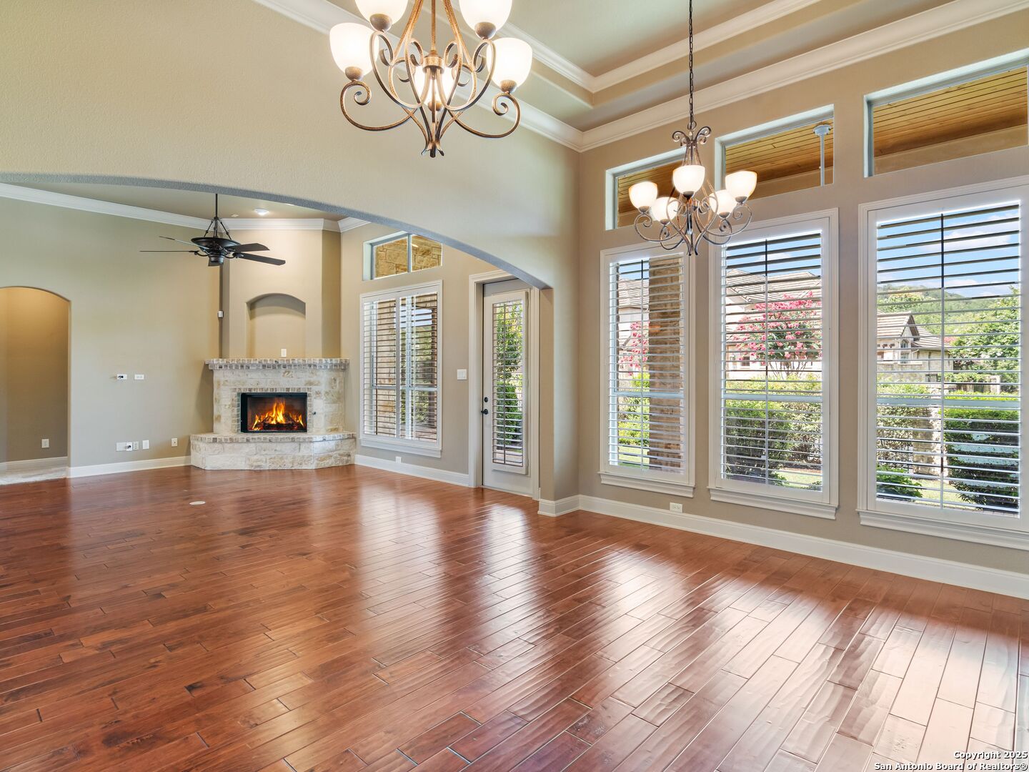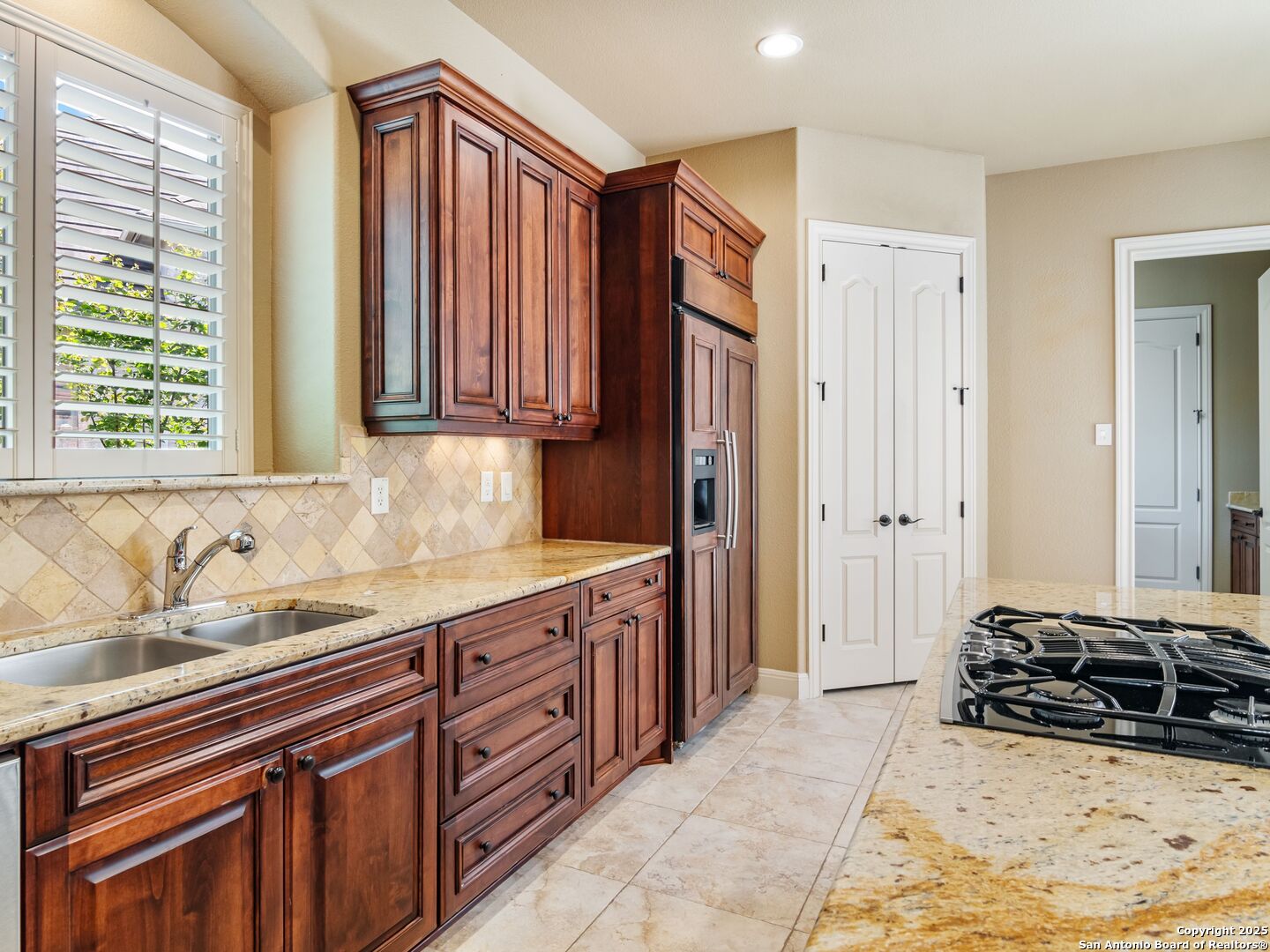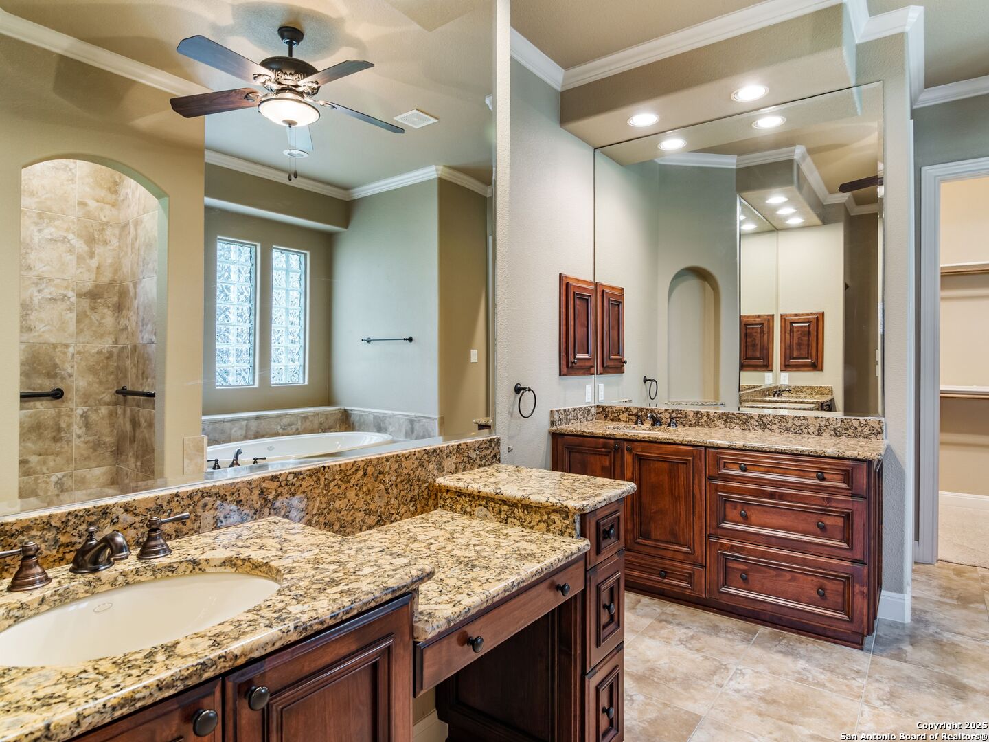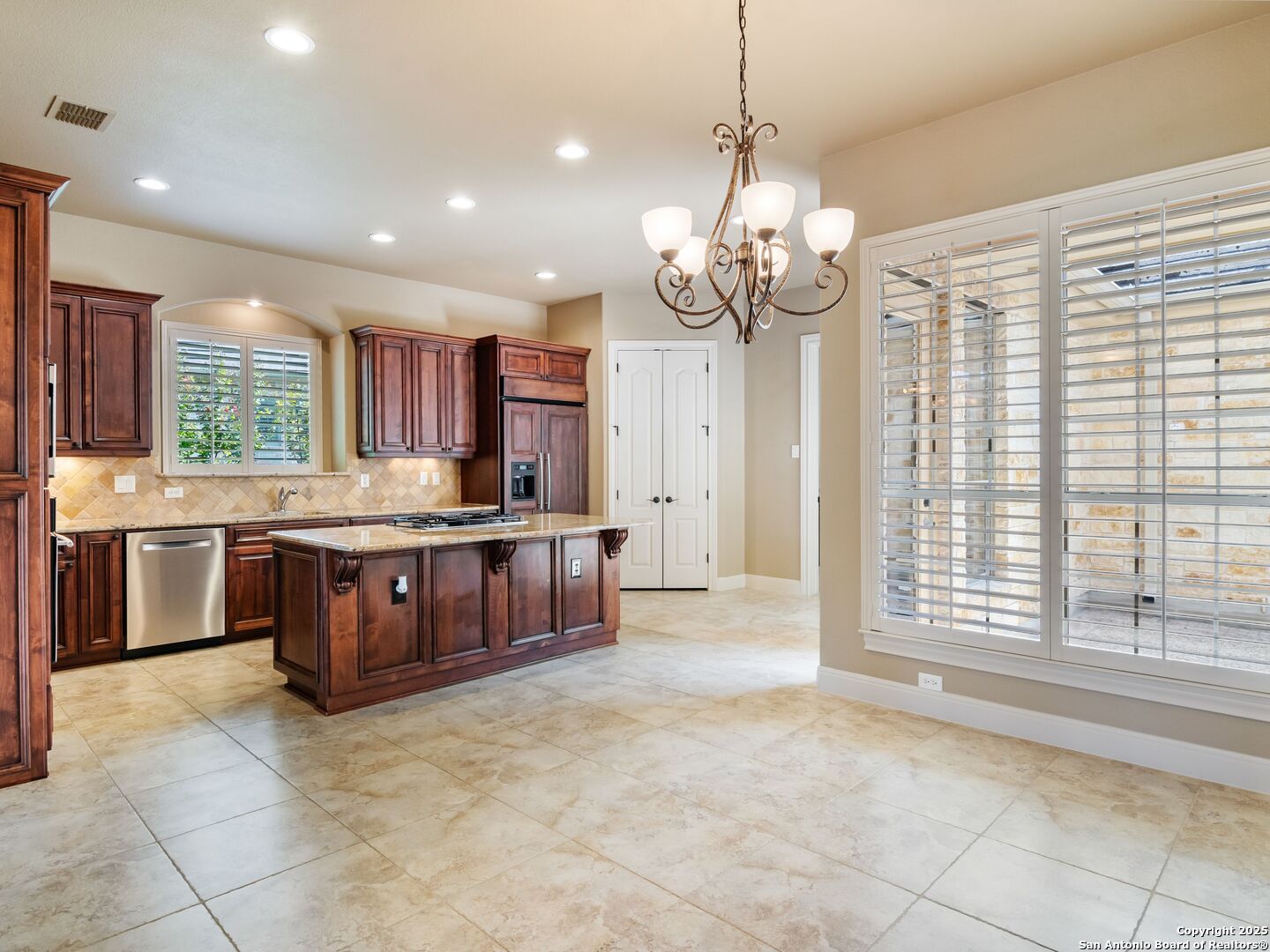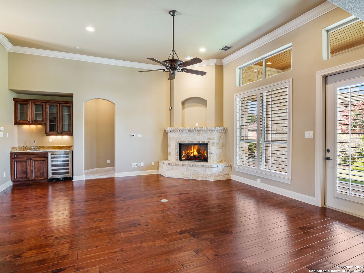 Located in one of San Antonio's most exclusive golf course neighborhoods, The Dominion, this one story garden home is situated on an oversized .26 acre lot with lush landscaping. An expansive courtyard entrance invites you to this 3-bedroom, 2.5-bath residence. Inside, the quality and grand architectural details are evident, featuring soaring 10- to 12-foot ceilings, 8-foot doors, and rich natural light pouring through ample wood-shuttered windows. The layout is open and airy, with warm wood flooring and tile in the main living areas. A thoughtfully designed kitchen offers gas cooking, a built-in refrigerator, and generous cabinetry and counter space. Just off the kitchen, the spacious laundry room includes additional storage and room for a second refrigerator. The living room is perfectly situated and offers stone fireplace, wet bar, and creates an ideal space for entertaining or relaxing. Stone exterior, tile roof, full fencing, and an extra-wide driveway with convenient guest parking add both curb appeal and everyday ease. The large covered patio provides a peaceful outdoor retreat, perfect for morning coffee or evening dining.The oversized 2.5-car garage includes a golf cart bay. Additional features include water softener, central vacuum system, 2022 water heater, and generous storage throughout. Located in close proximity to mailboxes, neighborhood dog park, and just minutes from The Dominion Country Club and its top of the line amenities, fine dining, luxury shopping, Medical Center, major employers, and 35 minutes to San Antonio International Airport.