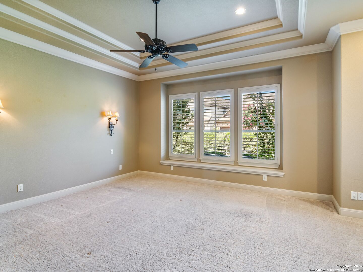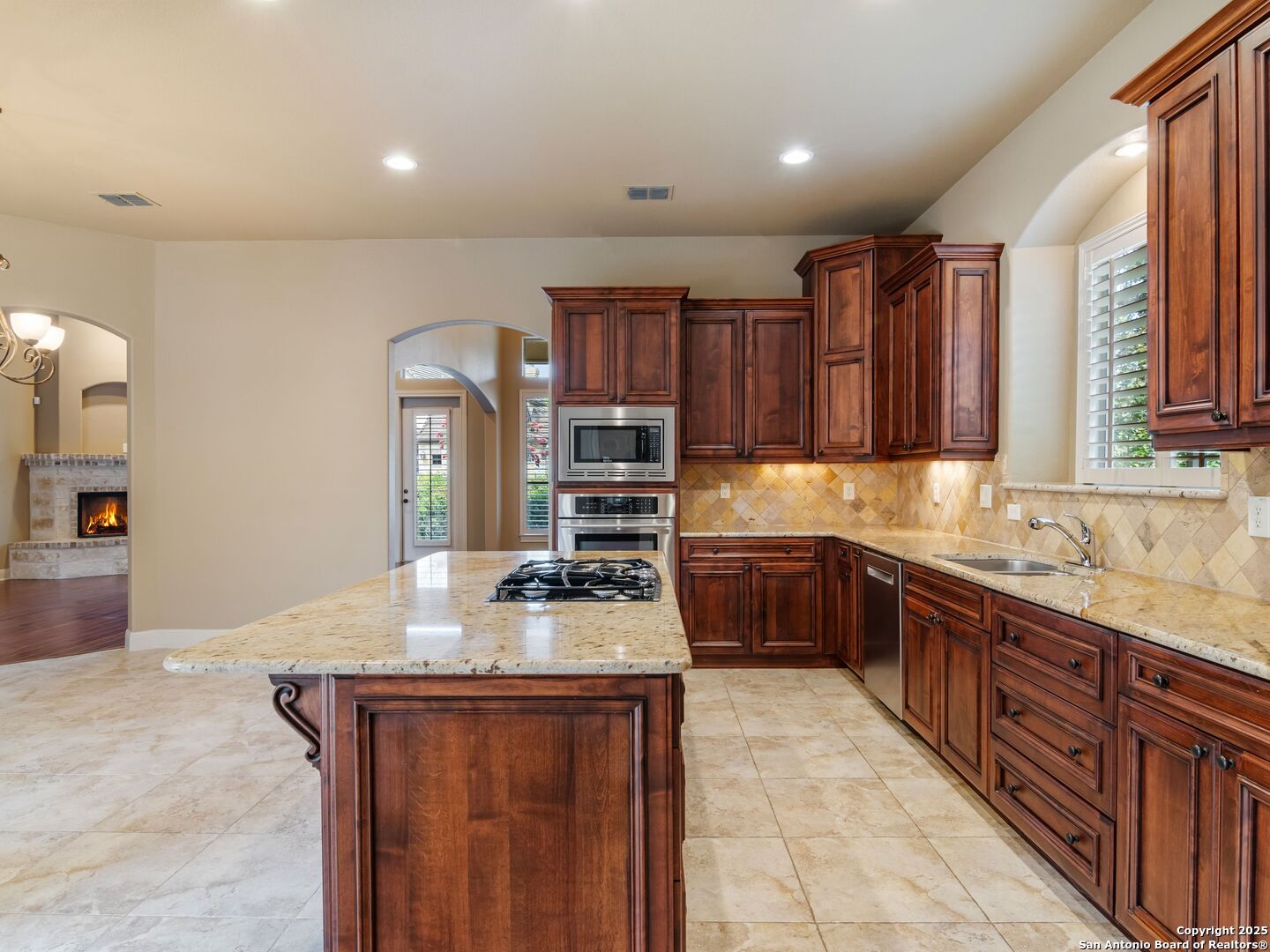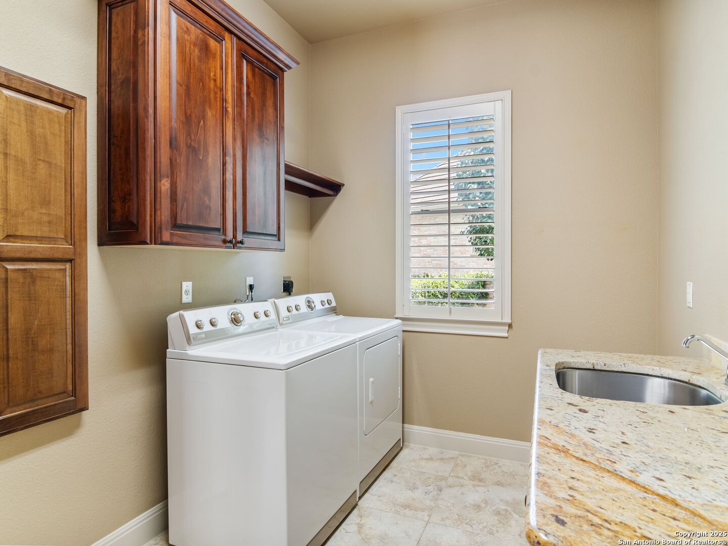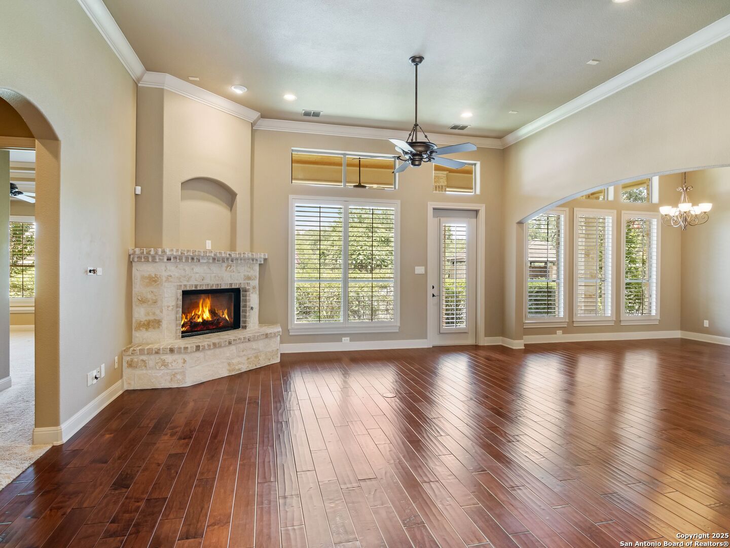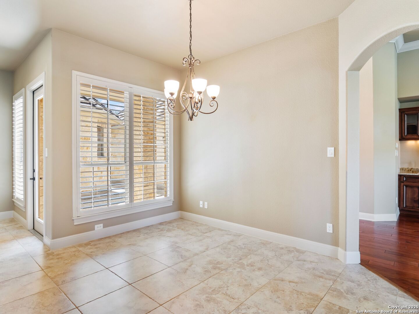 Located in one of San Antonio's most exclusive golf course neighborhoods, The Dominion, this one story garden home is situated on an oversized .26 acre lot with lush landscaping. An expansive courtyard entrance invites you to this 3-bedroom, 2.5-bath residence. Inside, the quality and grand architectural details are evident, featuring soaring 10- to 12-foot ceilings, 8-foot doors, and rich natural light pouring through ample wood-shuttered windows. The layout is open and airy, with warm wood flooring and tile in the main living areas. A thoughtfully designed kitchen offers gas cooking, a built-in refrigerator, and generous cabinetry and counter space. Just off the kitchen, the spacious laundry room includes additional storage and room for a second refrigerator. The living room is perfectly situated and offers stone fireplace, wet bar, and creates an ideal space for entertaining or relaxing. Stone exterior, tile roof, full fencing, and an extra-wide driveway with convenient guest parking add both curb appeal and everyday ease. The large covered patio provides a peaceful outdoor retreat, perfect for morning coffee or evening dining.The oversized 2.5-car garage includes a golf cart bay. Additional features include water softener, central vacuum system, 2022 water heater, and generous storage throughout. Located in close proximity to mailboxes, neighborhood dog park, and just minutes from The Dominion Country Club and its top of the line amenities, fine dining, luxury shopping, Medical Center, major employers, and 35 minutes to San Antonio International Airport.
