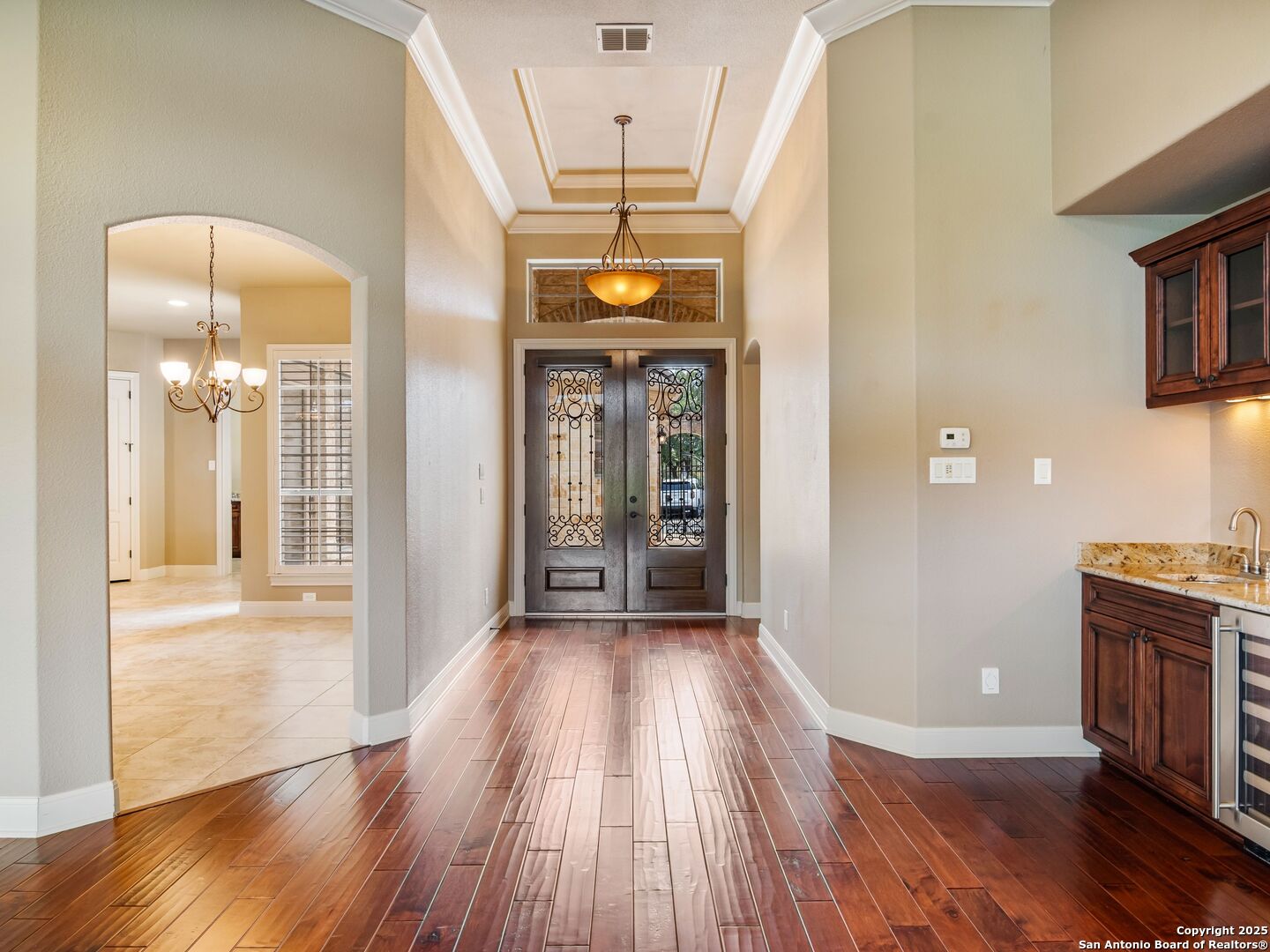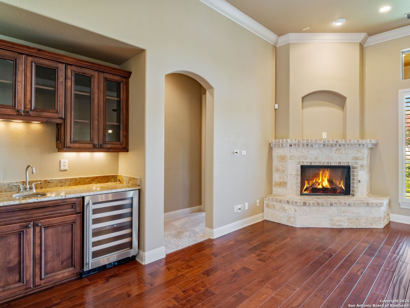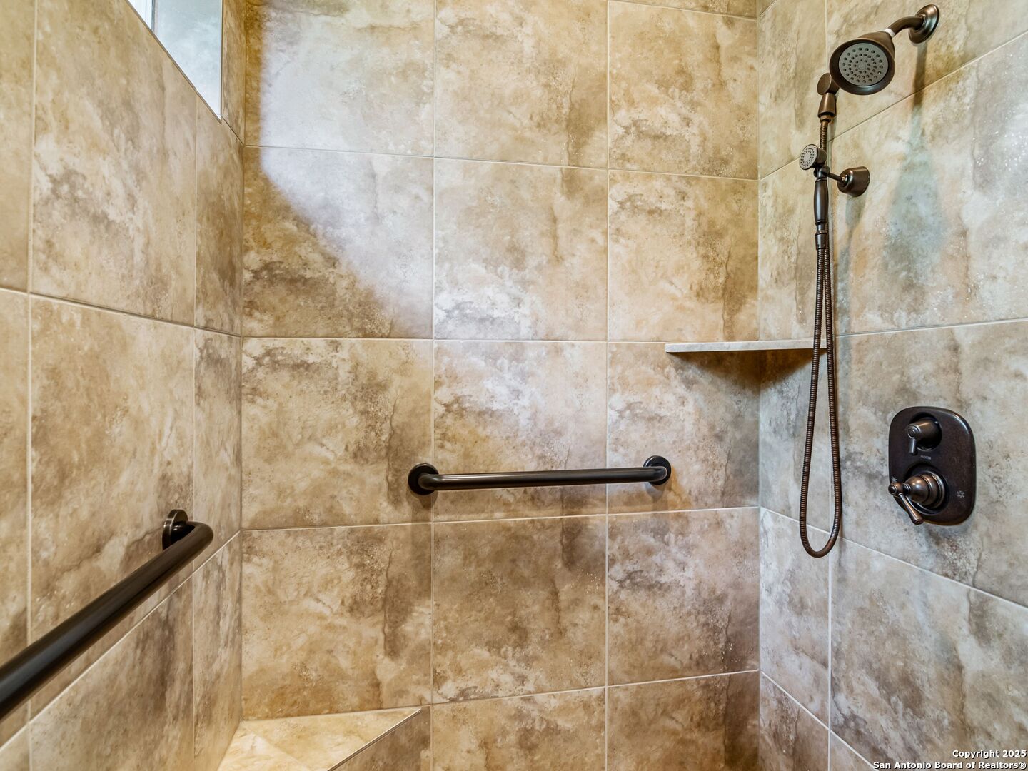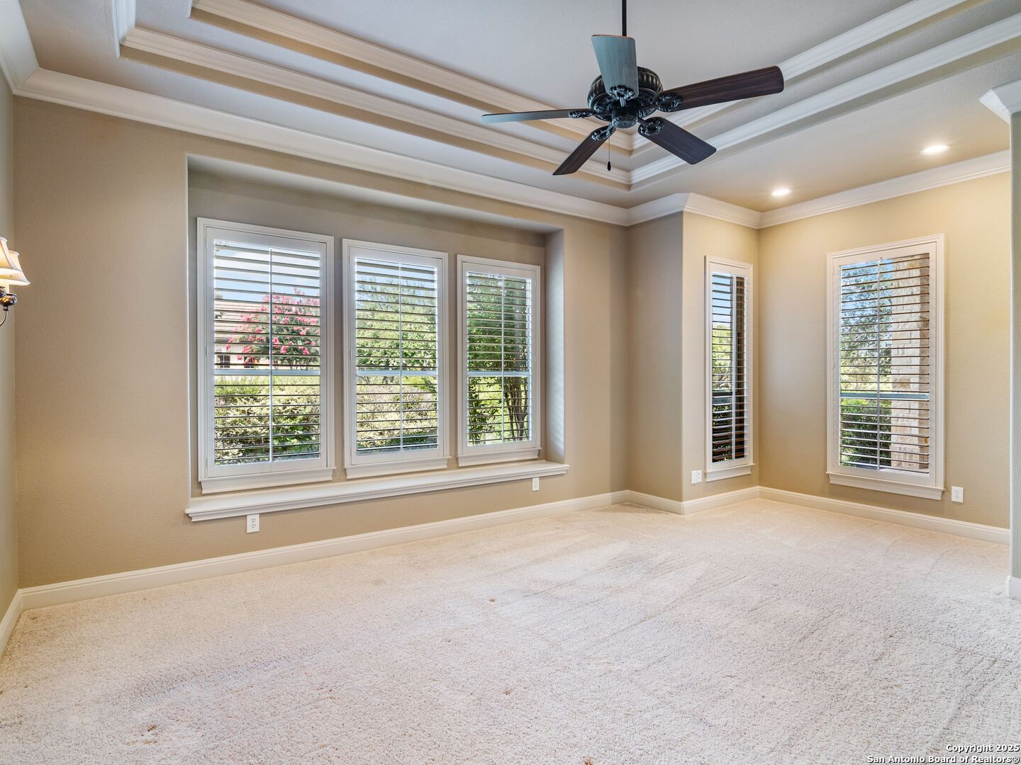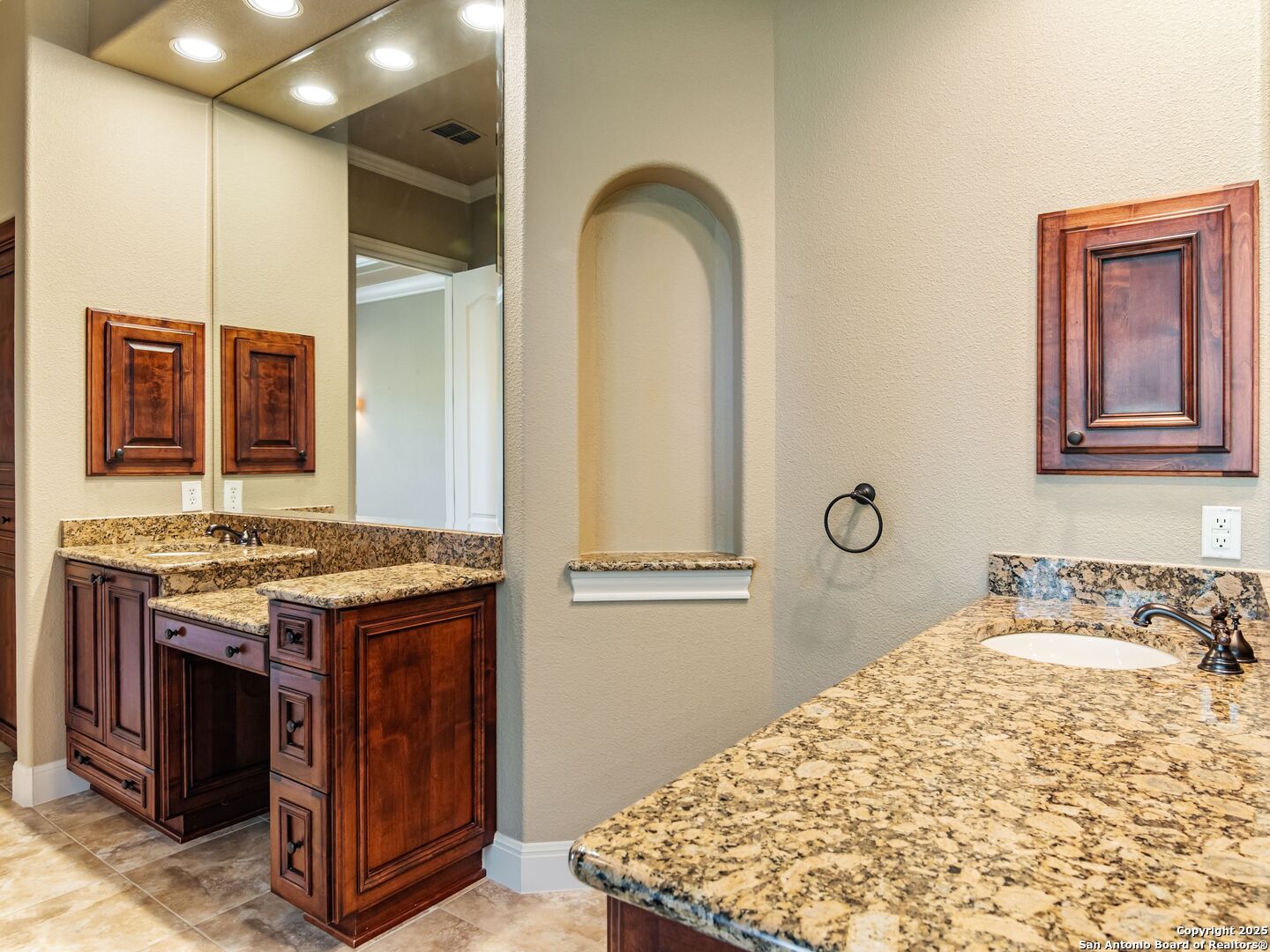 Located in one of San Antonio's most exclusive golf course neighborhoods, The Dominion, this one story garden home is situated on an oversized .26 acre lot with lush landscaping. An expansive courtyard entrance invites you to this 3-bedroom, 2.5-bath residence. Inside, the quality and grand architectural details are evident, featuring soaring 10- to 12-foot ceilings, 8-foot doors, and rich natural light pouring through ample wood-shuttered windows. The layout is open and airy, with warm wood flooring and tile in the main living areas. A thoughtfully designed kitchen offers gas cooking, a built-in refrigerator, and generous cabinetry and counter space. Just off the kitchen, the spacious laundry room includes additional storage and room for a second refrigerator. The living room is perfectly situated and offers stone fireplace, wet bar, and creates an ideal space for entertaining or relaxing. Stone exterior, tile roof, full fencing, and an extra-wide driveway with convenient guest parking add both curb appeal and everyday ease. The large covered patio provides a peaceful outdoor retreat, perfect for morning coffee or evening dining.The oversized 2.5-car garage includes a golf cart bay. Additional features include water softener, central vacuum system, 2022 water heater, and generous storage throughout. Located in close proximity to mailboxes, neighborhood dog park, and just minutes from The Dominion Country Club and its top of the line amenities, fine dining, luxury shopping, Medical Center, major employers, and 35 minutes to San Antonio International Airport.
