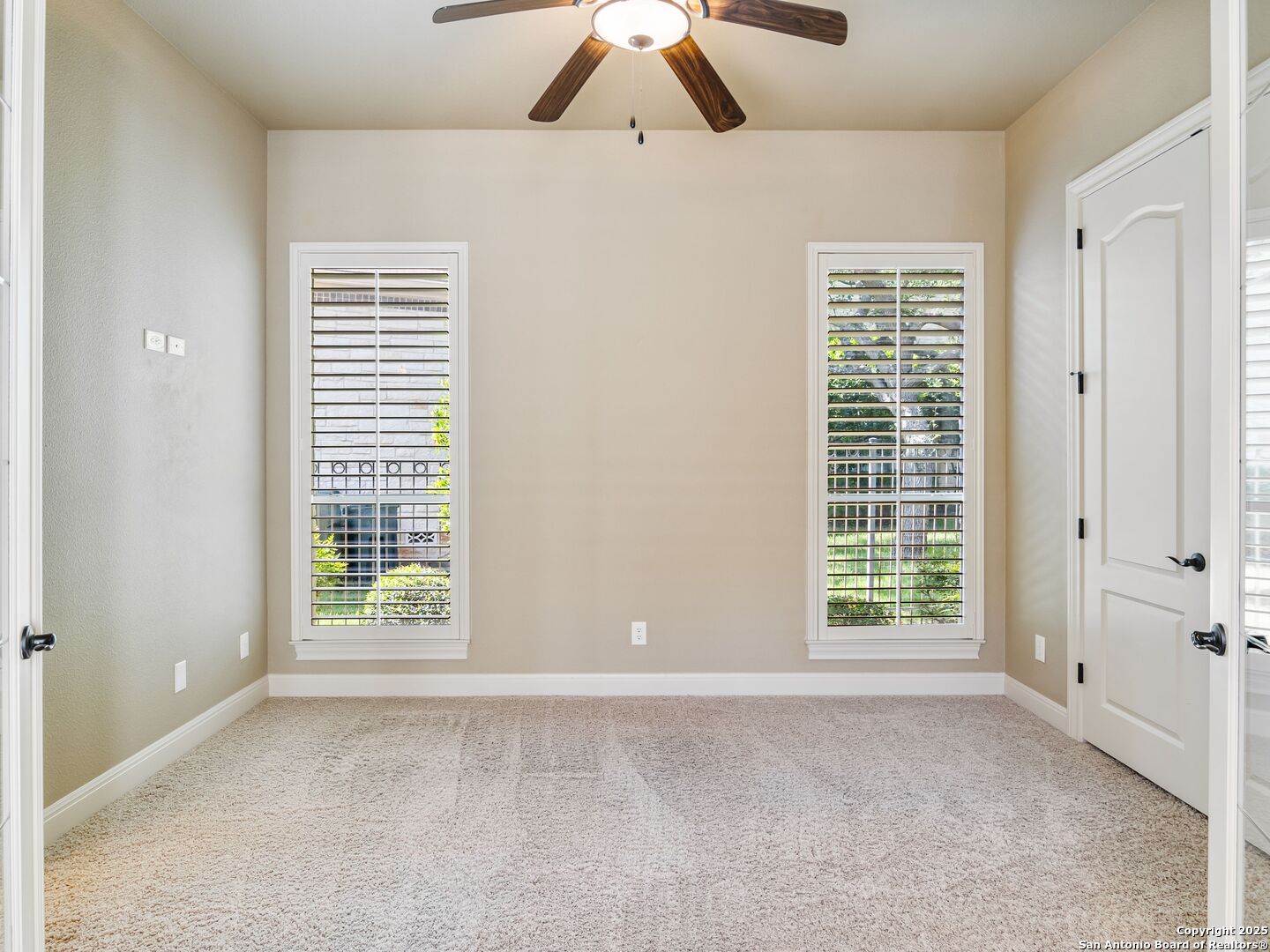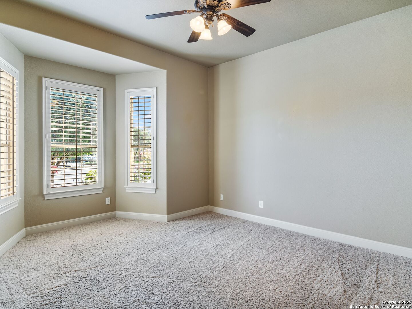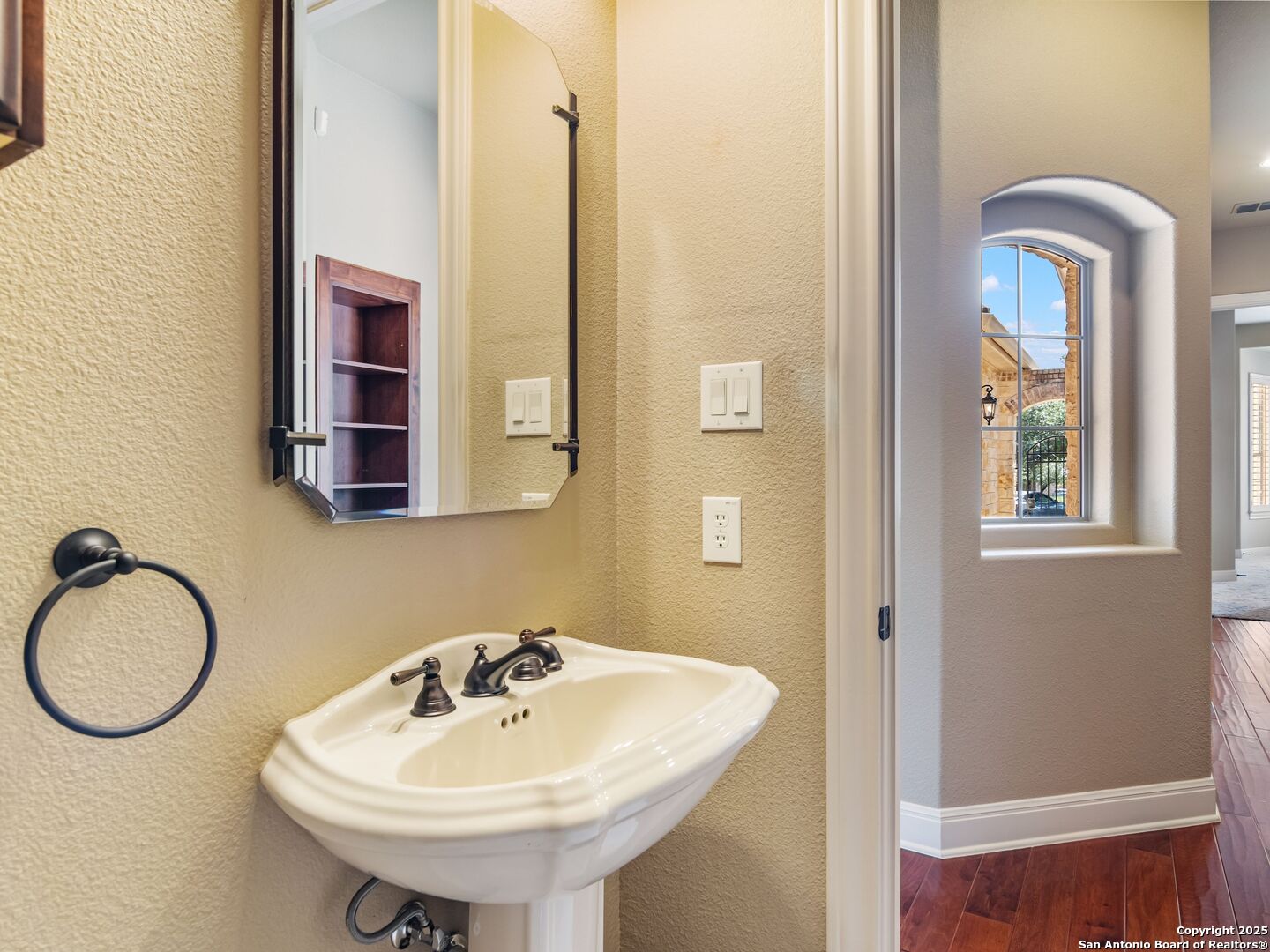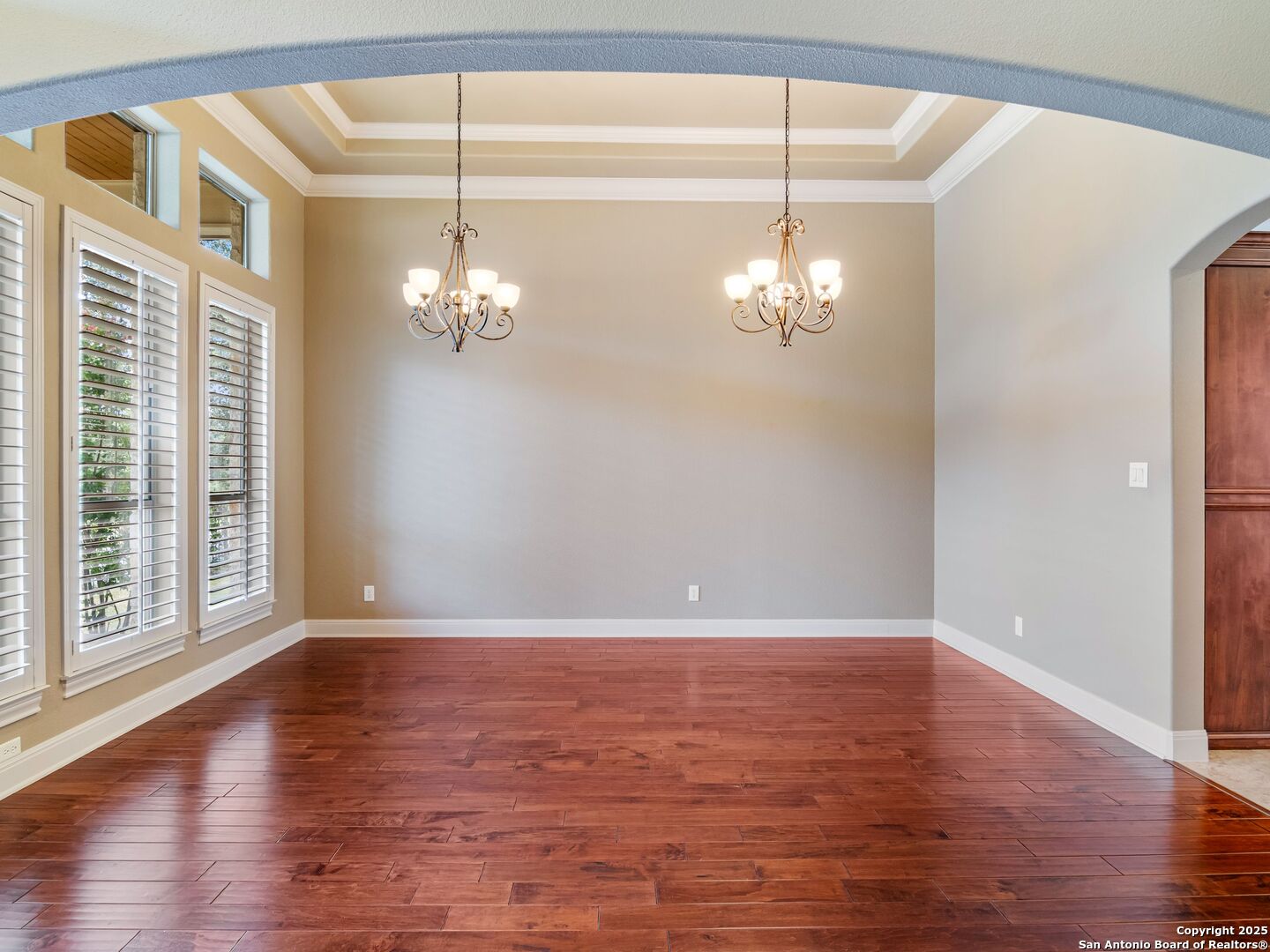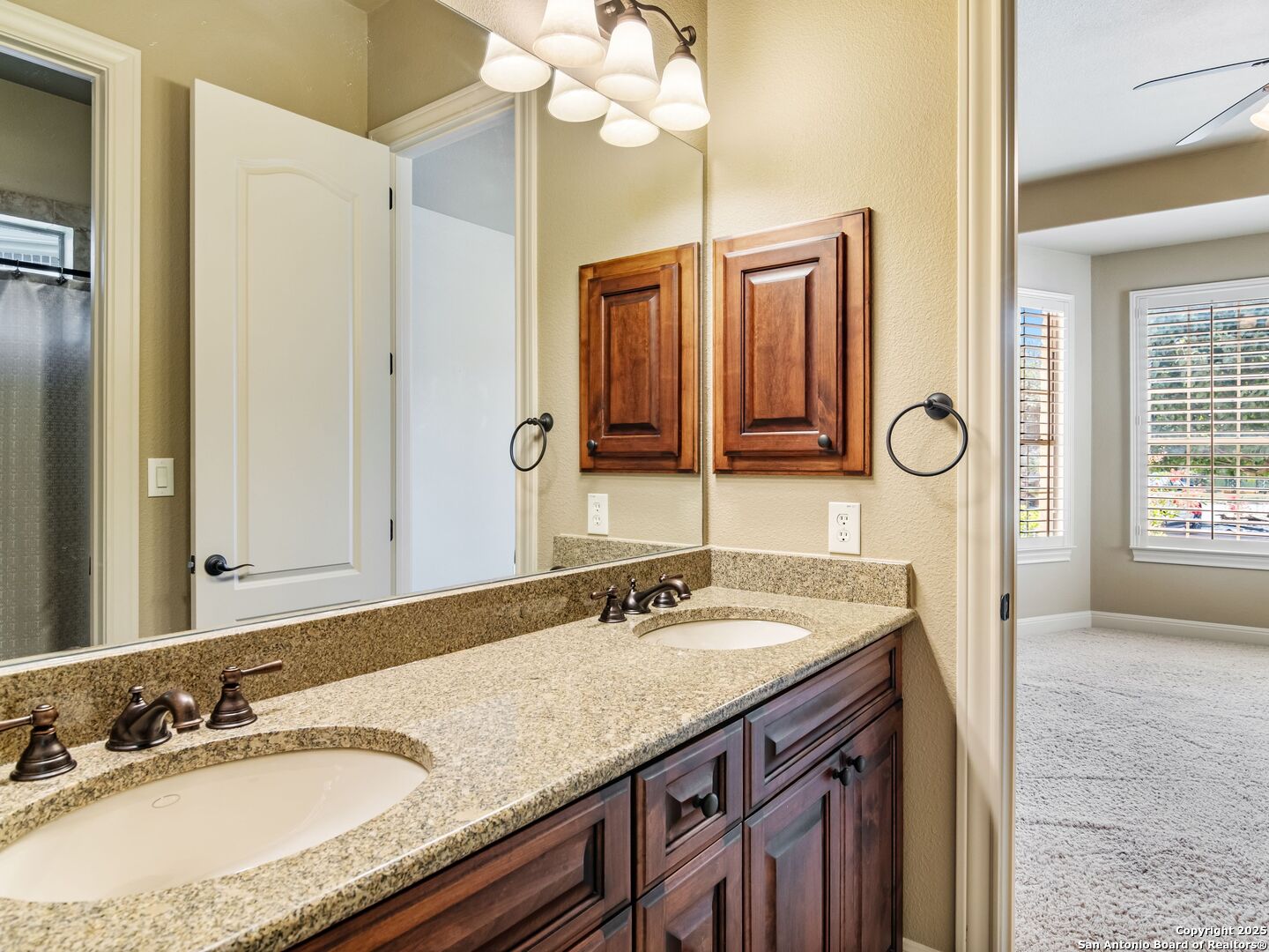 Located in one of San Antonio's most exclusive golf course neighborhoods, The Dominion, this one story garden home is situated on an oversized .26 acre lot with lush landscaping. An expansive courtyard entrance invites you to this 3-bedroom, 2.5-bath residence. Inside, the quality and grand architectural details are evident, featuring soaring 10- to 12-foot ceilings, 8-foot doors, and rich natural light pouring through ample wood-shuttered windows. The layout is open and airy, with warm wood flooring and tile in the main living areas. A thoughtfully designed kitchen offers gas cooking, a built-in refrigerator, and generous cabinetry and counter space. Just off the kitchen, the spacious laundry room includes additional storage and room for a second refrigerator. The living room is perfectly situated and offers stone fireplace, wet bar, and creates an ideal space for entertaining or relaxing. Stone exterior, tile roof, full fencing, and an extra-wide driveway with convenient guest parking add both curb appeal and everyday ease. The large covered patio provides a peaceful outdoor retreat, perfect for morning coffee or evening dining.The oversized 2.5-car garage includes a golf cart bay. Additional features include water softener, central vacuum system, 2022 water heater, and generous storage throughout. Located in close proximity to mailboxes, neighborhood dog park, and just minutes from The Dominion Country Club and its top of the line amenities, fine dining, luxury shopping, Medical Center, major employers, and 35 minutes to San Antonio International Airport.