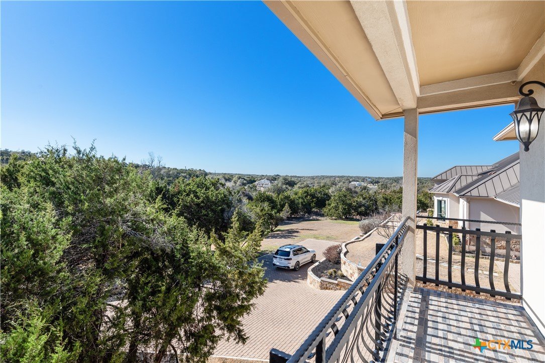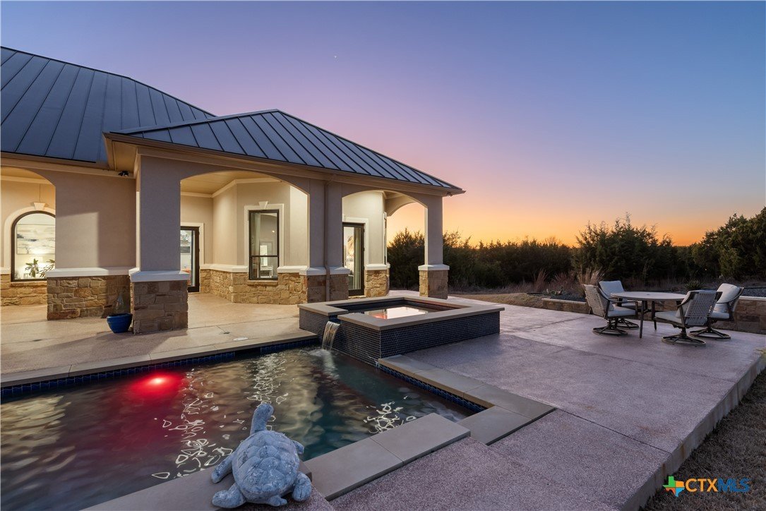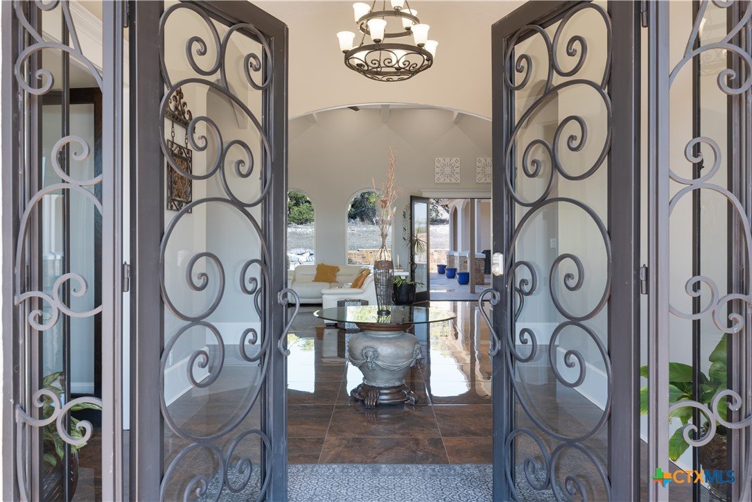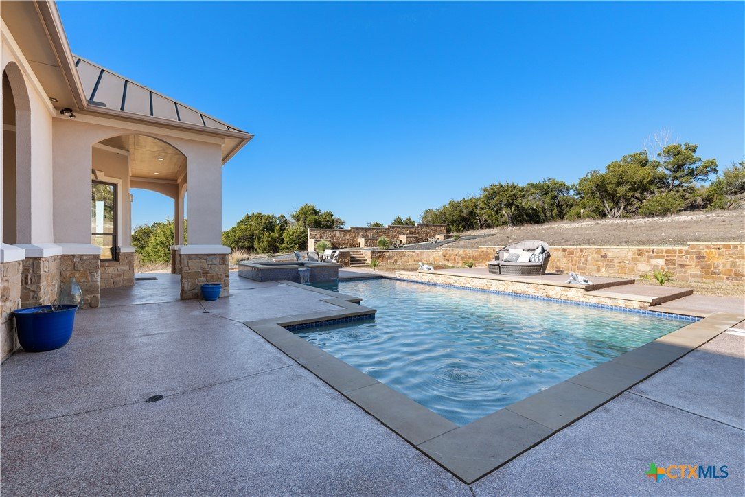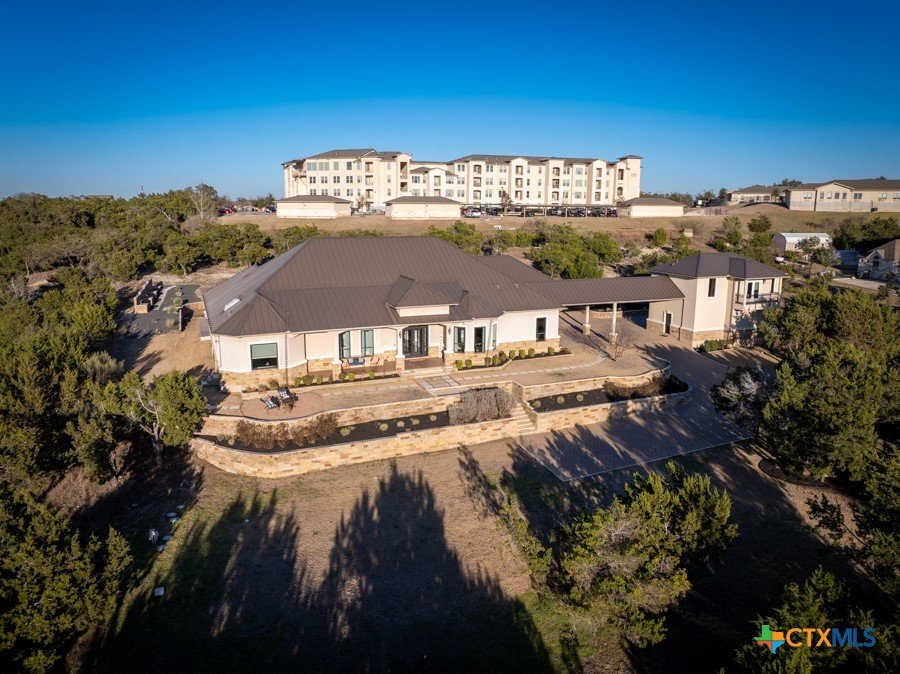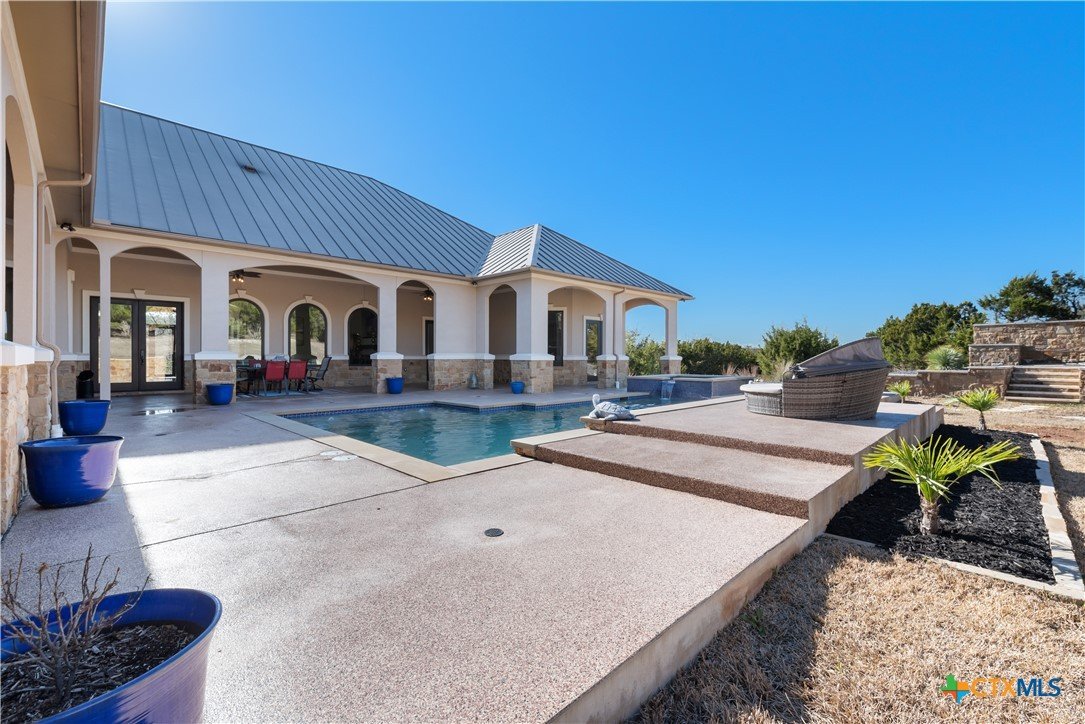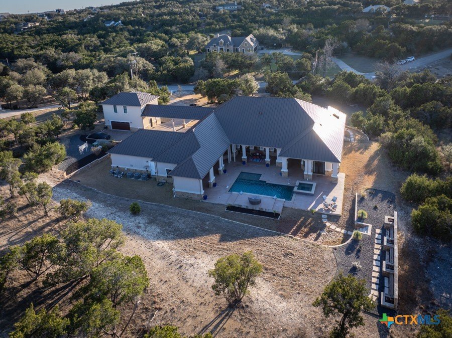 This stunning Hill Country estate offers elegance, privacy, and breathtaking views. The main house features three spacious bedrooms, each with a custom closet and ensuite bath, plus a study used as a fourth bedroom and a dedicated office. The chef’s kitchen boasts a six-burner stove, griddle, pot filler, under-cabinet lighting, and custom storage. The open living space includes an electric fireplace, a bar with a sink, and a Russ sound system with indoor and outdoor speakers. Elegant wood doors, 12-inch baseboards, and expansive glass doors bring in natural light. The oversized primary suite offers dual custom closets, a spa-like bath with an oversized shower, dual rain showerheads, a seating bench, a separate tub, and a jacuzzi just outside. Two primary suites feature walk-in closets and luxurious baths, while a secondary bedroom has a bay window. Porcelain and tile flooring run throughout, complemented by a stylish metal roof. Designed for seamless indoor-outdoor living, six exterior doors lead to multiple outdoor spaces, including a gorgeous pool and spa with customizable lighting. Three bedrooms have direct pool access. A breezeway connects the main house to the guest apartment, which includes a private balcony, tile flooring, a separate laundry room, and a full bath. The property has an attached 2.5-car garage with a ramp into the house, plus an 800 sq. ft. free-standing two-car garage with a one-bedroom apartment. Additional features include an underground propane tank, a 23-zone irrigation system, a camera security system with six cameras, and an owned alarm system. The custom front door from Mexico features glass side panels that open for a refreshing breeze while locking securely. A dedicated laundry room includes a washer and dryer that convey, and an electric water heater ensures efficiency. With abundant on-site parking, four garage spaces, and luxurious details throughout, this estate offers unparalleled comfort and beauty.