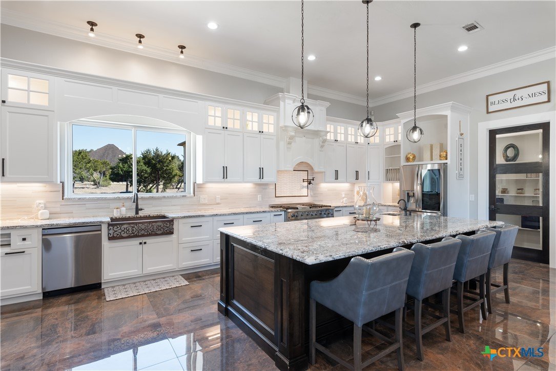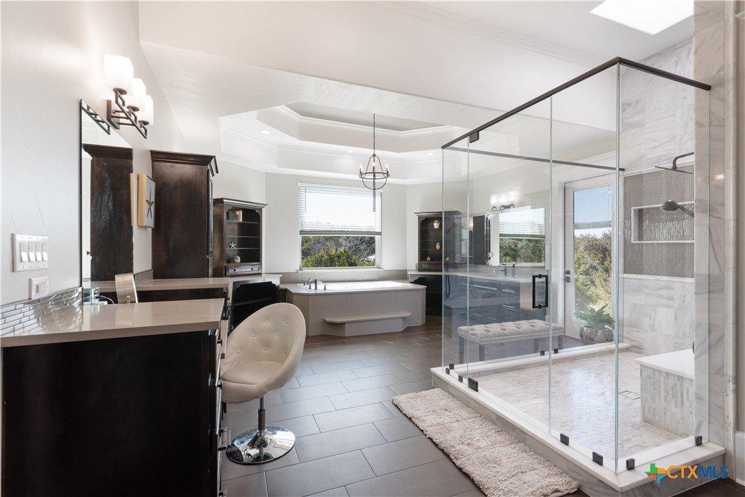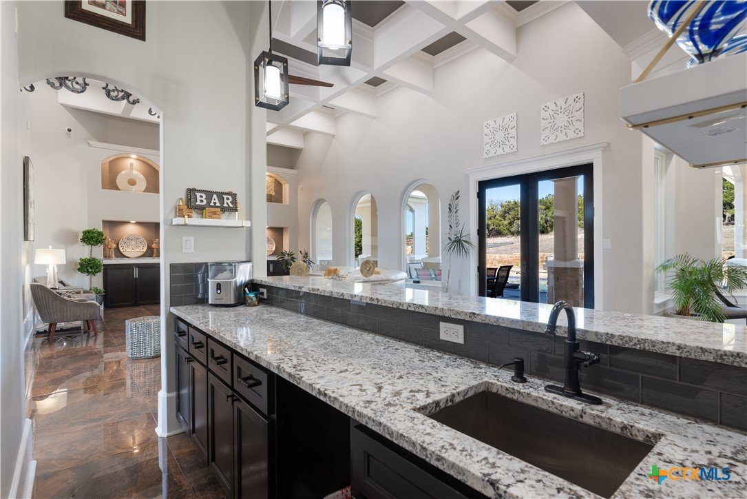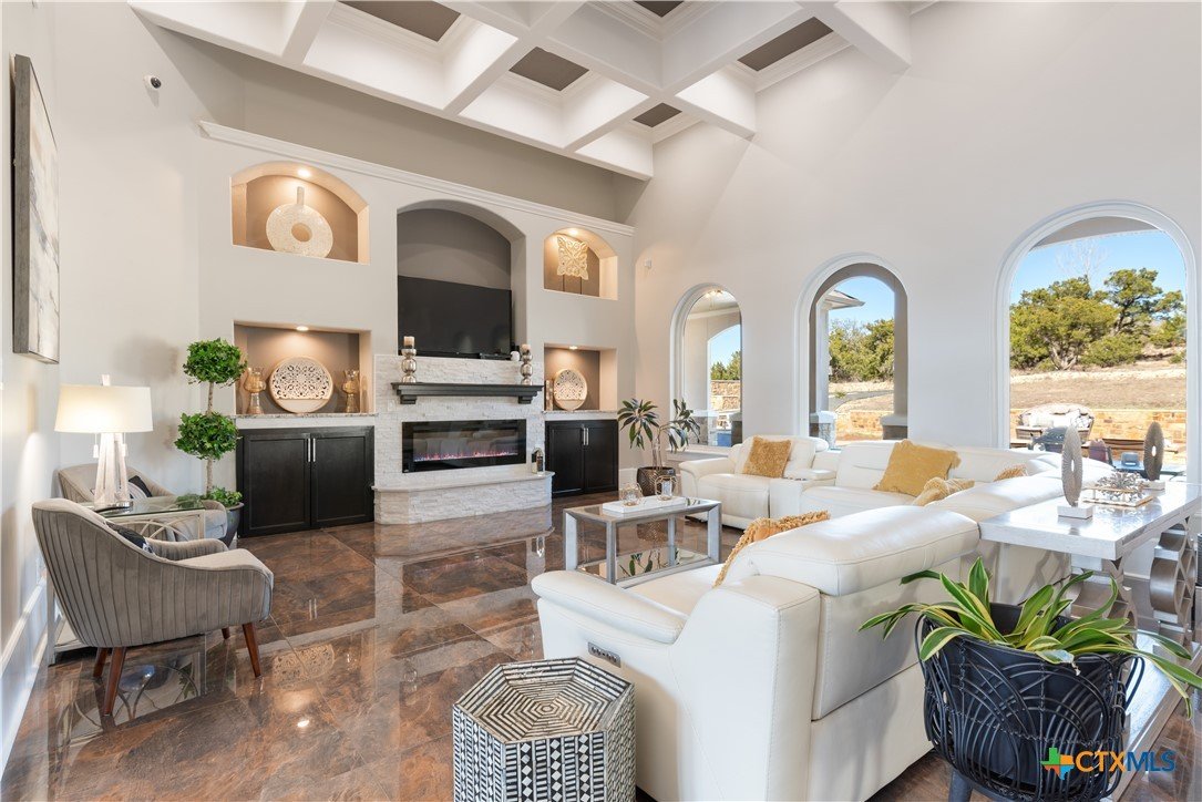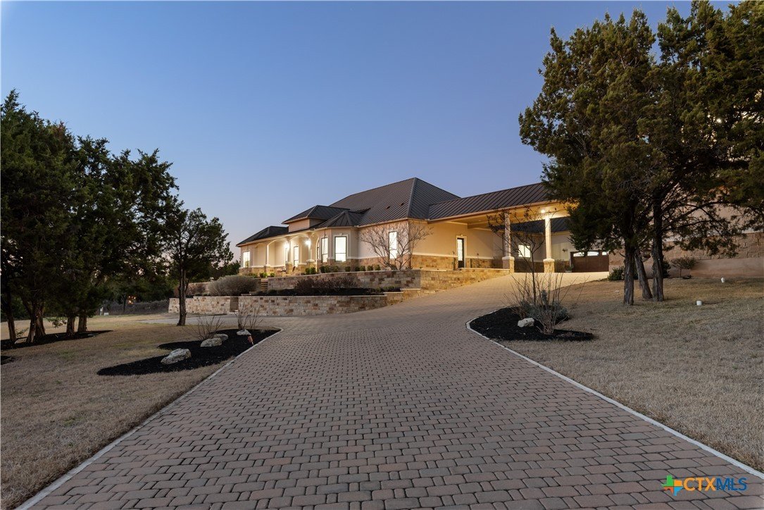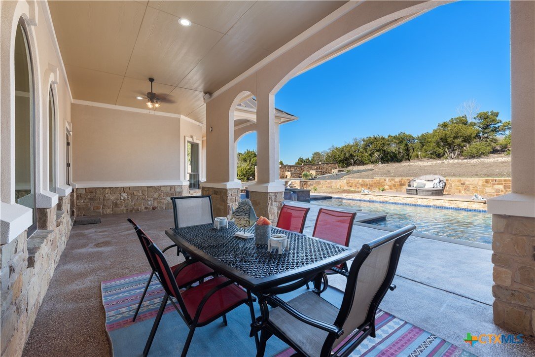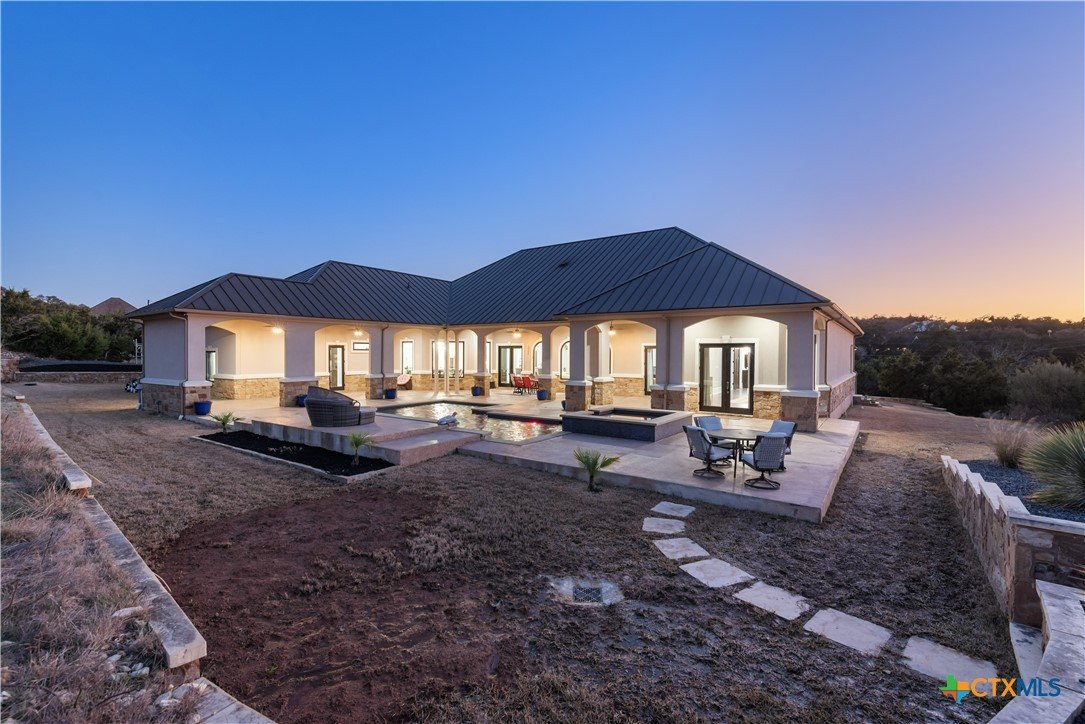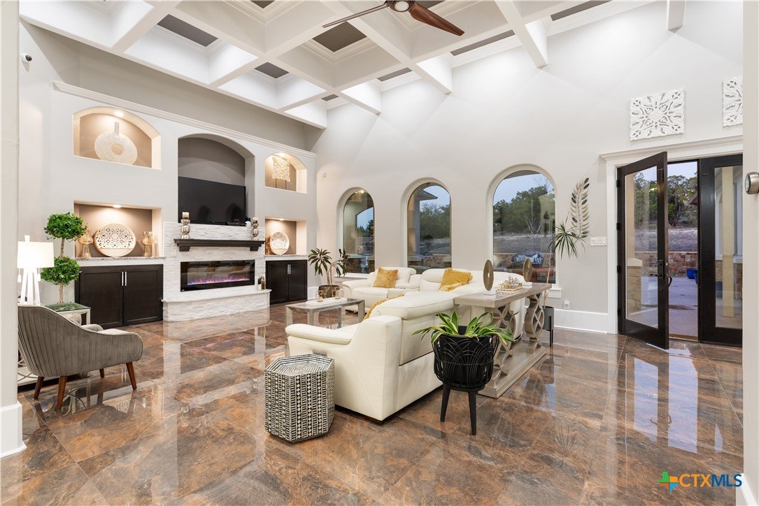 This stunning Hill Country estate offers elegance, privacy, and breathtaking views. The main house features three spacious bedrooms, each with a custom closet and ensuite bath, plus a study used as a fourth bedroom and a dedicated office. The chef’s kitchen boasts a six-burner stove, griddle, pot filler, under-cabinet lighting, and custom storage. The open living space includes an electric fireplace, a bar with a sink, and a Russ sound system with indoor and outdoor speakers. Elegant wood doors, 12-inch baseboards, and expansive glass doors bring in natural light. The oversized primary suite offers dual custom closets, a spa-like bath with an oversized shower, dual rain showerheads, a seating bench, a separate tub, and a jacuzzi just outside. Two primary suites feature walk-in closets and luxurious baths, while a secondary bedroom has a bay window. Porcelain and tile flooring run throughout, complemented by a stylish metal roof. Designed for seamless indoor-outdoor living, six exterior doors lead to multiple outdoor spaces, including a gorgeous pool and spa with customizable lighting. Three bedrooms have direct pool access. A breezeway connects the main house to the guest apartment, which includes a private balcony, tile flooring, a separate laundry room, and a full bath. The property has an attached 2.5-car garage with a ramp into the house, plus an 800 sq. ft. free-standing two-car garage with a one-bedroom apartment. Additional features include an underground propane tank, a 23-zone irrigation system, a camera security system with six cameras, and an owned alarm system. The custom front door from Mexico features glass side panels that open for a refreshing breeze while locking securely. A dedicated laundry room includes a washer and dryer that convey, and an electric water heater ensures efficiency. With abundant on-site parking, four garage spaces, and luxurious details throughout, this estate offers unparalleled comfort and beauty.