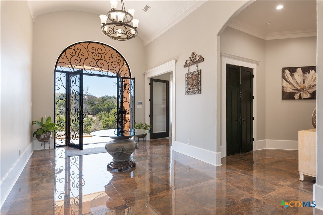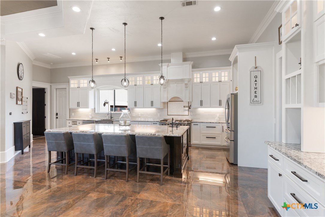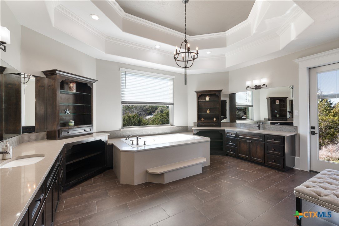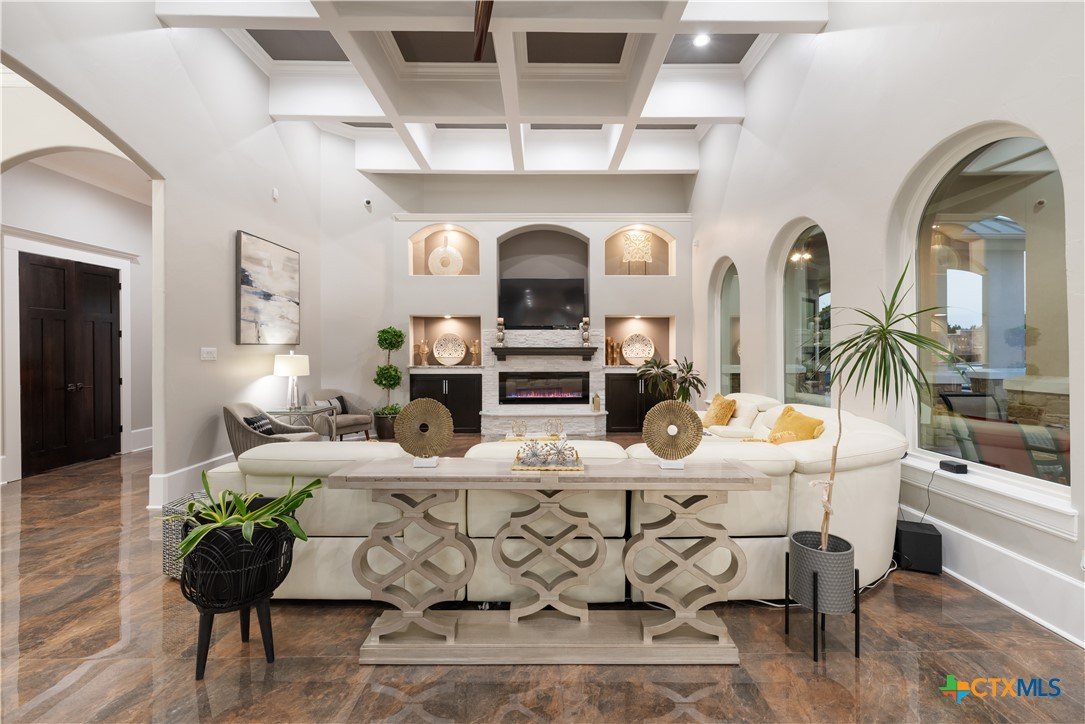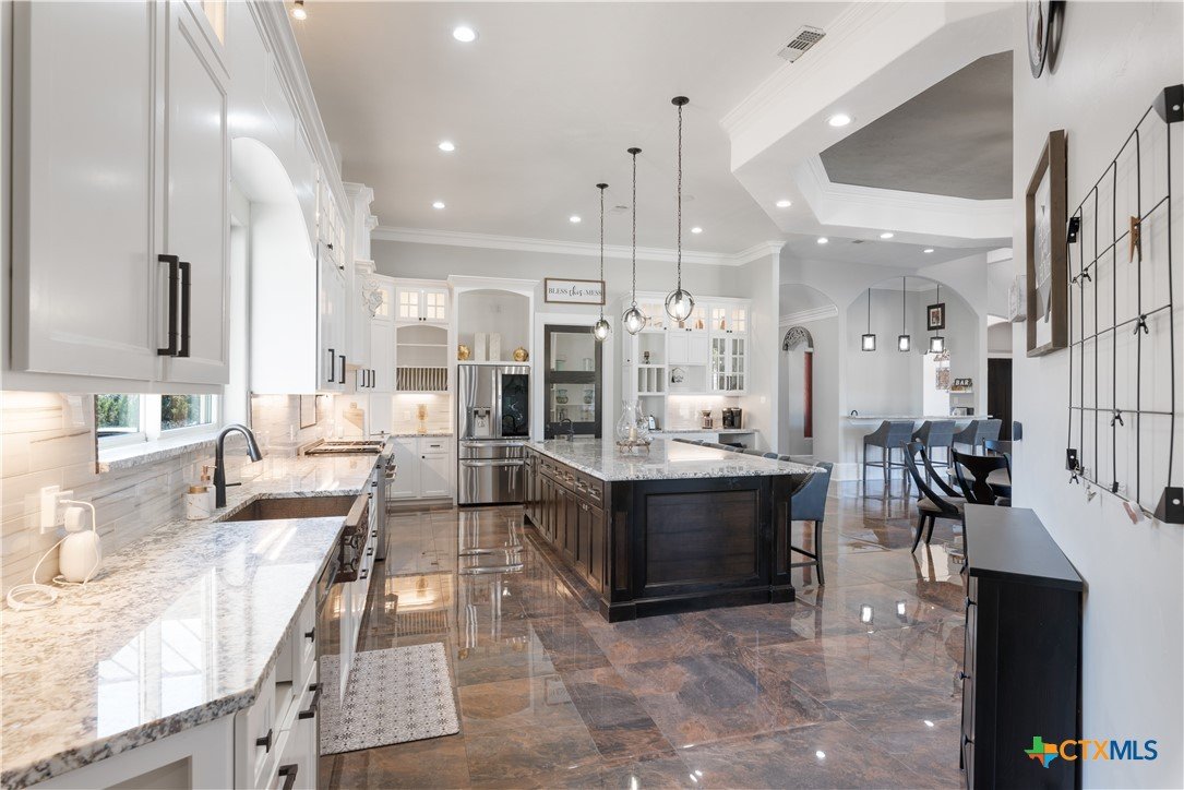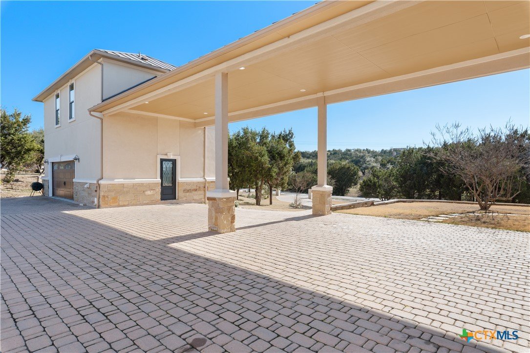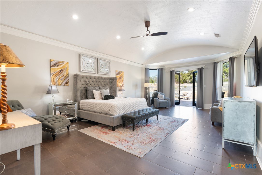 This stunning Hill Country estate offers elegance, privacy, and breathtaking views. The main house features three spacious bedrooms, each with a custom closet and ensuite bath, plus a study used as a fourth bedroom and a dedicated office. The chef’s kitchen boasts a six-burner stove, griddle, pot filler, under-cabinet lighting, and custom storage. The open living space includes an electric fireplace, a bar with a sink, and a Russ sound system with indoor and outdoor speakers. Elegant wood doors, 12-inch baseboards, and expansive glass doors bring in natural light. The oversized primary suite offers dual custom closets, a spa-like bath with an oversized shower, dual rain showerheads, a seating bench, a separate tub, and a jacuzzi just outside. Two primary suites feature walk-in closets and luxurious baths, while a secondary bedroom has a bay window. Porcelain and tile flooring run throughout, complemented by a stylish metal roof. Designed for seamless indoor-outdoor living, six exterior doors lead to multiple outdoor spaces, including a gorgeous pool and spa with customizable lighting. Three bedrooms have direct pool access. A breezeway connects the main house to the guest apartment, which includes a private balcony, tile flooring, a separate laundry room, and a full bath. The property has an attached 2.5-car garage with a ramp into the house, plus an 800 sq. ft. free-standing two-car garage with a one-bedroom apartment. Additional features include an underground propane tank, a 23-zone irrigation system, a camera security system with six cameras, and an owned alarm system. The custom front door from Mexico features glass side panels that open for a refreshing breeze while locking securely. A dedicated laundry room includes a washer and dryer that convey, and an electric water heater ensures efficiency. With abundant on-site parking, four garage spaces, and luxurious details throughout, this estate offers unparalleled comfort and beauty.