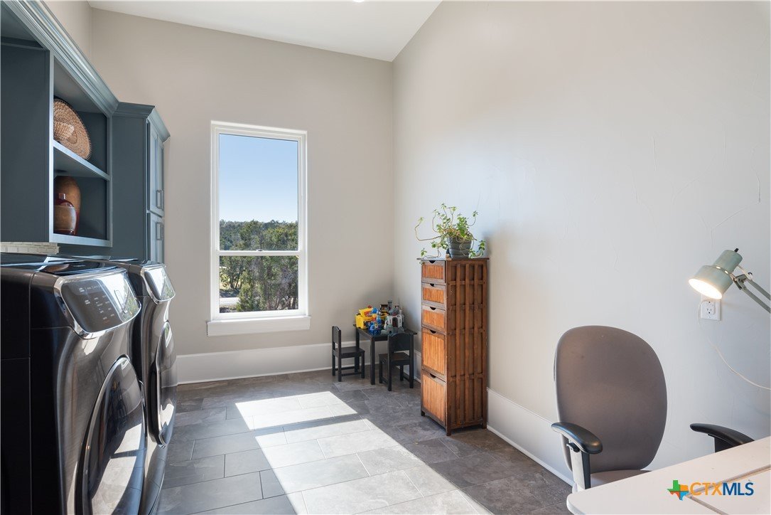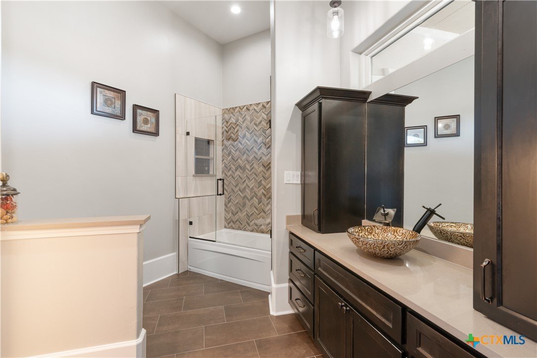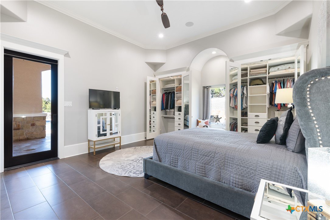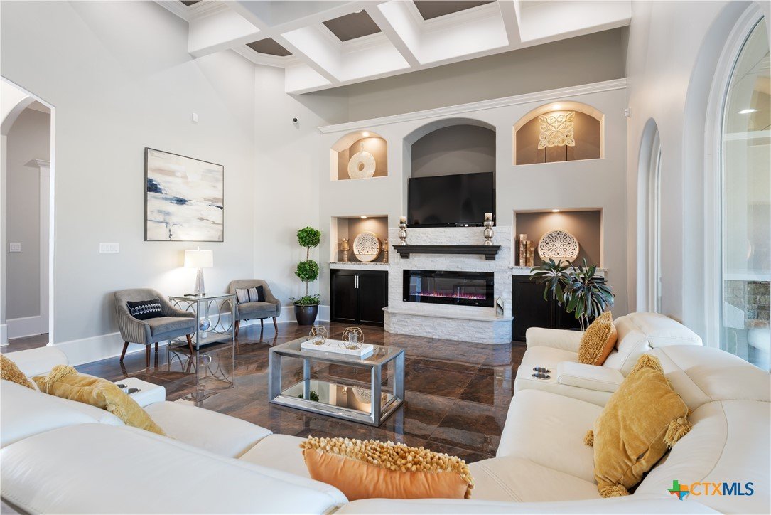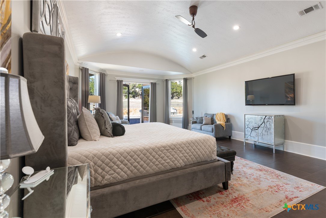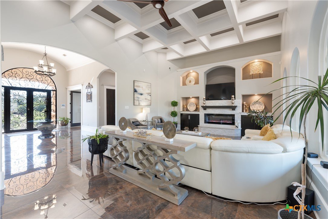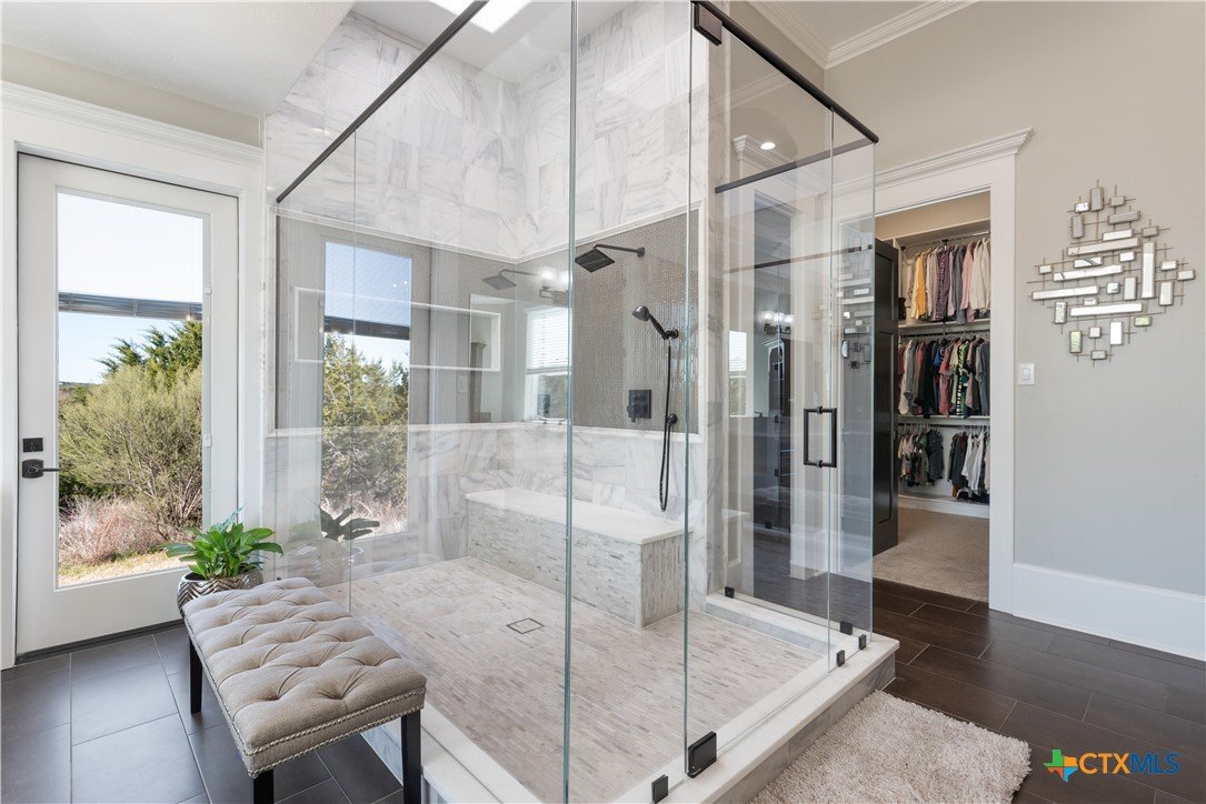 This stunning Hill Country estate offers elegance, privacy, and breathtaking views. The main house features three spacious bedrooms, each with a custom closet and ensuite bath, plus a study used as a fourth bedroom and a dedicated office. The chef’s kitchen boasts a six-burner stove, griddle, pot filler, under-cabinet lighting, and custom storage. The open living space includes an electric fireplace, a bar with a sink, and a Russ sound system with indoor and outdoor speakers. Elegant wood doors, 12-inch baseboards, and expansive glass doors bring in natural light. The oversized primary suite offers dual custom closets, a spa-like bath with an oversized shower, dual rain showerheads, a seating bench, a separate tub, and a jacuzzi just outside. Two primary suites feature walk-in closets and luxurious baths, while a secondary bedroom has a bay window. Porcelain and tile flooring run throughout, complemented by a stylish metal roof. Designed for seamless indoor-outdoor living, six exterior doors lead to multiple outdoor spaces, including a gorgeous pool and spa with customizable lighting. Three bedrooms have direct pool access. A breezeway connects the main house to the guest apartment, which includes a private balcony, tile flooring, a separate laundry room, and a full bath. The property has an attached 2.5-car garage with a ramp into the house, plus an 800 sq. ft. free-standing two-car garage with a one-bedroom apartment. Additional features include an underground propane tank, a 23-zone irrigation system, a camera security system with six cameras, and an owned alarm system. The custom front door from Mexico features glass side panels that open for a refreshing breeze while locking securely. A dedicated laundry room includes a washer and dryer that convey, and an electric water heater ensures efficiency. With abundant on-site parking, four garage spaces, and luxurious details throughout, this estate offers unparalleled comfort and beauty.
