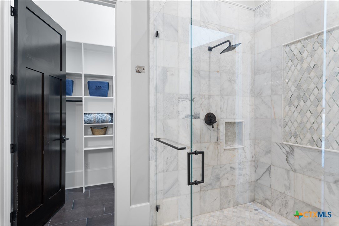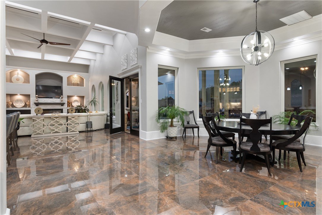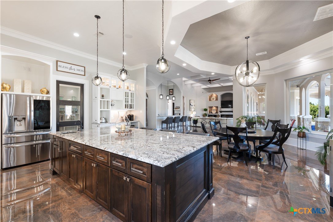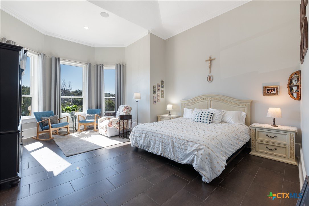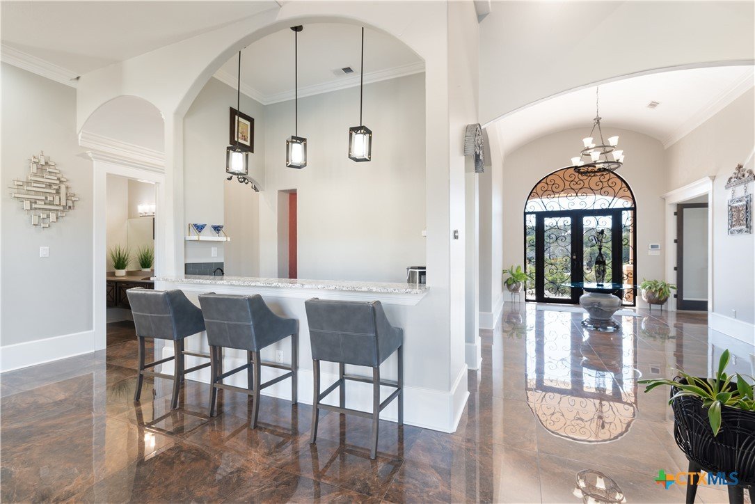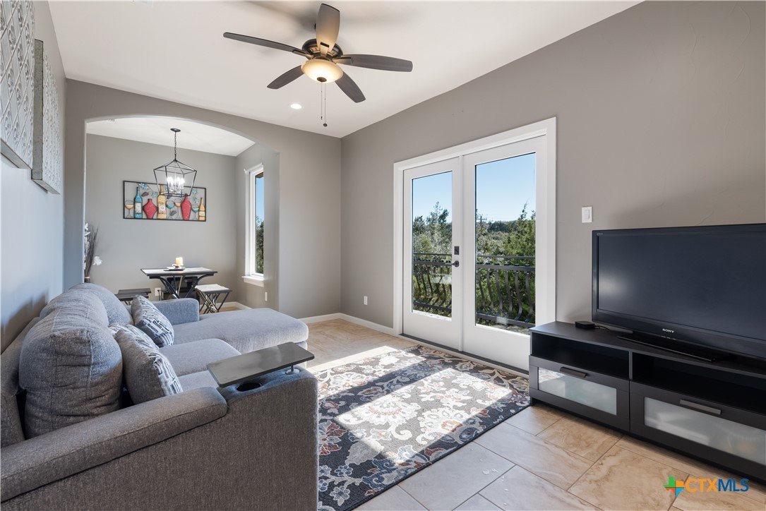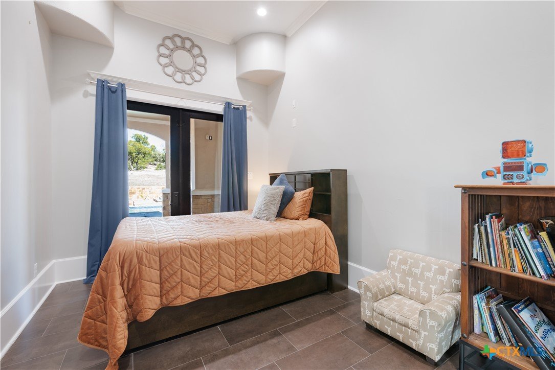 This stunning Hill Country estate offers elegance, privacy, and breathtaking views. The main house features three spacious bedrooms, each with a custom closet and ensuite bath, plus a study used as a fourth bedroom and a dedicated office. The chef’s kitchen boasts a six-burner stove, griddle, pot filler, under-cabinet lighting, and custom storage. The open living space includes an electric fireplace, a bar with a sink, and a Russ sound system with indoor and outdoor speakers. Elegant wood doors, 12-inch baseboards, and expansive glass doors bring in natural light. The oversized primary suite offers dual custom closets, a spa-like bath with an oversized shower, dual rain showerheads, a seating bench, a separate tub, and a jacuzzi just outside. Two primary suites feature walk-in closets and luxurious baths, while a secondary bedroom has a bay window. Porcelain and tile flooring run throughout, complemented by a stylish metal roof. Designed for seamless indoor-outdoor living, six exterior doors lead to multiple outdoor spaces, including a gorgeous pool and spa with customizable lighting. Three bedrooms have direct pool access. A breezeway connects the main house to the guest apartment, which includes a private balcony, tile flooring, a separate laundry room, and a full bath. The property has an attached 2.5-car garage with a ramp into the house, plus an 800 sq. ft. free-standing two-car garage with a one-bedroom apartment. Additional features include an underground propane tank, a 23-zone irrigation system, a camera security system with six cameras, and an owned alarm system. The custom front door from Mexico features glass side panels that open for a refreshing breeze while locking securely. A dedicated laundry room includes a washer and dryer that convey, and an electric water heater ensures efficiency. With abundant on-site parking, four garage spaces, and luxurious details throughout, this estate offers unparalleled comfort and beauty.