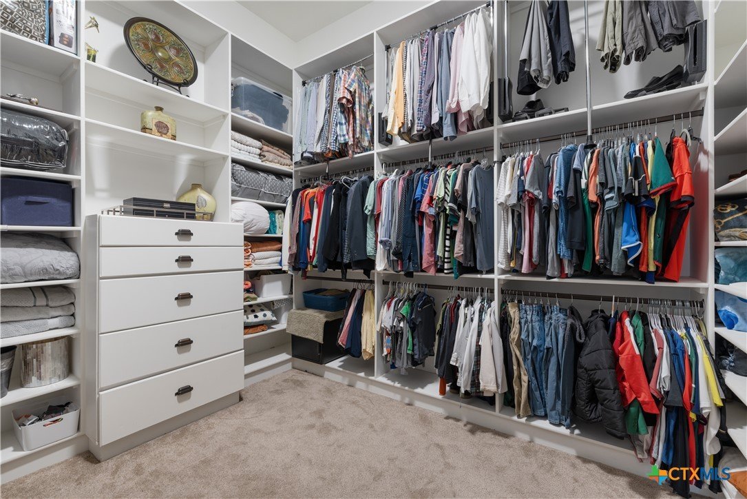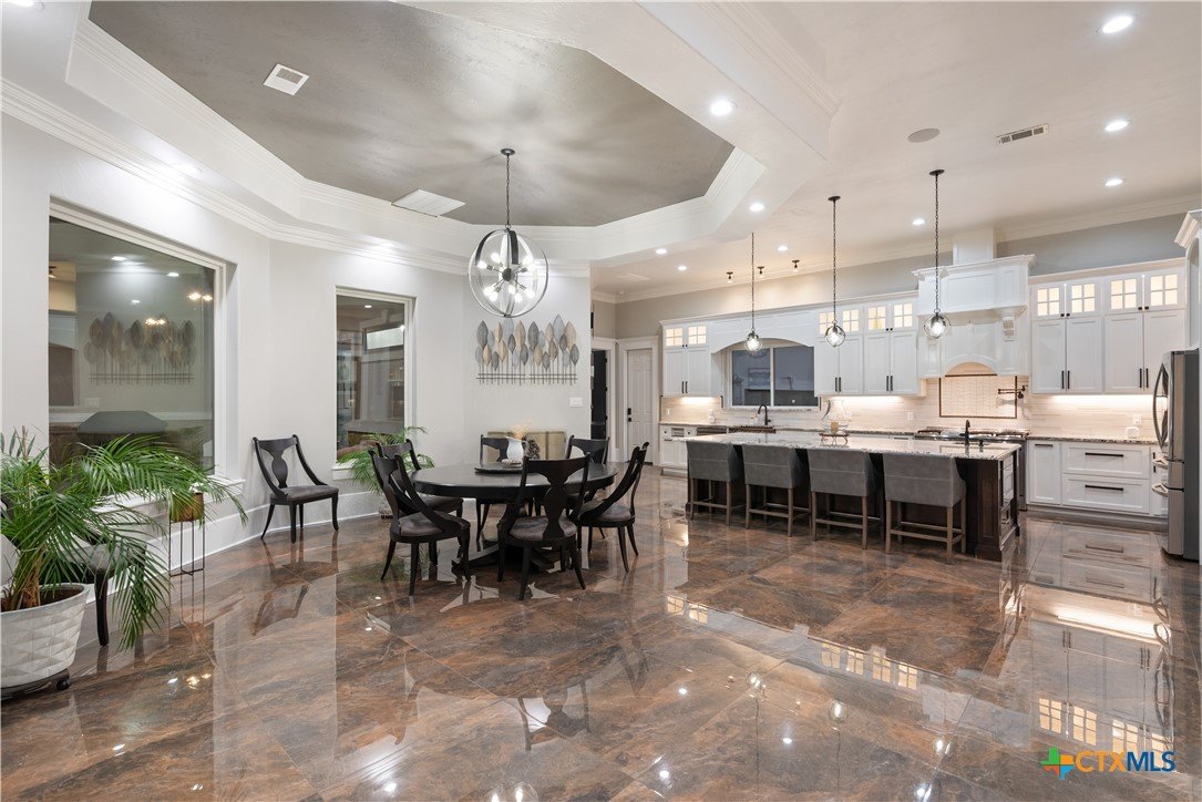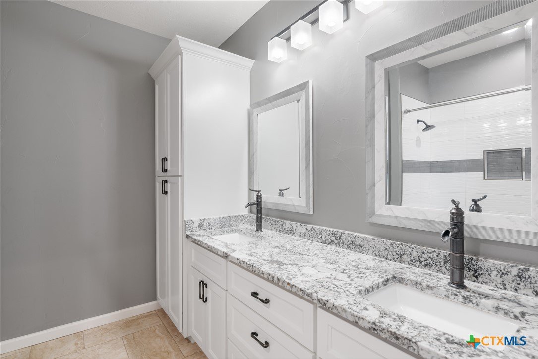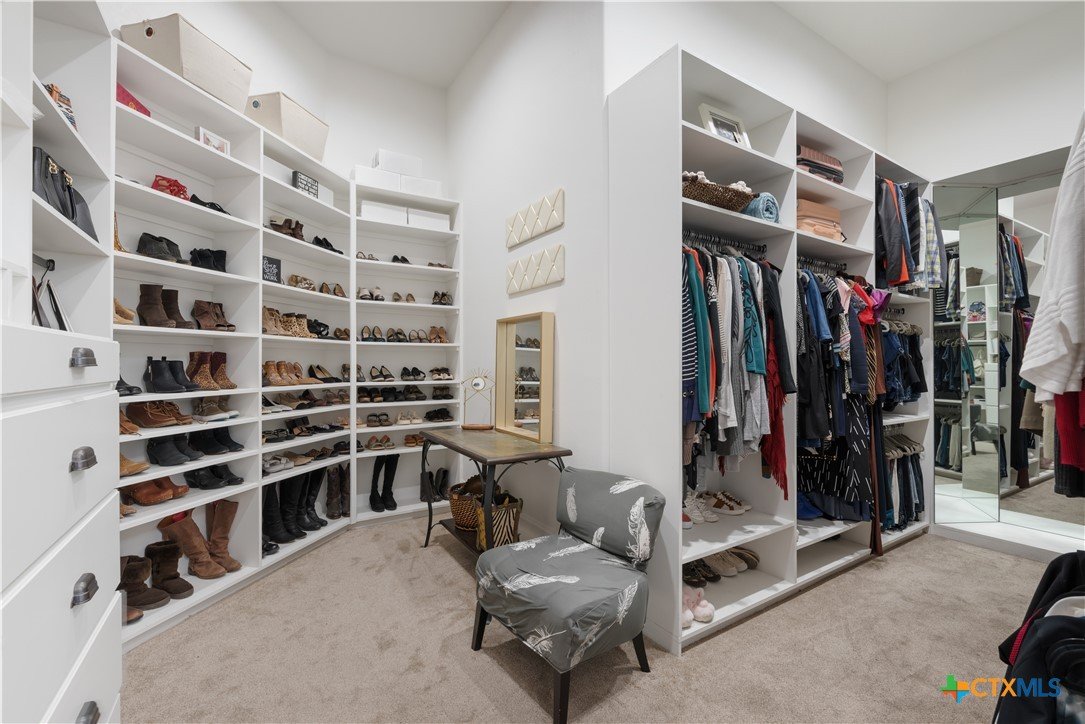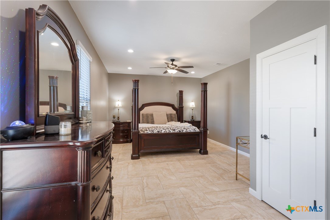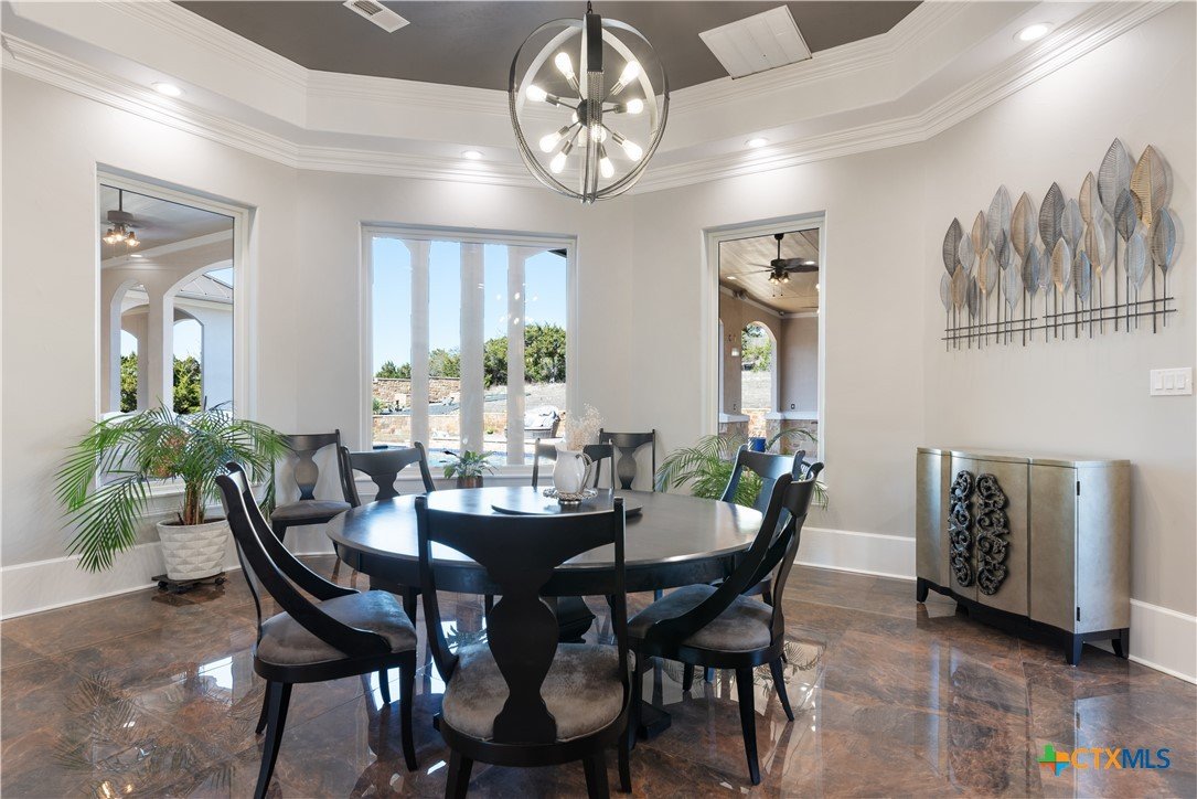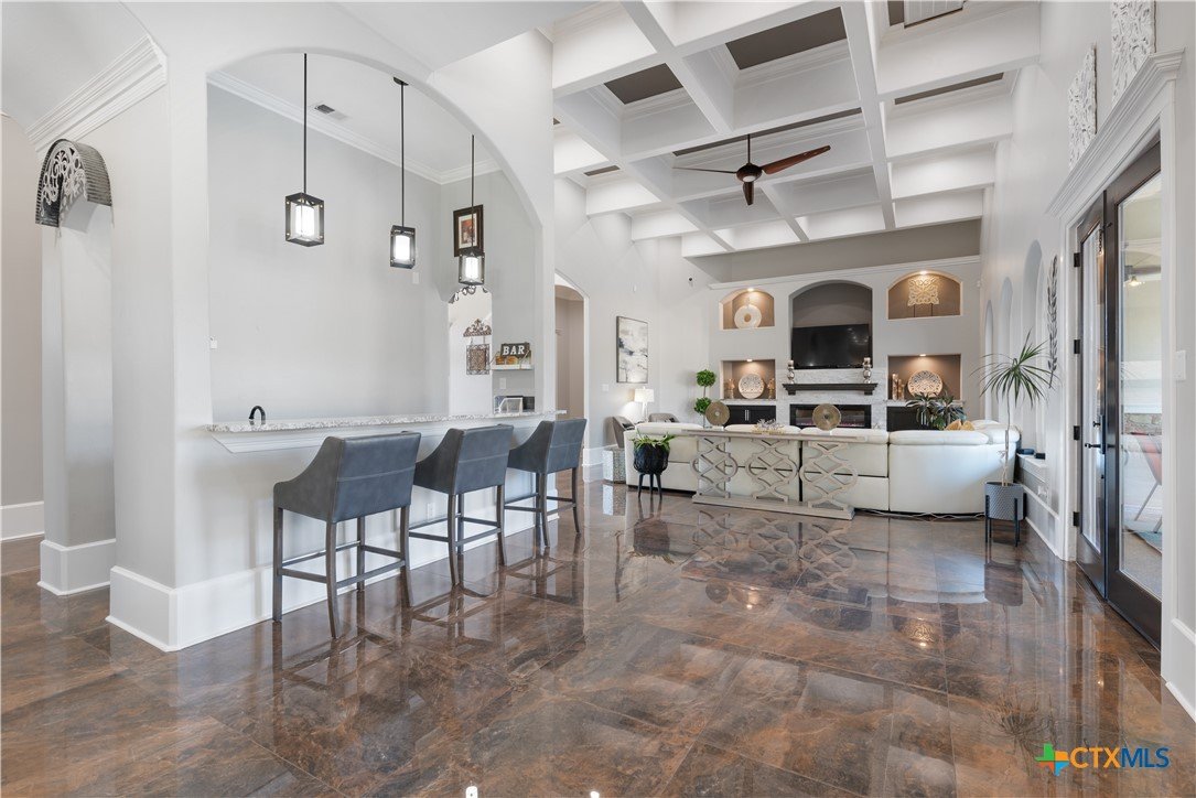 This stunning Hill Country estate offers elegance, privacy, and breathtaking views. The main house features three spacious bedrooms, each with a custom closet and ensuite bath, plus a study used as a fourth bedroom and a dedicated office. The chef’s kitchen boasts a six-burner stove, griddle, pot filler, under-cabinet lighting, and custom storage. The open living space includes an electric fireplace, a bar with a sink, and a Russ sound system with indoor and outdoor speakers. Elegant wood doors, 12-inch baseboards, and expansive glass doors bring in natural light. The oversized primary suite offers dual custom closets, a spa-like bath with an oversized shower, dual rain showerheads, a seating bench, a separate tub, and a jacuzzi just outside. Two primary suites feature walk-in closets and luxurious baths, while a secondary bedroom has a bay window. Porcelain and tile flooring run throughout, complemented by a stylish metal roof. Designed for seamless indoor-outdoor living, six exterior doors lead to multiple outdoor spaces, including a gorgeous pool and spa with customizable lighting. Three bedrooms have direct pool access. A breezeway connects the main house to the guest apartment, which includes a private balcony, tile flooring, a separate laundry room, and a full bath. The property has an attached 2.5-car garage with a ramp into the house, plus an 800 sq. ft. free-standing two-car garage with a one-bedroom apartment. Additional features include an underground propane tank, a 23-zone irrigation system, a camera security system with six cameras, and an owned alarm system. The custom front door from Mexico features glass side panels that open for a refreshing breeze while locking securely. A dedicated laundry room includes a washer and dryer that convey, and an electric water heater ensures efficiency. With abundant on-site parking, four garage spaces, and luxurious details throughout, this estate offers unparalleled comfort and beauty.