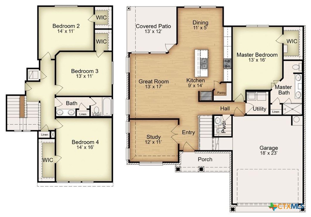 Check out the Sabine plan if you're looking for a two-story home. All secondary bedrooms in this plan are on the second story. The Sabine features a four-bedroom, two-and-a-half-bathroom layout across 2,312 square feet. This plan features an open-concept family room, kitchen, and dining area. The kitchen includes stainless steel appliances with a large island and walk-in pantry, while the primary suite has a private water closet, dual vanity sinks, and a spacious closet. All bedrooms on the second story have expansive walk-in closets, perfect for large families. This plan also has a two-car garage. Plan variations include the choice of a dining room or study off the entryway, a walk-in shower or separate tub and shower in the primary bath, and an outdoor fireplace.