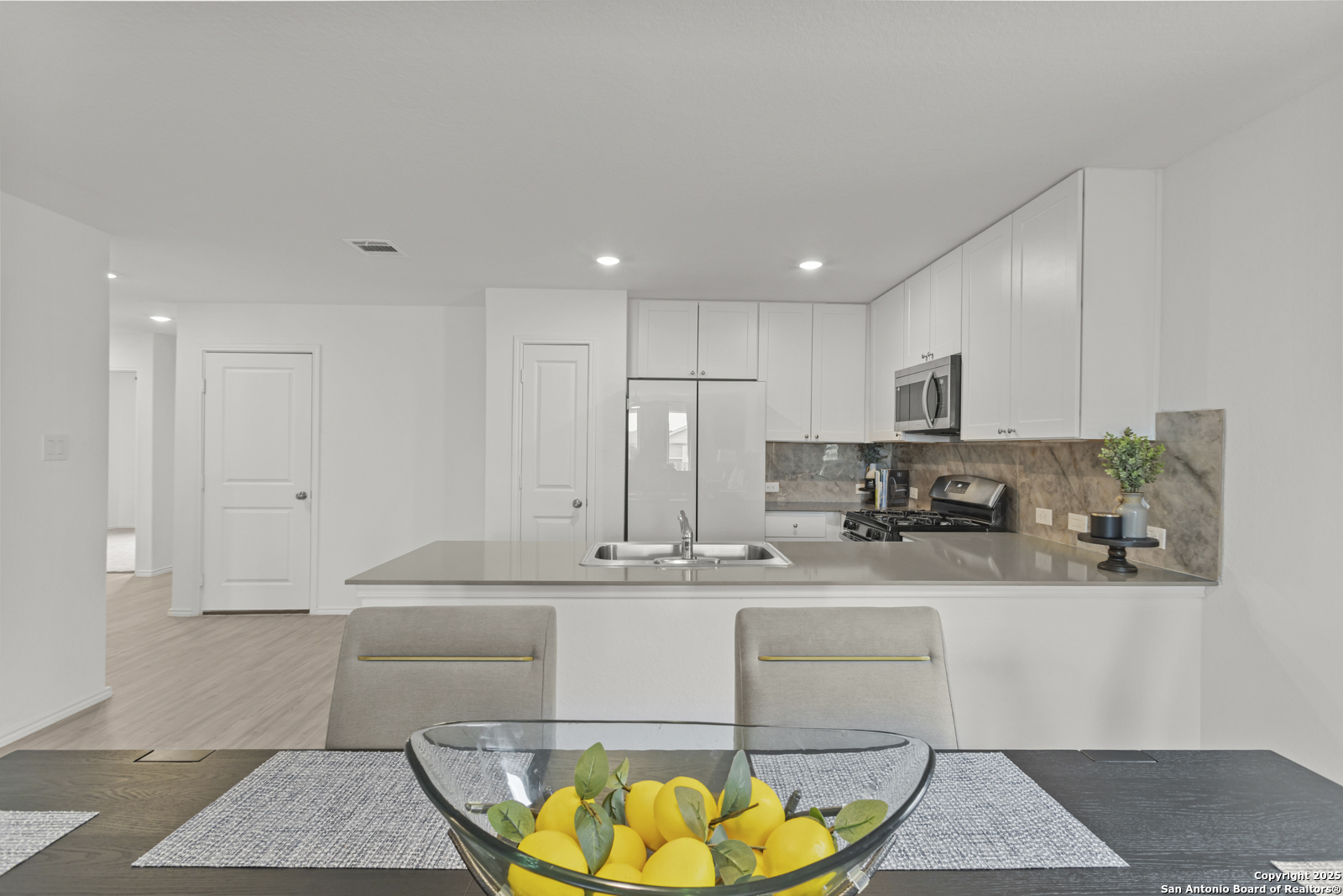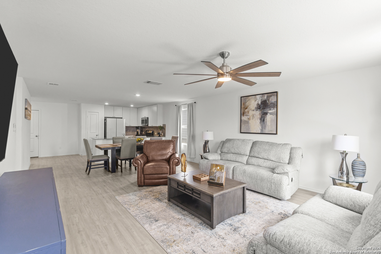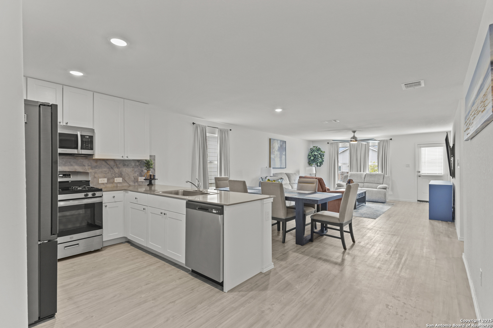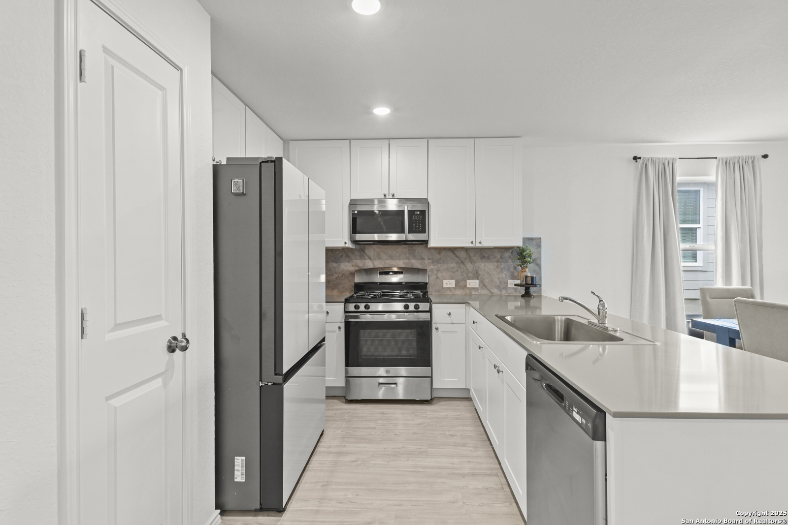 Welcome to 7022 Serf Place. A beautifully designed 3-bedroom, 2-bathroom single-story home located in the vibrant Silos community on San Antonio's rapidly growing west side. Built by Lennar, this 1,498 sq ft residence combines modern comfort with thoughtful layout, perfectly suited for both everyday living and entertaining. As you step onto the covered front porch, you're greeted by a well-balanced floor plan that places two spacious bedrooms near the entrance, ideal for guests, family, or a home office setup. The heart of the home features a bright, open-concept living room and kitchen, where stainless steel appliances, abundant cabinetry, and generous counter space offer the perfect setting for gatherings or quiet dinners at home. Flooded with natural light, the living area flows effortlessly to the private owner's suite at the rear, offering a peaceful retreat. The master bedroom includes a spa-inspired en-suite bathroom with a single vanity, separate shower and soaking tub, and ample closet space. Step outside to a backyard with a concrete patio slab, ideal for outdoor dining, grilling, or relaxing under the Texas sky. Located just minutes from Lackland Air Force Base, this property is ideal for military professionals and commuters. Residents enjoy easy access to major highways, retail centers, and local parks, all while being a short drive to downtown San Antonio and its renowned cultural landmarks.