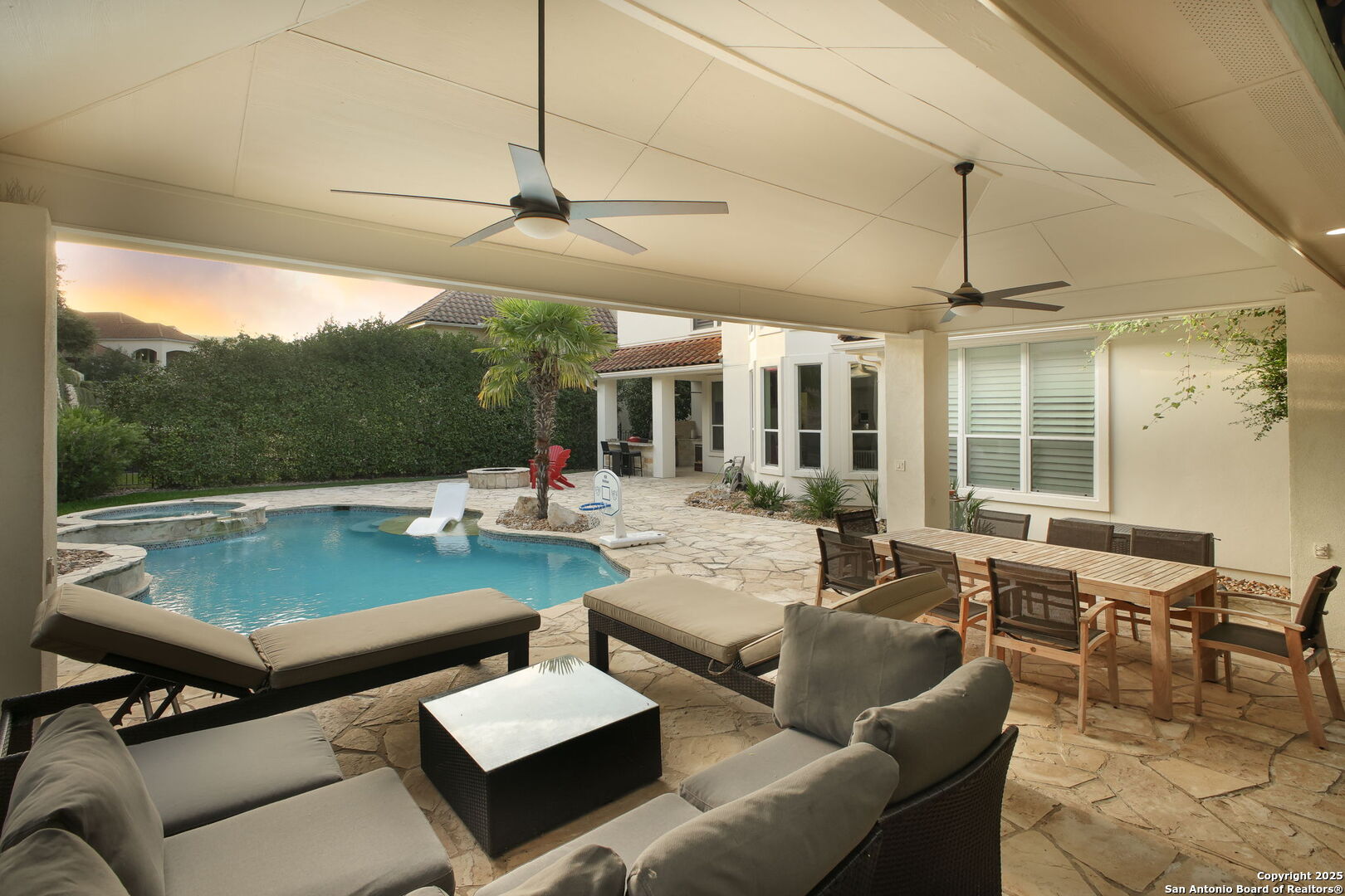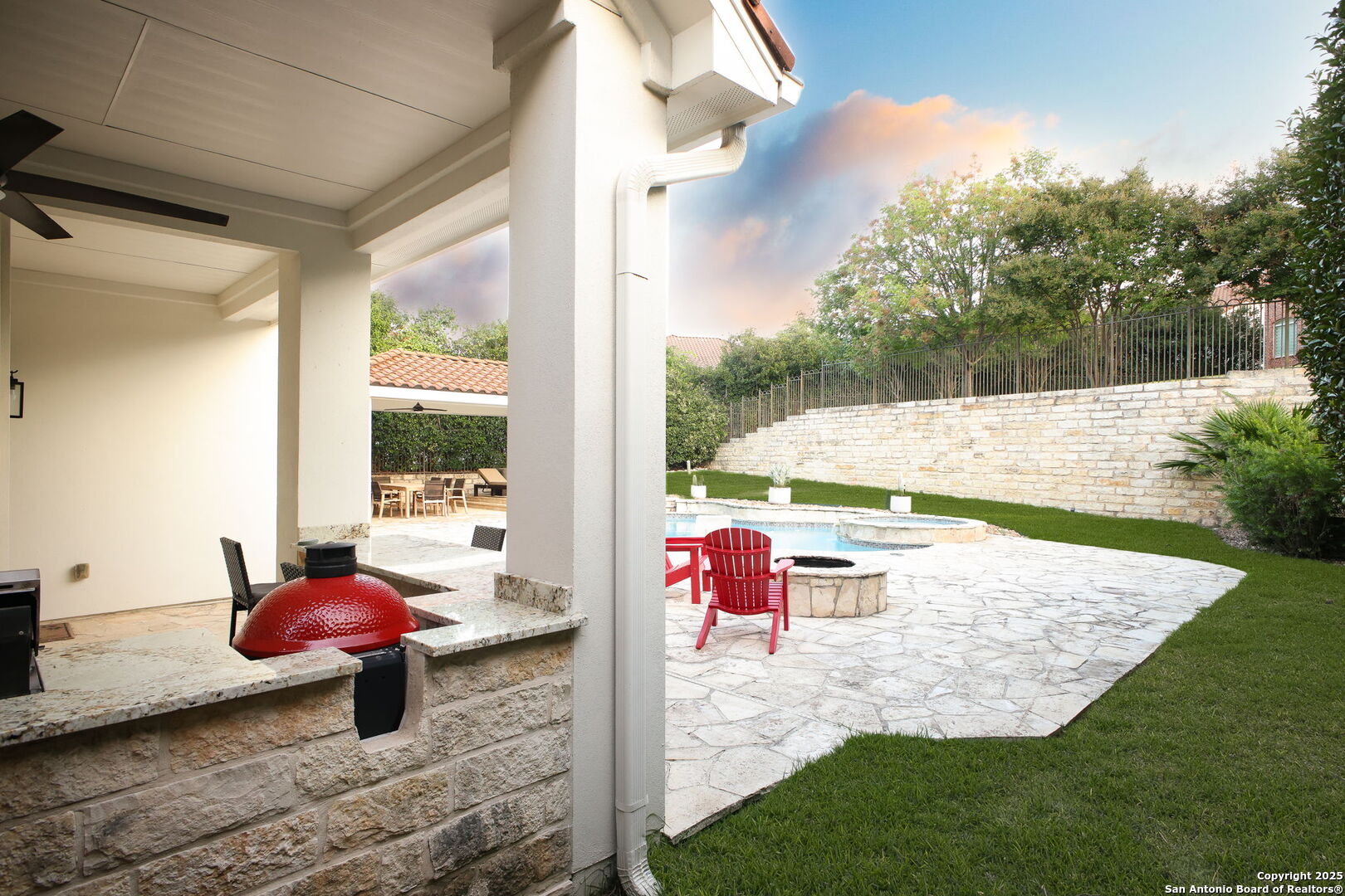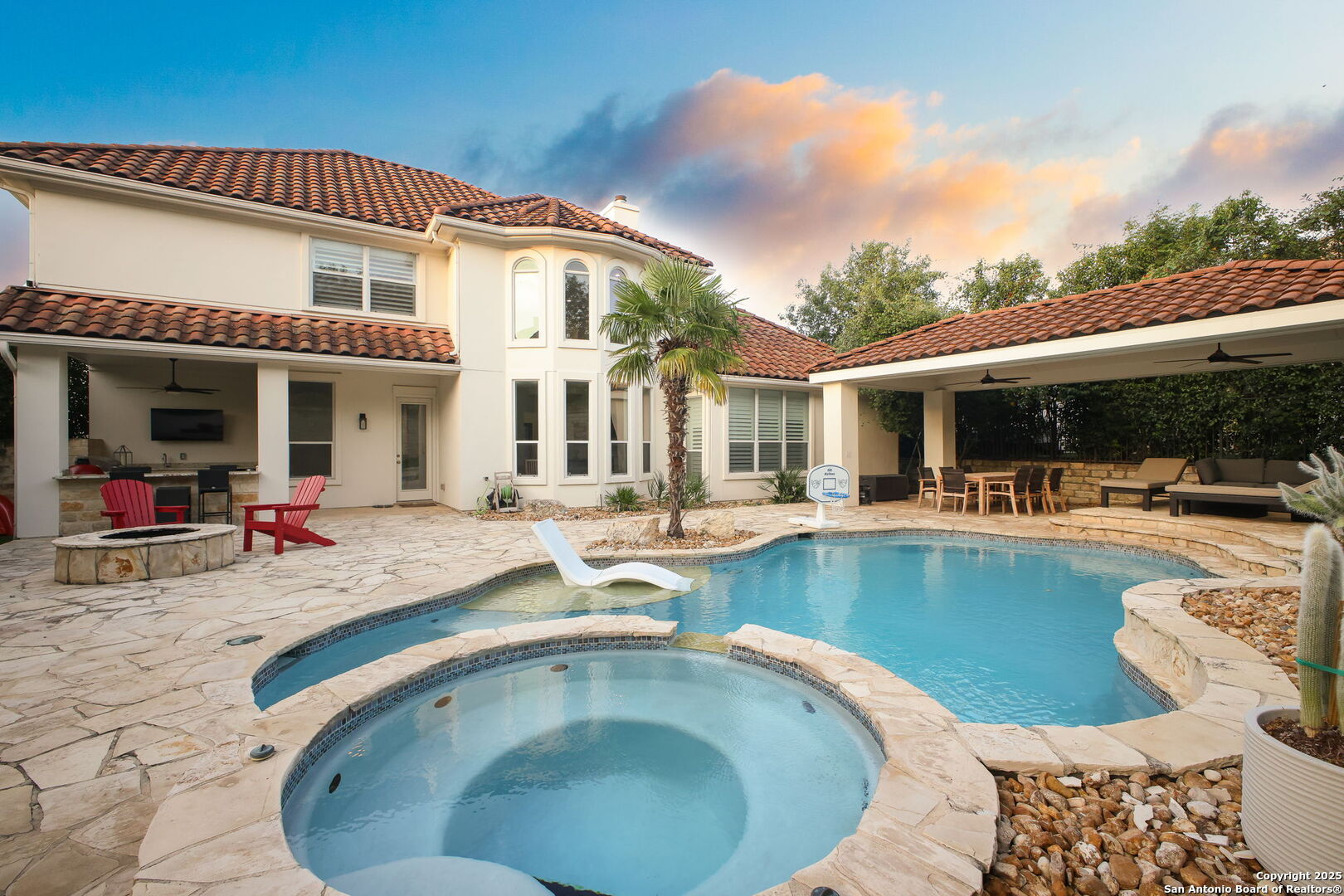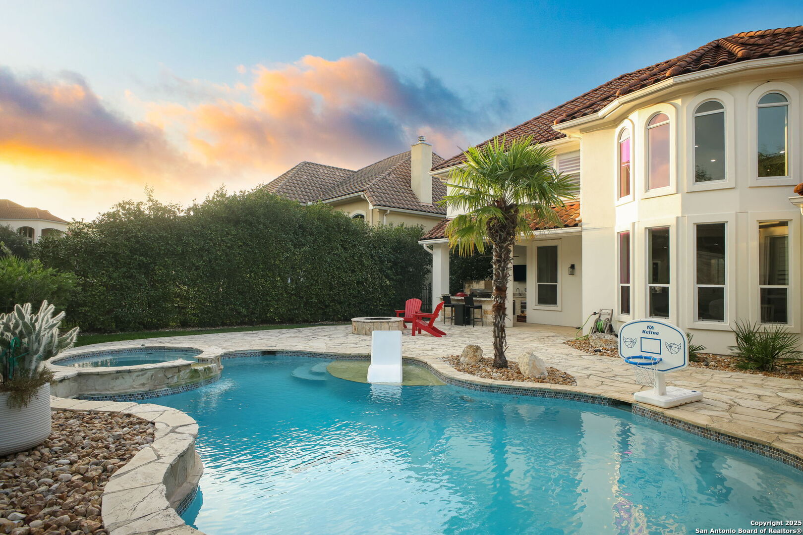 Step into this exquisite Toll Brothers home in the prestigious, guard-gated Reserve at Dominion, where luxury meets everyday comfort. Sunlight streams through floor-to-ceiling windows, illuminating an open floor plan designed for both grand entertaining and quiet family moments. The chef's kitchen, adorned with granite counters, custom cabinetry, and double ovens, invites culinary creativity, while the spacious master retreat offers a private sitting area, serene pool views, and a spa-inspired bathroom with a walk-in shower, separate tub, and dual vanities. On the main level, a secondary bedroom sits just steps from a full bath, offering convenience and privacy. Upstairs, three additional bedrooms, three bathrooms, and a game room provide space for family and guests. Every detail has been thoughtfully updated, from plantation shutters to two new furnaces, water heater, water softener, and pool equipment, ensuring effortless living. Outside, a full outdoor kitchen, flagstone patio, fire pit, covered entertaining area, and sparkling Keith Zars pool with spa create a resort-like retreat. Beyond your backyard, the Dominion community offers world-class amenities, including a championship golf course, clubhouse, swimming pool, tennis courts, and playground, an unmatched lifestyle in one of San Antonio's most coveted neighborhoods. Schedule your private tour today and experience the Dominion lifestyle!