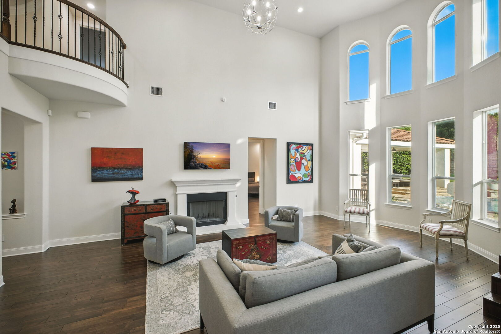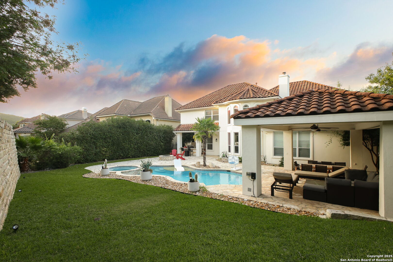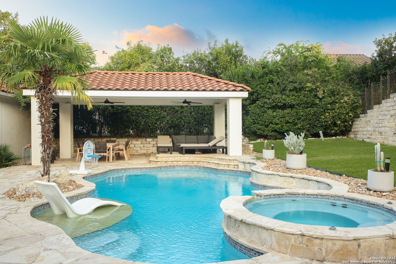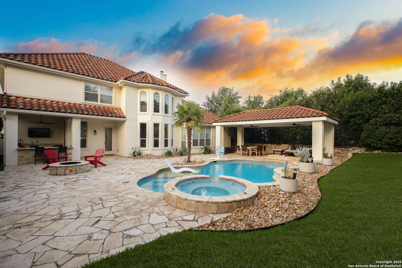 Step into this exquisite Toll Brothers home in the prestigious, guard-gated Reserve at Dominion, where luxury meets everyday comfort. Sunlight streams through floor-to-ceiling windows, illuminating an open floor plan designed for both grand entertaining and quiet family moments. The chef's kitchen, adorned with granite counters, custom cabinetry, and double ovens, invites culinary creativity, while the spacious master retreat offers a private sitting area, serene pool views, and a spa-inspired bathroom with a walk-in shower, separate tub, and dual vanities. On the main level, a secondary bedroom sits just steps from a full bath, offering convenience and privacy. Upstairs, three additional bedrooms, three bathrooms, and a game room provide space for family and guests. Every detail has been thoughtfully updated, from plantation shutters to two new furnaces, water heater, water softener, and pool equipment, ensuring effortless living. Outside, a full outdoor kitchen, flagstone patio, fire pit, covered entertaining area, and sparkling Keith Zars pool with spa create a resort-like retreat. Beyond your backyard, the Dominion community offers world-class amenities, including a championship golf course, clubhouse, swimming pool, tennis courts, and playground, an unmatched lifestyle in one of San Antonio's most coveted neighborhoods. Schedule your private tour today and experience the Dominion lifestyle!