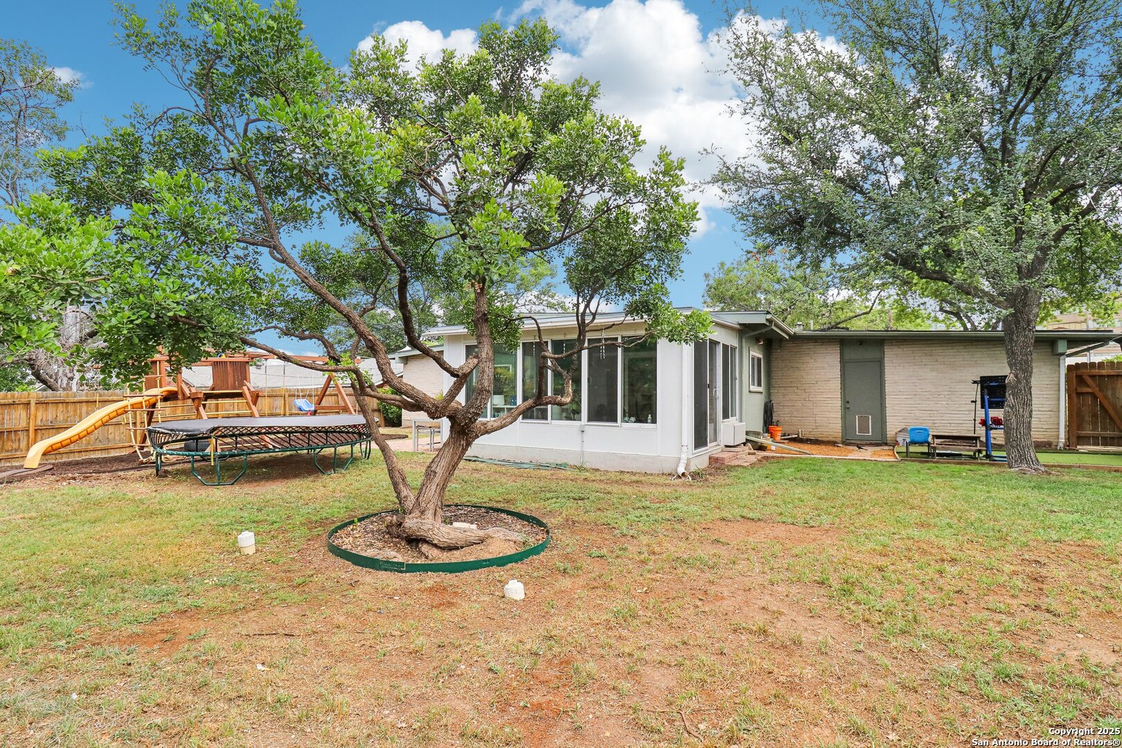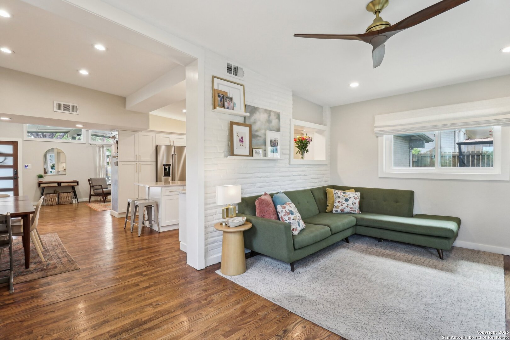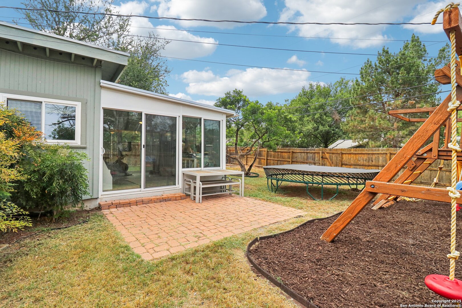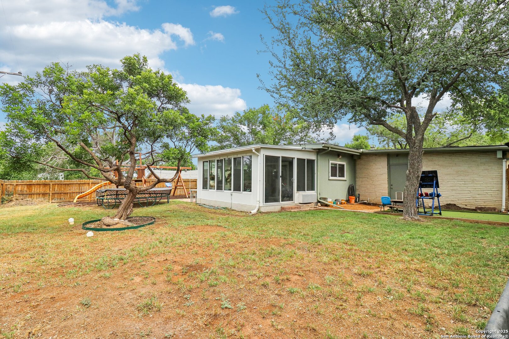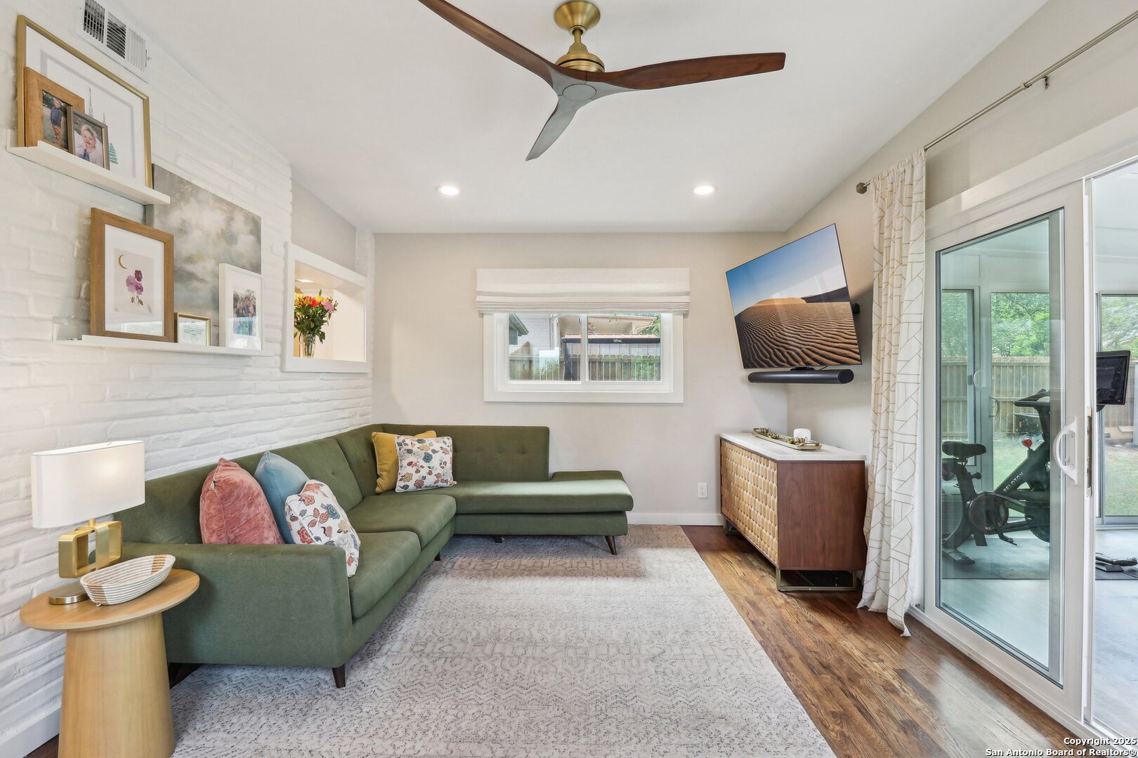 This charming, fully updated mid-century modern home blends timeless architecture with modern convenience-located in the highly sought-after Alamo Heights School District and zoned for Cambridge Elementary. Inside, enjoy tall ceilings, beautiful hardwood flooring, new doors and windows, and an open-concept layout ideal for entertaining. The spacious kitchen features a large quartzite island, KitchenAid appliances including a gas range, and sleek cabinetry. Extensive renovations include updated wiring throughout, recessed lighting, new HVAC, and a newly poured driveway. A panoramic, temperature-controlled sunroom adds flexible living space year-round-perfect for morning coffee, a playroom, or home office. Outside, the shaded portico welcomes you home, while the large front and backyards provide ample space for entertaining or relaxing. The home's signature asymmetrical rooflines and clean lines speak to its iconic mid-century roots. Ideally located within walking distance of the Alamo Heights Natatorium and tennis courts, with quick access to Highway 281 and Loop 410. Minutes from H-E-B, Target, Walmart, and the Quarry Crossing shopping district, and within a 10-minute drive of both the Stone Oak area and vibrant downtown San Antonio. A rare find that combines style, location, and comfort in one of the city's most desirable neighborhoods.