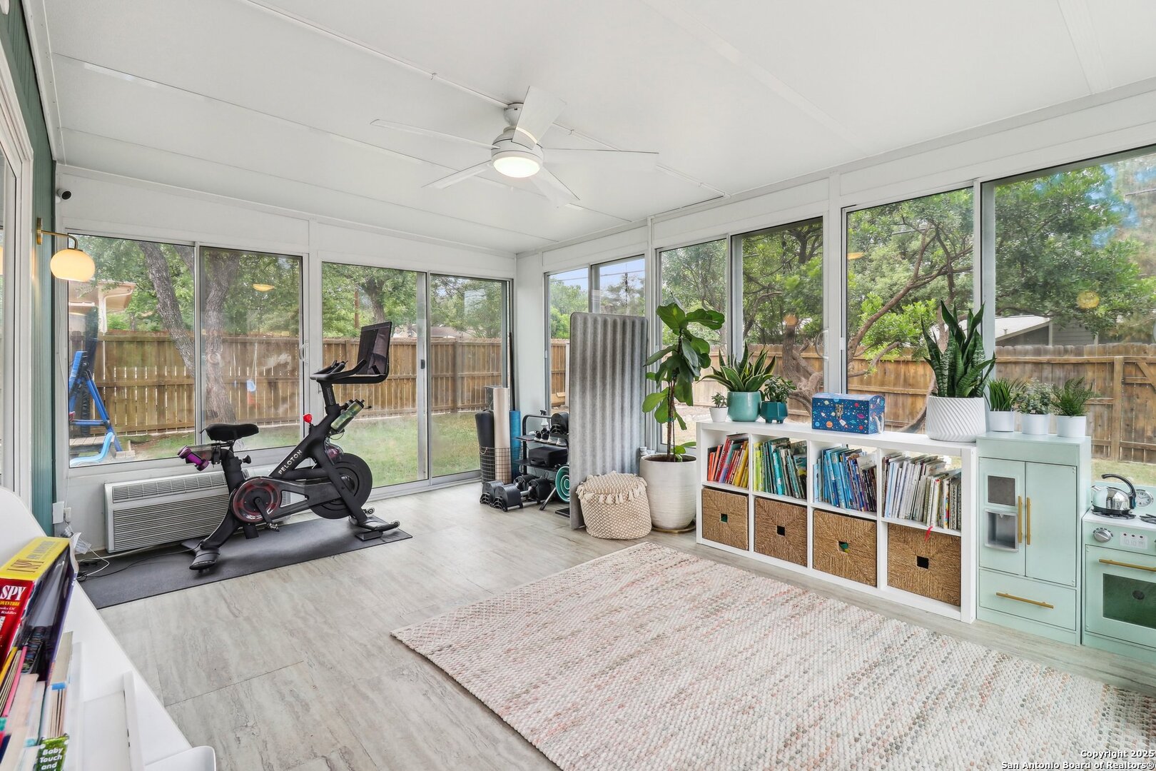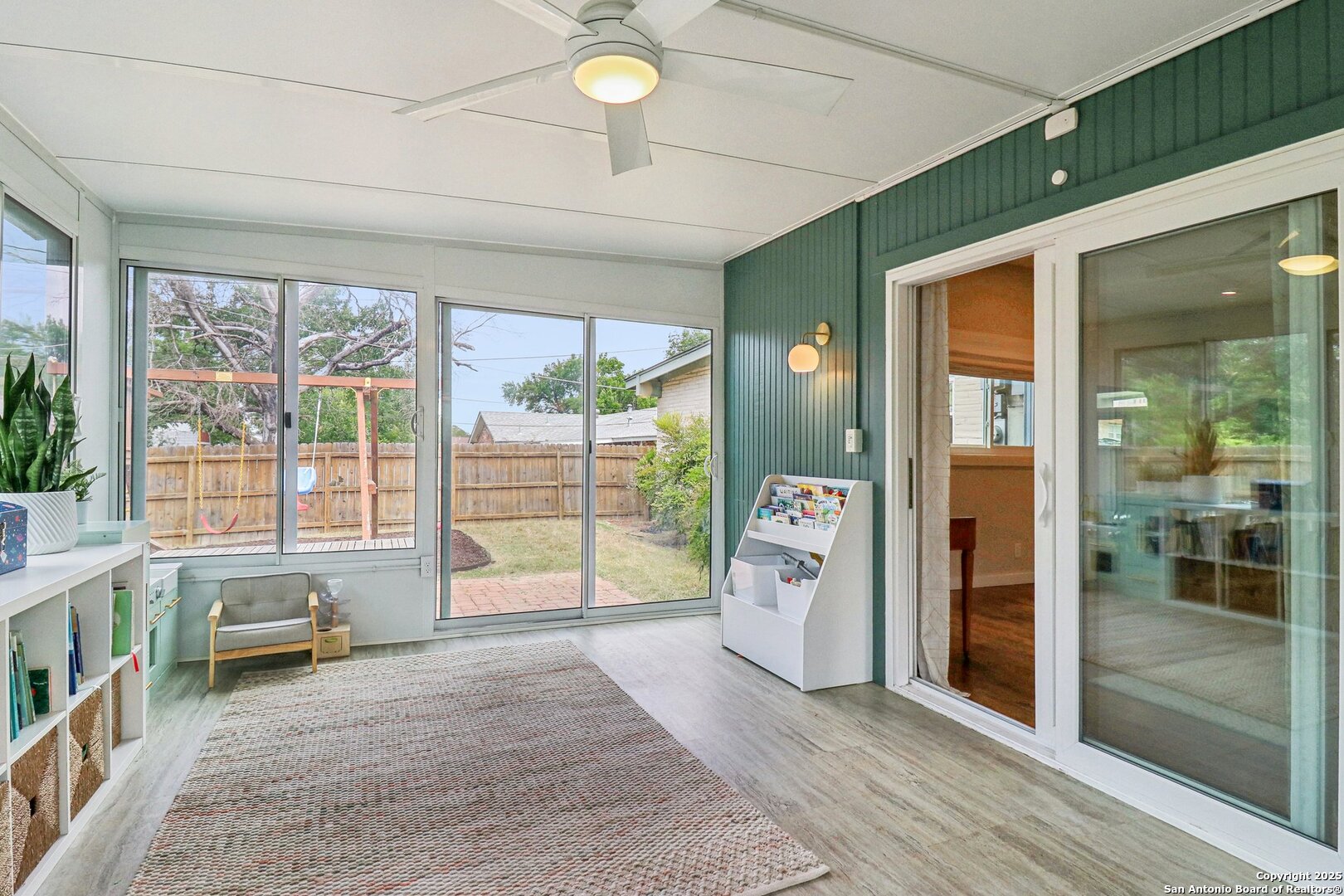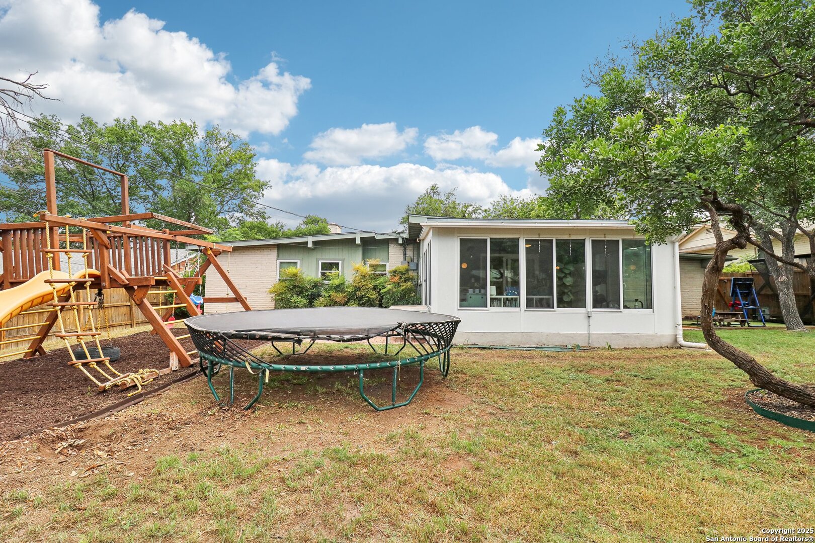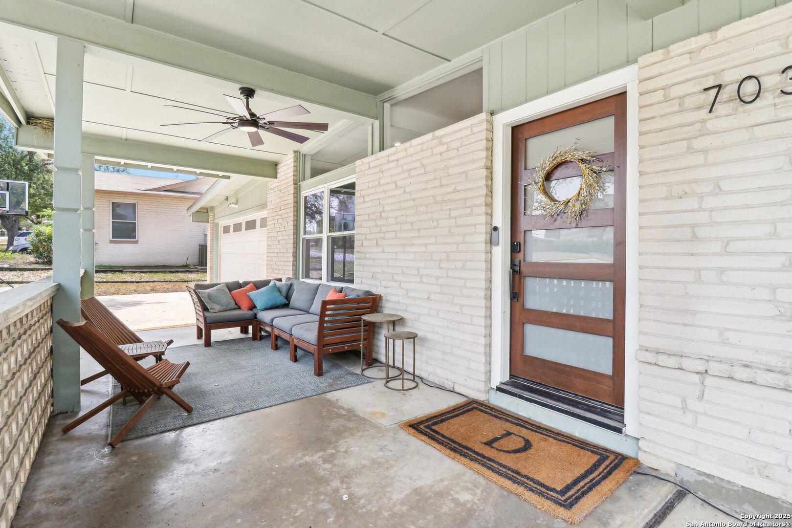 This charming, fully updated mid-century modern home blends timeless architecture with modern convenience-located in the highly sought-after Alamo Heights School District and zoned for Cambridge Elementary. Inside, enjoy tall ceilings, beautiful hardwood flooring, new doors and windows, and an open-concept layout ideal for entertaining. The spacious kitchen features a large quartzite island, KitchenAid appliances including a gas range, and sleek cabinetry. Extensive renovations include updated wiring throughout, recessed lighting, new HVAC, and a newly poured driveway. A panoramic, temperature-controlled sunroom adds flexible living space year-round-perfect for morning coffee, a playroom, or home office. Outside, the shaded portico welcomes you home, while the large front and backyards provide ample space for entertaining or relaxing. The home's signature asymmetrical rooflines and clean lines speak to its iconic mid-century roots. Ideally located within walking distance of the Alamo Heights Natatorium and tennis courts, with quick access to Highway 281 and Loop 410. Minutes from H-E-B, Target, Walmart, and the Quarry Crossing shopping district, and within a 10-minute drive of both the Stone Oak area and vibrant downtown San Antonio. A rare find that combines style, location, and comfort in one of the city's most desirable neighborhoods.