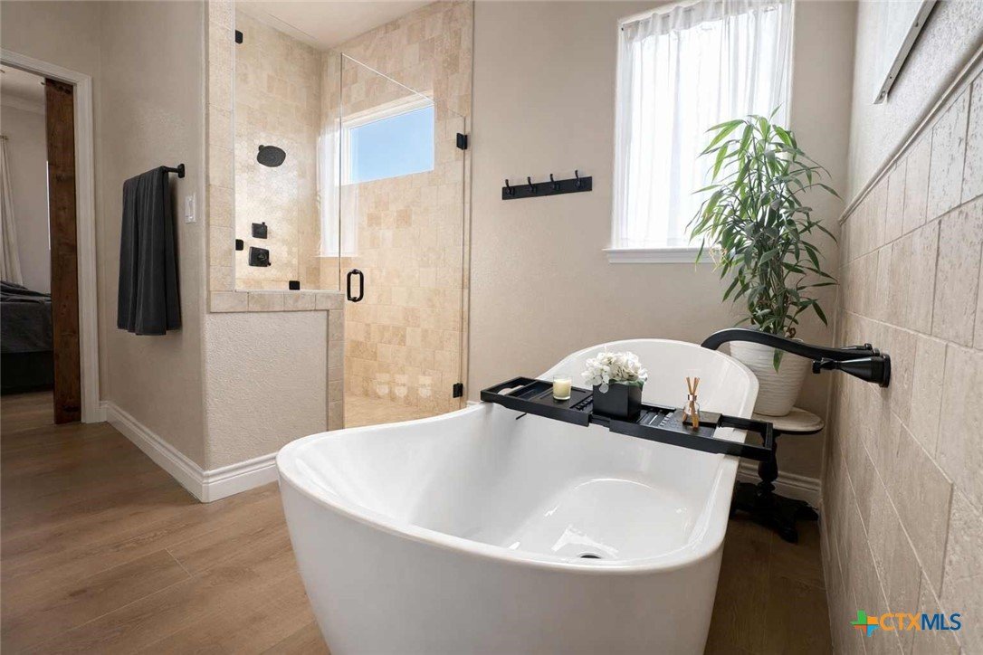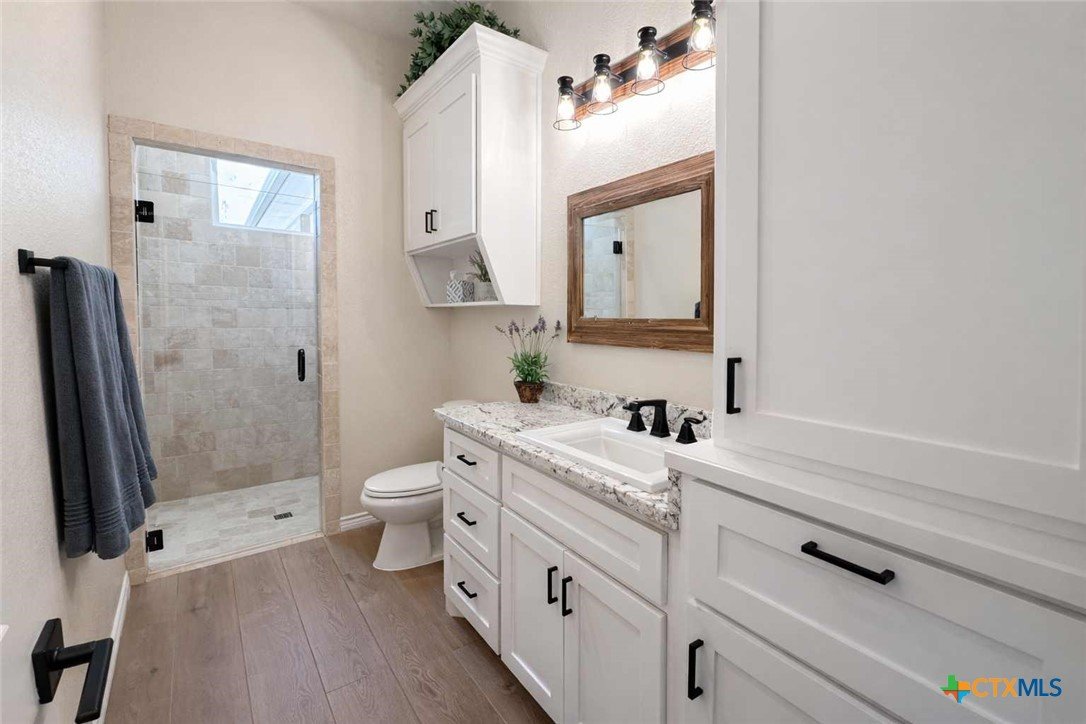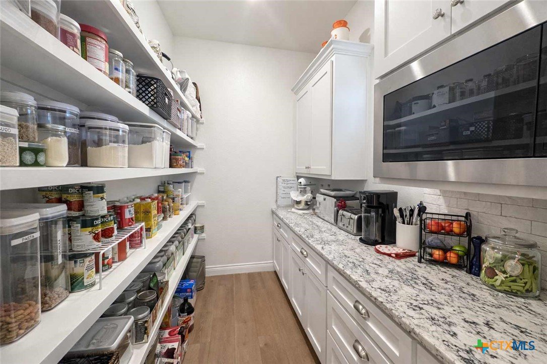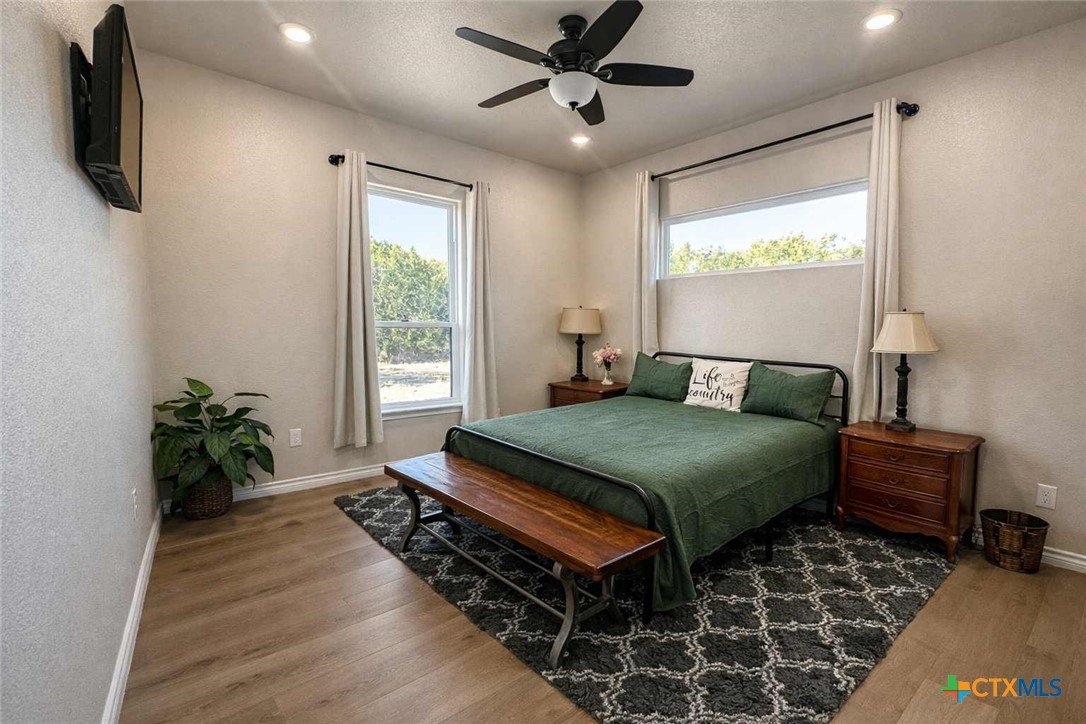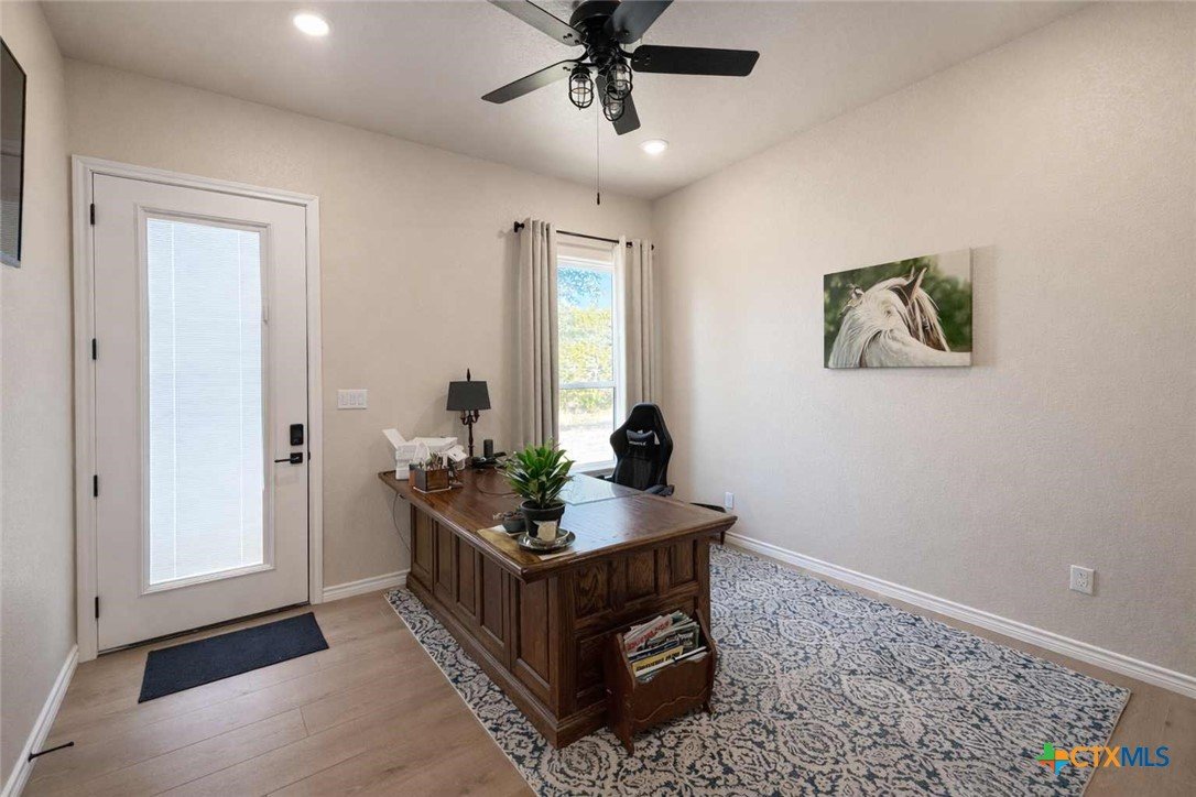 Private custom home on approximately 11 ag-exempt acres with sweeping Hill Country views, exceptional privacy, and high-end construction throughout. Thoughtfully engineered and beautifully finished, this property offers modern systems, quality craftsmanship, and usable land in a peaceful setting. The home features 10-foot ceilings and wood-look tile flooring throughout. All rooms are generously sized with walk-in closets, and a flexible office space can easily convert into a fourth bedroom. The chef’s kitchen includes premium Thermador appliances with double convection ovens, cooktop, dishwasher, exterior-vented hood, pot filler, custom cabinetry with hidden island storage, limestone backsplash, and a spacious dining area ideal for entertaining. The living area is centered around a fireplace with gas starter, birch wood beam and mantle, and a 7.1 surround-sound system. A dedicated media and network closet supports hard-wired connections in every room, including the office. The primary suite offers a walk-in travertine tile shower, quartz countertops in the bath and closet, built-in hampers, charging outlets, and dedicated ventilation. Granite countertops are featured throughout the rest of the home, with crown molding in main living areas. Construction highlights include spray-foam insulation in all walls and attic, two tankless water heaters, an approximately 800-foot well with a complete soft-water system, aerobic septic, underground electric, lightning surge protection on all panels, gutters, and a Lennox HVAC system. Outdoor features include a 30x30 covered patio designed to capture country views, mature oak trees, extensive cedar clearing, a 65x50 workshop with exhaust fans, wired for welder and compressor (100 amp, 220V) and keyless entry, and a chicken coop. A rare opportunity for buyers seeking privacy, views, and quality infrastructure on acreage.