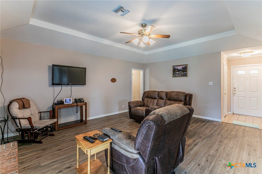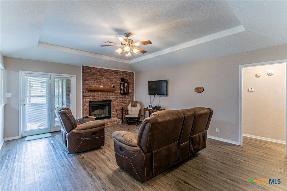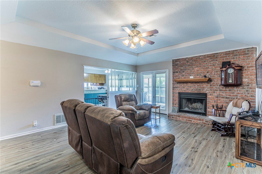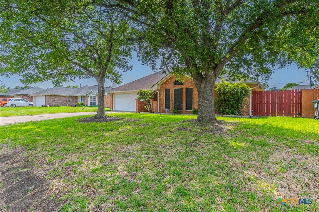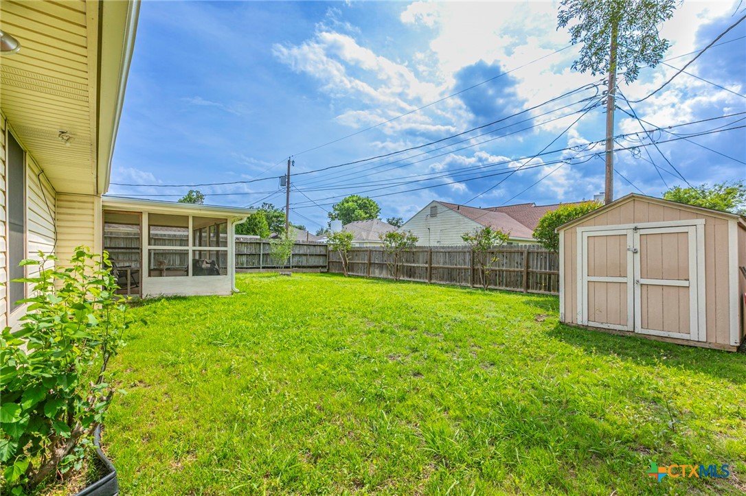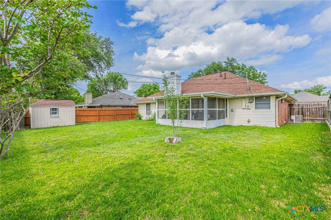 Brick 3-bed, 2-bath home in an established Temple neighborhood with quick access to IH-35—ideal for commuters. Conveniently located near shopping, dining, schools, and Baylor Scott & White. Inside features luxury vinyl plank flooring in main areas and primary suite, with carpet in secondary bedrooms. The living room offers a trayed ceiling and wood-burning fireplace. The kitchen includes a gas range, vent hood, and ample cabinetry, flowing into a bright dining area with bay window overlooking a private, tree-shaded backyard. The primary suite has two walk-in closets and an en suite bath with double vanity and shower. Two additional bedrooms and a full bath offer flexibility. Enjoy a screened-in patio, fenced yard, sprinkler system, and storage shed. Great value—perfect for first-time buyers, downsizers, or investors. Call your realtor for a showing today.