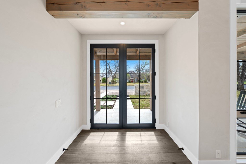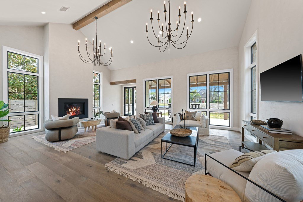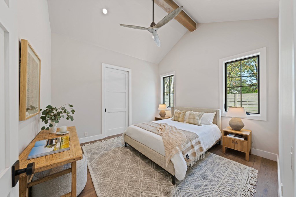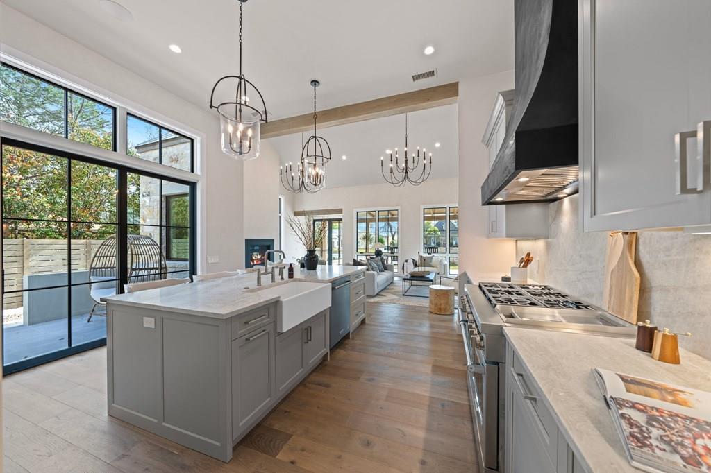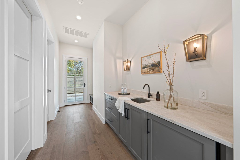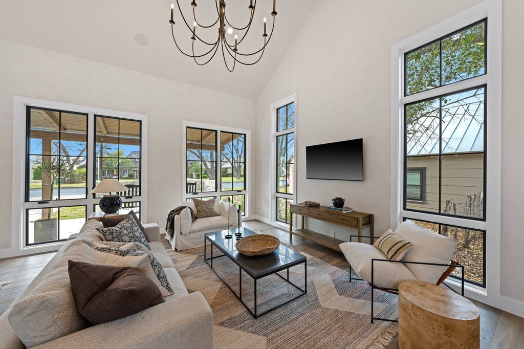 Nestled in the Historic District of Fredericksburg, this immaculate newly constructed home is move in ready and better than new, having served primarily as a guest house with minimal use by the current owners. It pristinely showcases high-end finishes and meticulous craftsmanship throughout its 3 bedroom 3 1/2-bath layout. Step through the beautifully landscaped entrance into a bright open-concept living area adorned with tall windows, designer lighting, white oak flooring, and a cozy gas fireplace. The gourmet kitchen is a chef's delight, featuring a suite of KitchenAid stainless appliances, bespoke cabinetry, and striking Taj Mahal quartzite countertops, extending to a hidden scullery perfect for storage and prep. The dining area boasts architectural finesse with floor-to-ceiling windows and access to a picturesque patio. A luxurious master suite awaits, offering lofty ceilings and a spa-like bath with a soaking tub, large shower, dual vanities, and walk-in closet. Privacy is paramount in the guest wing, including 2 bedrooms each with en-suite baths, additional exterior access, and a convenient coffee bar with a mini-fridge. Prewired for audio/visual equipment for modern comfort.