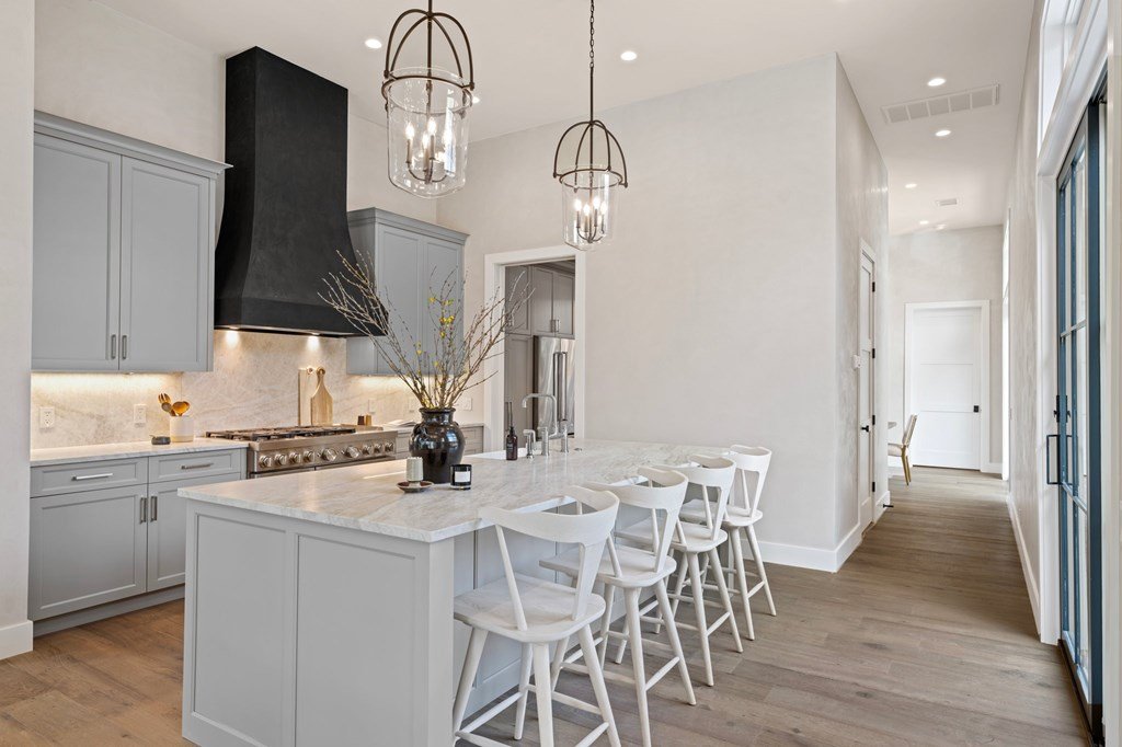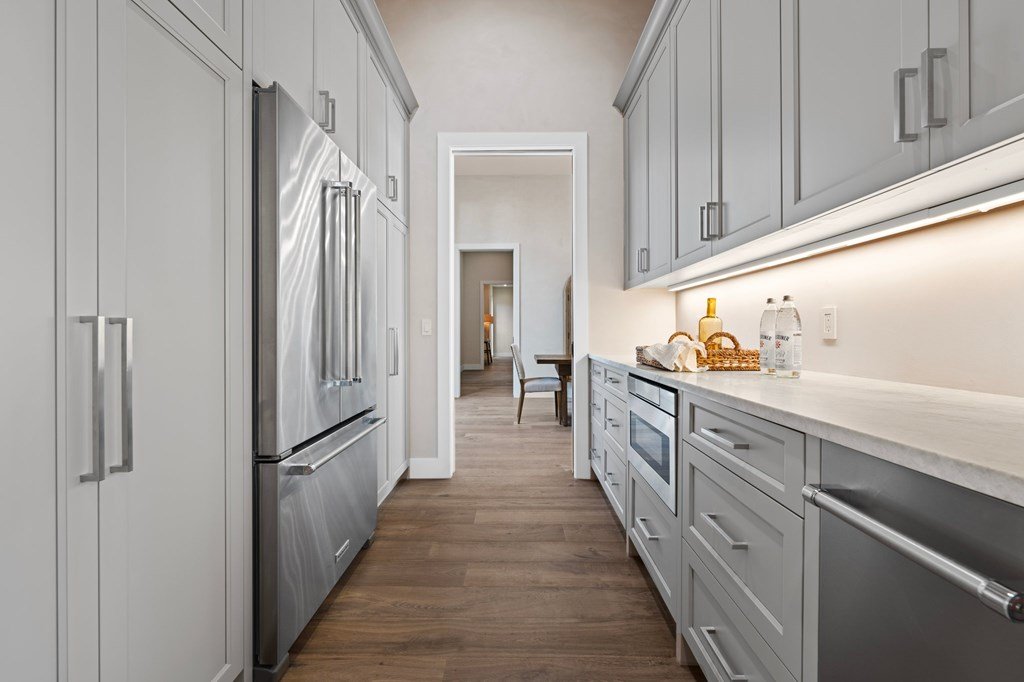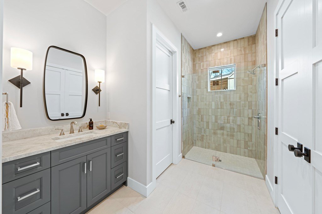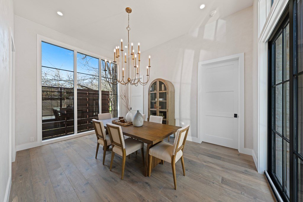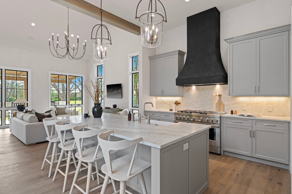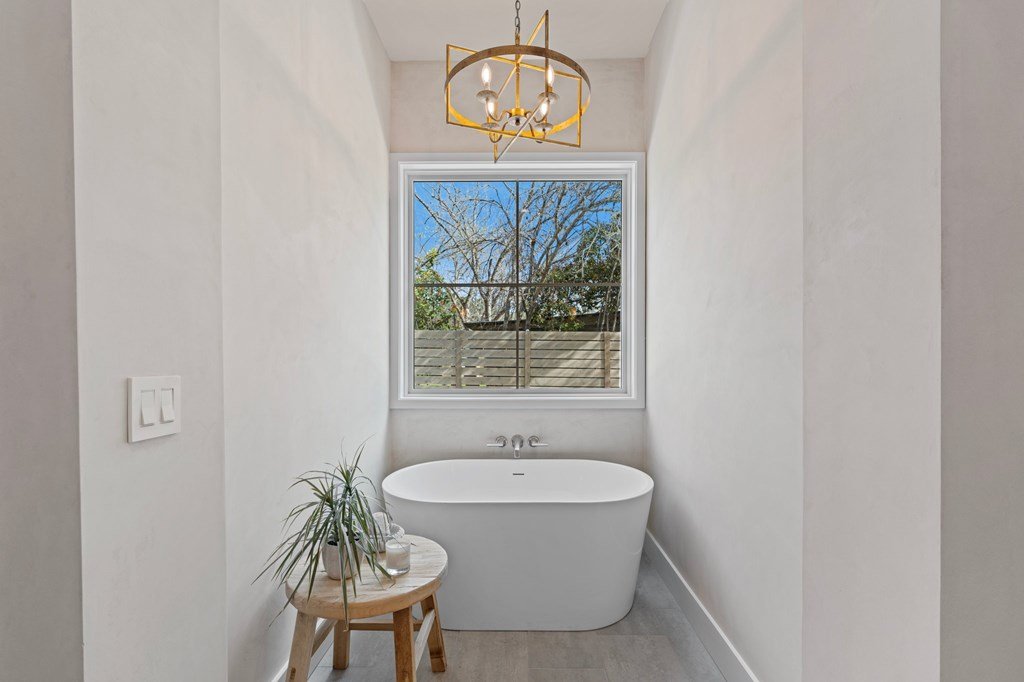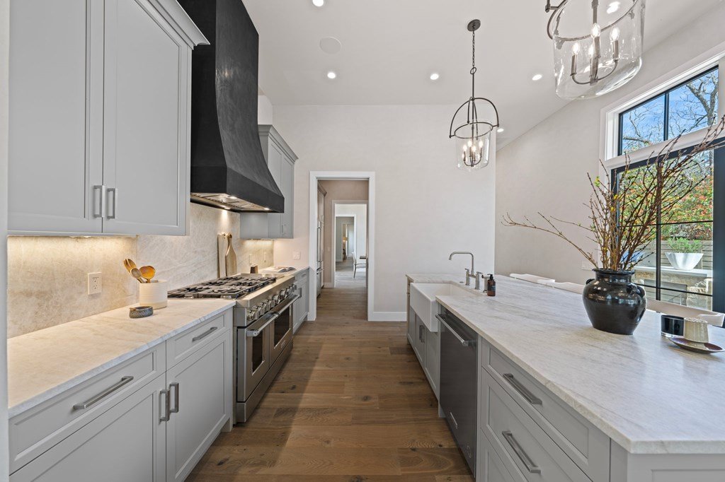 Nestled in the Historic District of Fredericksburg, this immaculate newly constructed home is move in ready and better than new, having served primarily as a guest house with minimal use by the current owners. It pristinely showcases high-end finishes and meticulous craftsmanship throughout its 3 bedroom 3 1/2-bath layout. Step through the beautifully landscaped entrance into a bright open-concept living area adorned with tall windows, designer lighting, white oak flooring, and a cozy gas fireplace. The gourmet kitchen is a chef's delight, featuring a suite of KitchenAid stainless appliances, bespoke cabinetry, and striking Taj Mahal quartzite countertops, extending to a hidden scullery perfect for storage and prep. The dining area boasts architectural finesse with floor-to-ceiling windows and access to a picturesque patio. A luxurious master suite awaits, offering lofty ceilings and a spa-like bath with a soaking tub, large shower, dual vanities, and walk-in closet. Privacy is paramount in the guest wing, including 2 bedrooms each with en-suite baths, additional exterior access, and a convenient coffee bar with a mini-fridge. Prewired for audio/visual equipment for modern comfort.