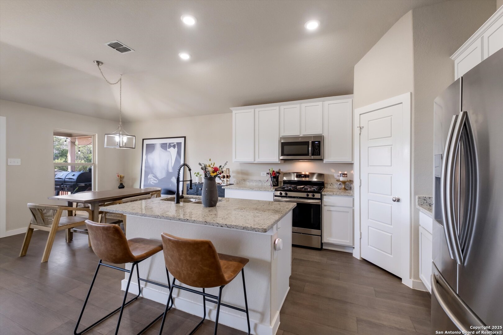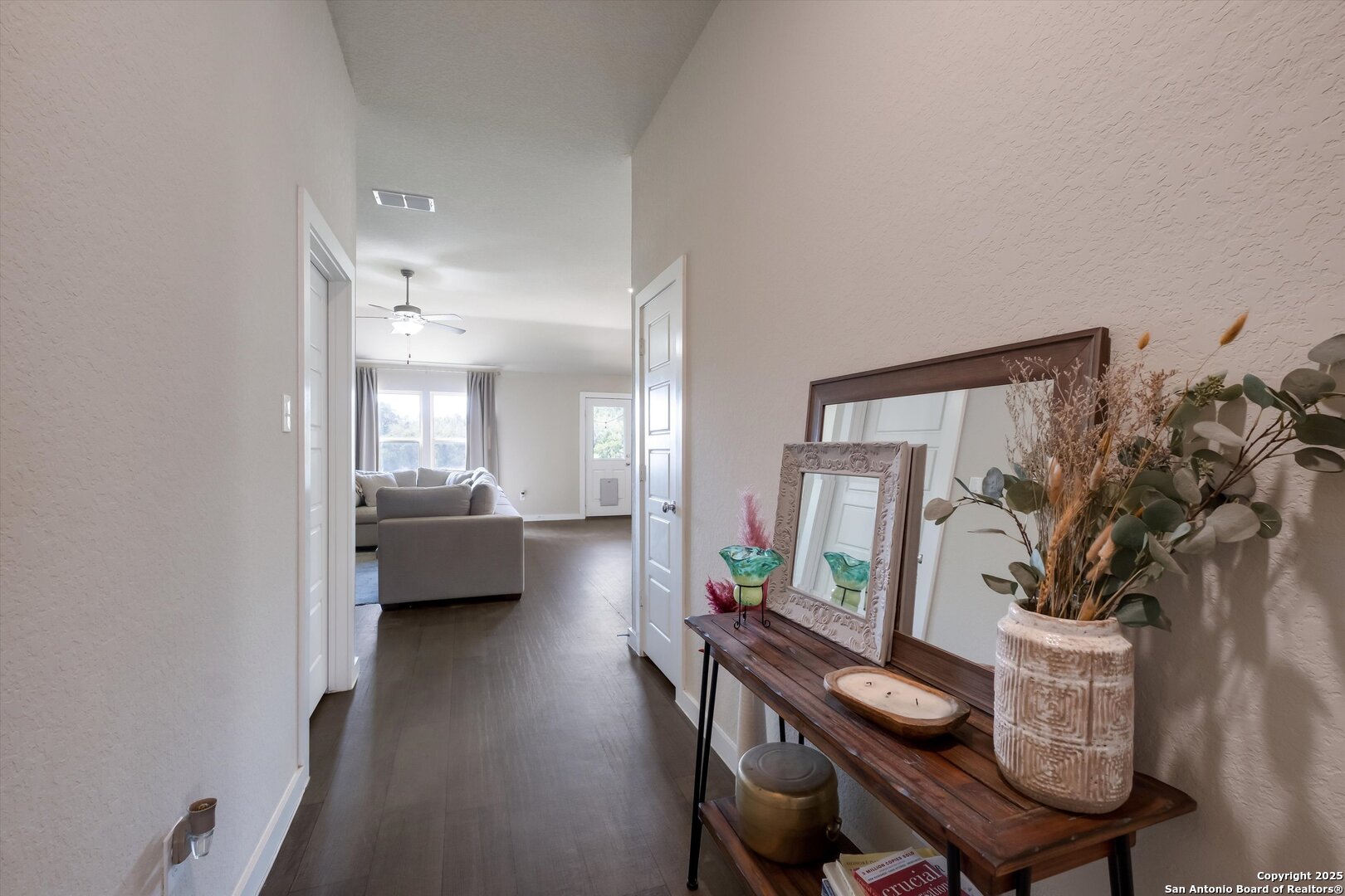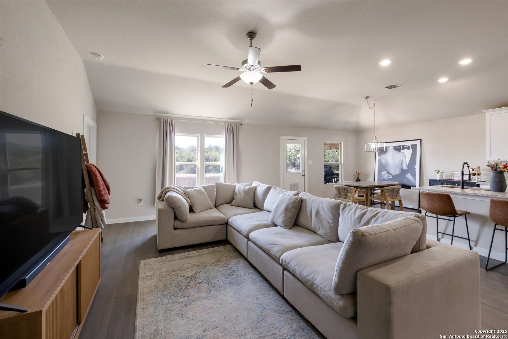 Nestled in the serene Vista Ridge Community in Live Oak on San Antonio's picturesque Northeast side, this meticulously maintained single-story home offers three bedrooms, two bathrooms, and an open-concept design with high ceilings. The kitchen is adorned with stainless steel appliances, granite countertops, and pristine white cabinetry, while the greenbelt backyard provides lovely views. Additional features include a covered patio, water softener, an alarm system, and an extended two-car garage. What sets this home apart is the back yard views out to the park like setting, large covered patio and large storage shed. Enjoy easy access to major highways, IH-35 and Loop 1604, along with a wealth of nearby shopping and dining options.