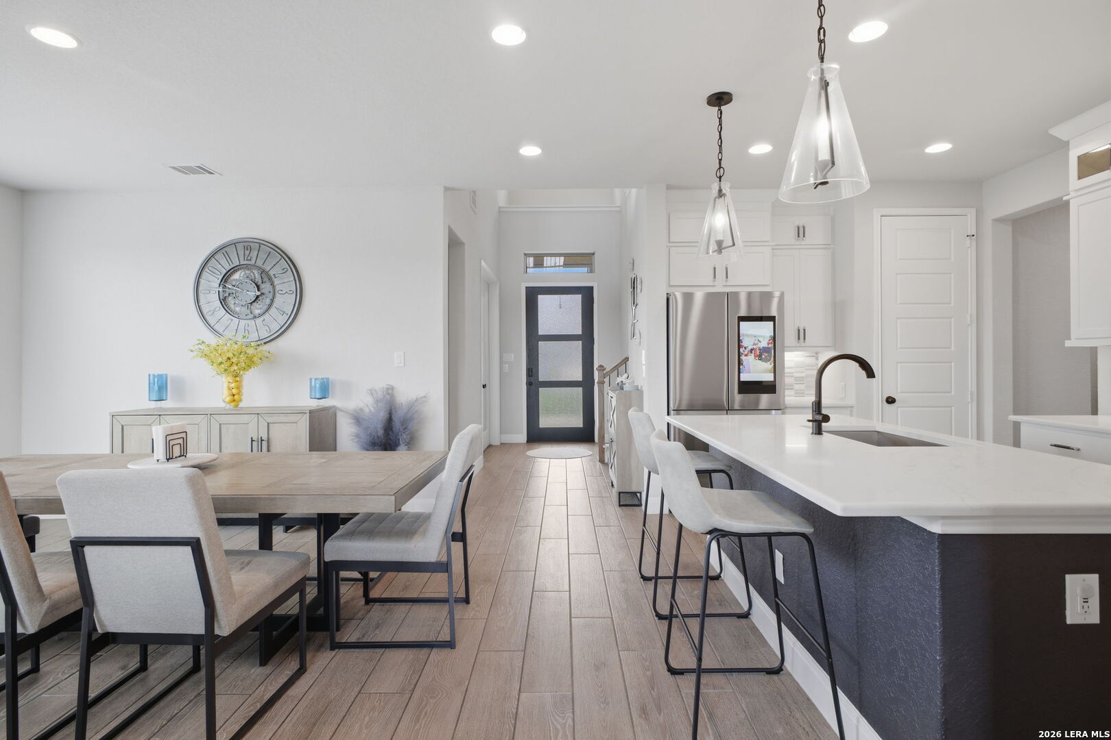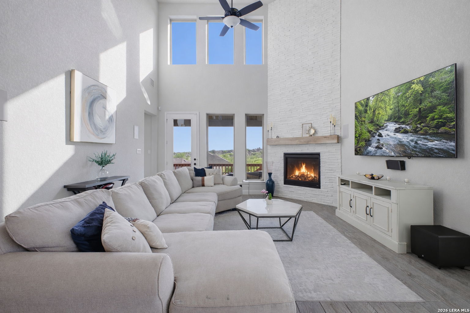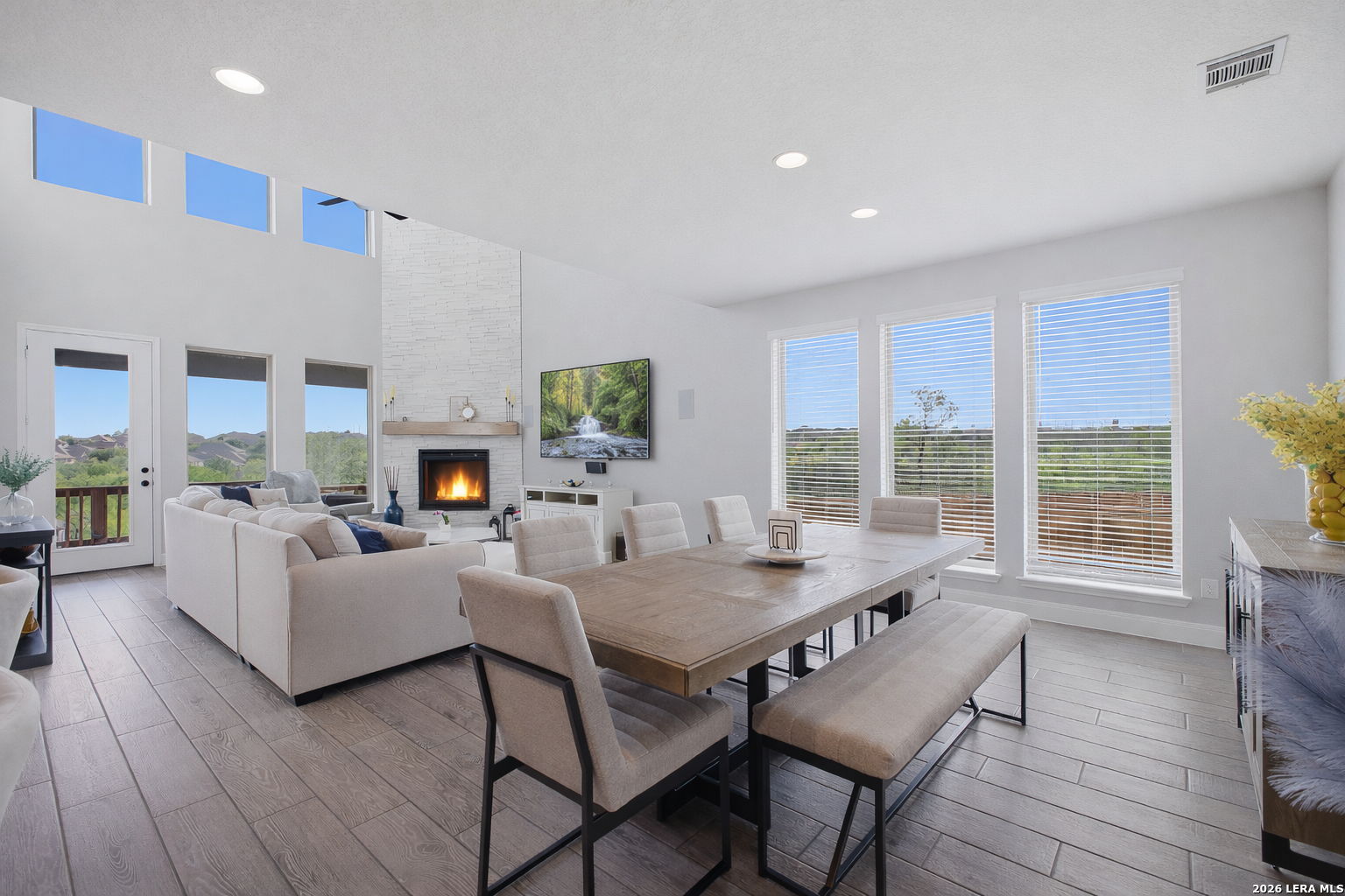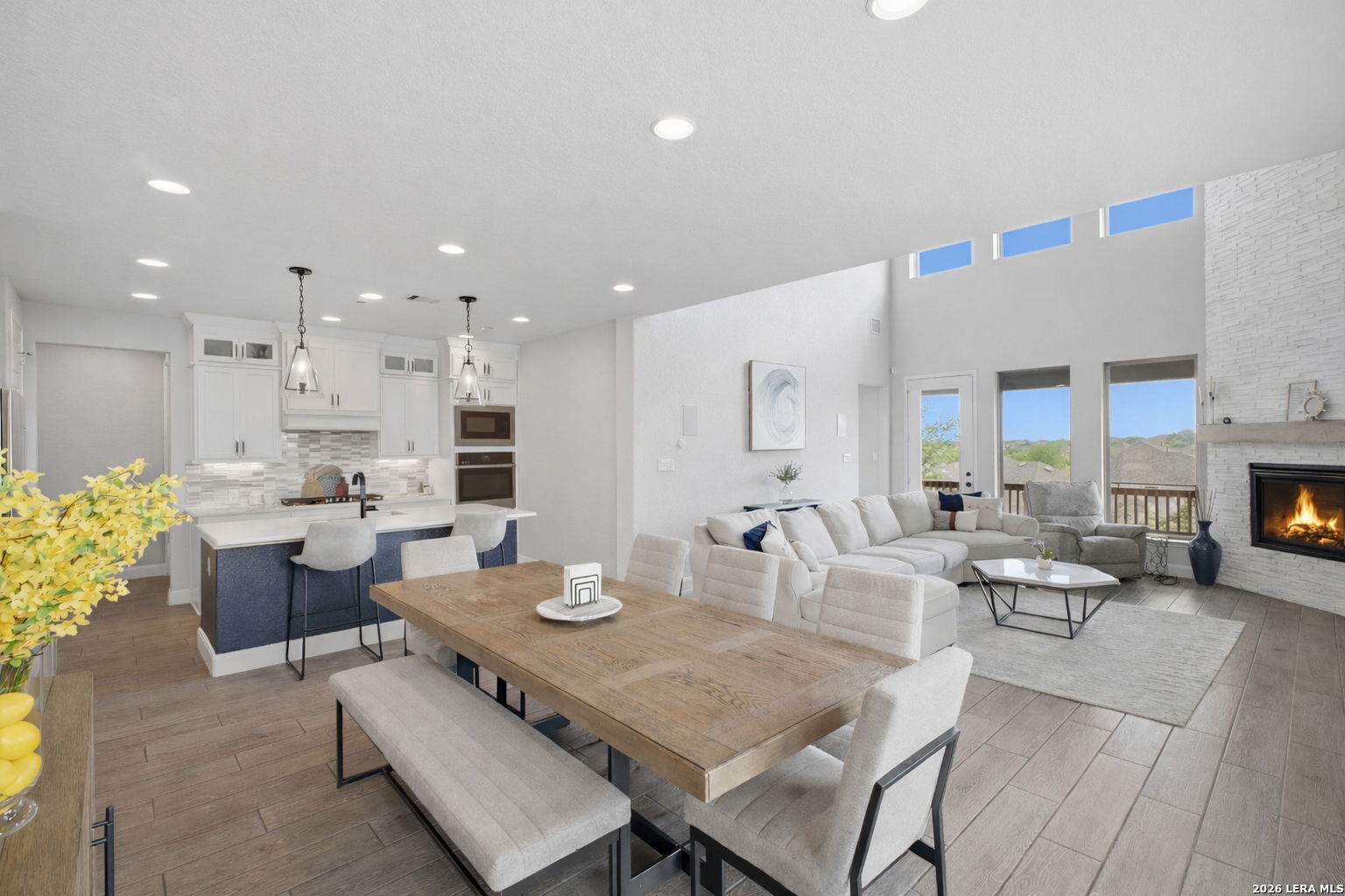 Sunlight spills through the glass and the world slows down-this is where design, privacy, and presence come together. Tucked within the coveted Weston Oaks community and crafted by acclaimed Perry Homes, this exceptional residence redefines modern Texas luxury. Offering **2,632 square feet, 4 bedrooms, and 3 full bathrooms**, it sits quietly on a premium cul-de-sac homesite where **no back neighbors and no side neighbor** create a rare sense of openness, stillness, and escape. From the moment you enter, the home unfolds with intention-soaring ceilings, clean architectural lines, and an effortless flow that draws your eye directly to the horizon. Walls of **floor-to-ceiling windows** frame uninterrupted countryside views, turning the living space into a living canvas of Texas sky, light, and land. At the heart of the home, a dramatic **floor-to-ceiling tiled fireplace** rises like a sculptural centerpiece-anchoring the main living area with warmth, texture, and quiet sophistication. Every finish has been elevated, every detail considered. The kitchen blends function and beauty with a designer's touch-**pendant lighting suspended like jewelry**, upgraded surfaces, and a layout built for both intimate evenings and effortless entertaining. The primary suite becomes a private retreat, where the bath feels like a boutique spa experience-featuring **extended accent tile work in the shower** that brings a custom, high-design feel to everyday living. Throughout the home, **iron rod stair railings paired with rich wood finishes** add depth and craftsmanship, reinforcing a sense of permanence and refinement rarely found in new construction. Outside, the experience only expands. Positioned on one of the most desirable lots in the neighborhood, this home offers **wide-open, unobstructed views of the countryside**, where sunsets stretch endlessly and evenings feel intentionally unhurried. All of this within minutes of Potranco, Loop 1604, top-rated NISD schools, shopping, dining, and major employers-placing you in the perfect balance of seclusion and convenience. This is more than a home. It's a pause in the noise. A private horizon. A place where luxury isn't just seen-it's felt.