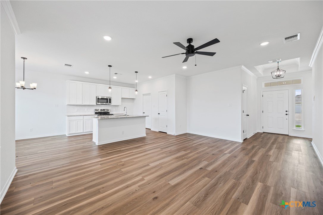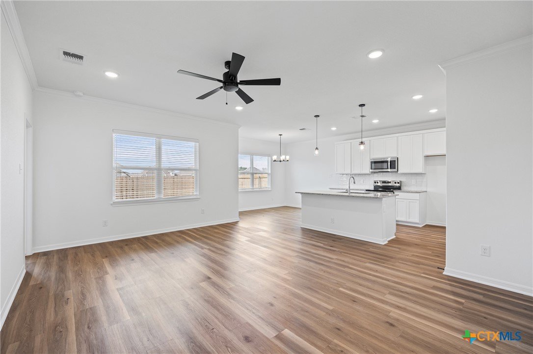 The Longhorn floor plan is one of our most popular. This plan features a three-bedroom, two-bath layout across 1,320 square feet with an open-concept family room, dining area, and kitchen. The kitchen includes stainless steel appliances, a large island, and a pantry, while the primary bath has dual vanity sinks and a spacious closet.