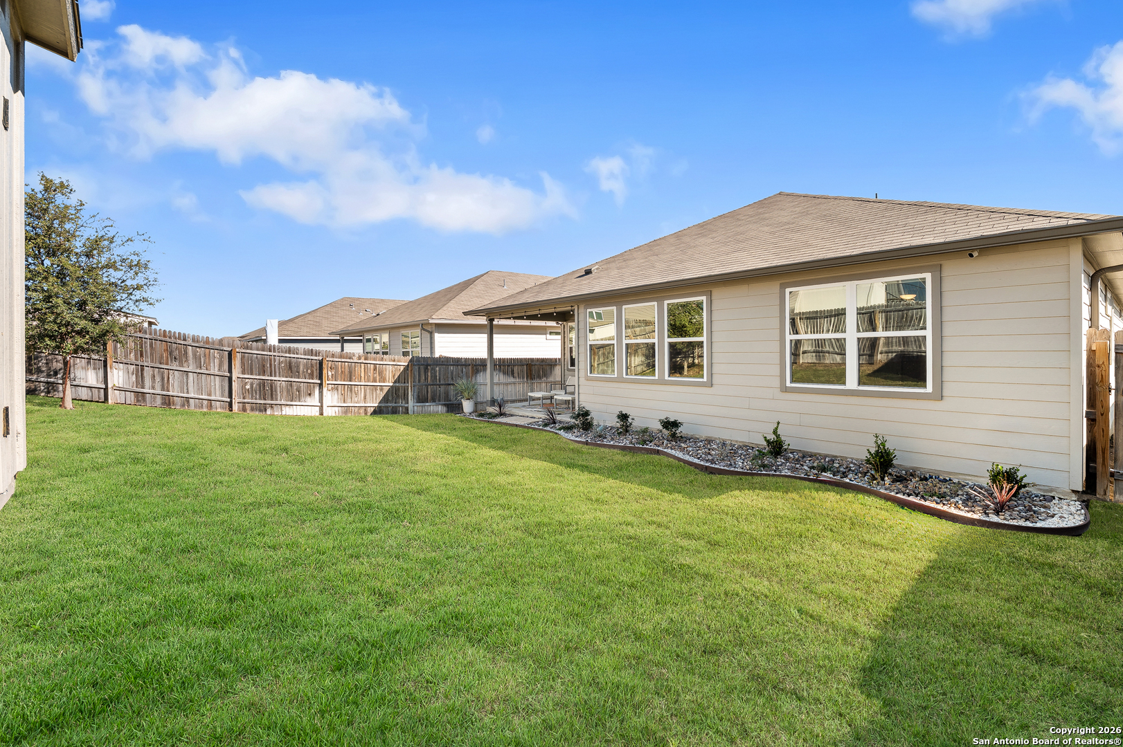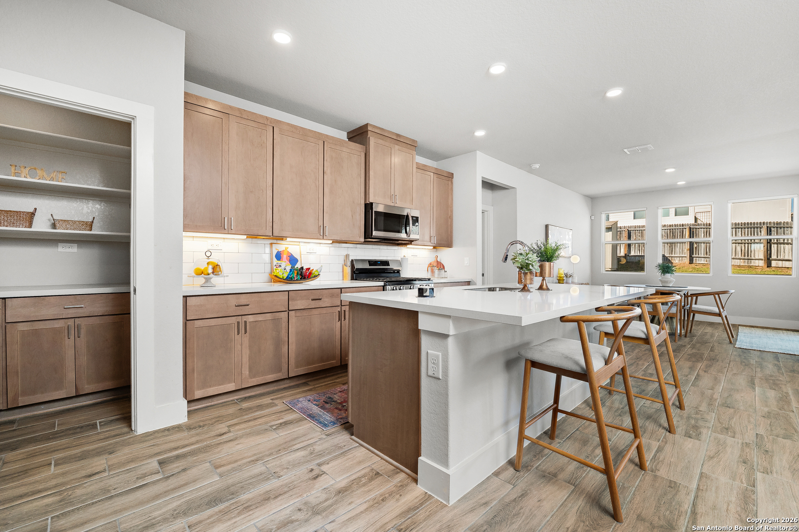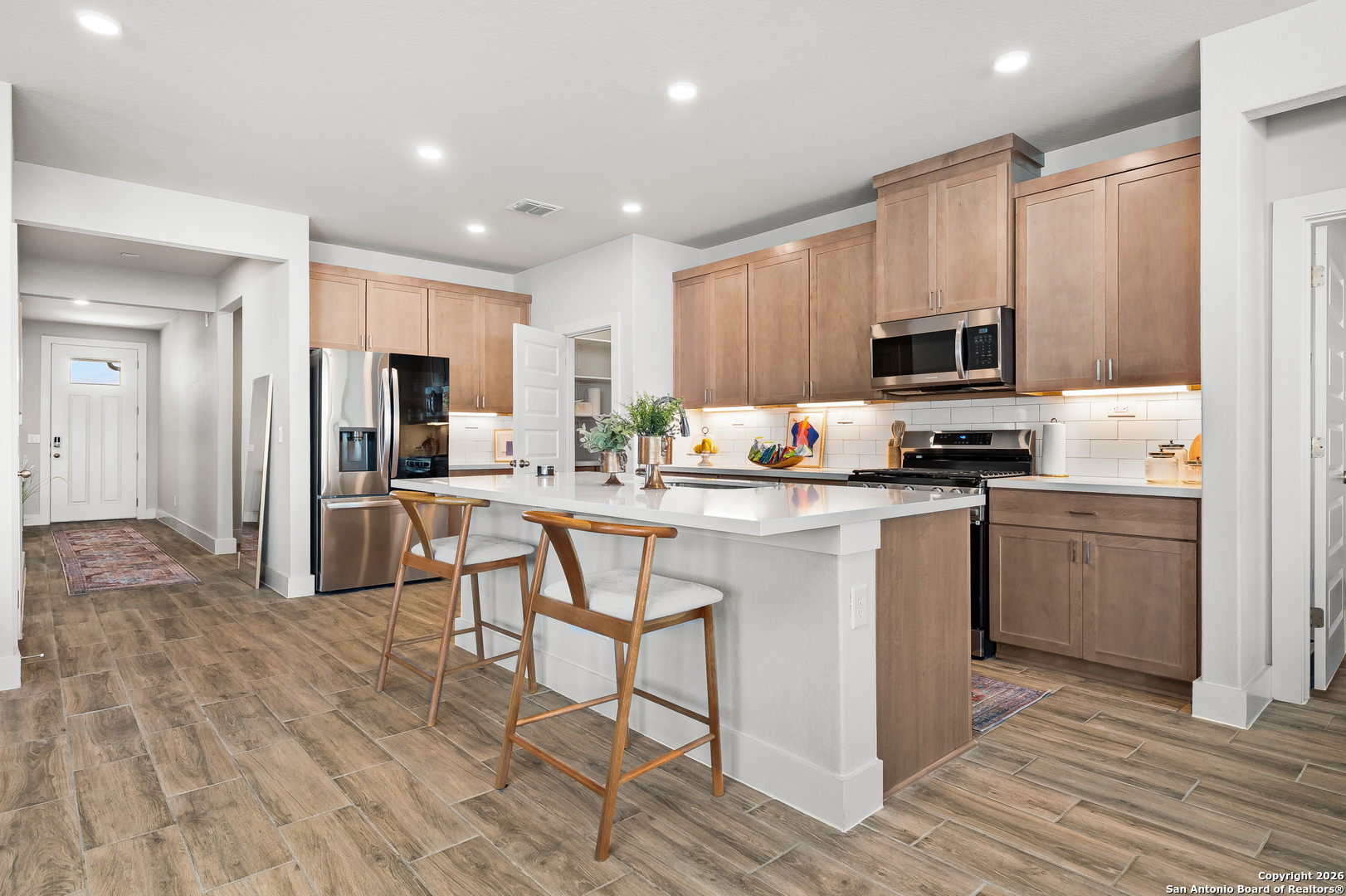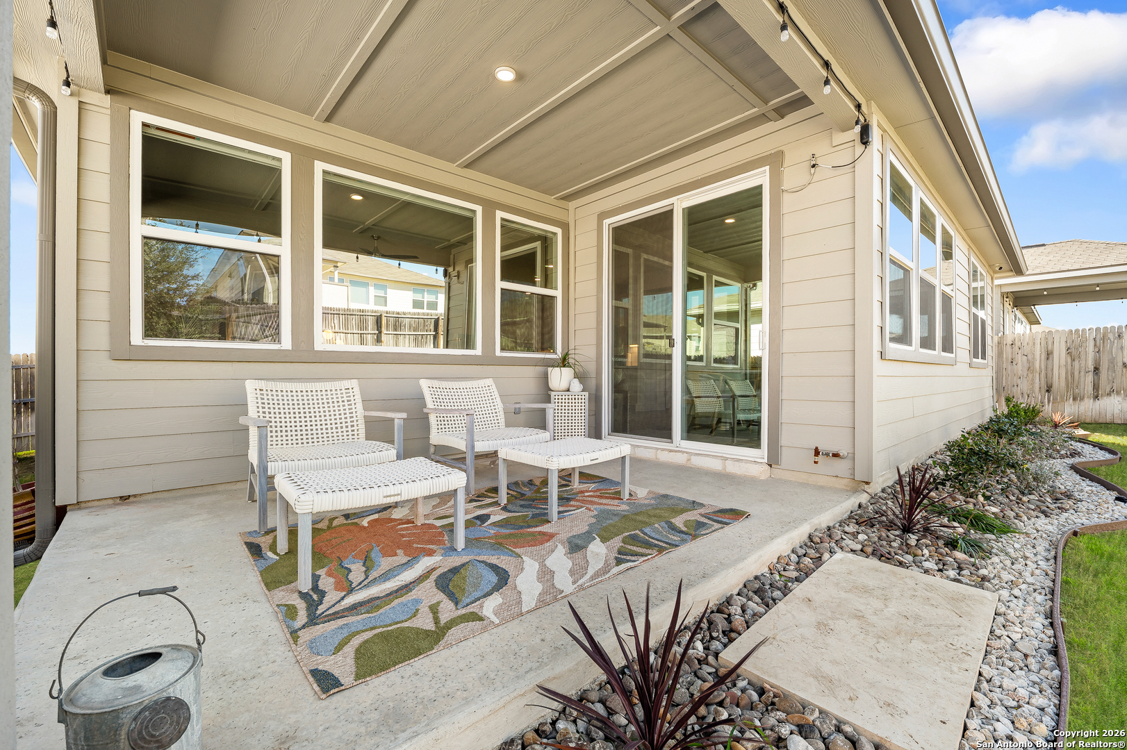 The smart home you've been waiting for is finally here. This lovely one-story smart home offers a spacious open floor plan with 3 bedrooms and 2 full bathrooms, designed for comfort, functionality, and modern living. Ceramic tile flooring flows throughout the main living areas and primary suite, with carpet in the secondary bedrooms. Thoughtful features include a dedicated pet room with a Dutch door and automatic pet entry, plus a convenient workbench located near the utility room. The innovative kitchen is the heart of the home, featuring Omega StoneTM quartz countertops, a decorative subway tile backsplash, 42-inch shaker-style upper cabinets, stainless steel appliances with gas cooking, a walk-in pantry, and recessed lighting. Refrigerator, washer, dryer, and water softener are all included. The separate dining area opens to a covered back patio, ideal for entertaining or relaxing outdoors. The living area and all bedrooms are equipped with honeycomb cordless shades, and electric blinds have been added for extra convenience. The spacious primary suite features a well-appointed bathroom with quartz countertops, a standalone shower with ceramic tile surround, and a large walk-in closet with ample shelving. Additional highlights include new landscaping throughout the property, a fully insulated two-car garage with epoxy-coated flooring and Hyloft overhead storage, a Pentair SensaPro water treatment system, an Amazon package drop location at the entrance, and a wall-mounted heat pump system with advanced air filtration. Practically new and meticulously maintained, this home offers an impressive list of smart and functional upgrades. Schedule your private tour today and experience everything this exceptional home has to offer. Be sure to review the flyer in the documents for a complete list of features.