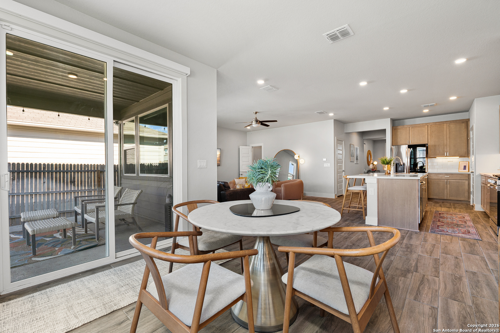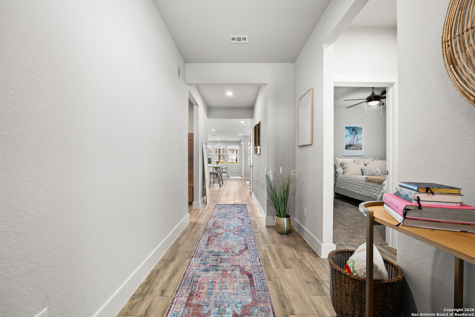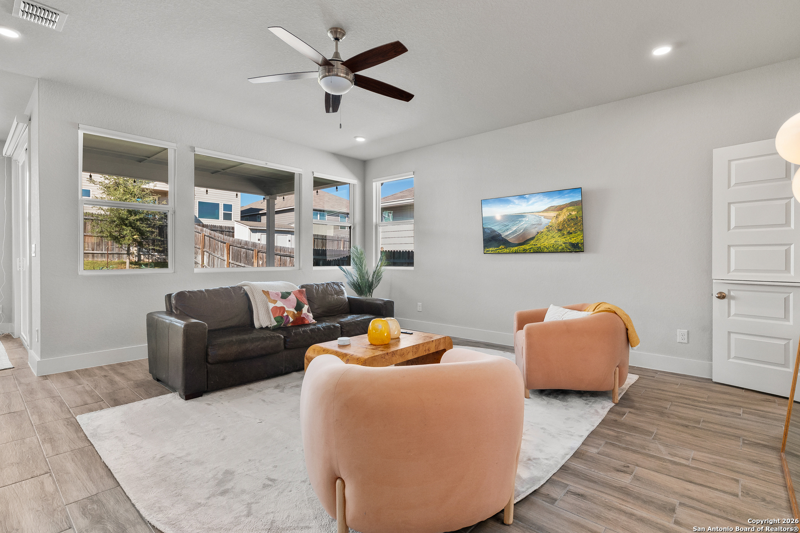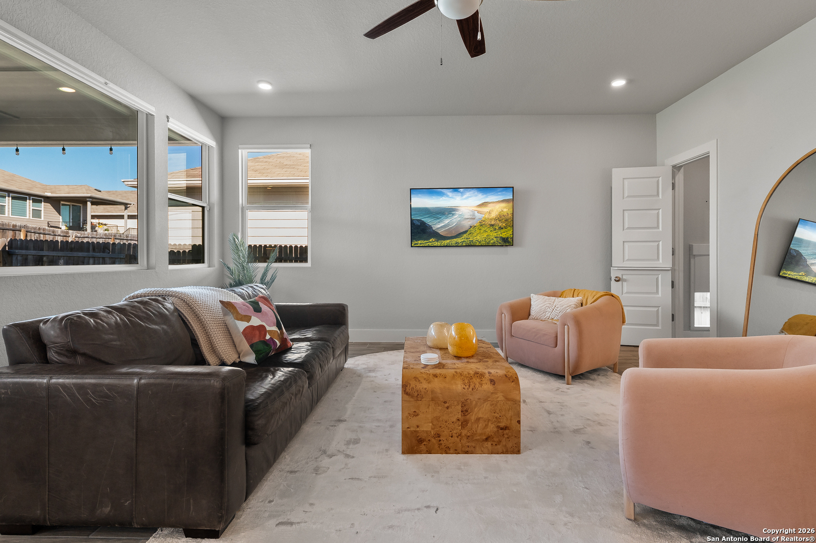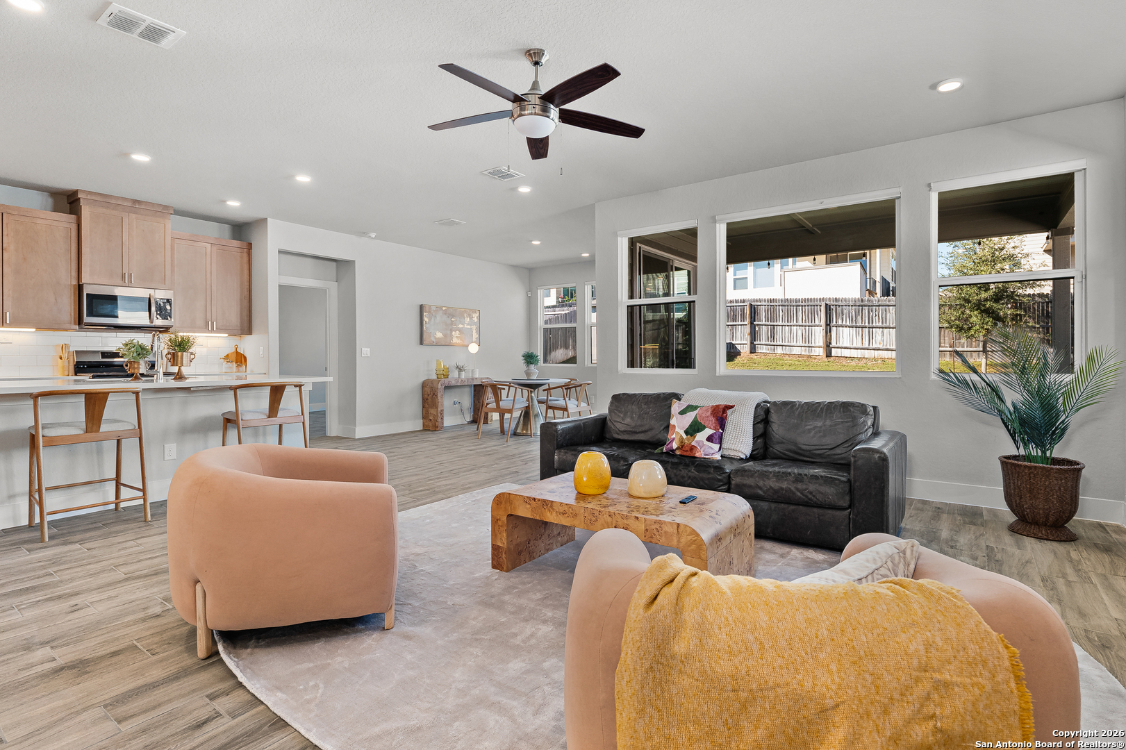 The smart home you've been waiting for is finally here. This lovely one-story smart home offers a spacious open floor plan with 3 bedrooms and 2 full bathrooms, designed for comfort, functionality, and modern living. Ceramic tile flooring flows throughout the main living areas and primary suite, with carpet in the secondary bedrooms. Thoughtful features include a dedicated pet room with a Dutch door and automatic pet entry, plus a convenient workbench located near the utility room. The innovative kitchen is the heart of the home, featuring Omega StoneTM quartz countertops, a decorative subway tile backsplash, 42-inch shaker-style upper cabinets, stainless steel appliances with gas cooking, a walk-in pantry, and recessed lighting. Refrigerator, washer, dryer, and water softener are all included. The separate dining area opens to a covered back patio, ideal for entertaining or relaxing outdoors. The living area and all bedrooms are equipped with honeycomb cordless shades, and electric blinds have been added for extra convenience. The spacious primary suite features a well-appointed bathroom with quartz countertops, a standalone shower with ceramic tile surround, and a large walk-in closet with ample shelving. Additional highlights include new landscaping throughout the property, a fully insulated two-car garage with epoxy-coated flooring and Hyloft overhead storage, a Pentair SensaPro water treatment system, an Amazon package drop location at the entrance, and a wall-mounted heat pump system with advanced air filtration. Practically new and meticulously maintained, this home offers an impressive list of smart and functional upgrades. Schedule your private tour today and experience everything this exceptional home has to offer. Be sure to review the flyer in the documents for a complete list of features.