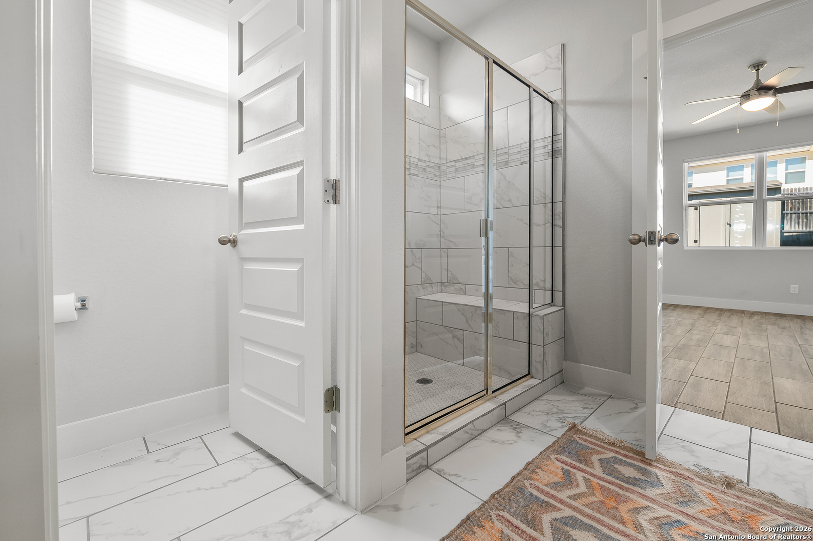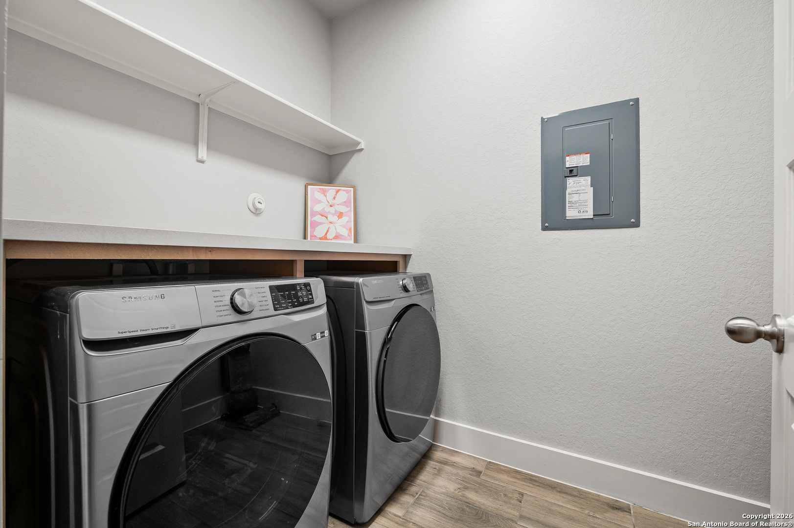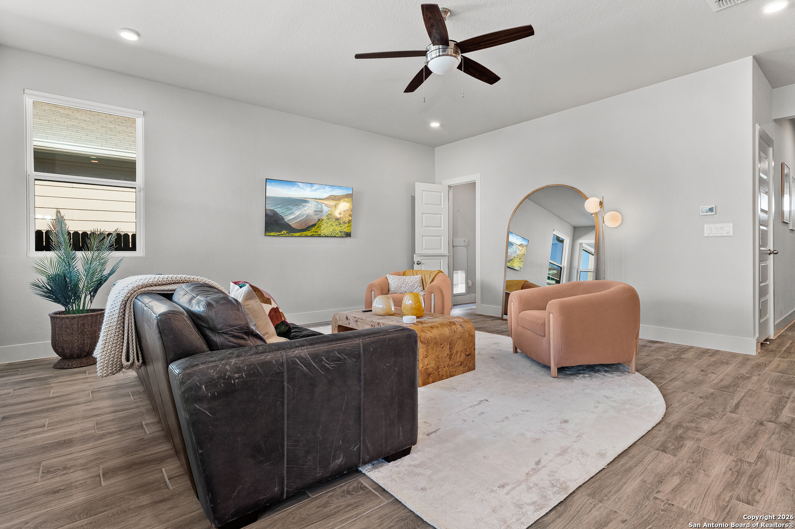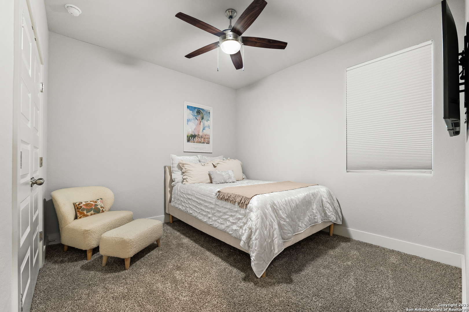 The smart home you've been waiting for is finally here. This lovely one-story smart home offers a spacious open floor plan with 3 bedrooms and 2 full bathrooms, designed for comfort, functionality, and modern living. Ceramic tile flooring flows throughout the main living areas and primary suite, with carpet in the secondary bedrooms. Thoughtful features include a dedicated pet room with a Dutch door and automatic pet entry, plus a convenient workbench located near the utility room. The innovative kitchen is the heart of the home, featuring Omega StoneTM quartz countertops, a decorative subway tile backsplash, 42-inch shaker-style upper cabinets, stainless steel appliances with gas cooking, a walk-in pantry, and recessed lighting. Refrigerator, washer, dryer, and water softener are all included. The separate dining area opens to a covered back patio, ideal for entertaining or relaxing outdoors. The living area and all bedrooms are equipped with honeycomb cordless shades, and electric blinds have been added for extra convenience. The spacious primary suite features a well-appointed bathroom with quartz countertops, a standalone shower with ceramic tile surround, and a large walk-in closet with ample shelving. Additional highlights include new landscaping throughout the property, a fully insulated two-car garage with epoxy-coated flooring and Hyloft overhead storage, a Pentair SensaPro water treatment system, an Amazon package drop location at the entrance, and a wall-mounted heat pump system with advanced air filtration. Practically new and meticulously maintained, this home offers an impressive list of smart and functional upgrades. Schedule your private tour today and experience everything this exceptional home has to offer. Be sure to review the flyer in the documents for a complete list of features.