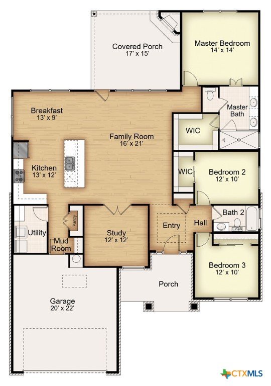 The Rio Grande is a spacious three-bedroom, two-bathroom floor plan spread across 1,958 square feet and is one of our most popular choices! The Rio Grande is stylish, functional, and perfect as a starter or forever home. The kitchen includes stainless steel appliances with a large island and a double-door pantry for tons of storage, while the primary bath has dual vanity sinks, a private water closet, a spacious walk-in closet, and a luxurious walk-in shower with seating. Plan variations include a walk-in shower or a separate garden tub in the primary bath, a study in place of the dining room off the entryway, and an outdoor fireplace on the covered porch.