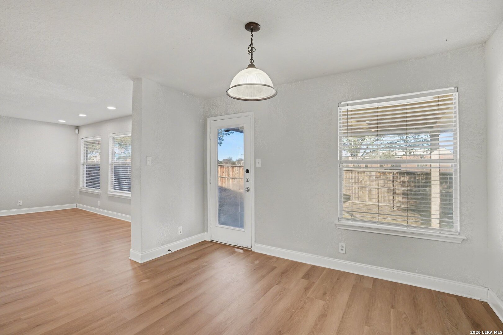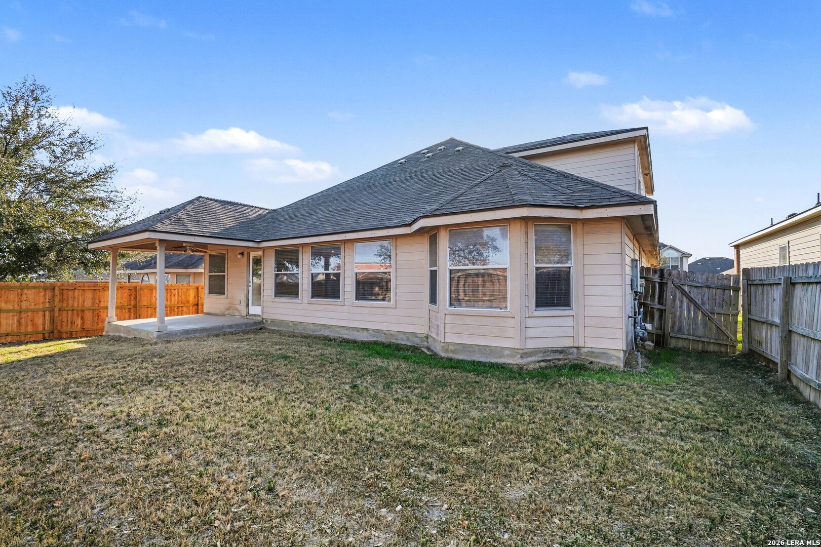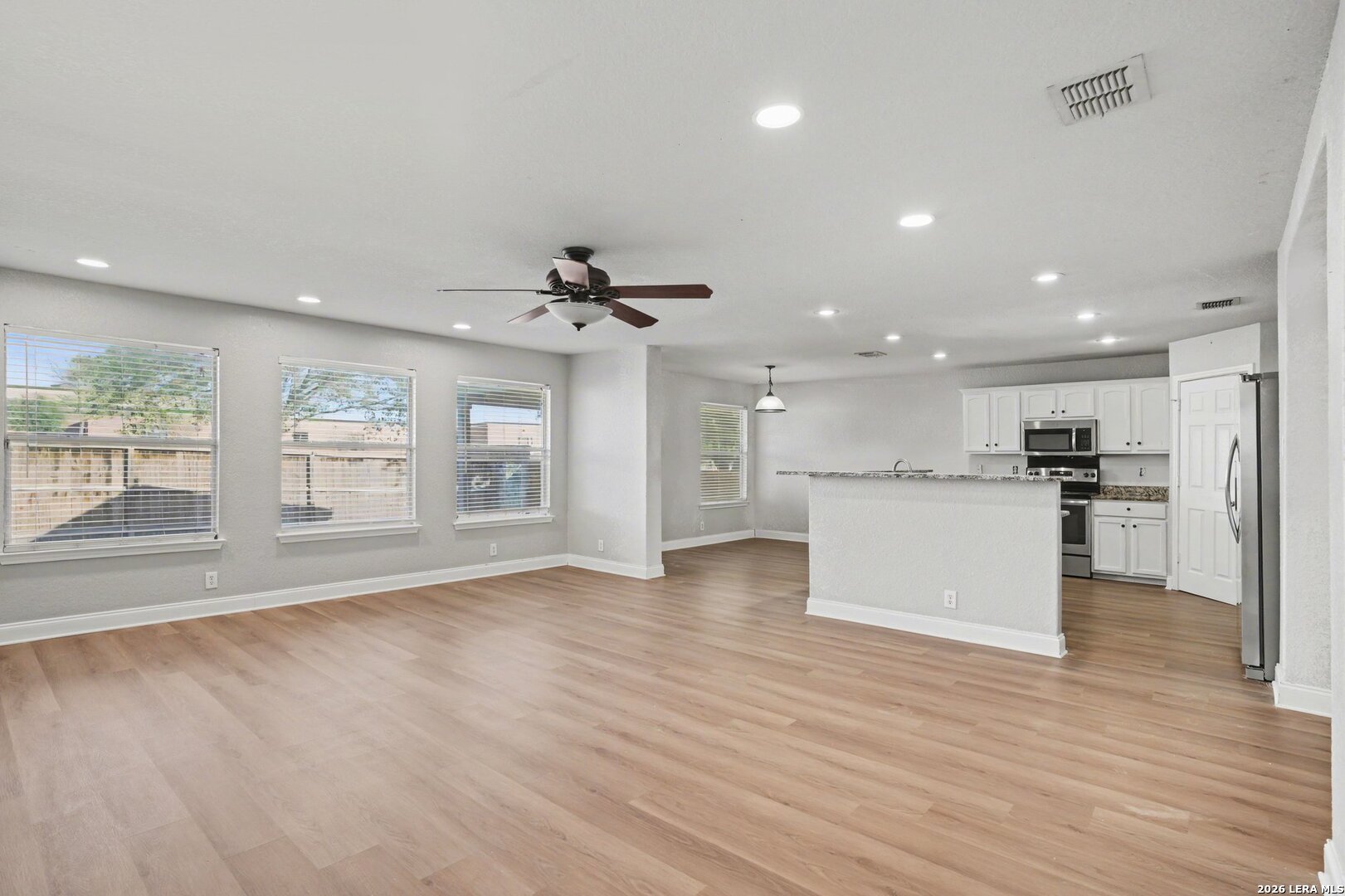 Spacious and beautifully designed 4-bedroom, 3-bath home with a dedicated office/flex room and a spacious upstairs living area that can serve as a game room or second family room. This versatile floor plan features a split primary suite on the first floor for added privacy, along with two additional bedrooms downstairs and a fourth bedroom upstairs-perfect for guests. The primary suite showcases elegant bay windows that fill the room with natural light, plus a well-appointed en suite bath complete with double vanities, a relaxing garden tub, separate shower, and an expansive closet. The kitchen offers both style and function with granite countertops, stainless steel appliances, and ample cabinet space. Just beside the kitchen is a second dining area ideal for everyday meals, while a separate formal dining room provides additional space for entertaining and special occasions. The kitchen opens seamlessly to the main living area for easy gatherings. Outside you'll enjoy the covered patio with ceiling fan overlooking the backyard-perfect for relaxing evenings or weekend get-togethers. Ideally located just off IH-10, this home is a short drive to Randolph Air Force Base and offers convenient access to shopping, dining, parks, and recreational opportunities throughout the area. Its spacious and functional layout provides a fantastic opportunity to add your personal touch and make the home truly your own.