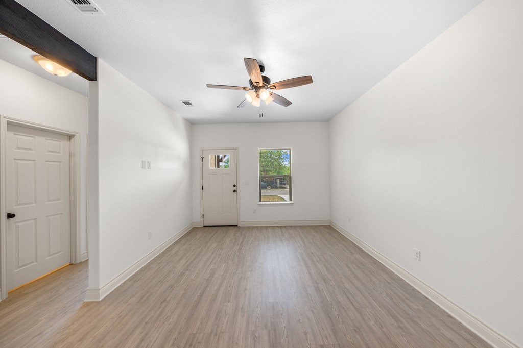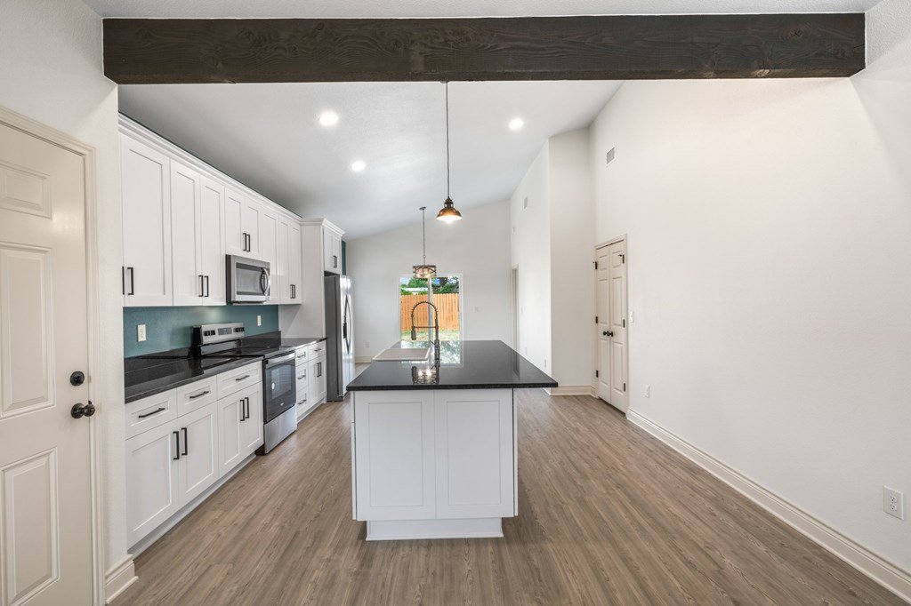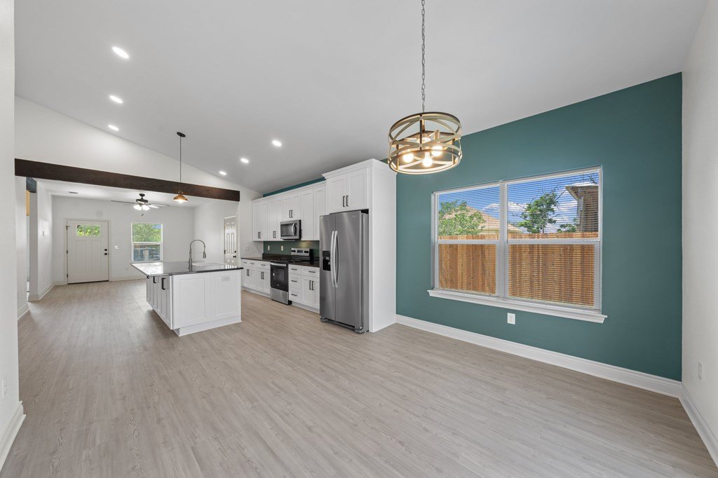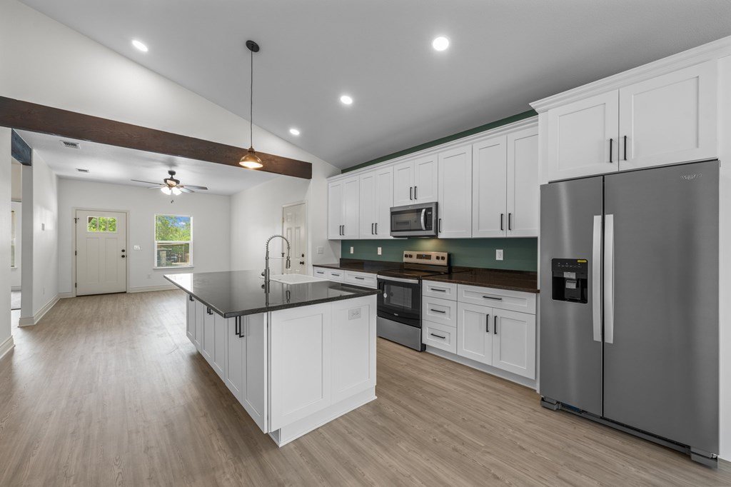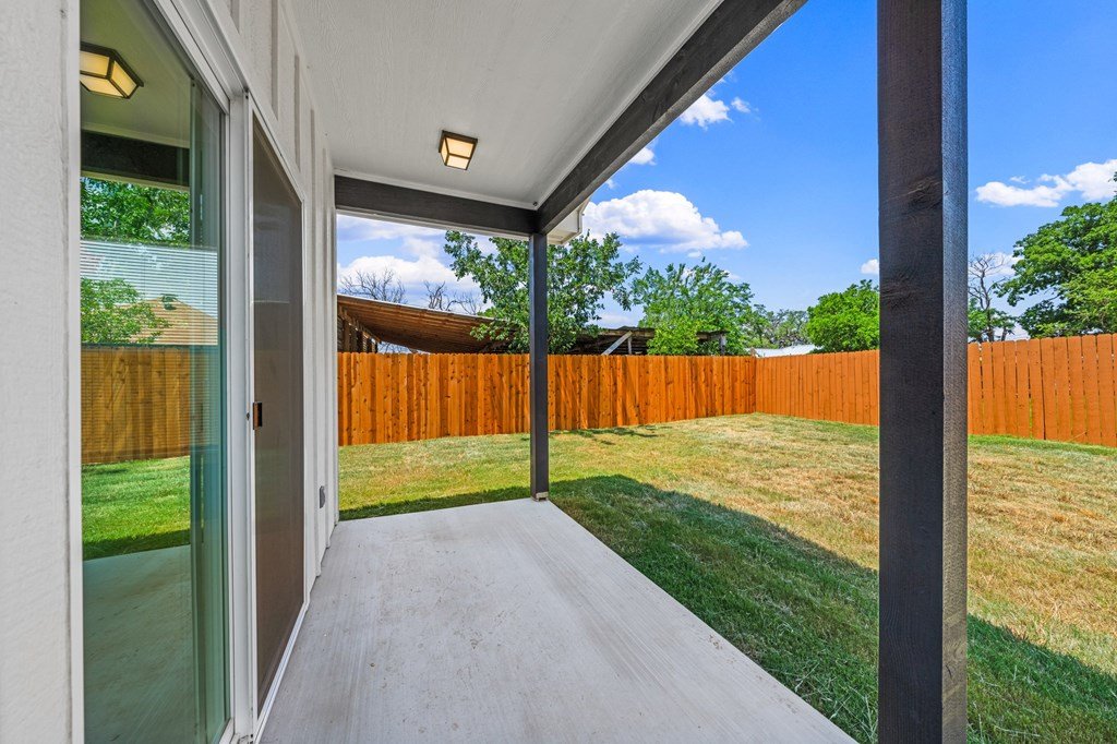 Newly constructed 3-bedroom, 2-bathroom home situated on a 0.24-acre lot in Kerrville. This single-story residence offers 1,228 square feet of living space with a functional open-concept floor plan. The kitchen features granite countertops, Whirlpool stainless steel appliances, and opens to the main living area, which includes decorative wood ceiling beams. The primary bedroom includes an en suite bathroom and dual closets. Two additional bedrooms provide flexibility for guest accommodations or home office use. Utility room located inside for added convenience. Exterior features include a fenced backyard, ideal for outdoor activities or pets. Located near schools and less than 2 miles from downtown Kerrville, with easy access to shopping, dining, and community amenities. Available exclusively to qualified first-time homebuyers and subject to an affordability deed restriction.