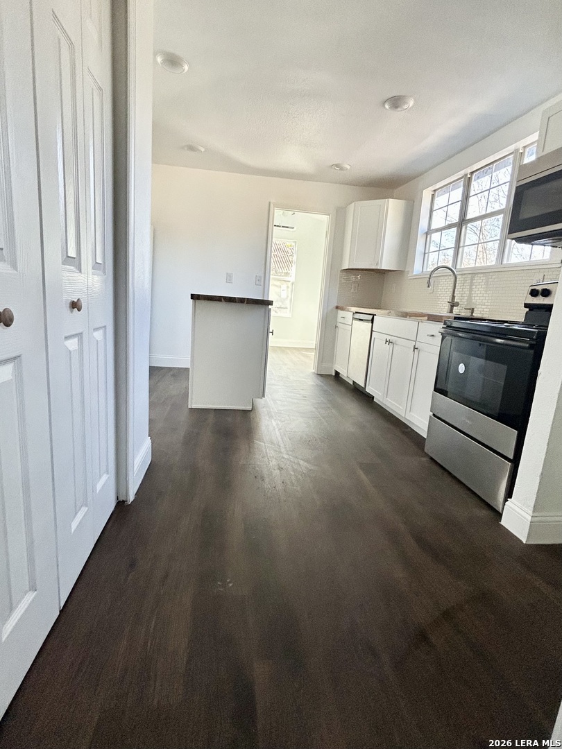 Conveniently located cottage style home with large front porch. Single story home features open living concept. Updated appliances and butcher block countertops in this island kitchen. Stackable washer/drier space inside the home. Large, fenced yard with storage in back.