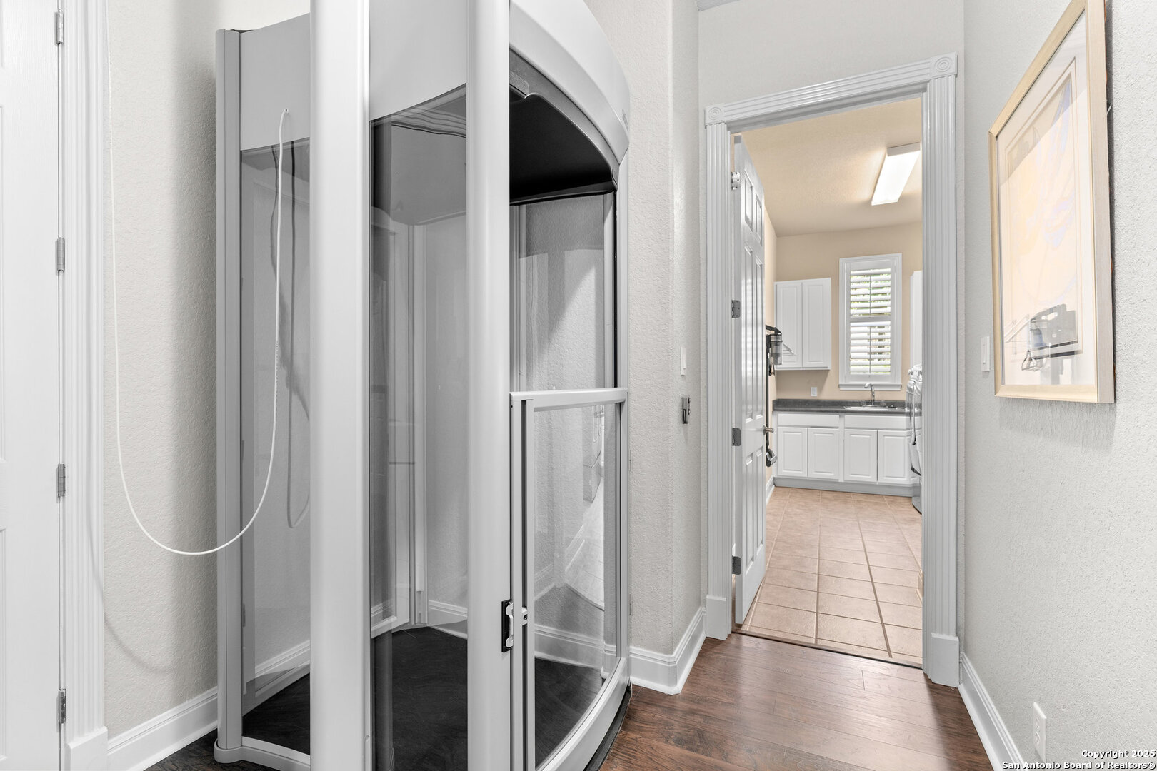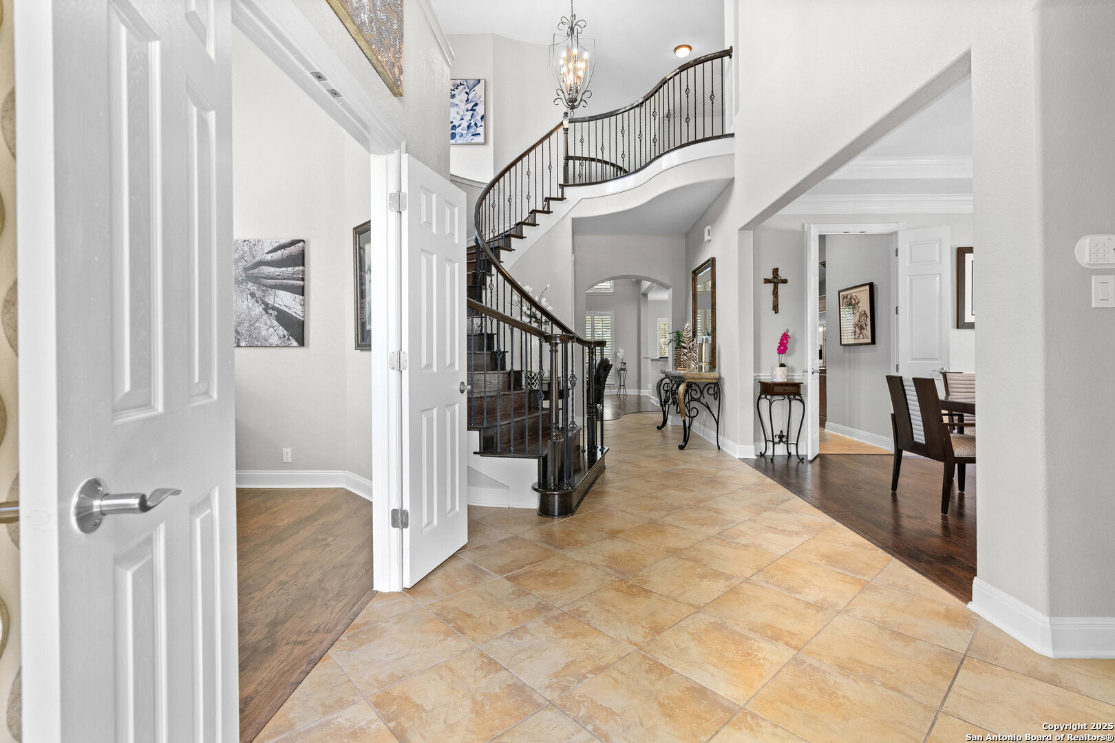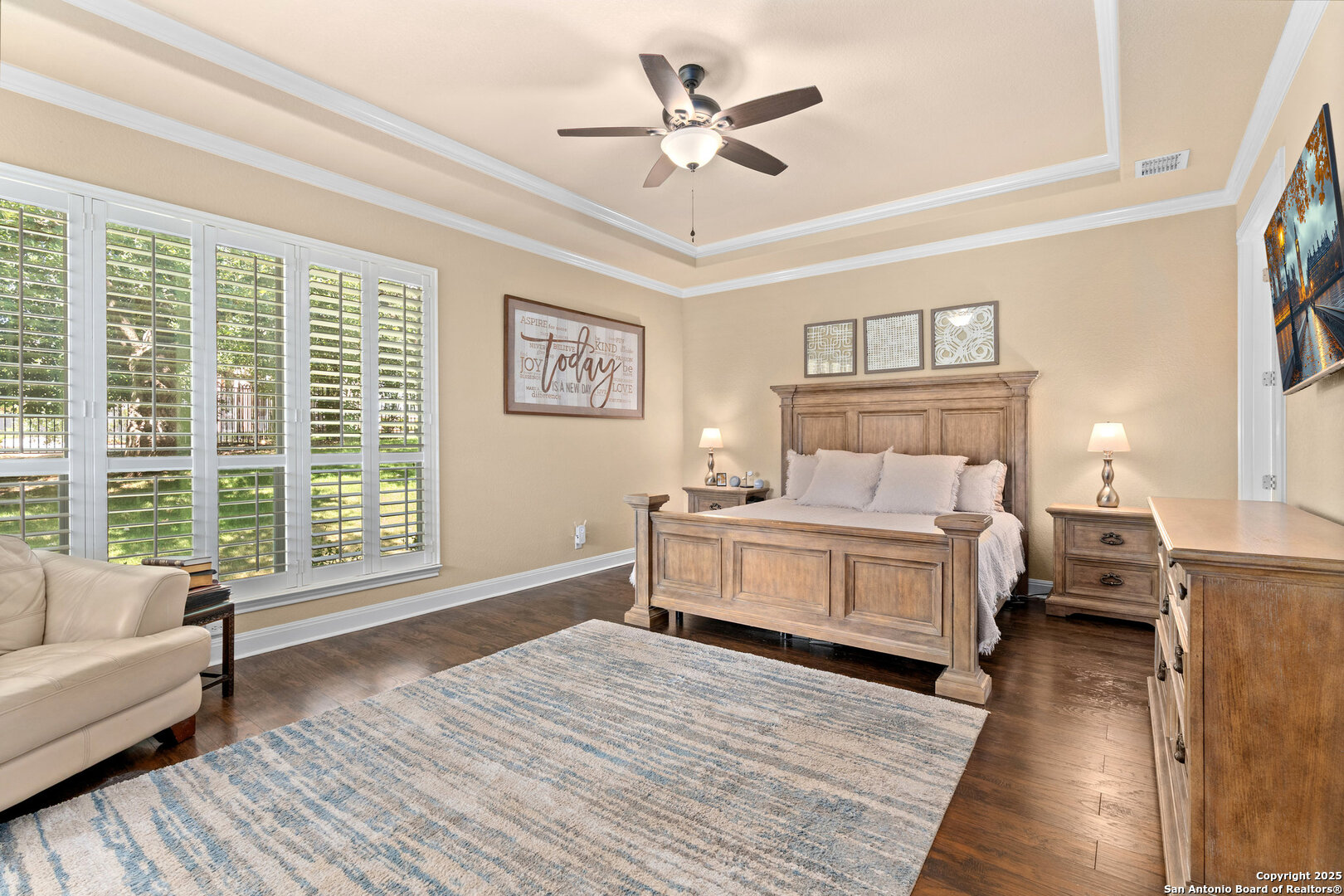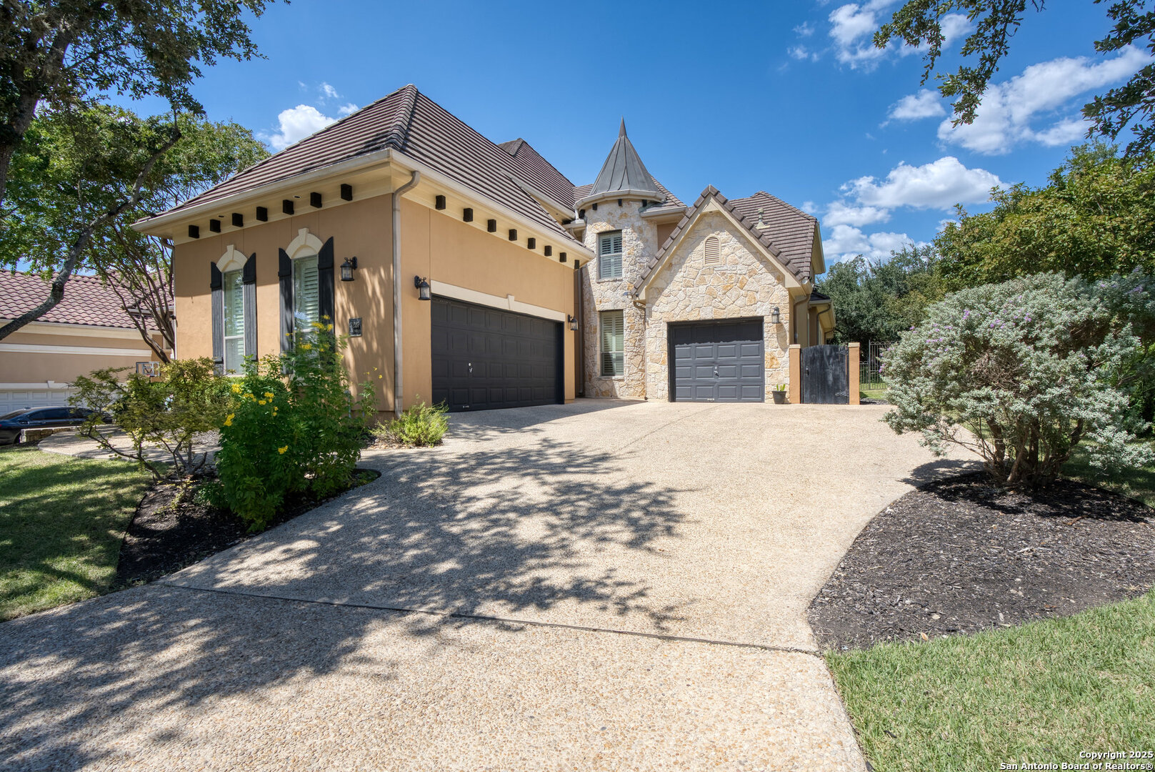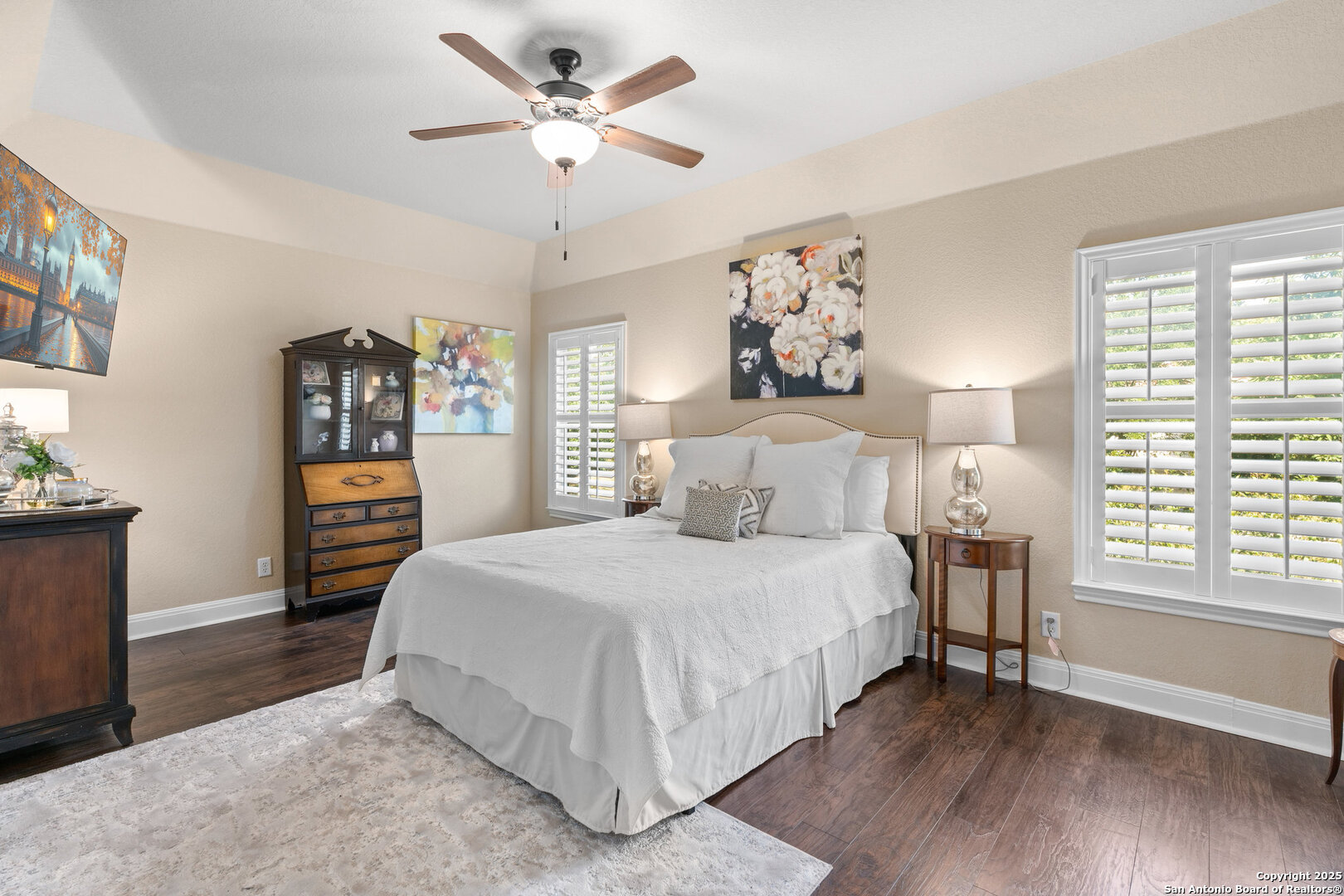 Discover this exquisite Mediterranean home in The Dominion gated community, featuring an open layout with a grand family room and soaring two-story ceilings, perfect for entertaining. This residence offers two first-floor master suites, including one upgraded for handicap accessibility, and two additional upstairs bedrooms with en-suite baths for added privacy. The chef's kitchen boasts stainless steel appliances, gas cooking, a butler's pantry, and a granite island that seamlessly connects to the family room. The home features plantation shutters and engineered hardwood flooring throughout, adding a touch of elegance and timeless style. Convenience is key with a STILTZ Lift handicap-accessible elevator, a handicap-accessible guest bath, a cloud-enabled security system, an upstairs game room, and a private theater with projector and surround sound. Enjoy outdoor living with a covered patio, iron fencing, mature landscaping, and a beautifully maintained backyard, perfect for relaxation and gatherings. This meticulously upgraded home is ideal for multi-generational living, combining luxury with everyday practicality. Schedule your private tour today!