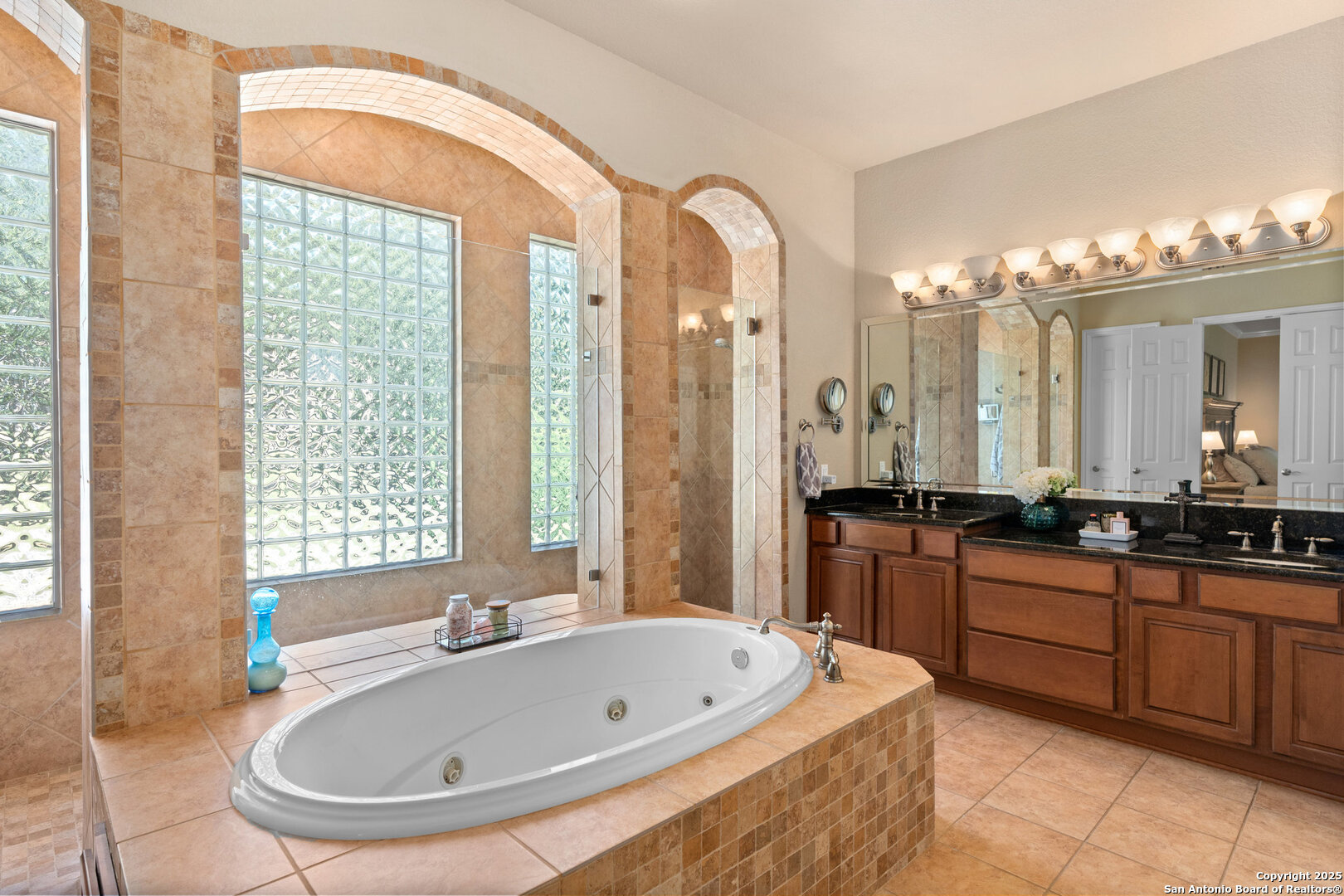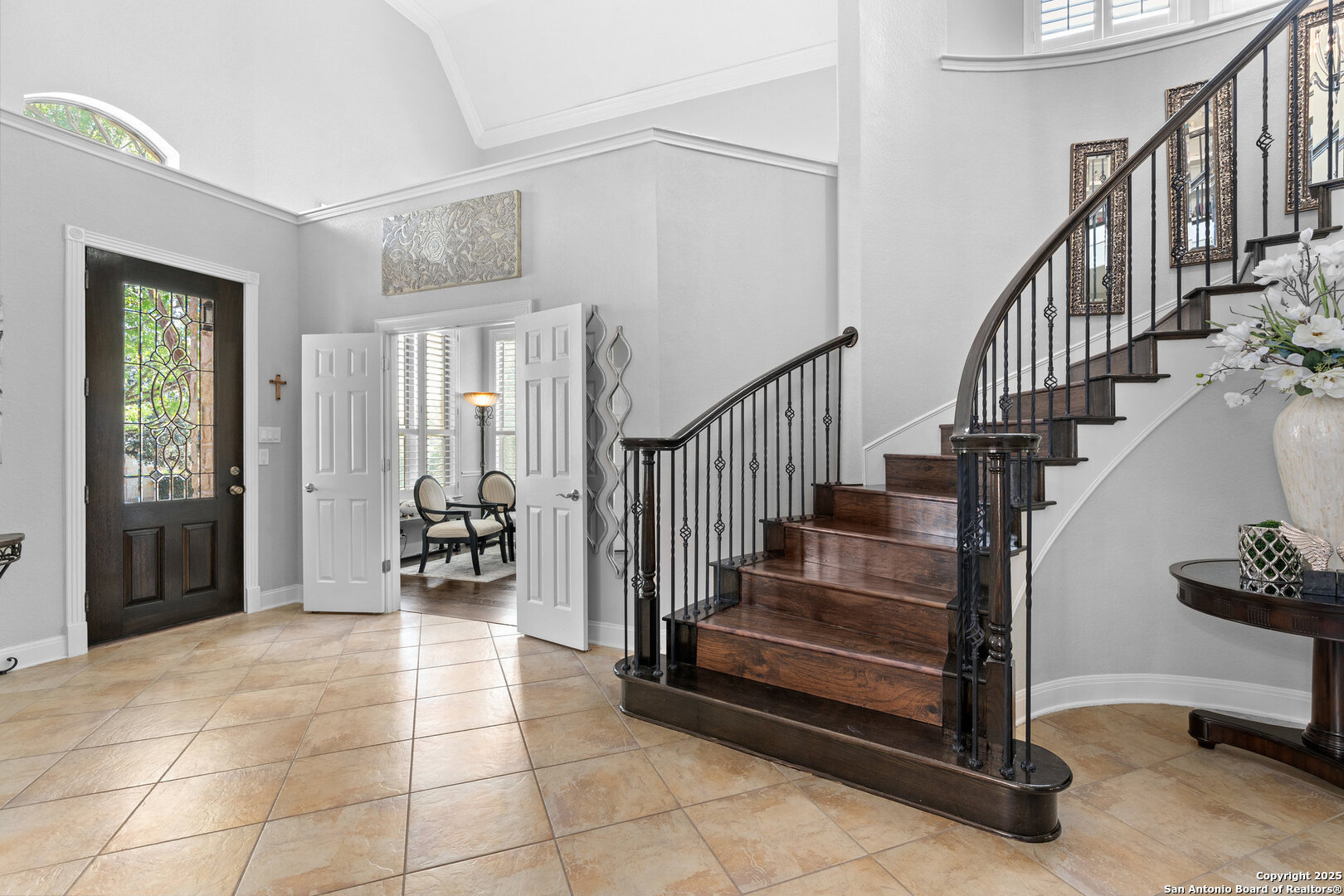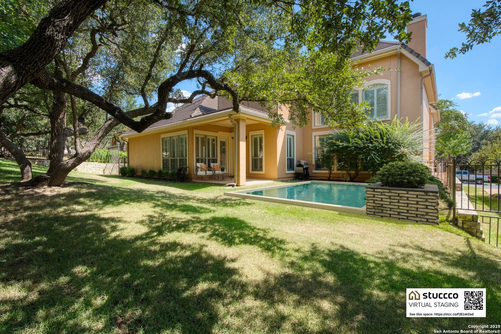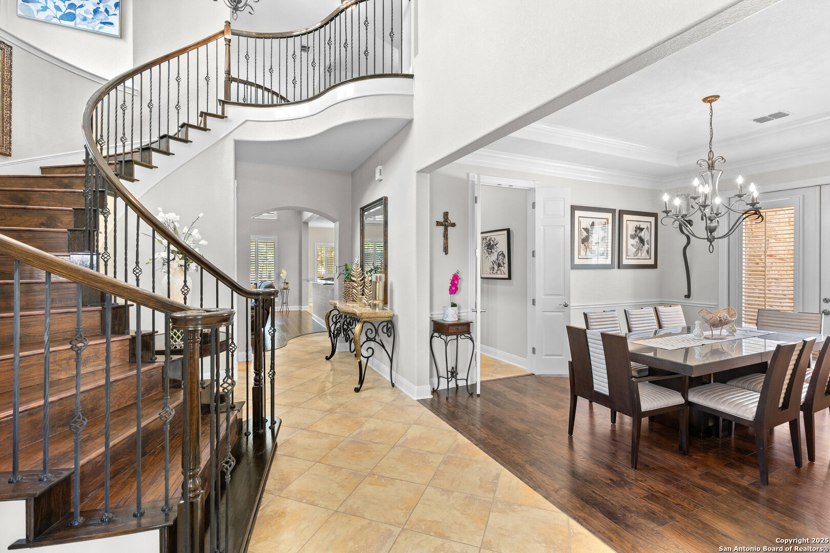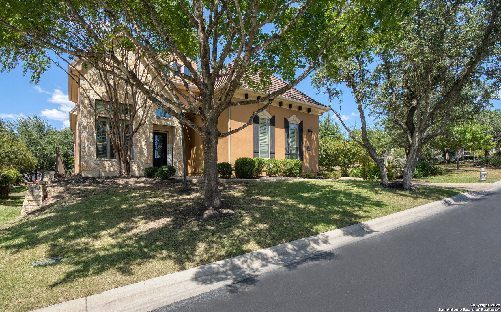 Discover this exquisite Mediterranean home in The Dominion gated community, featuring an open layout with a grand family room and soaring two-story ceilings, perfect for entertaining. This residence offers two first-floor master suites, including one upgraded for handicap accessibility, and two additional upstairs bedrooms with en-suite baths for added privacy. The chef's kitchen boasts stainless steel appliances, gas cooking, a butler's pantry, and a granite island that seamlessly connects to the family room. The home features plantation shutters and engineered hardwood flooring throughout, adding a touch of elegance and timeless style. Convenience is key with a STILTZ Lift handicap-accessible elevator, a handicap-accessible guest bath, a cloud-enabled security system, an upstairs game room, and a private theater with projector and surround sound. Enjoy outdoor living with a covered patio, iron fencing, mature landscaping, and a beautifully maintained backyard, perfect for relaxation and gatherings. This meticulously upgraded home is ideal for multi-generational living, combining luxury with everyday practicality. Schedule your private tour today!