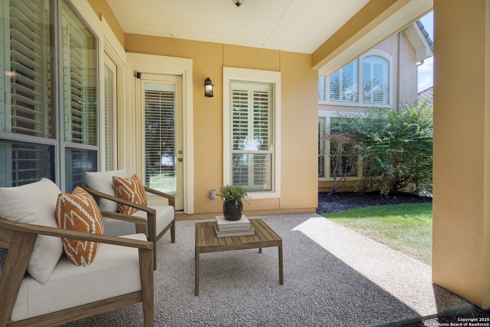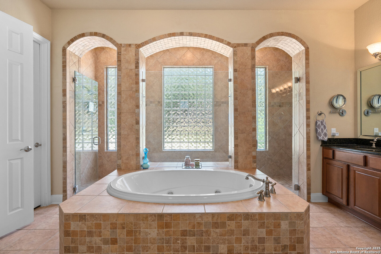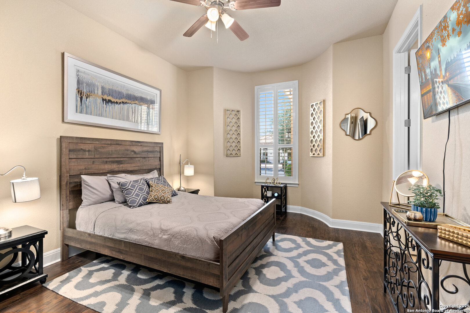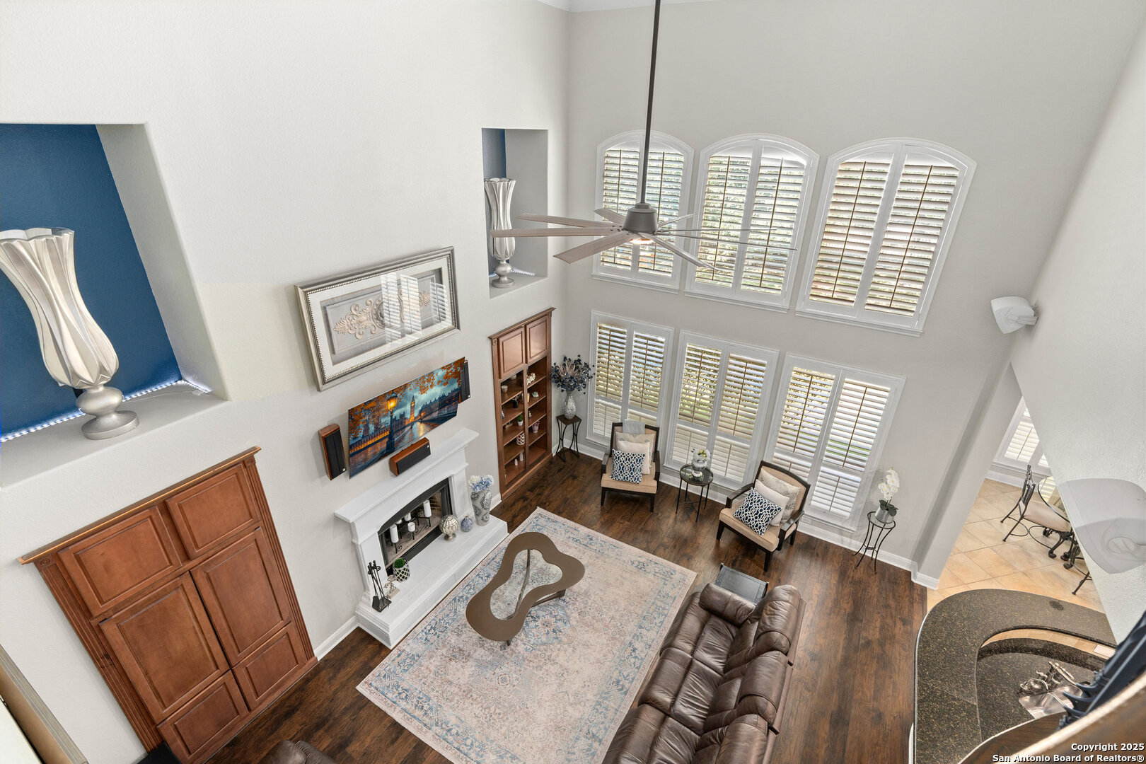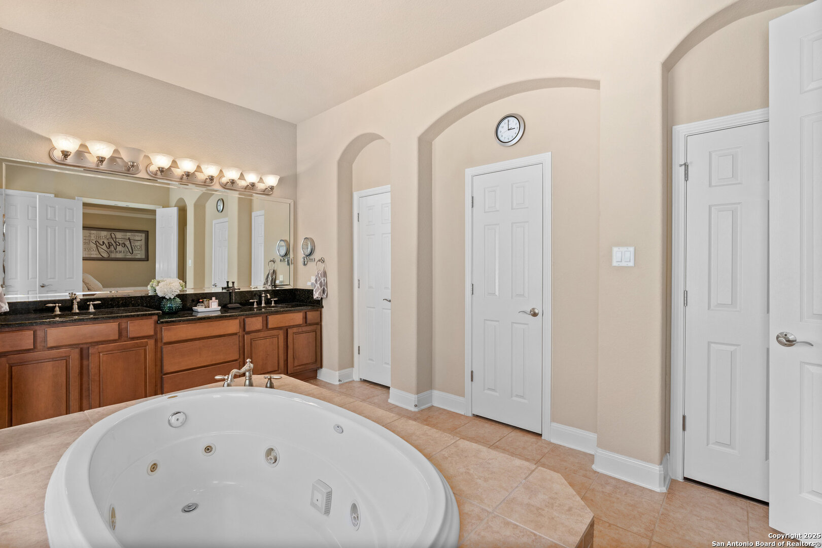 Discover this exquisite Mediterranean home in The Dominion gated community, featuring an open layout with a grand family room and soaring two-story ceilings, perfect for entertaining. This residence offers two first-floor master suites, including one upgraded for handicap accessibility, and two additional upstairs bedrooms with en-suite baths for added privacy. The chef's kitchen boasts stainless steel appliances, gas cooking, a butler's pantry, and a granite island that seamlessly connects to the family room. The home features plantation shutters and engineered hardwood flooring throughout, adding a touch of elegance and timeless style. Convenience is key with a STILTZ Lift handicap-accessible elevator, a handicap-accessible guest bath, a cloud-enabled security system, an upstairs game room, and a private theater with projector and surround sound. Enjoy outdoor living with a covered patio, iron fencing, mature landscaping, and a beautifully maintained backyard, perfect for relaxation and gatherings. This meticulously upgraded home is ideal for multi-generational living, combining luxury with everyday practicality. Schedule your private tour today!