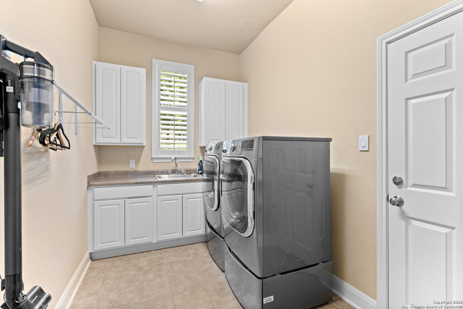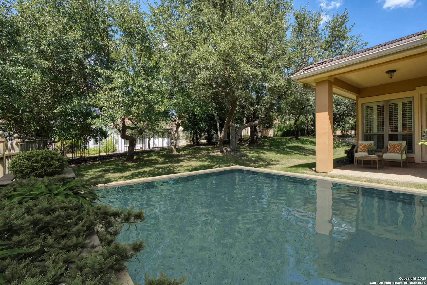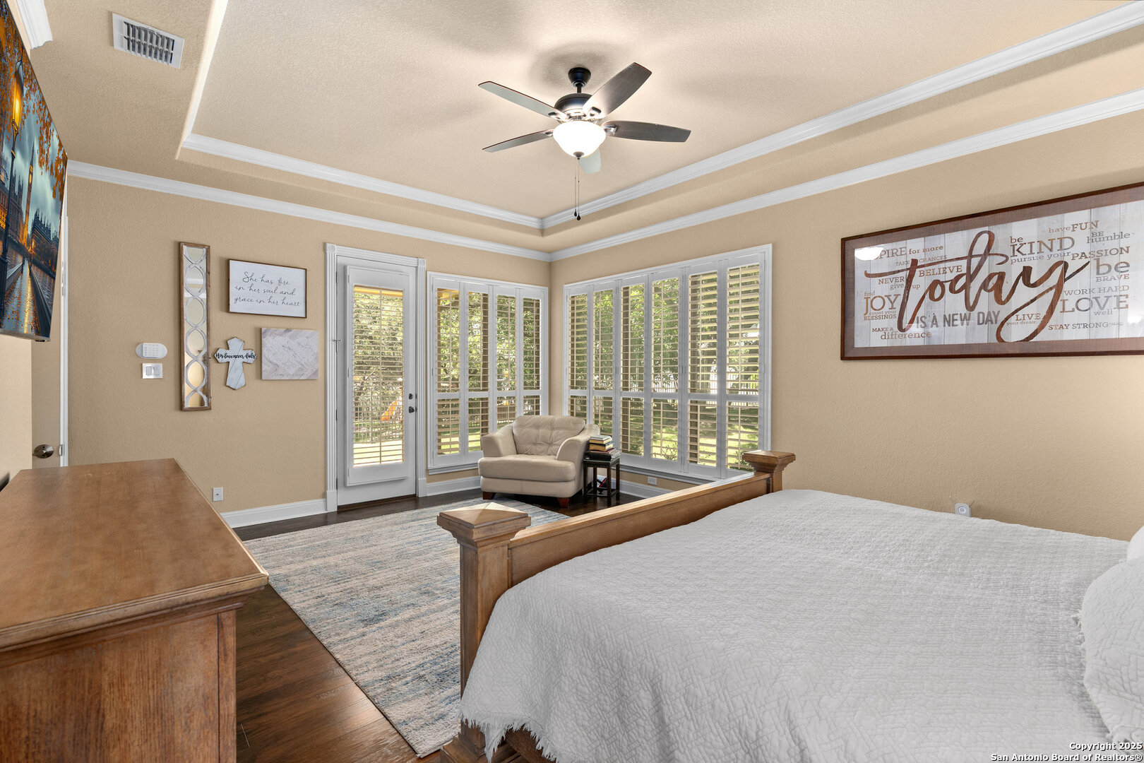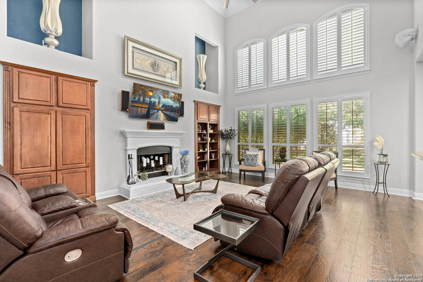 Discover this exquisite Mediterranean home in The Dominion gated community, featuring an open layout with a grand family room and soaring two-story ceilings, perfect for entertaining. This residence offers two first-floor master suites, including one upgraded for handicap accessibility, and two additional upstairs bedrooms with en-suite baths for added privacy. The chef's kitchen boasts stainless steel appliances, gas cooking, a butler's pantry, and a granite island that seamlessly connects to the family room. The home features plantation shutters and engineered hardwood flooring throughout, adding a touch of elegance and timeless style. Convenience is key with a STILTZ Lift handicap-accessible elevator, a handicap-accessible guest bath, a cloud-enabled security system, an upstairs game room, and a private theater with projector and surround sound. Enjoy outdoor living with a covered patio, iron fencing, mature landscaping, and a beautifully maintained backyard, perfect for relaxation and gatherings. This meticulously upgraded home is ideal for multi-generational living, combining luxury with everyday practicality. Schedule your private tour today!
