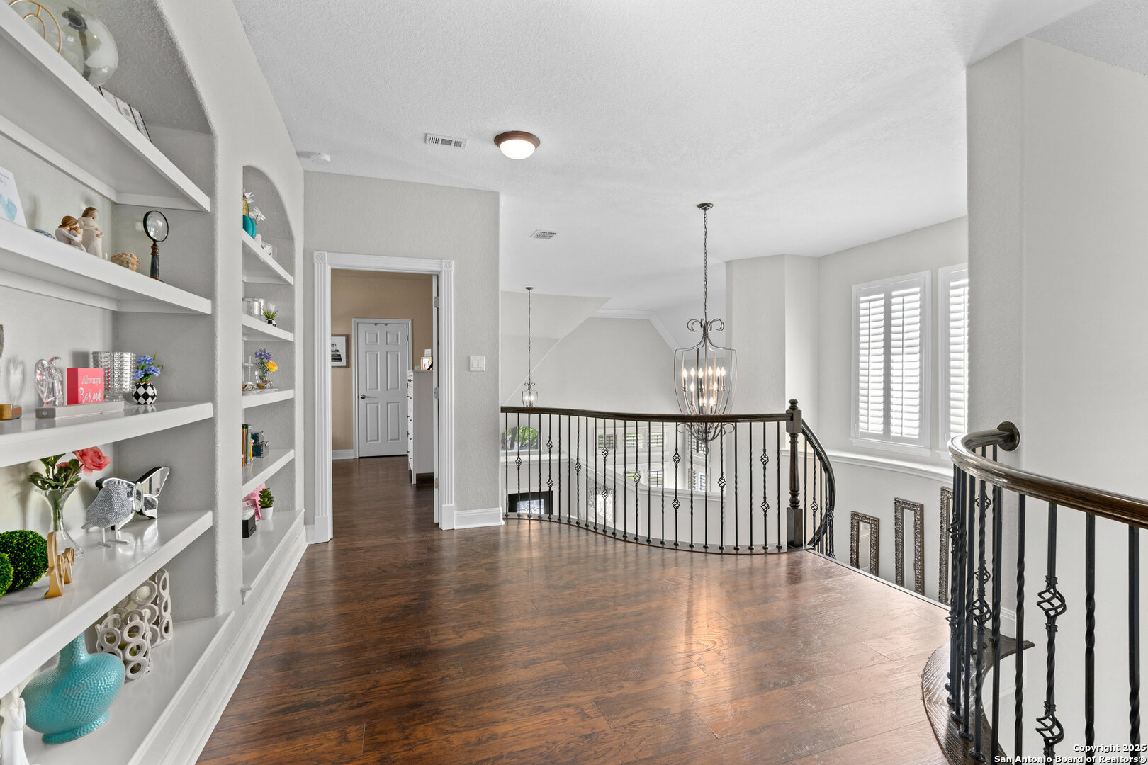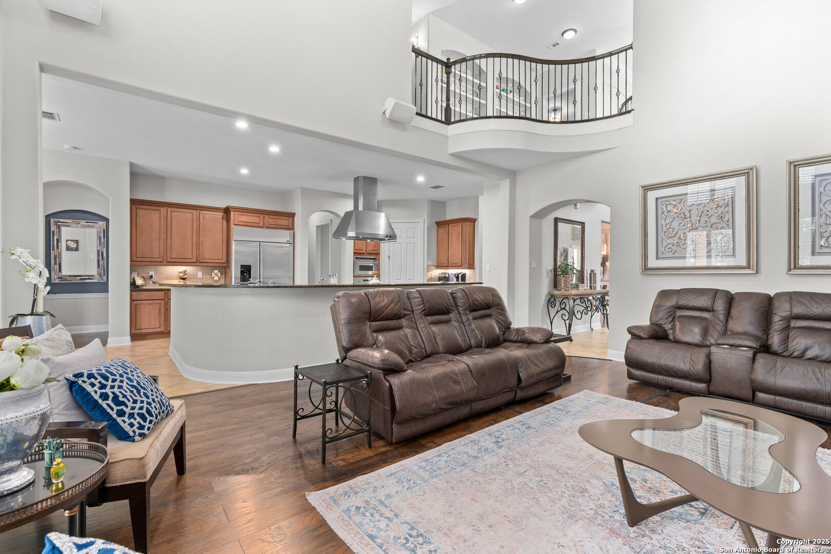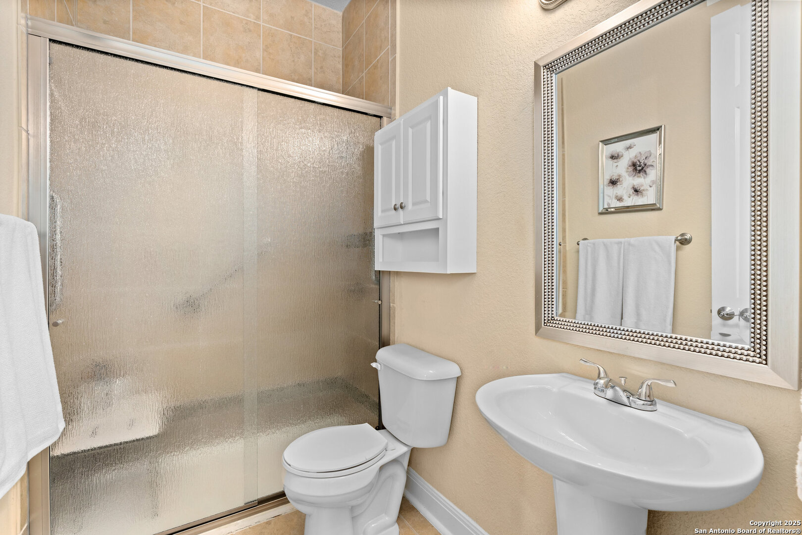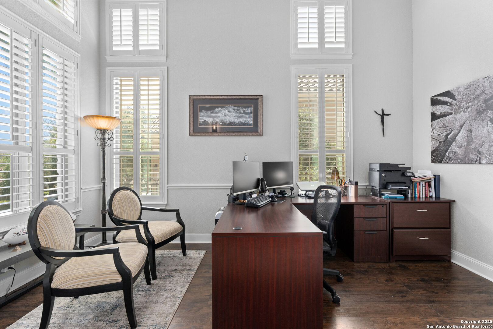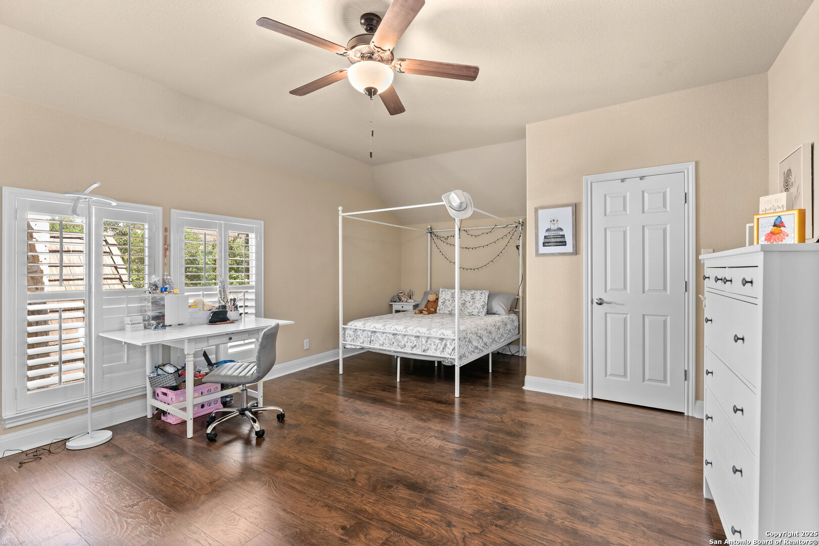 Discover this exquisite Mediterranean home in The Dominion gated community, featuring an open layout with a grand family room and soaring two-story ceilings, perfect for entertaining. This residence offers two first-floor master suites, including one upgraded for handicap accessibility, and two additional upstairs bedrooms with en-suite baths for added privacy. The chef's kitchen boasts stainless steel appliances, gas cooking, a butler's pantry, and a granite island that seamlessly connects to the family room. The home features plantation shutters and engineered hardwood flooring throughout, adding a touch of elegance and timeless style. Convenience is key with a STILTZ Lift handicap-accessible elevator, a handicap-accessible guest bath, a cloud-enabled security system, an upstairs game room, and a private theater with projector and surround sound. Enjoy outdoor living with a covered patio, iron fencing, mature landscaping, and a beautifully maintained backyard, perfect for relaxation and gatherings. This meticulously upgraded home is ideal for multi-generational living, combining luxury with everyday practicality. Schedule your private tour today!